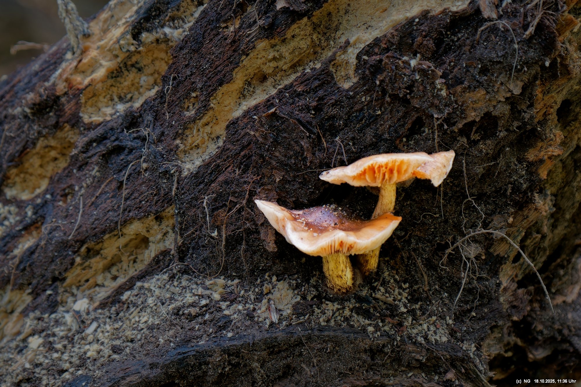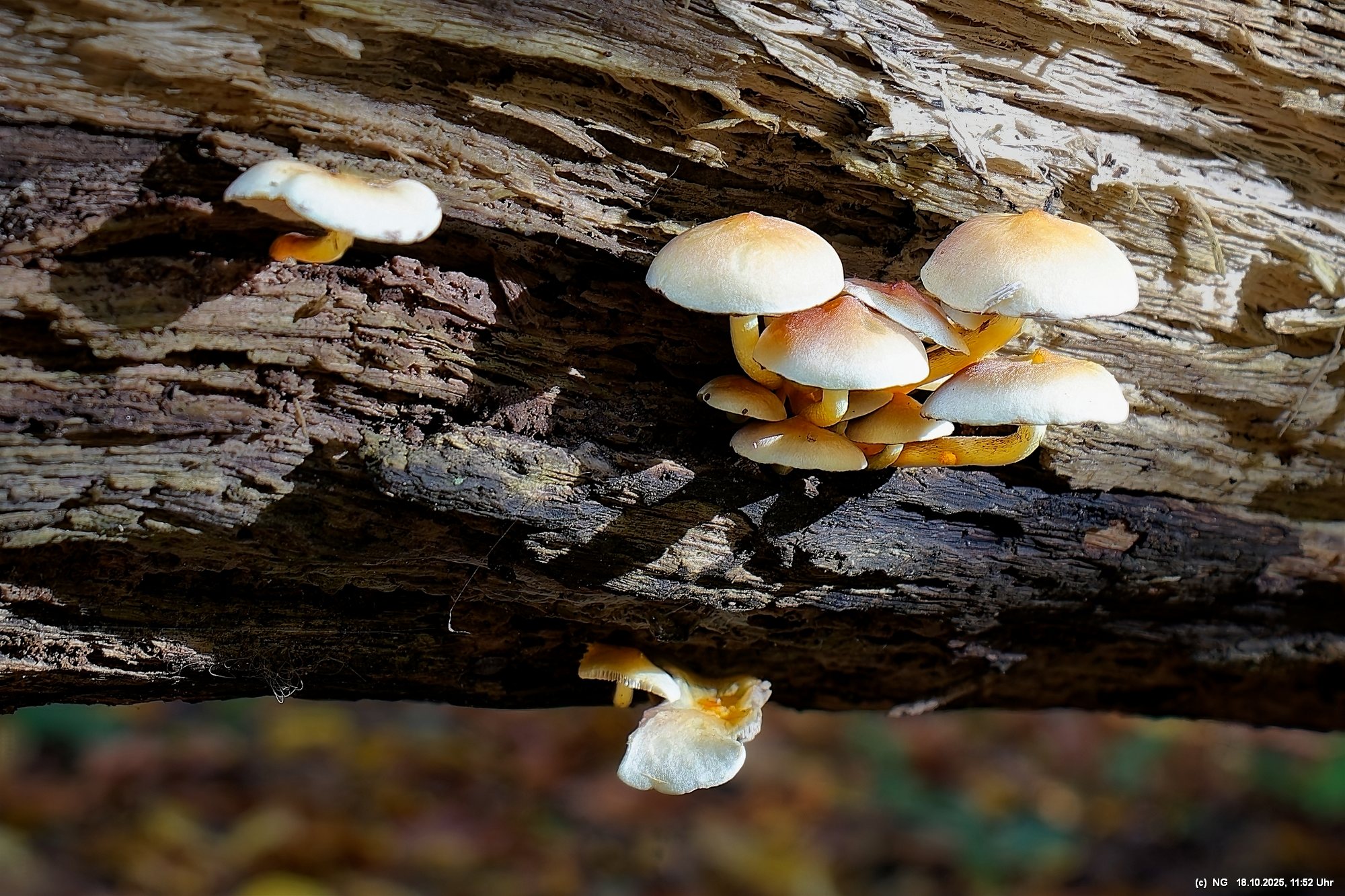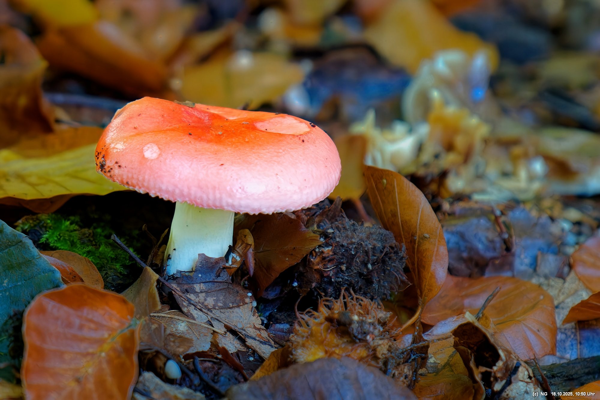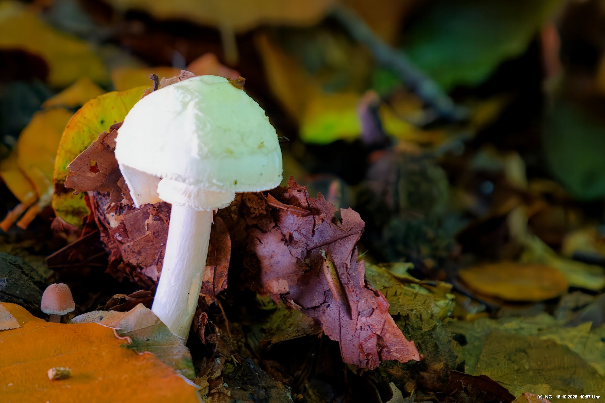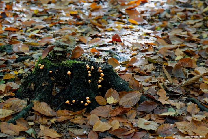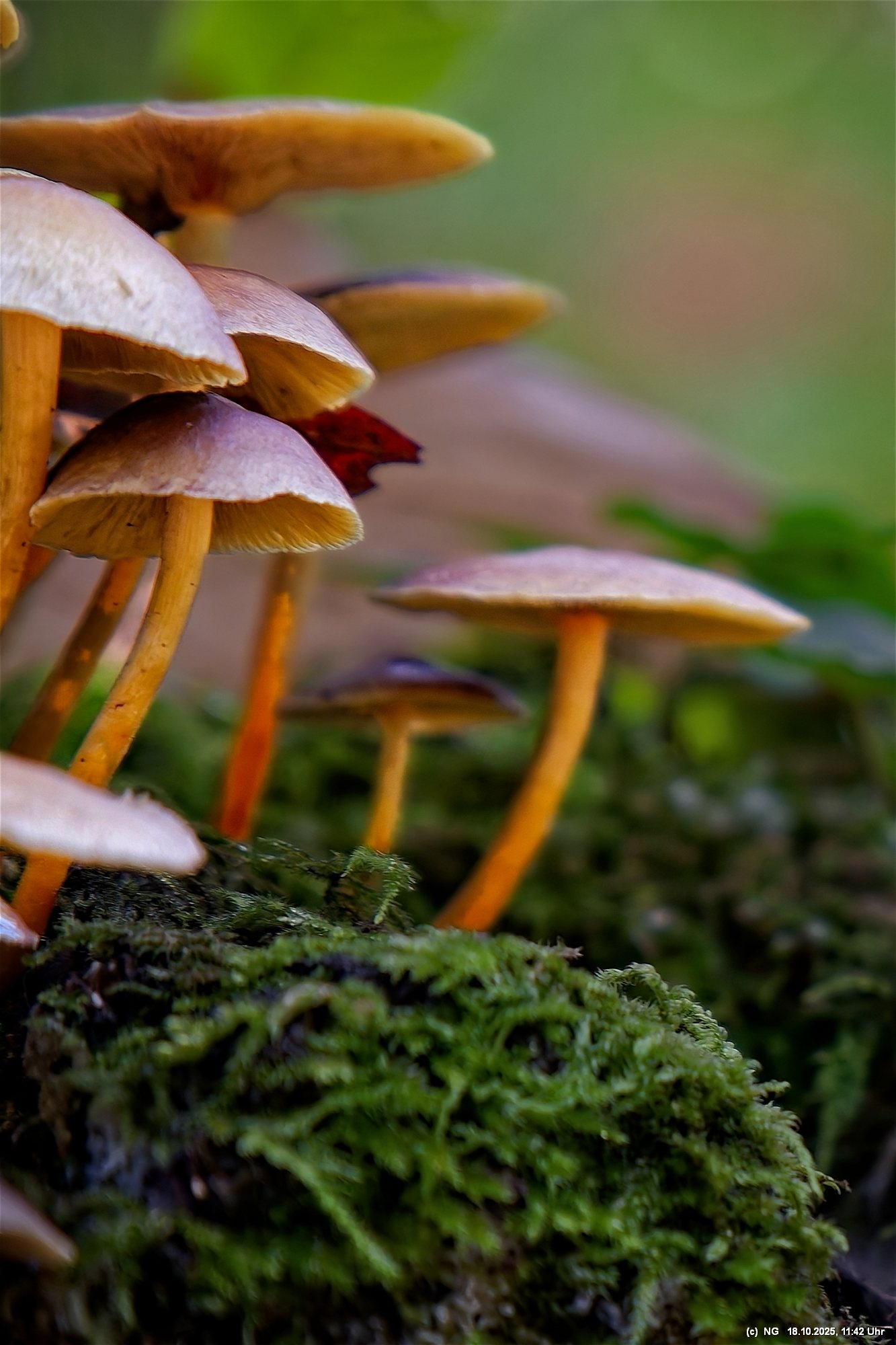 Egal ob das Gebiet zu Kirchhellen oder nur zur Stadt Bottrop gezählt wird - es ist einfach schön dort. Nur rund 10 km Luftlinie von unserem Haus entfernt - und man ist in einer besonderen Welt. Das Ruhrgebiet ist dort nicht spürbar. Der Rotbach verdoppelt dort durch Windungen seine Länge. Der Weg dort ist kein Verkehrsweg und daher trifft man dort nur wenige Spaziergänger. Jetzt im Herbst sind die Libellen verschwunden, aber dafür kommen die bunten Farben des Waldes und vor allem Pilze. Man kann über die Mengen nicht spekulieren. Mal sind es ungeheuer viele, mal muss man sie suchen. Es geht dort nur um die Schönheit der Pilze, also nicht um Speisepilze. Diesmal war die Menge überschaubar, aber mit etwas Geduld und das Gefühl für die Orte konnte man auch bei diesem Besuch auch ne Menge finden.