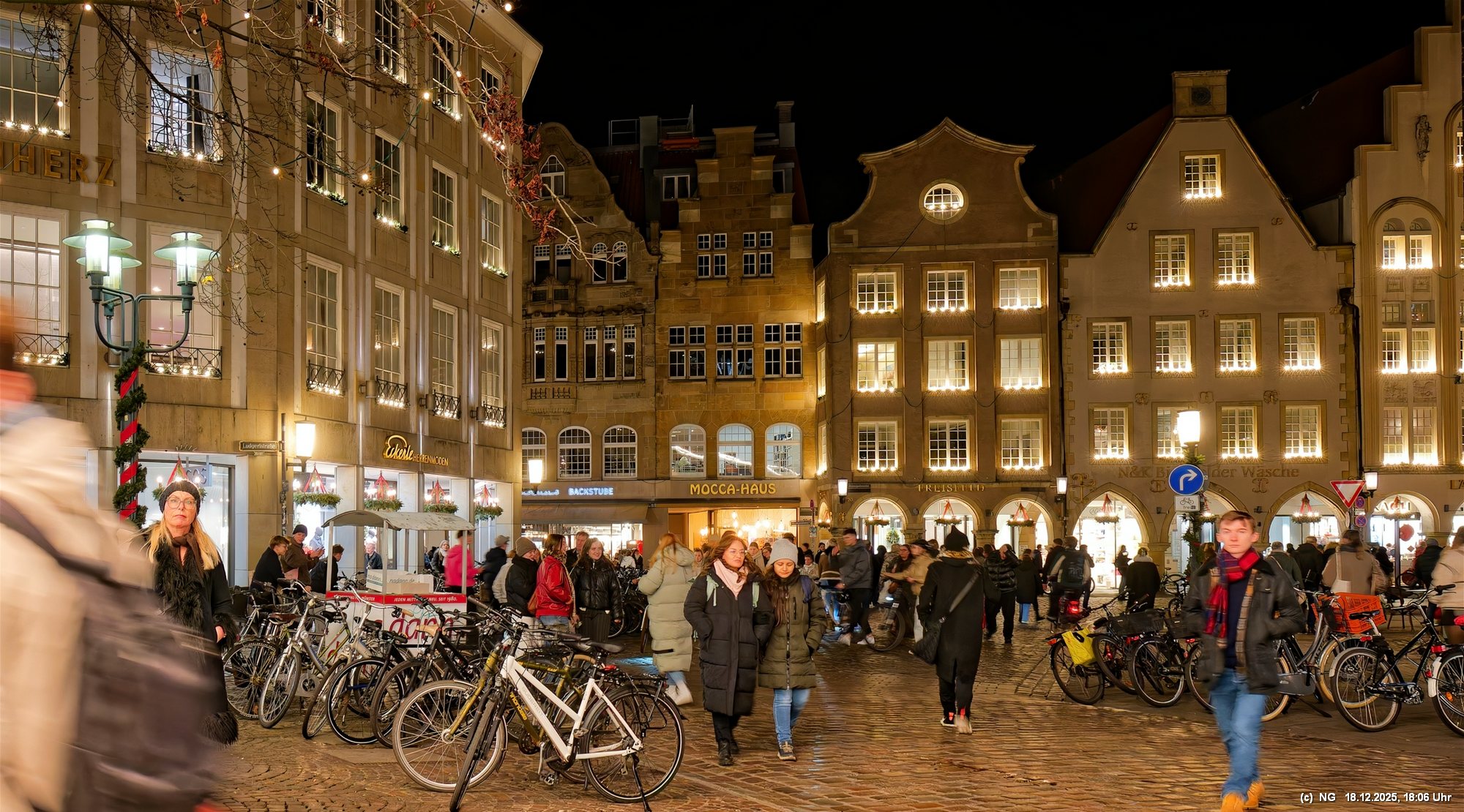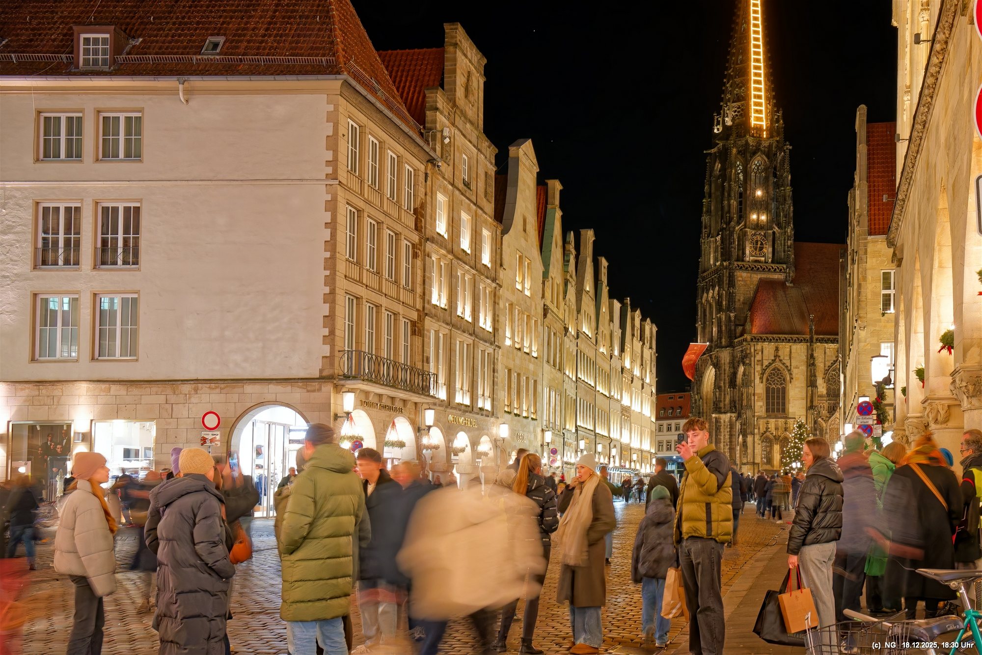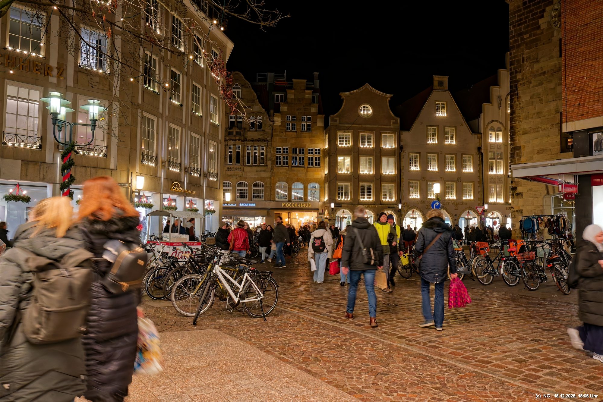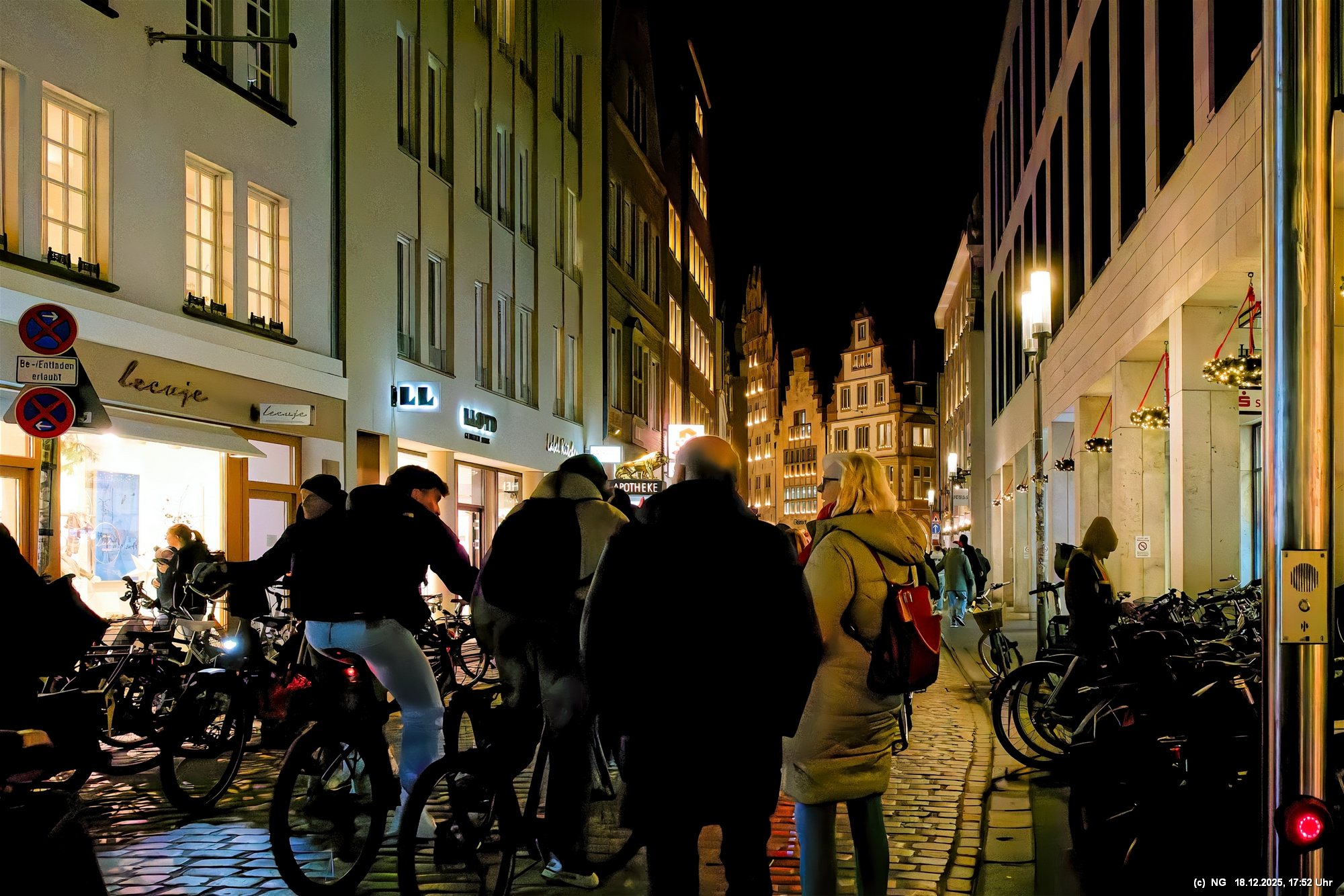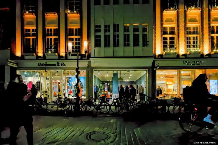 Damit haben wir so gar nicht gerechnet: Die Stadt war nach den nassen Tagen sowas von rappelvoll, dass es weder freie Plätze in den Parkhäusern noch auf Parkflächen in der Nähe der Innenstadt gab. Sogar die Auffahrrampen der Parkäuser waren voll und die Autos standen. Überall gab es Baustellen (Glasfaser...) und damit Umleitungen und Richtungsänderungen von Einbahnstraßen. Das Navi wusste dann auch nicht immer weiter, aber der Zufall kam uns zur Hilfe... So konnten wir doch durch die wunderschön beleuchtete Innenstadt schlendern. Dort war es auch richtig voll. Wenn man als Fußgänger die Straßenseite wechseln wollte. musste man irgendeinen Weg durch die abgestellen Fahrräder suchen (man hat das Gefühl, als gäbe es mehr Fahrräder als Bewohner). Aber die Stimmung war toll - es hat sich gelohnt"