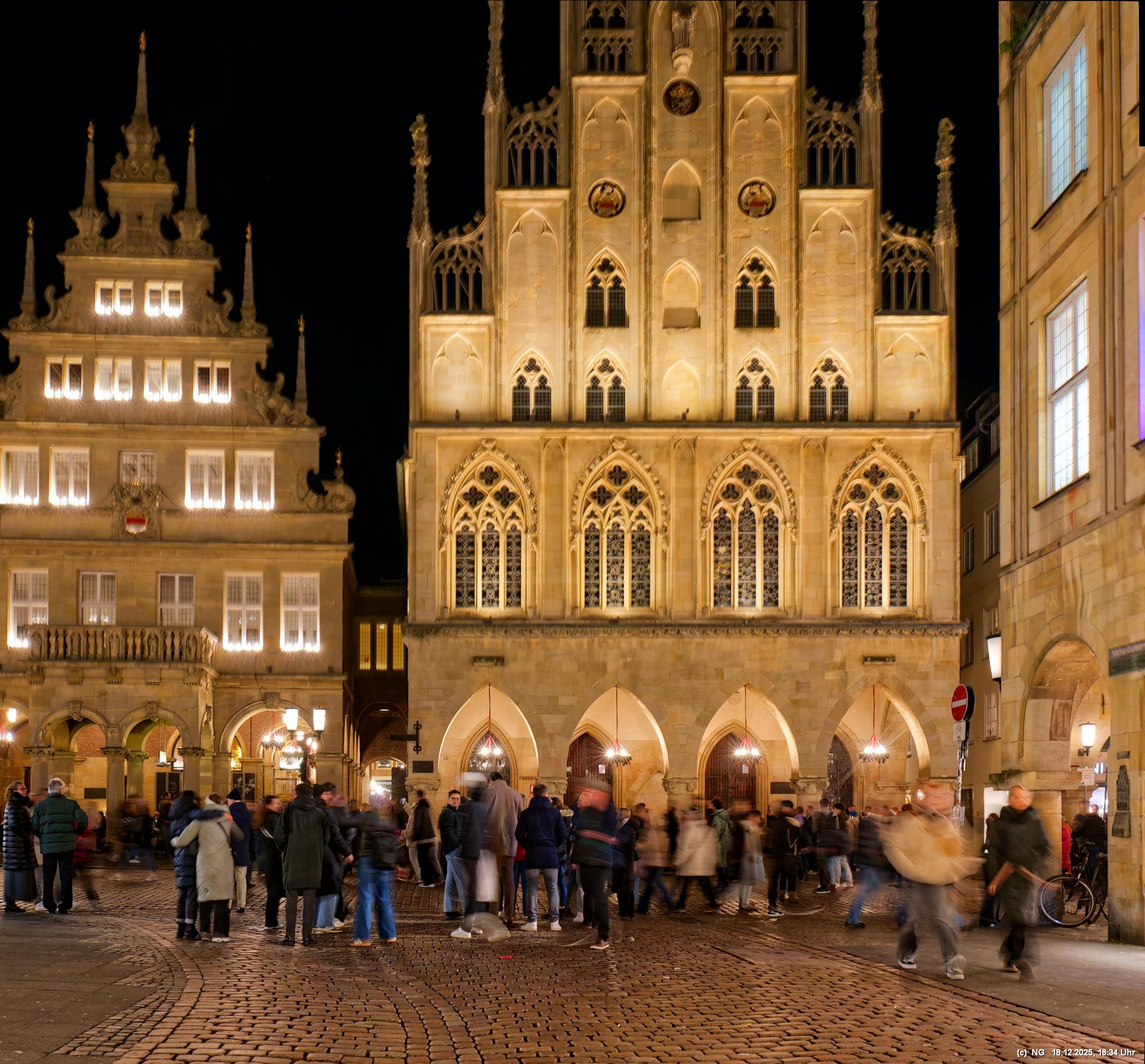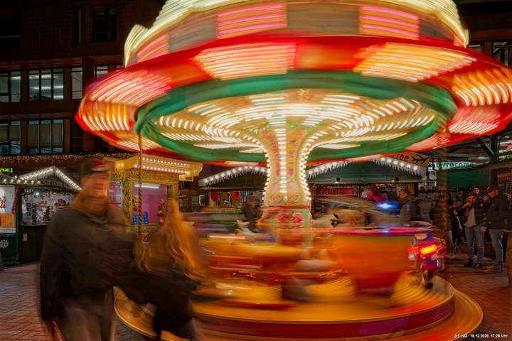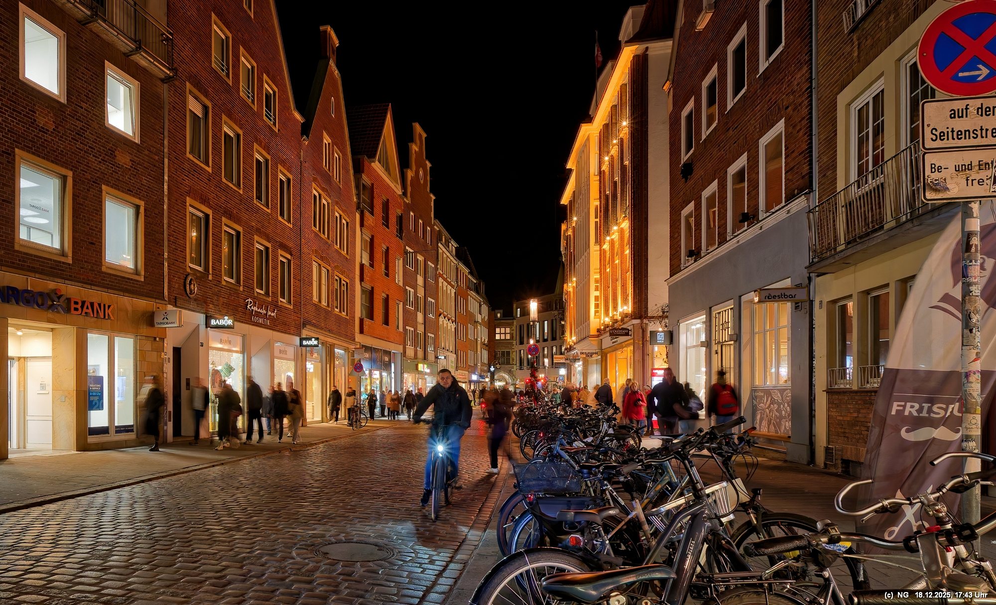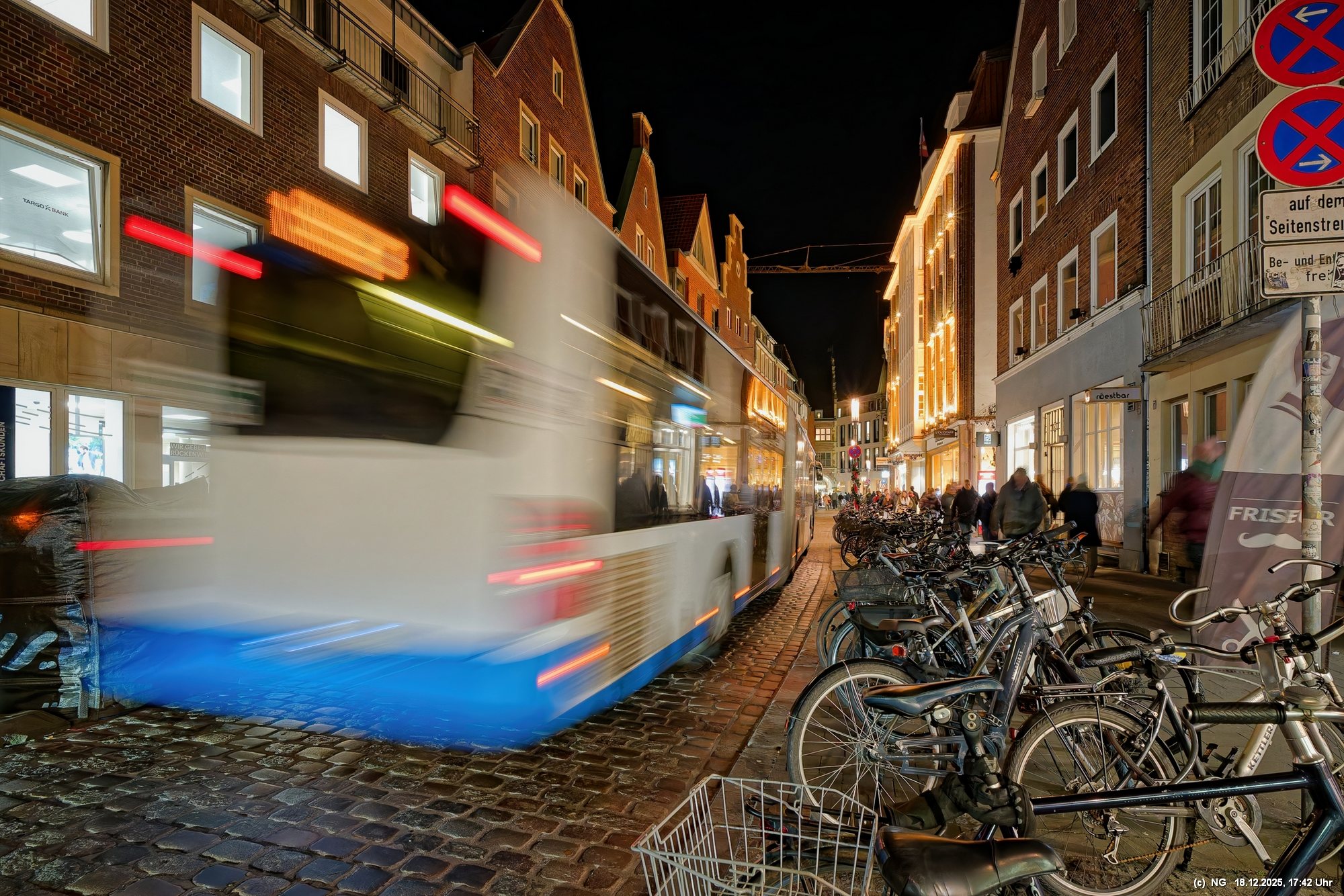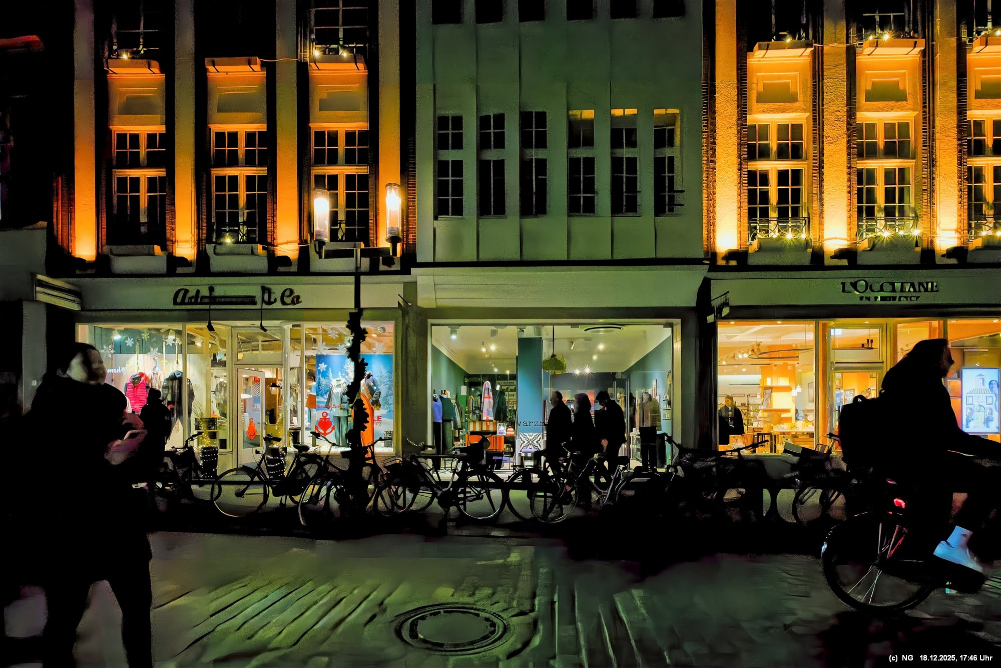 Damit haben wir so gar nicht gerechnet: Die Stadt war nach den nassen Tagen sowas von rappelvoll, dass es weder freie Plätze in den Parkhäusern noch auf Parkflächen in der Nähe der Innenstadt gab. Sogar die Auffahrrampen der Parkäuser waren voll und die Autos standen. Überall gab es Baustellen (Glasfaser...) und damit Umleitungen und Richtungsänderungen von Einbahnstraßen. Das Navi wusste dann auch nicht immer weiter, aber der Zufall kam uns zur Hilfe... So konnten wir doch durch die wunderschön beleuchtete Innenstadt schlendern. Dort war es auch richtig voll. Wenn man als Fußgänger die Straßenseite wechseln wollte. musste man irgendeinen Weg durch die abgestellen Fahrräder suchen (man hat das Gefühl, als gäbe es mehr Fahrräder als Bewohner). Aber die Stimmung war toll - es hat sich gelohnt"