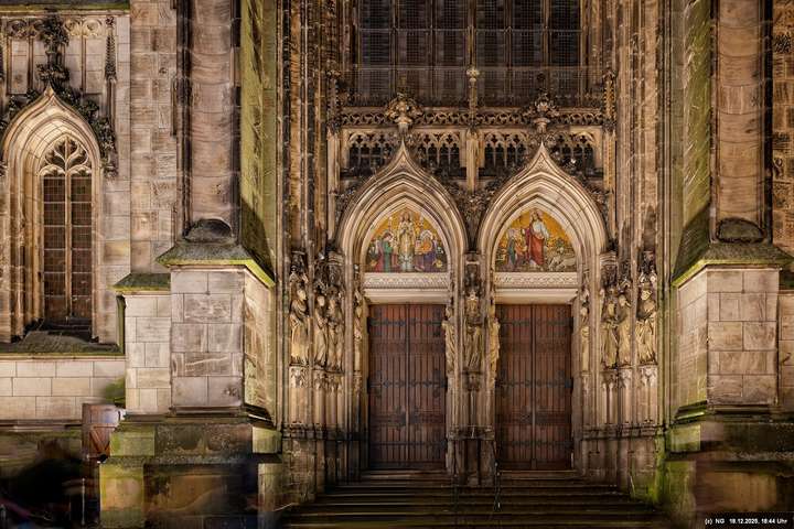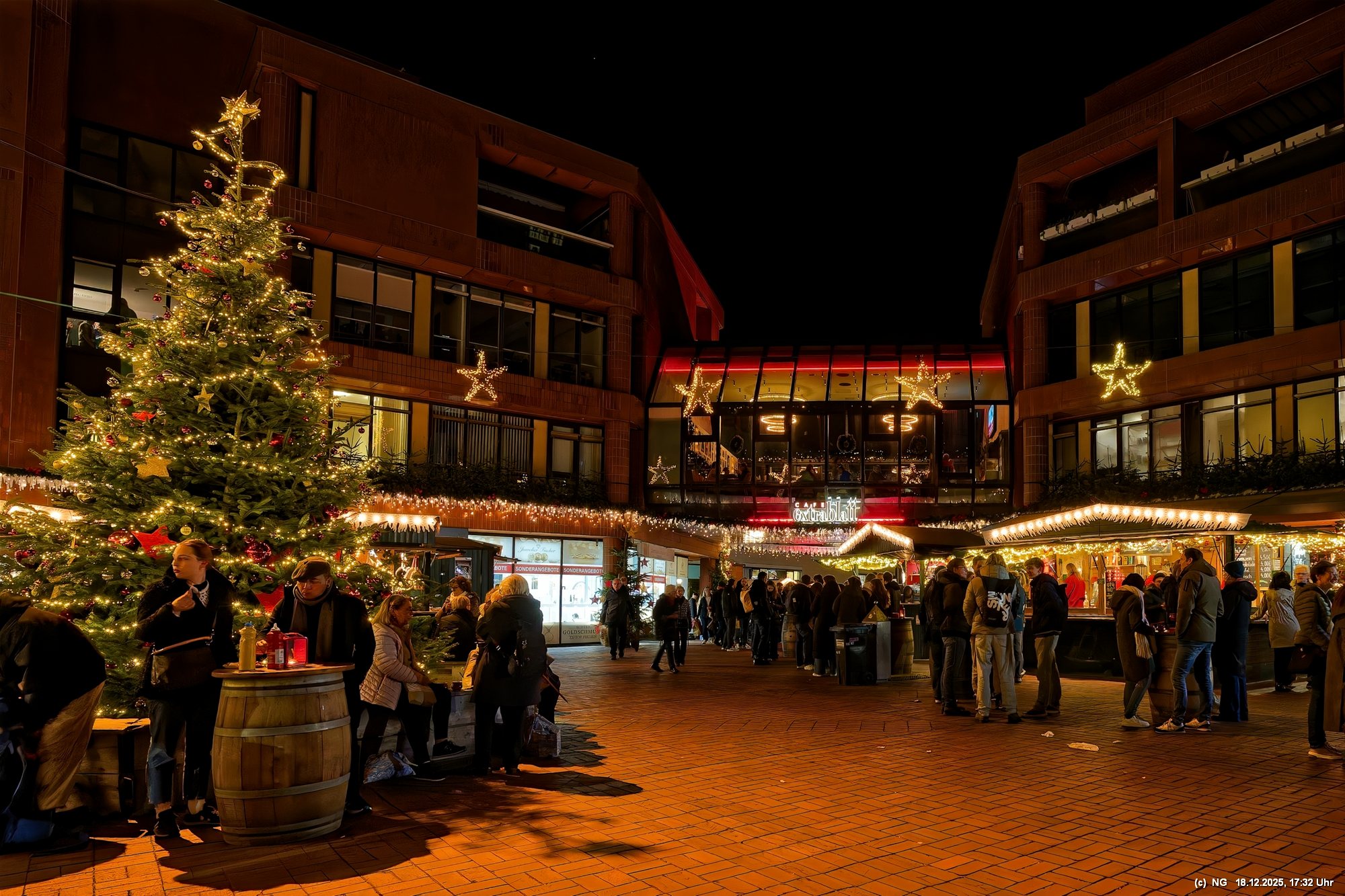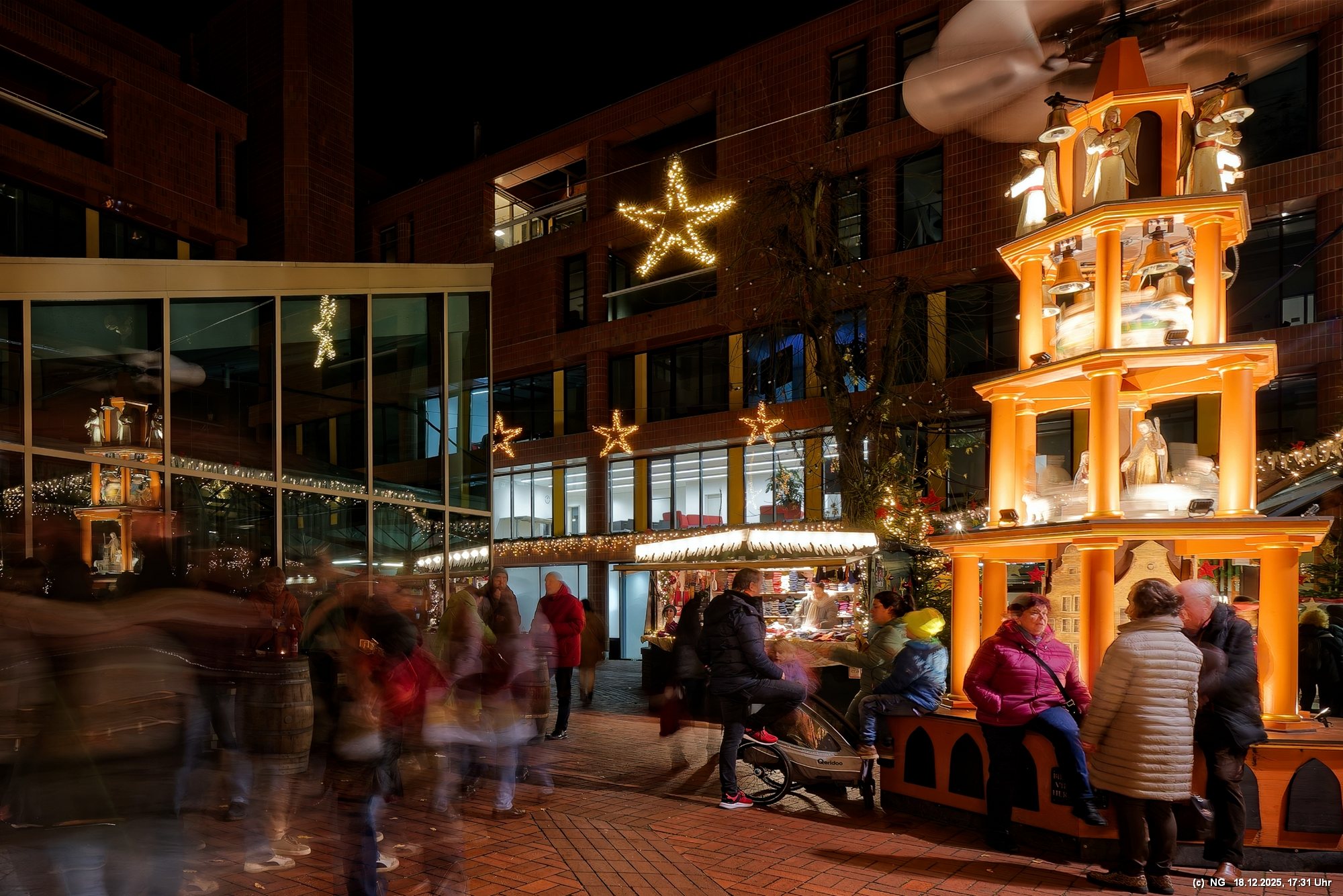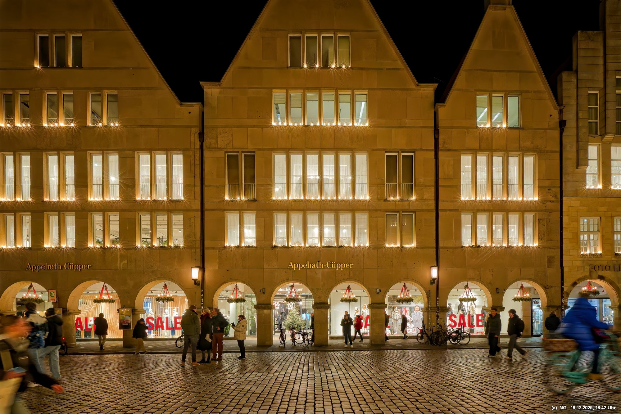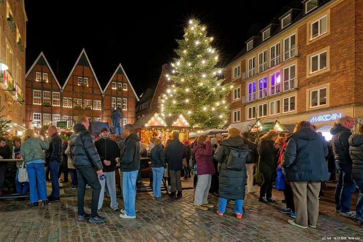 Damit haben wir so gar nicht gerechnet: Die Stadt war nach den nassen Tagen sowas von rappelvoll, dass es weder freie Plätze in den Parkhäusern noch auf Parkflächen in der Nähe der Innenstadt gab. Sogar die Auffahrrampen der Parkäuser waren voll und die Autos standen. Überall gab es Baustellen (Glasfaser...) und damit Umleitungen und Richtungsänderungen von Einbahnstraßen. Das Navi wusste dann auch nicht immer weiter, aber der Zufall kam uns zur Hilfe... So konnten wir doch durch die wunderschön beleuchtete Innenstadt schlendern. Dort war es auch richtig voll. Wenn man als Fußgänger die Straßenseite wechseln wollte. musste man irgendeinen Weg durch die abgestellen Fahrräder suchen (man hat das Gefühl, als gäbe es mehr Fahrräder als Bewohner). Aber die Stimmung war toll - es hat sich gelohnt"