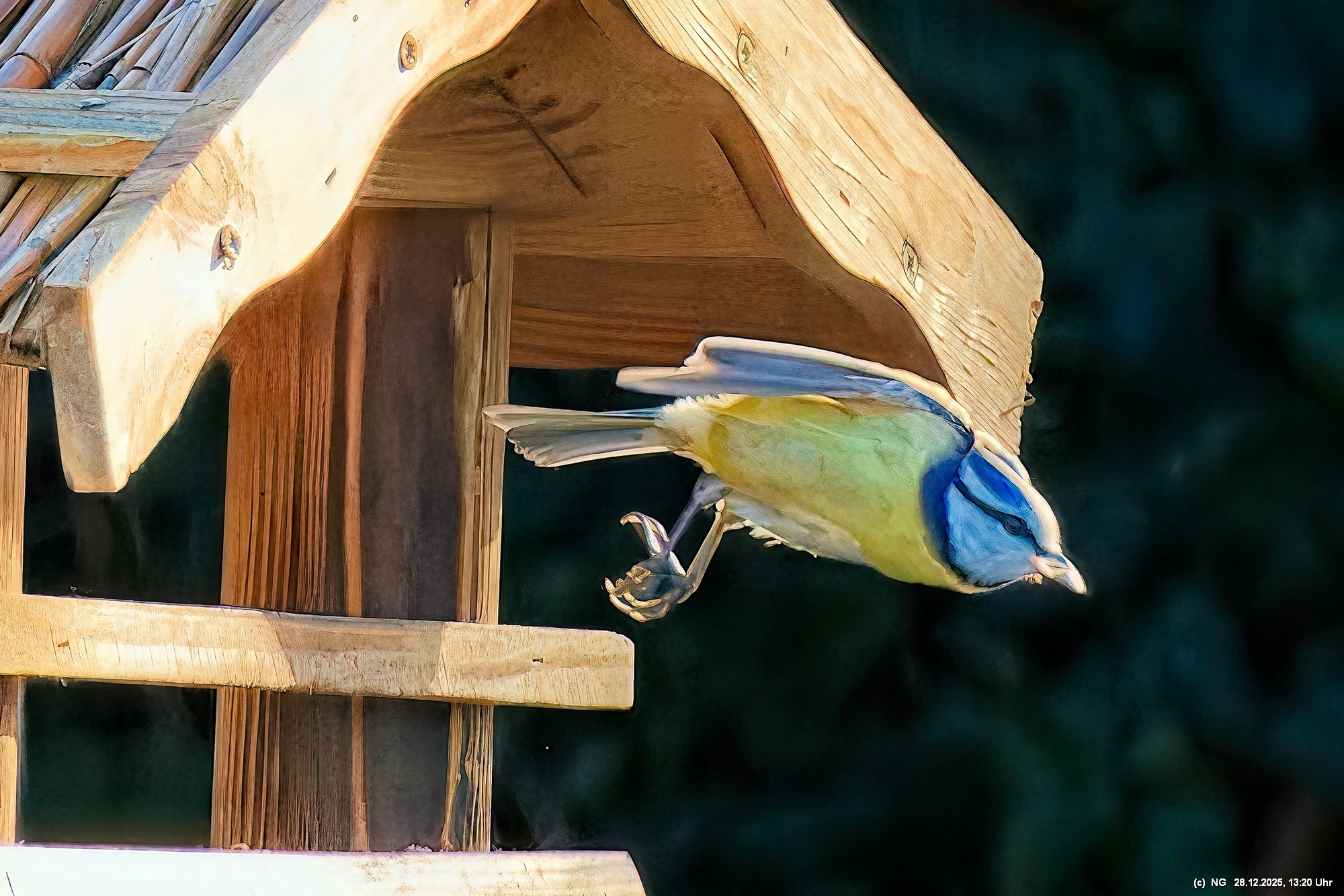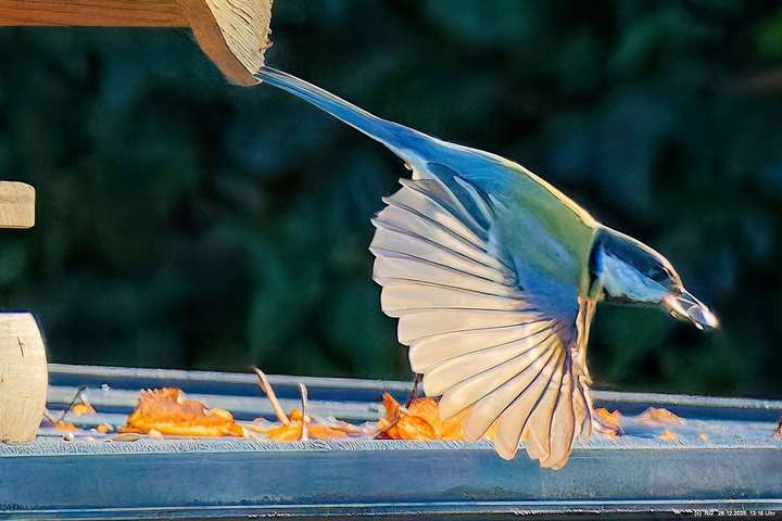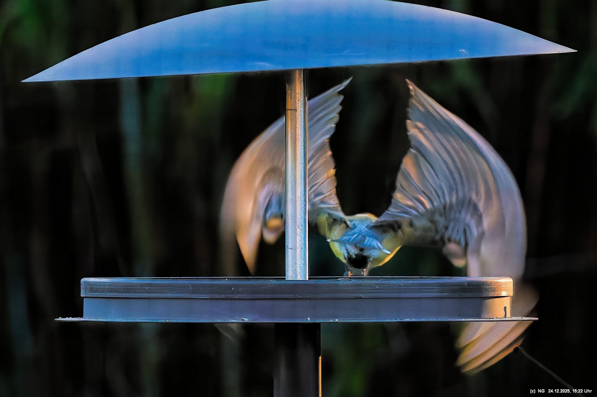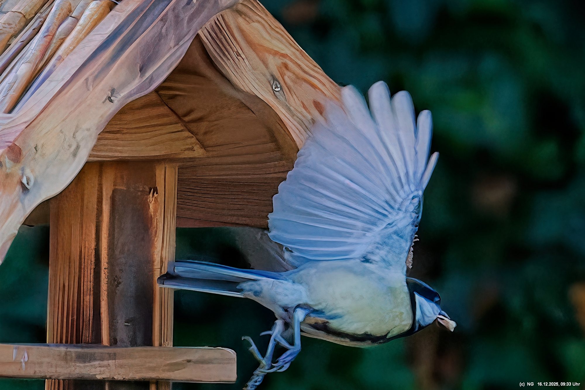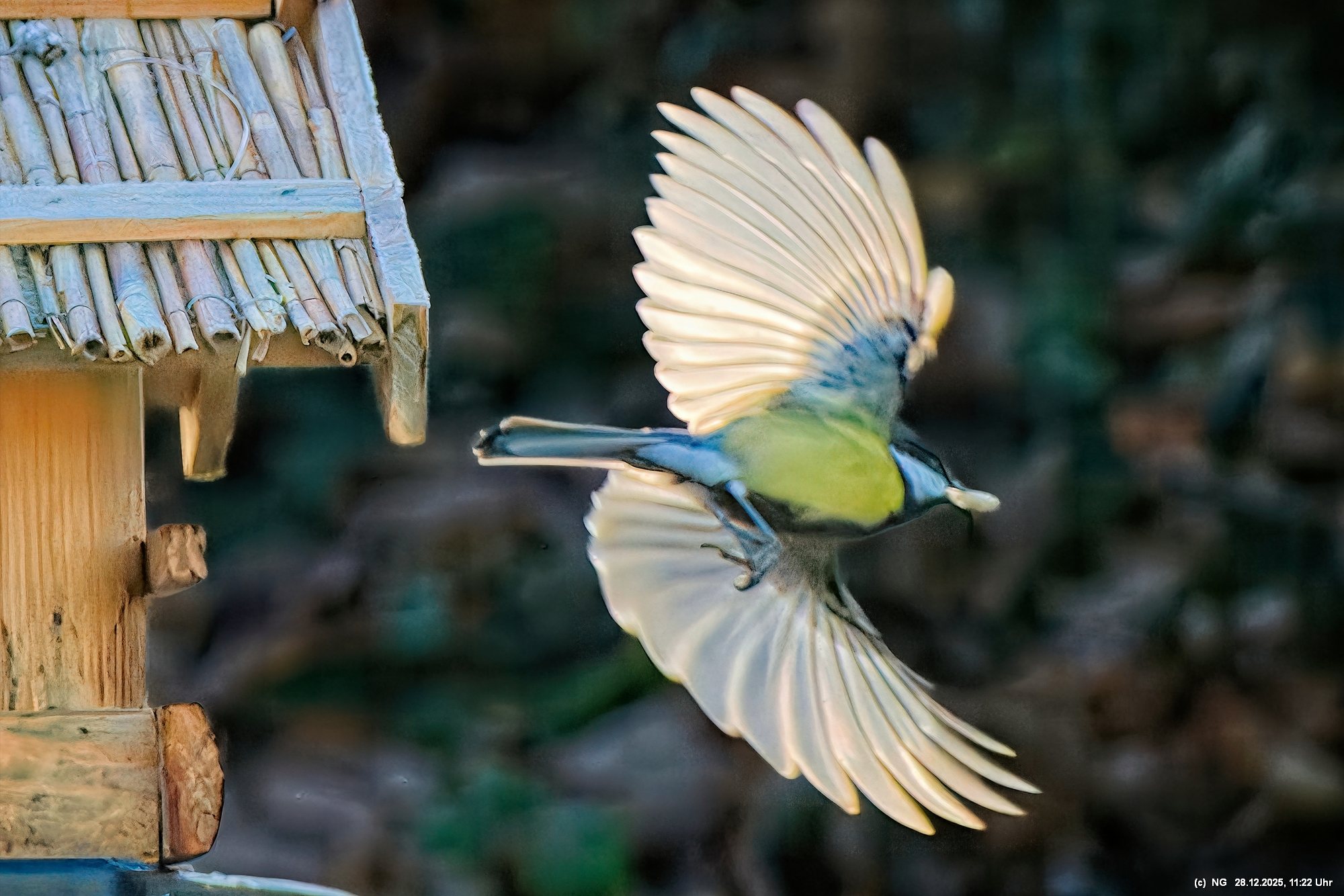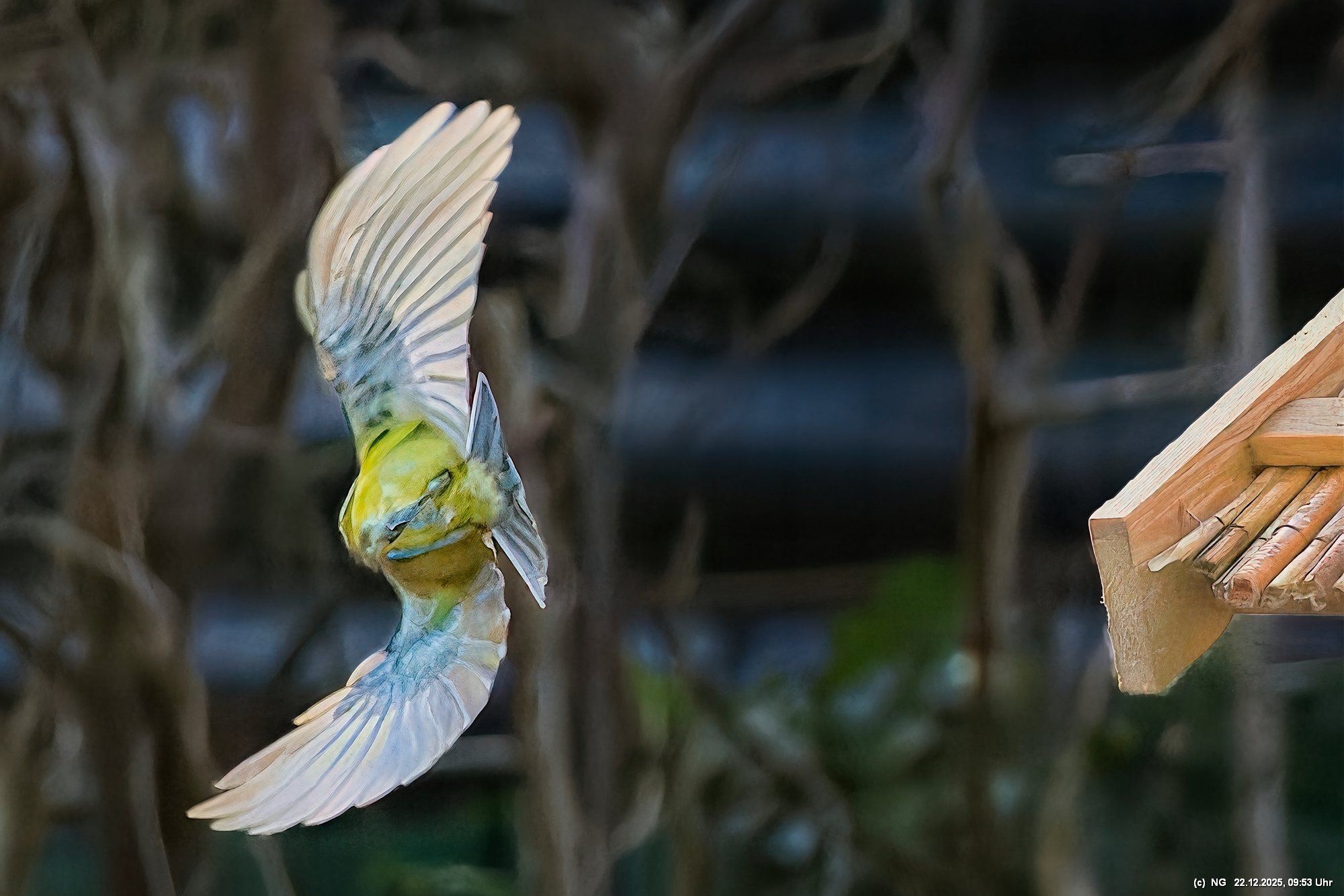 An 3 kleinen Stellen gab es ein unterschiedliches Angebot: Ein kleines Haus, eine Futterschale und einen Meisenknödelspender. Schon nach kurzer Zeit wurden die Plätze angenommen und regelmäßig besucht. Beim Fotografieren gab es das Problem, dass Morgens gegen 10 Uhr das Haus im Gegenlicht stand und die Schale schon vor 15 Uhr viel zu dunkel war. Dazu kam, dass die Vögel doch recht scheu waren und aus versteckter Position mit sehr kurzer Belichtungszeit (1/4.000 sec.) und hohem ISO-Wert (10.000) fotografiert werden musste. So nach und nach ist dann eine Sammlung entstanden, die die Flugkünste der Kleinen deutlich zeigt. Es war spannend und man fühlte so etwas wie Jagdfieber.