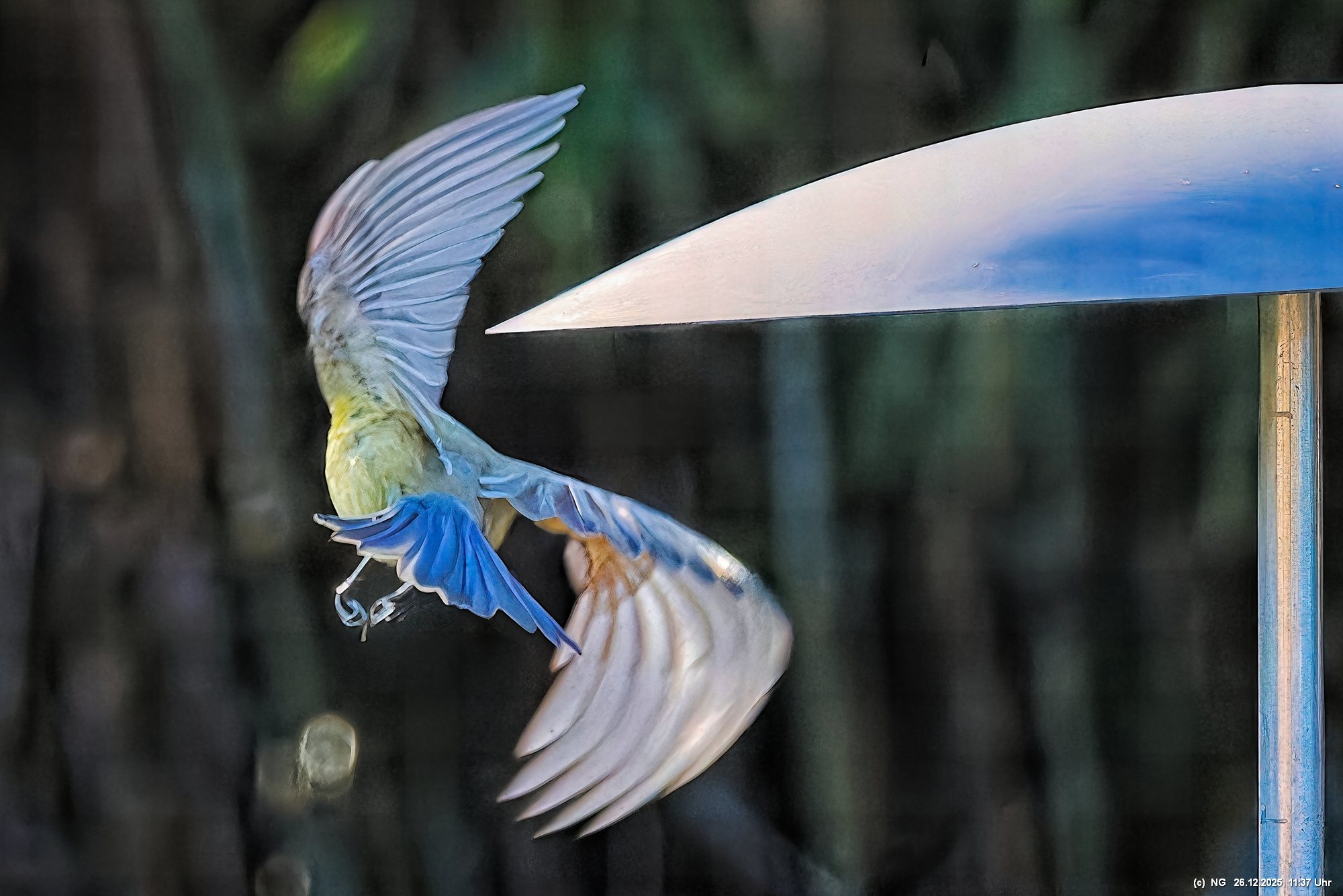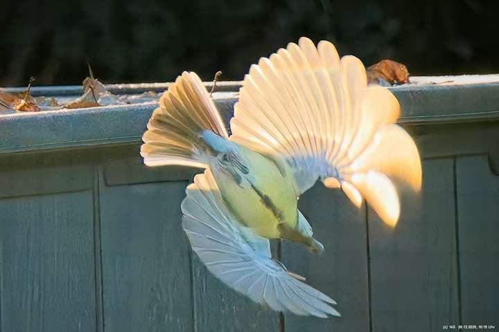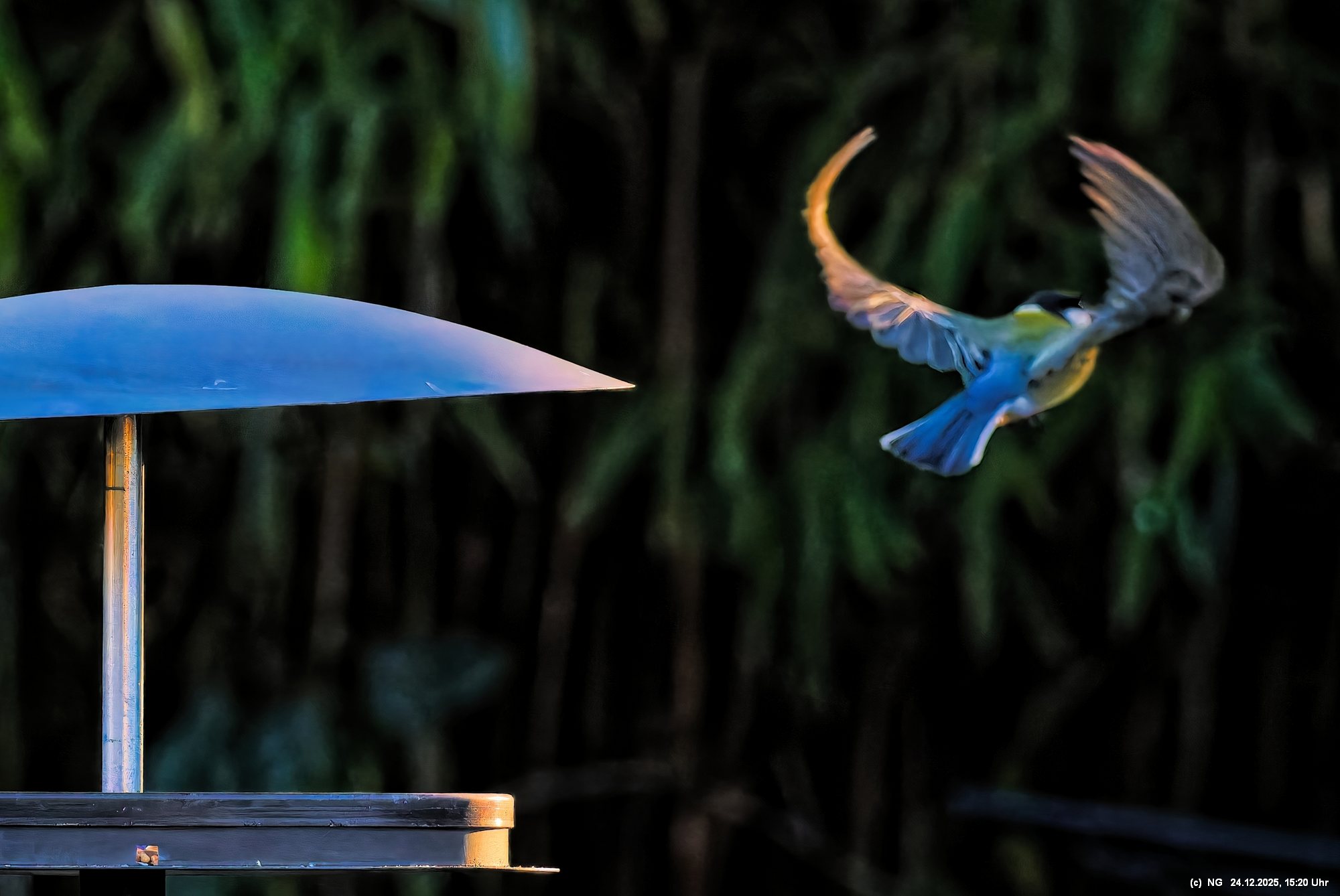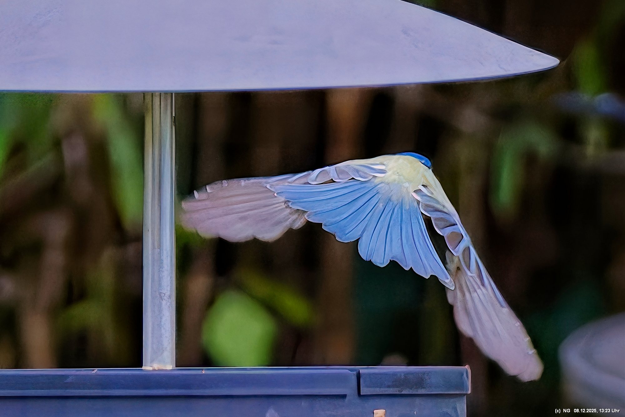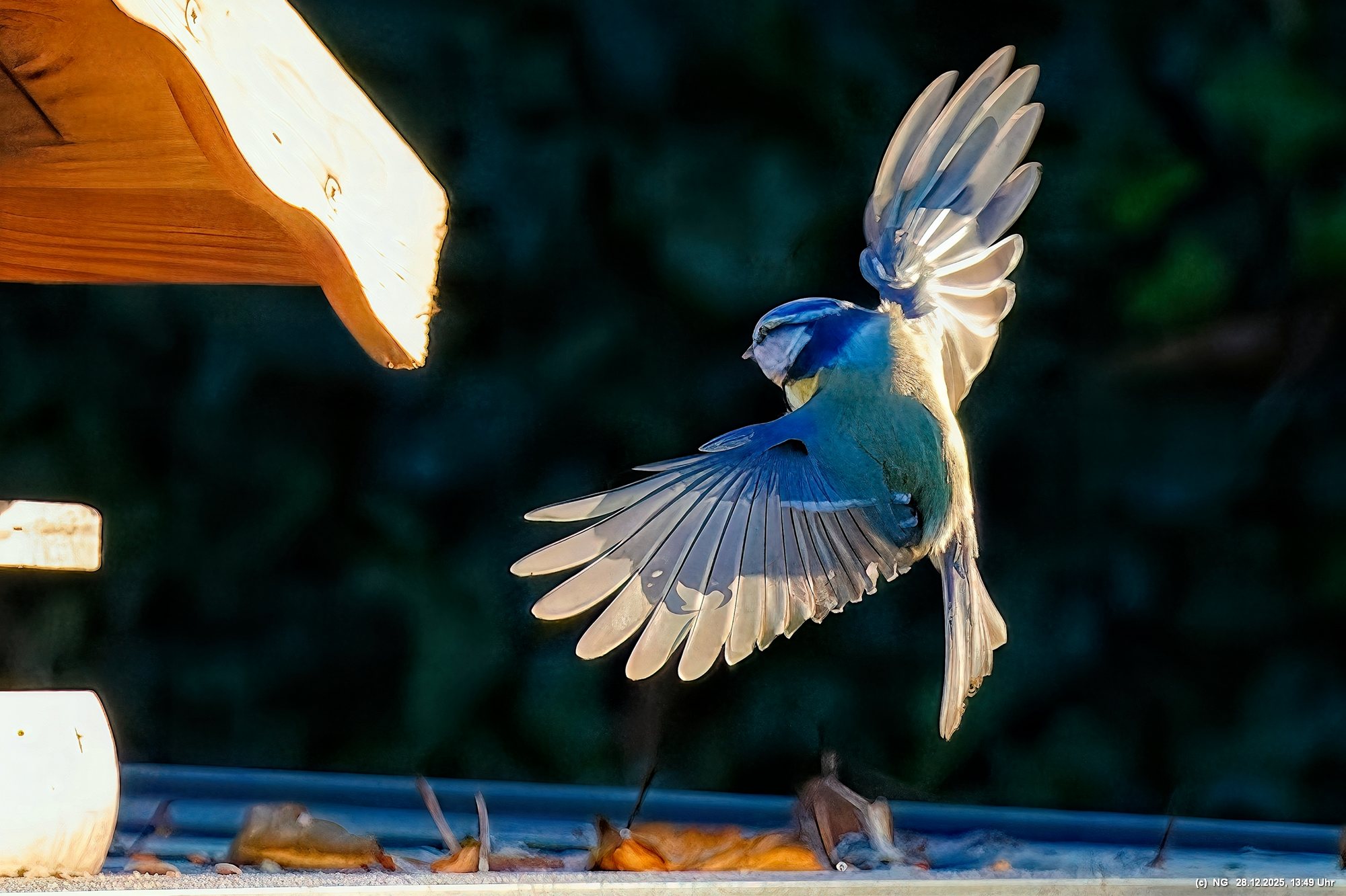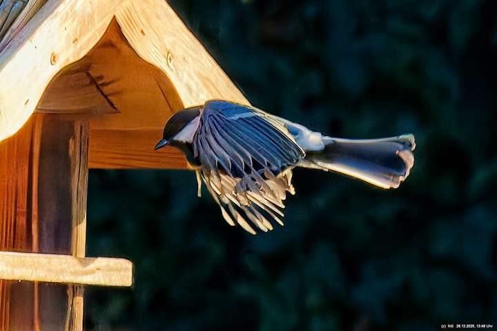 An 3 kleinen Stellen gab es ein unterschiedliches Angebot: Ein kleines Haus, eine Futterschale und einen Meisenknödelspender. Schon nach kurzer Zeit wurden die Plätze angenommen und regelmäßig besucht. Beim Fotografieren gab es das Problem, dass Morgens gegen 10 Uhr das Haus im Gegenlicht stand und die Schale schon vor 15 Uhr viel zu dunkel war. Dazu kam, dass die Vögel doch recht scheu waren und aus versteckter Position mit sehr kurzer Belichtungszeit (1/4.000 sec.) und hohem ISO-Wert (10.000) fotografiert werden musste. So nach und nach ist dann eine Sammlung entstanden, die die Flugkünste der Kleinen deutlich zeigt. Es war spannend und man fühlte so etwas wie Jagdfieber.