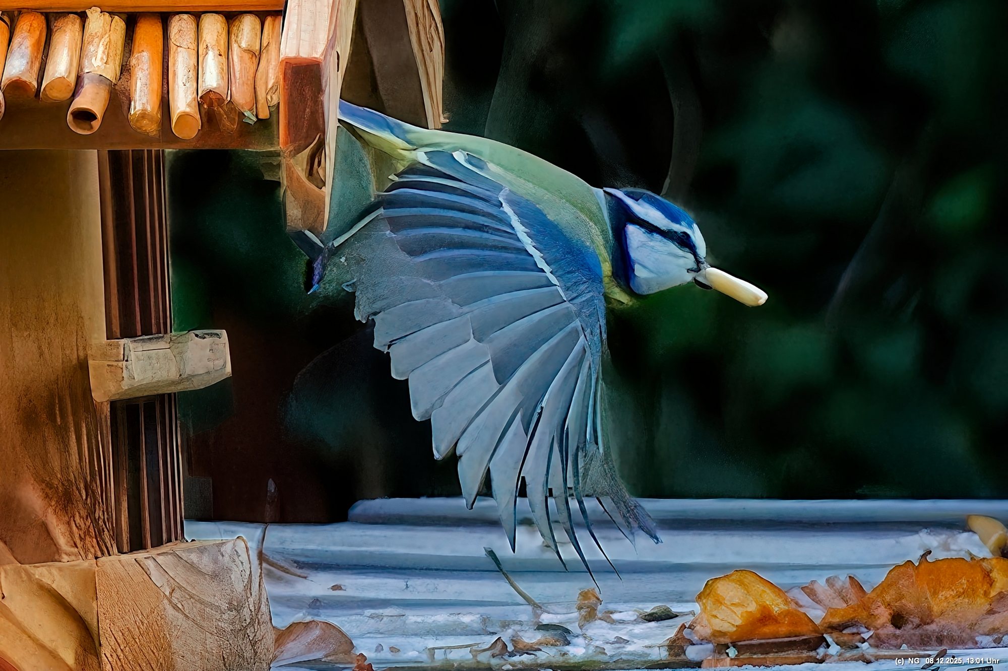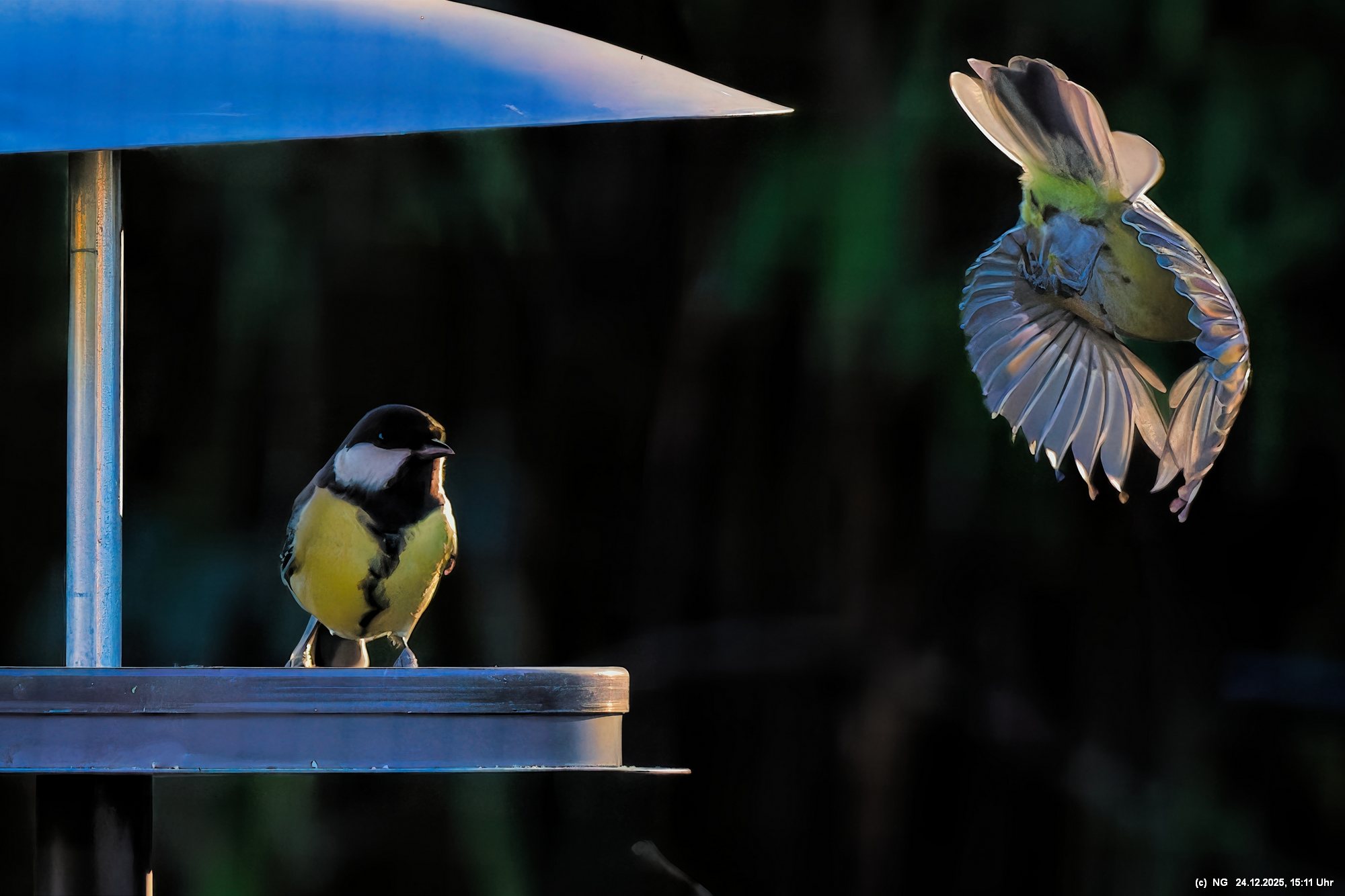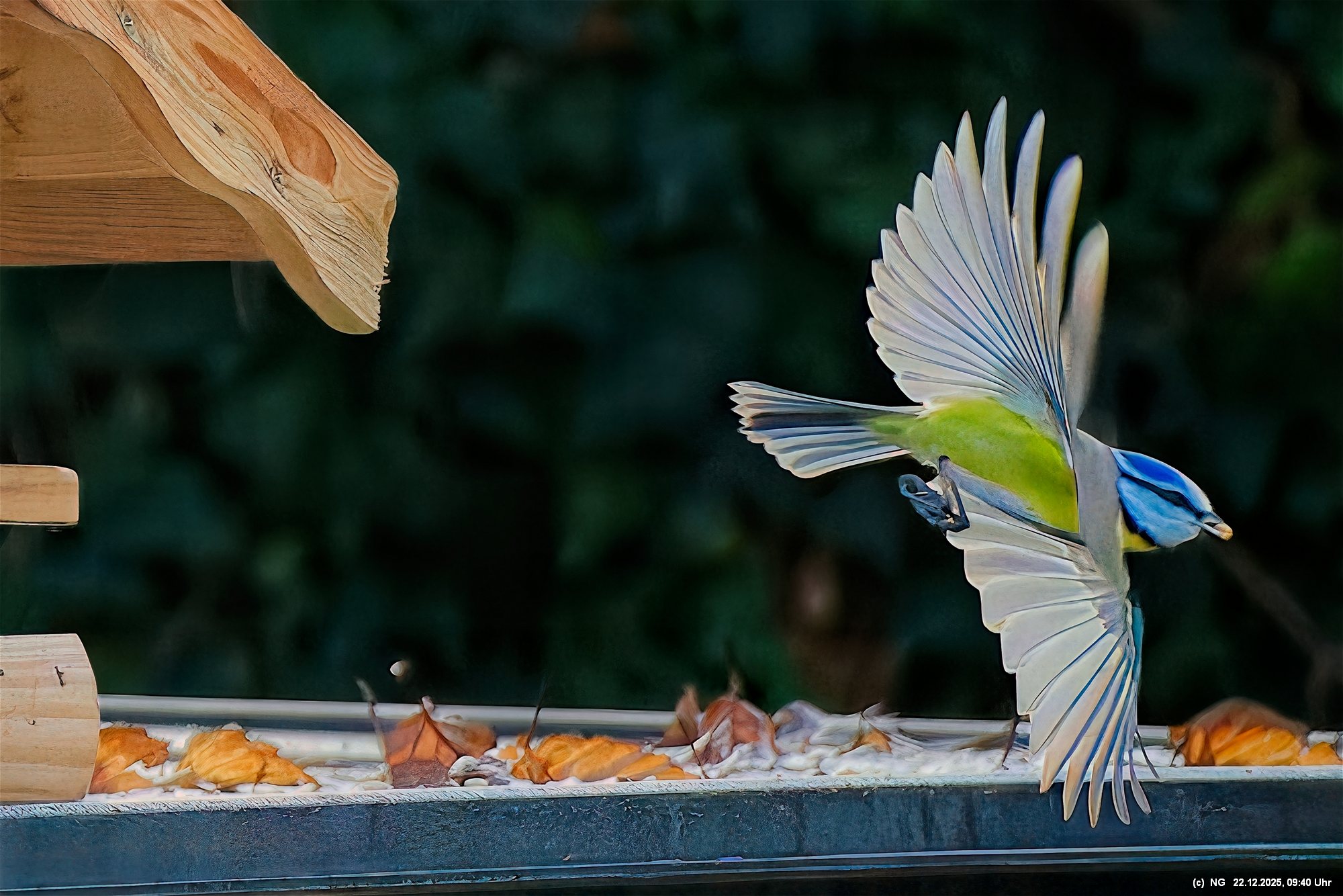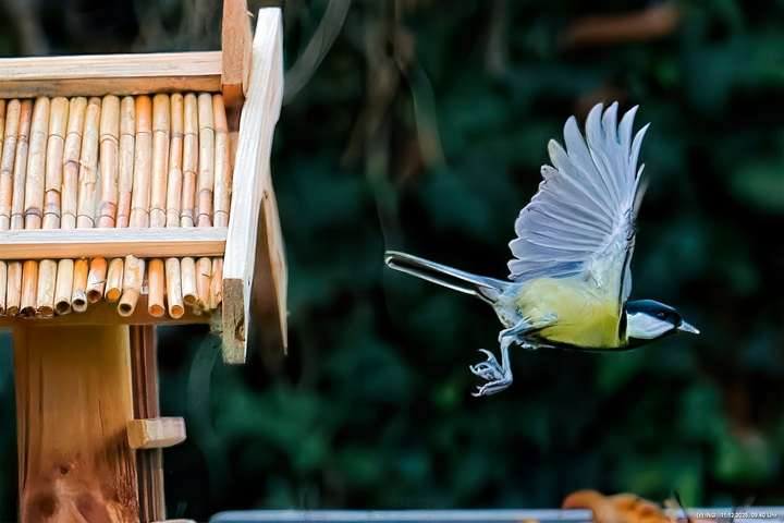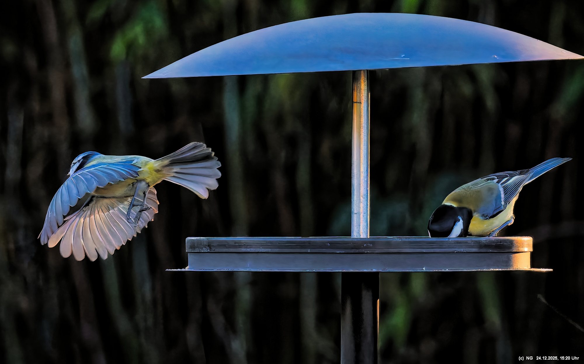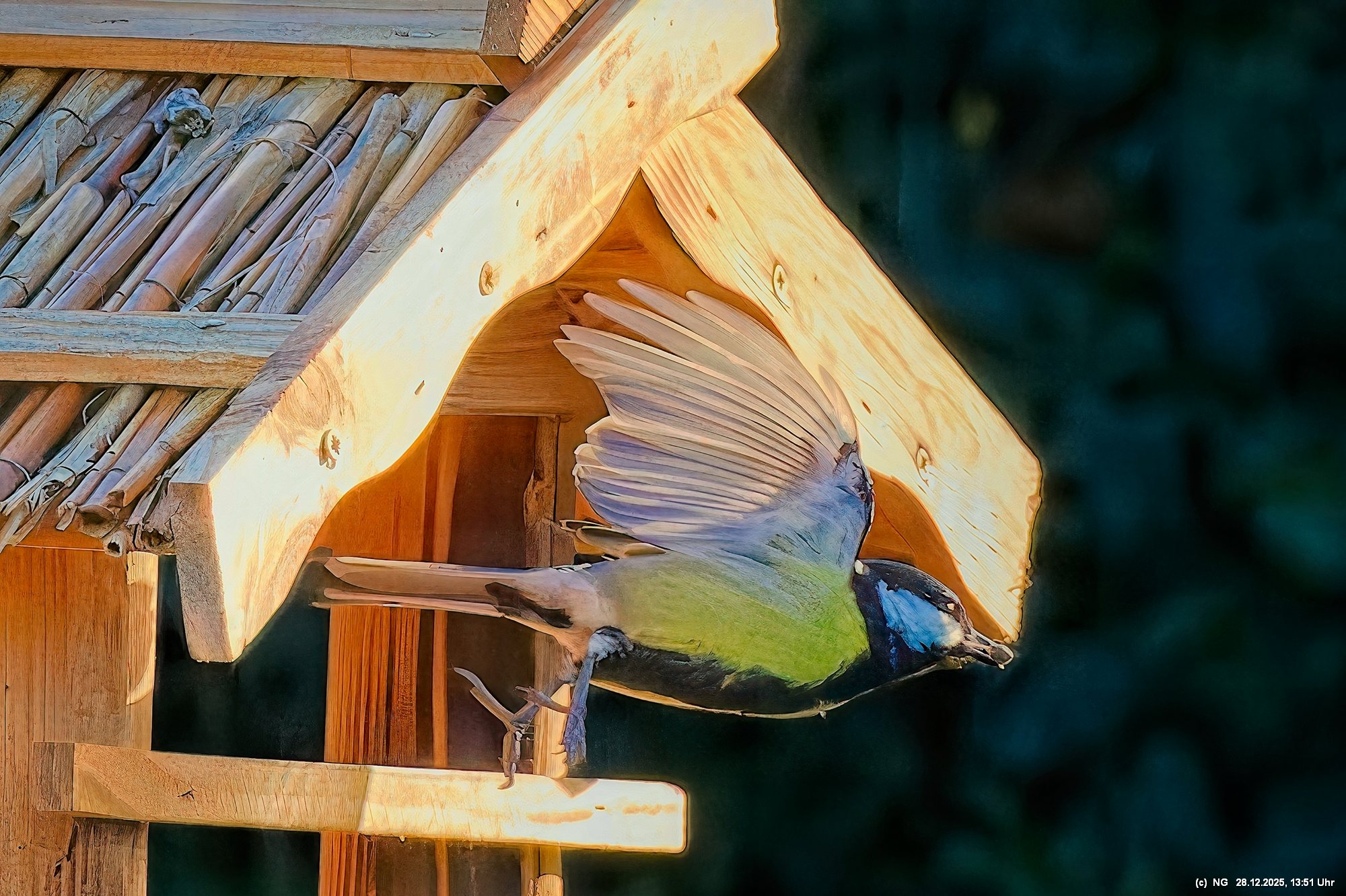 An 3 kleinen Stellen gab es ein unterschiedliches Angebot: Ein kleines Haus, eine Futterschale und einen Meisenknödelspender. Schon nach kurzer Zeit wurden die Plätze angenommen und regelmäßig besucht. Beim Fotografieren gab es das Problem, dass Morgens gegen 10 Uhr das Haus im Gegenlicht stand und die Schale schon vor 15 Uhr viel zu dunkel war. Dazu kam, dass die Vögel doch recht scheu waren und aus versteckter Position mit sehr kurzer Belichtungszeit (1/4.000 sec.) und hohem ISO-Wert (10.000) fotografiert werden musste. So nach und nach ist dann eine Sammlung entstanden, die die Flugkünste der Kleinen deutlich zeigt. Es war spannend und man fühlte so etwas wie Jagdfieber.