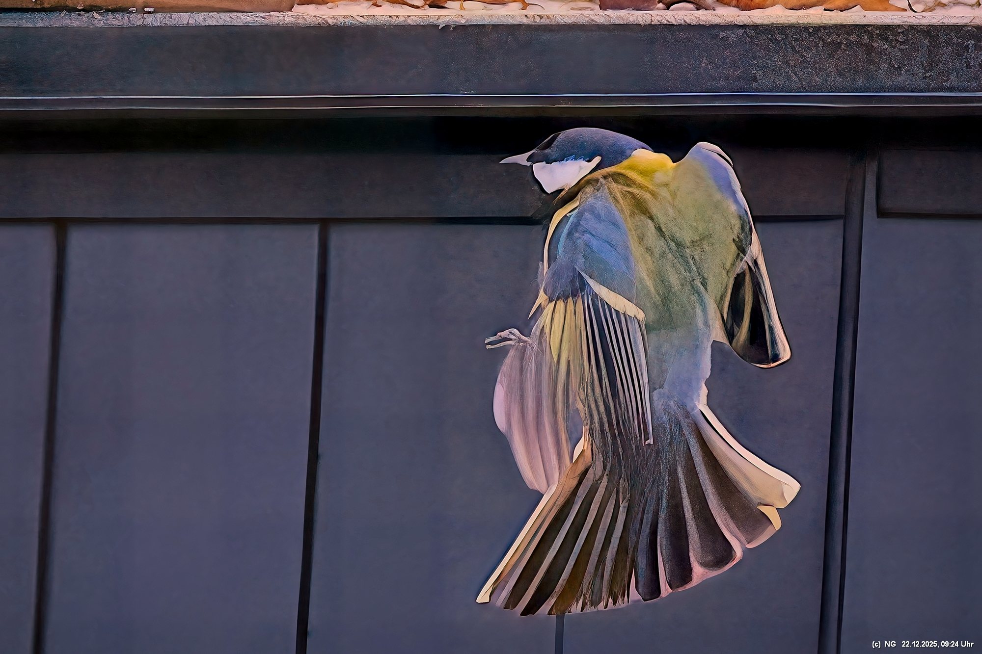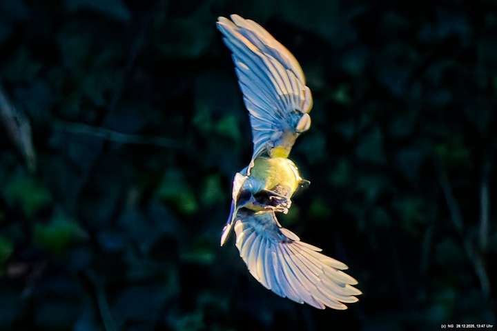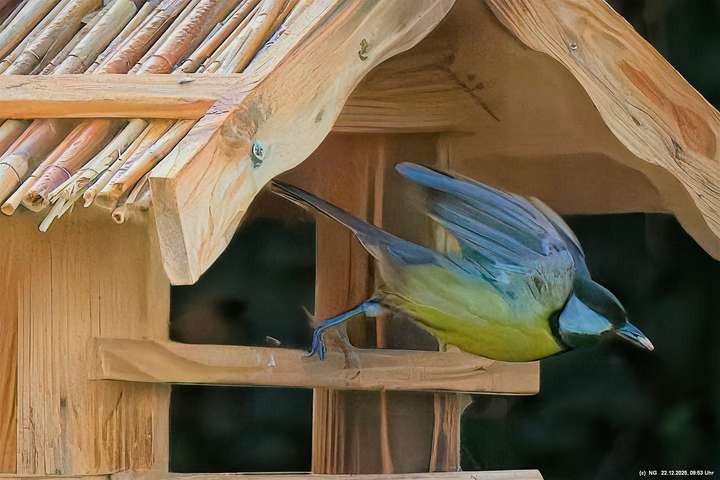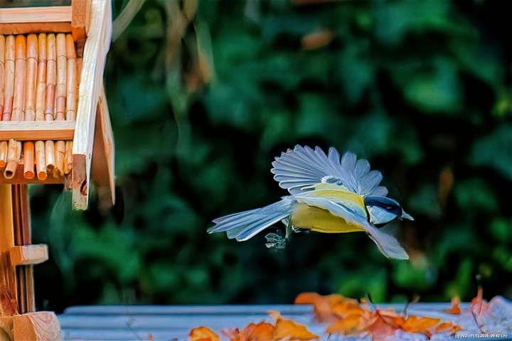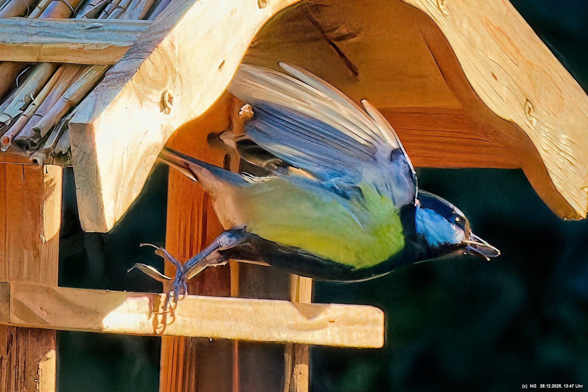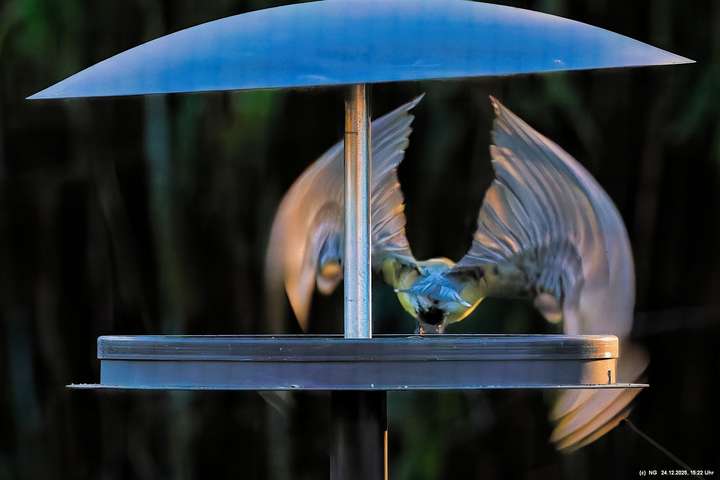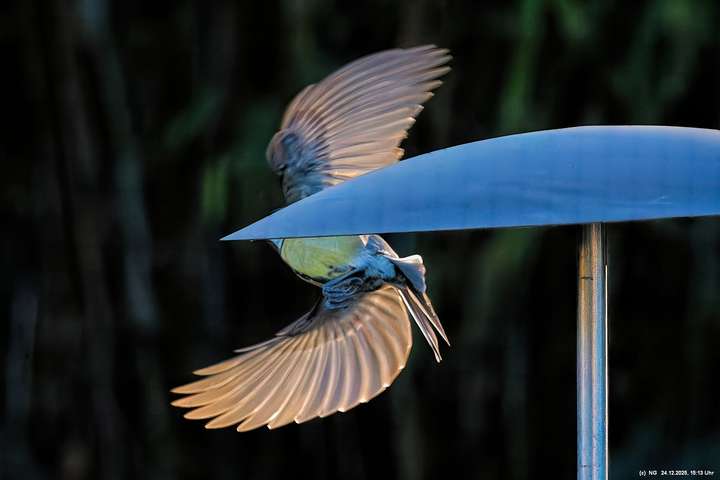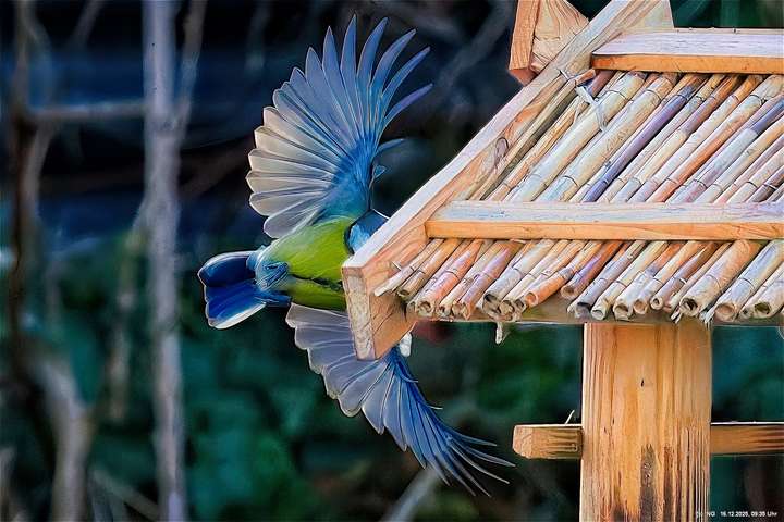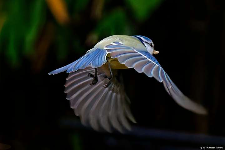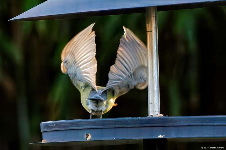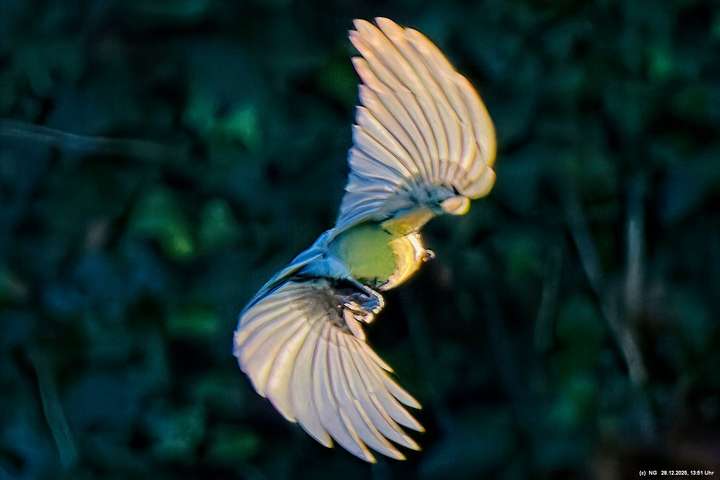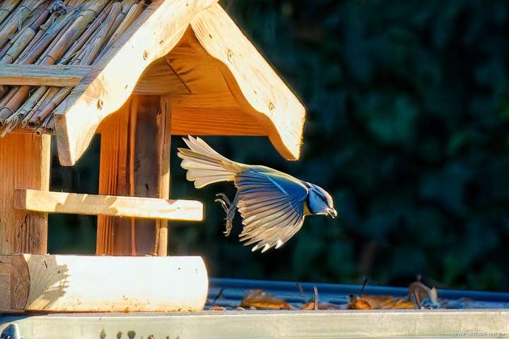 An 3 kleinen Stellen gab es ein unterschiedliches Angebot: Ein kleines Haus, eine Futterschale und einen Meisenknödelspender. Schon nach kurzer Zeit wurden die Plätze angenommen und regelmäßig besucht. Beim Fotografieren gab es das Problem, dass Morgens gegen 10 Uhr das Haus im Gegenlicht stand und die Schale schon vor 15 Uhr viel zu dunkel war. Dazu kam, dass die Vögel doch recht scheu waren und aus versteckter Position mit sehr kurzer Belichtungszeit (1/4.000 sec.) und hohem ISO-Wert (10.000) fotografiert werden musste. So nach und nach ist dann eine Sammlung entstanden, die die Flugkünste der Kleinen deutlich zeigt. Es war spannend und man fühlte so etwas wie Jagdfieber.
