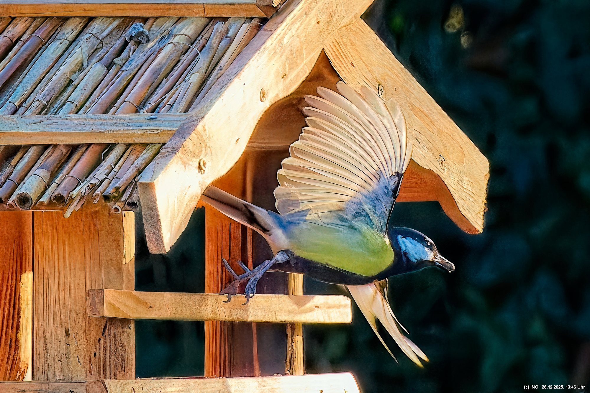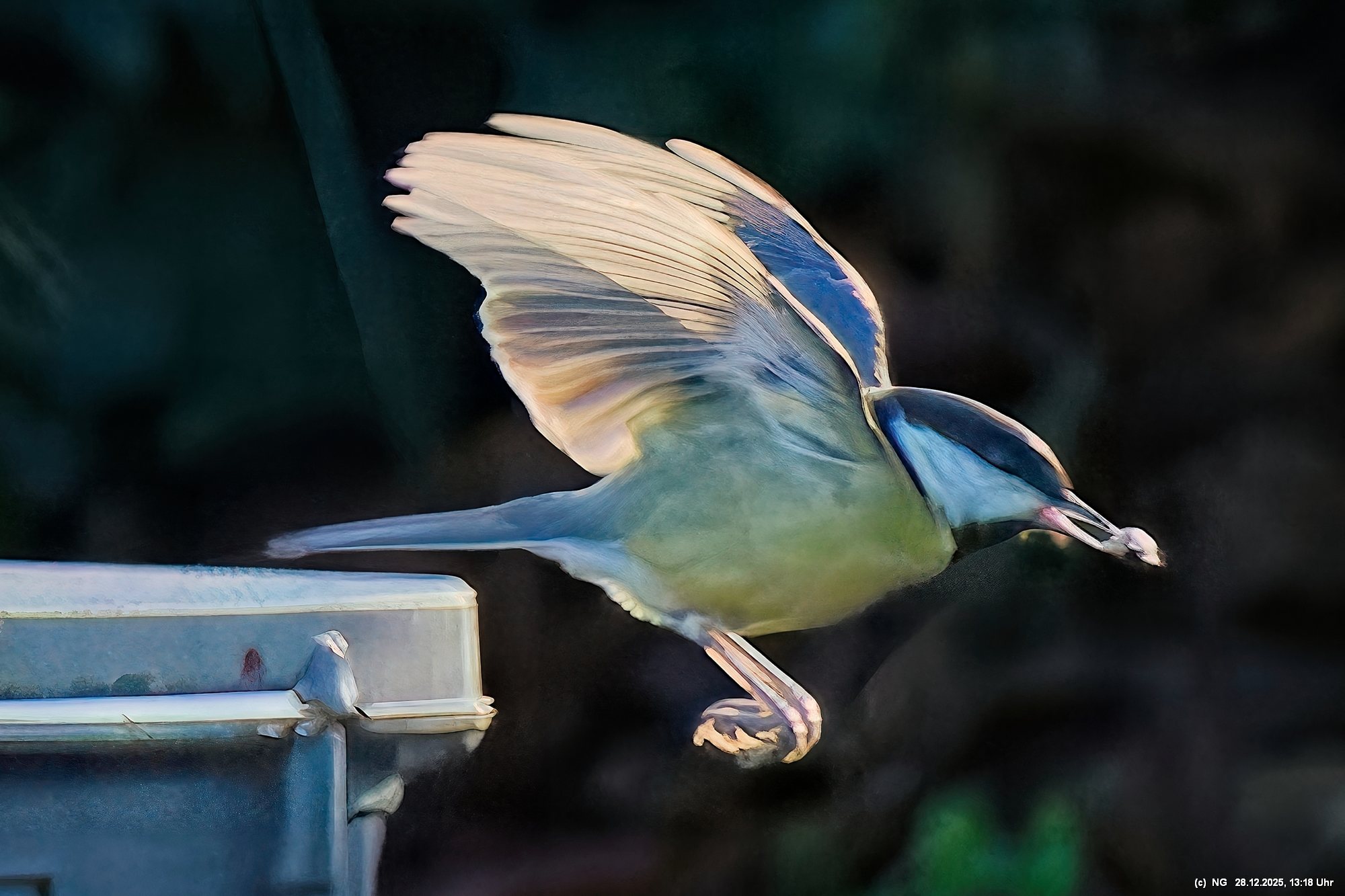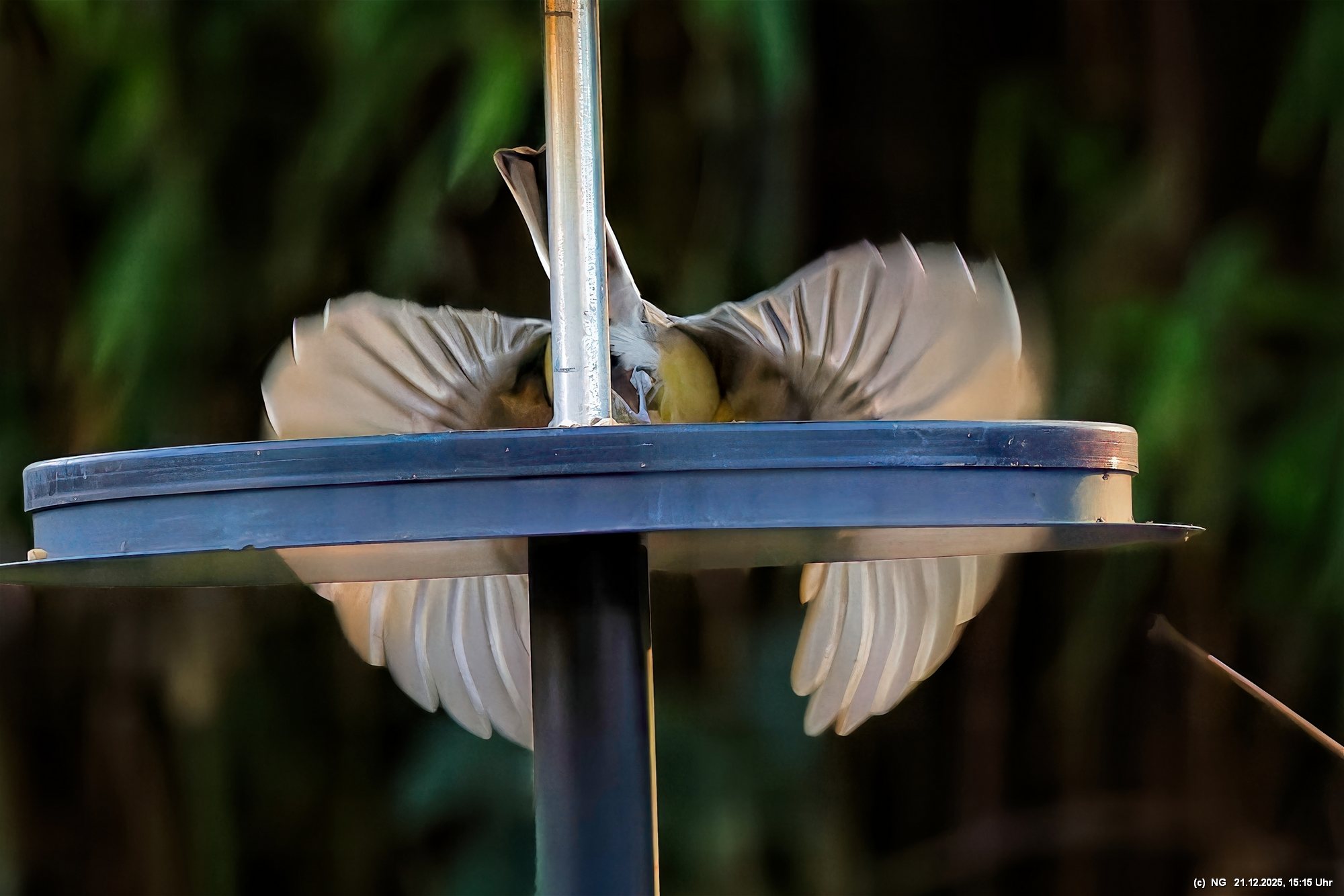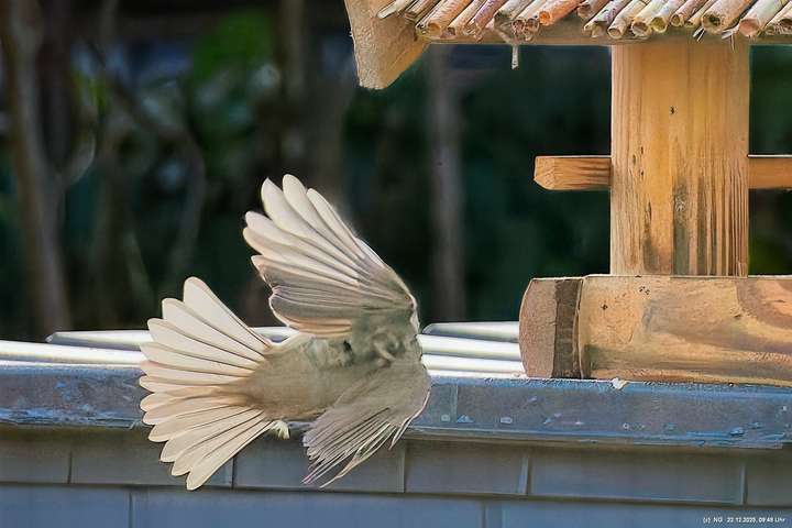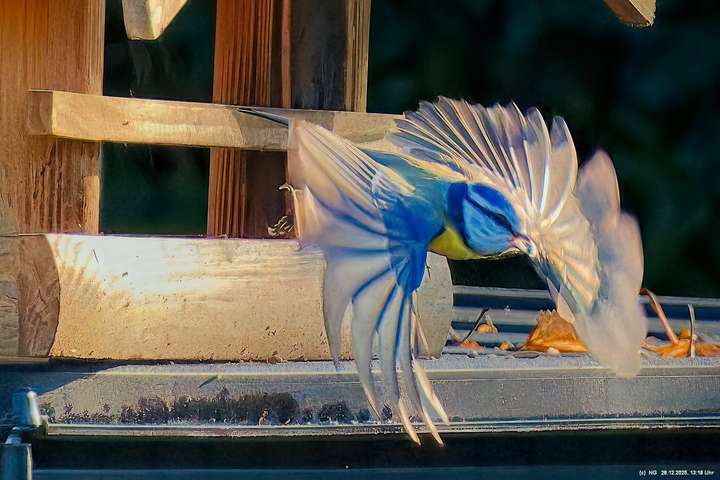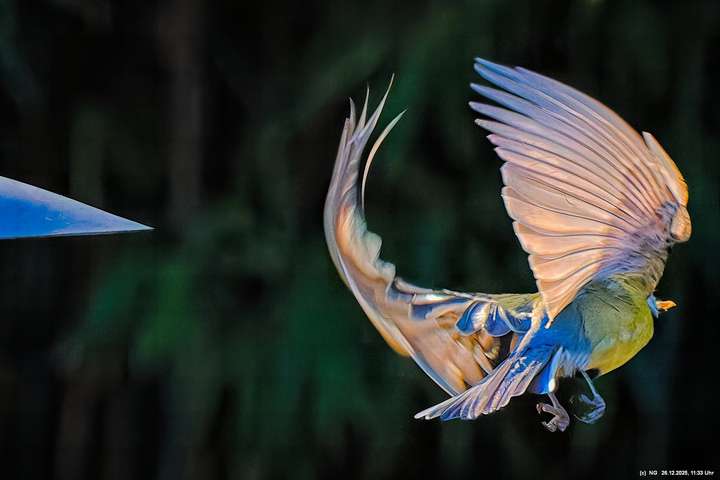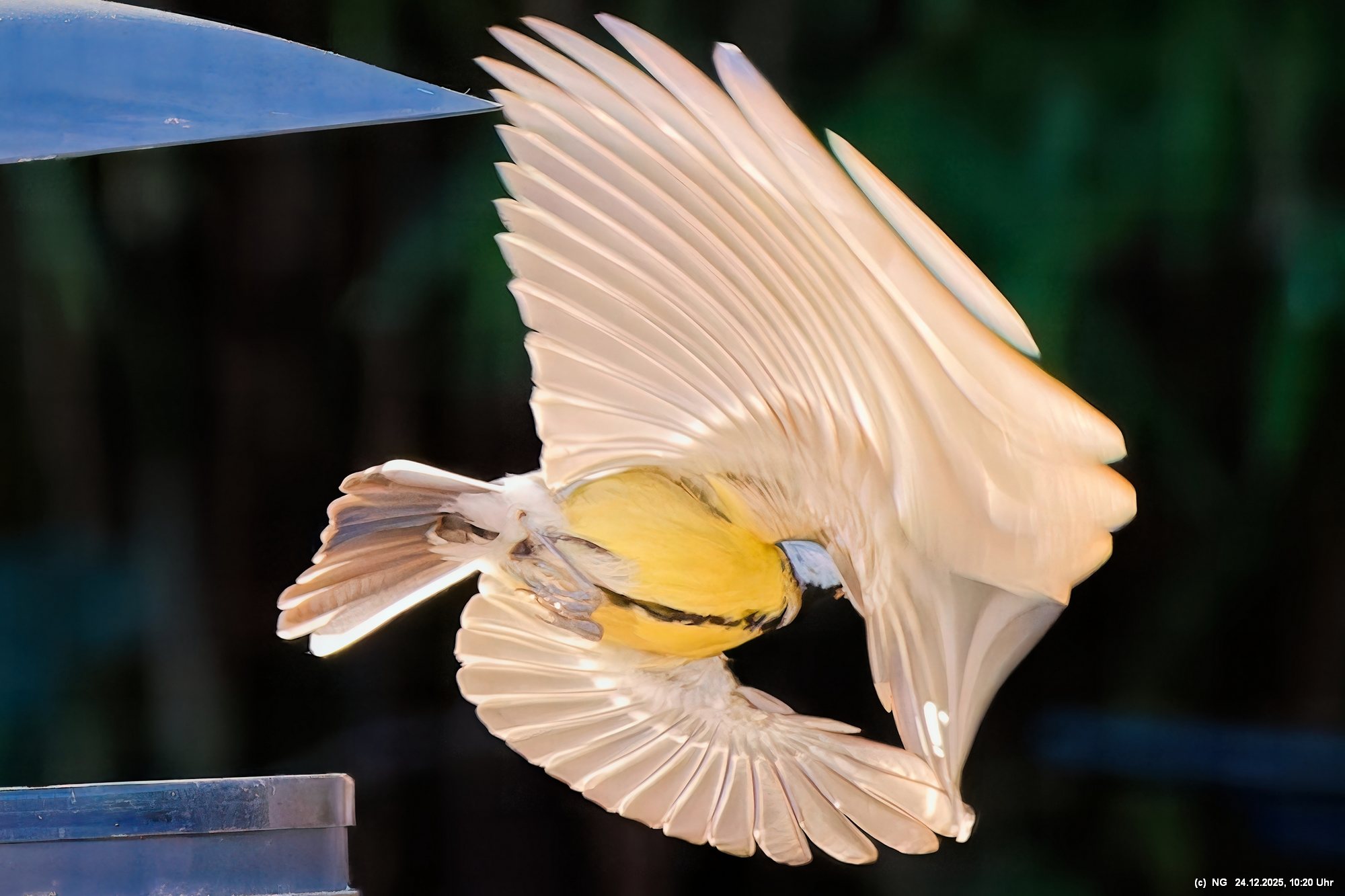An 3 kleinen Stellen gab es ein unterschiedliches Angebot: Ein kleines Haus, eine Futterschale und einen Meisenknödelspender. Schon nach kurzer Zeit wurden die Plätze angenommen und regelmäßig besucht. Beim Fotografieren gab es das Problem, dass Morgens gegen 10 Uhr das Haus im Gegenlicht stand und die Schale schon vor 15 Uhr viel zu dunkel war. Dazu kam, dass die Vögel doch recht scheu waren und aus versteckter Position mit sehr kurzer Belichtungszeit (1/4.000 sec.) und hohem ISO-Wert (10.000) fotografiert werden musste. So nach und nach ist dann eine Sammlung entstanden, die die Flugkünste der Kleinen deutlich zeigt. Es war spannend und man fühlte so etwas wie Jagdfieber.