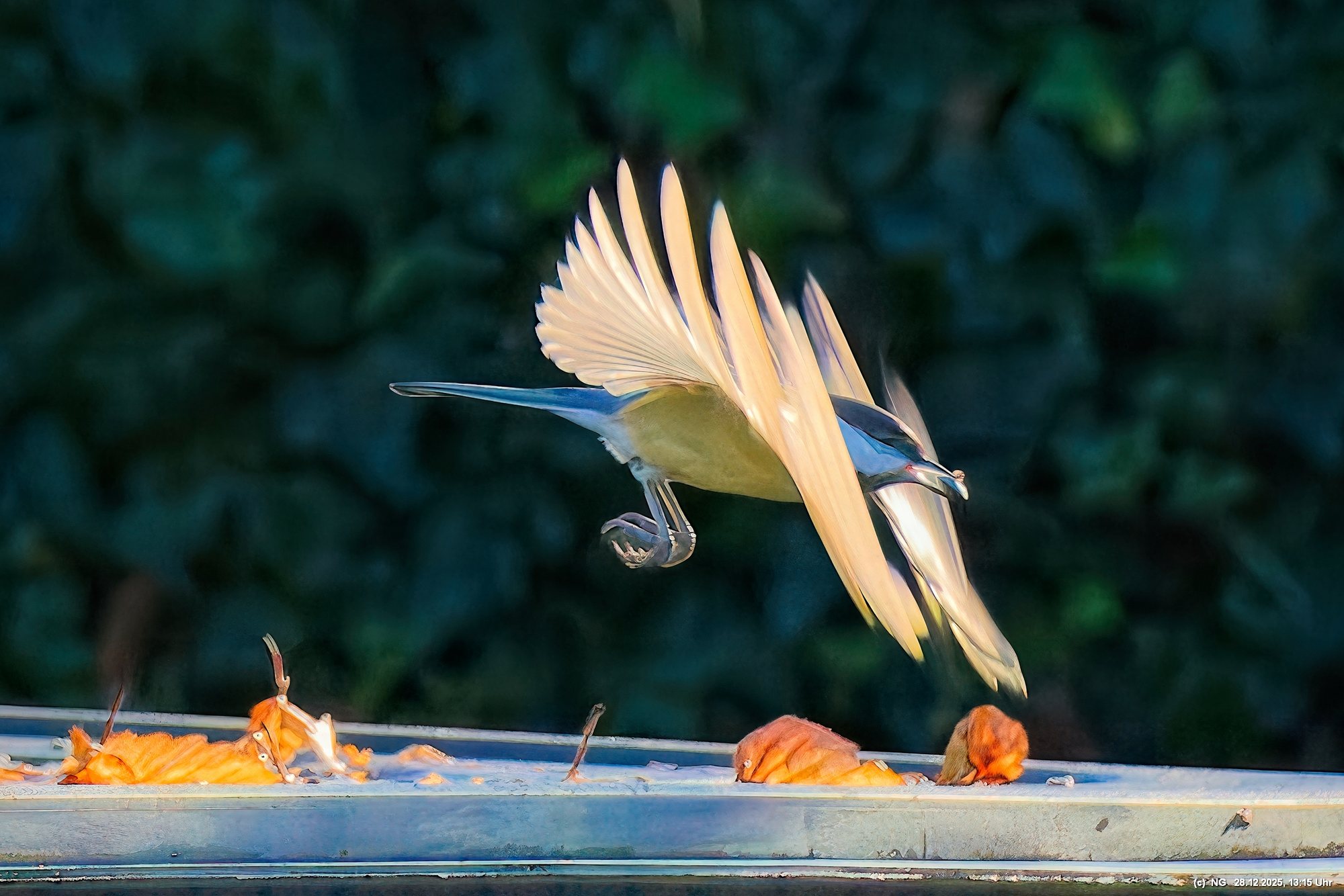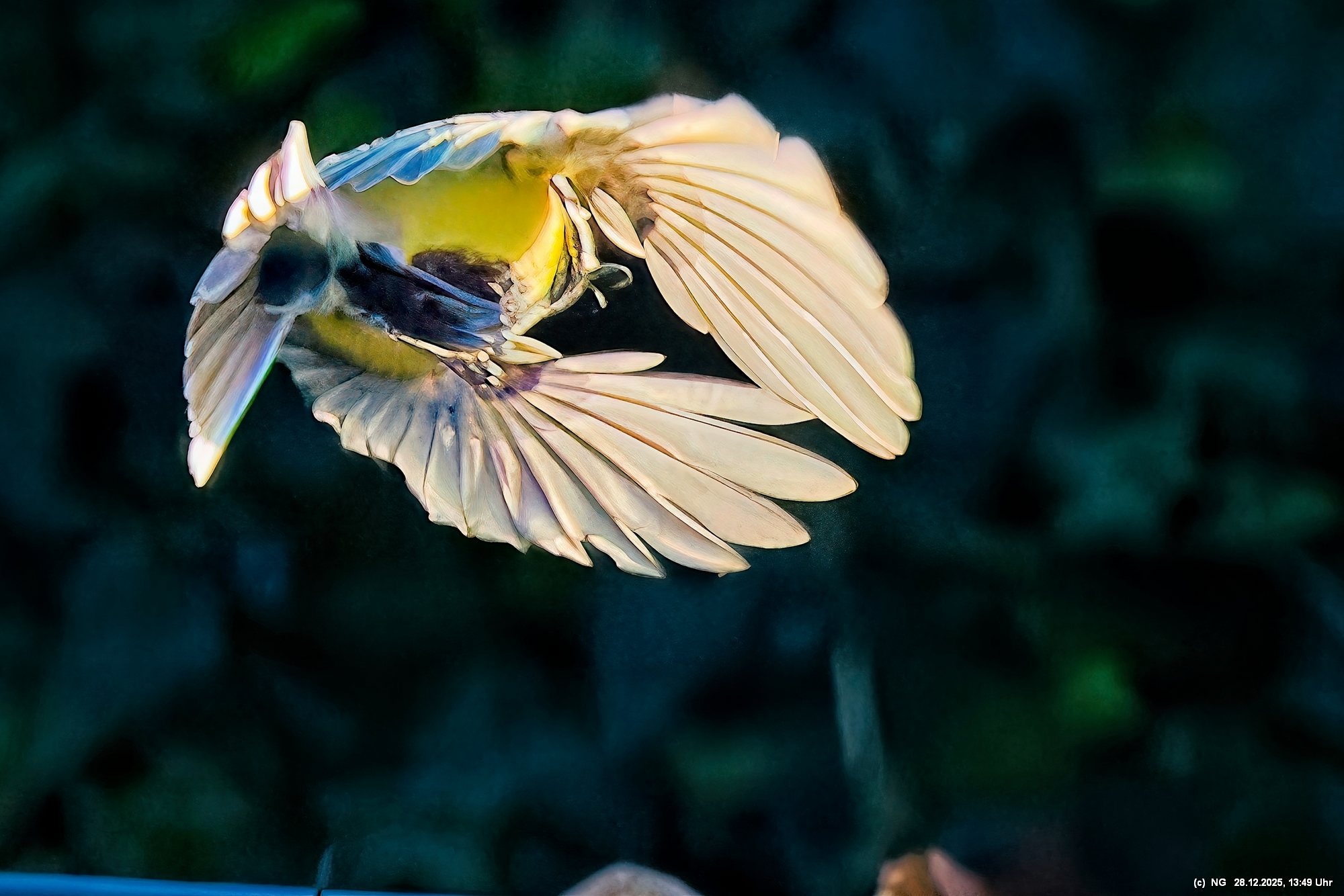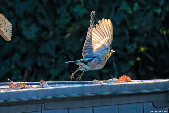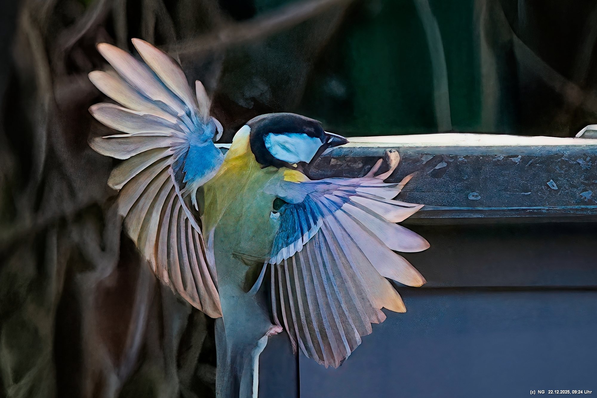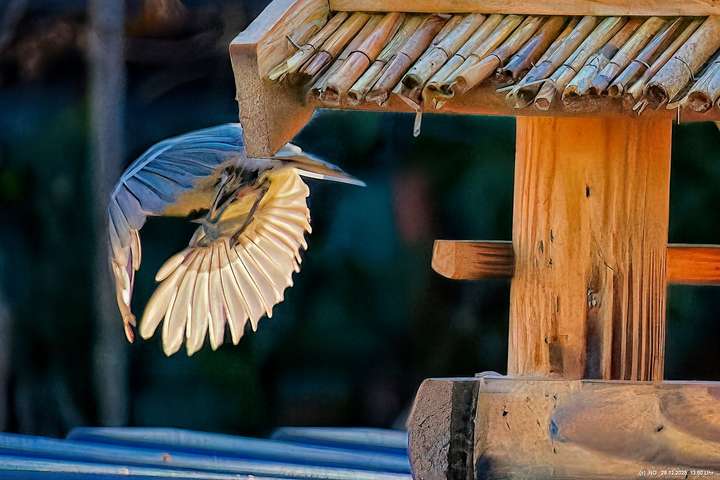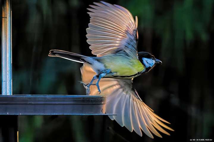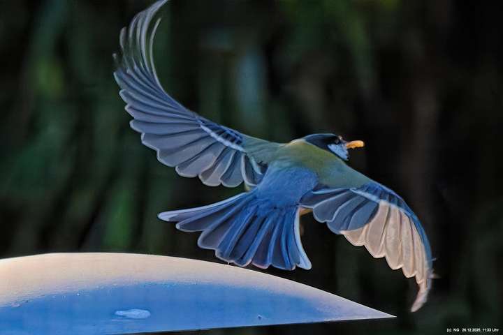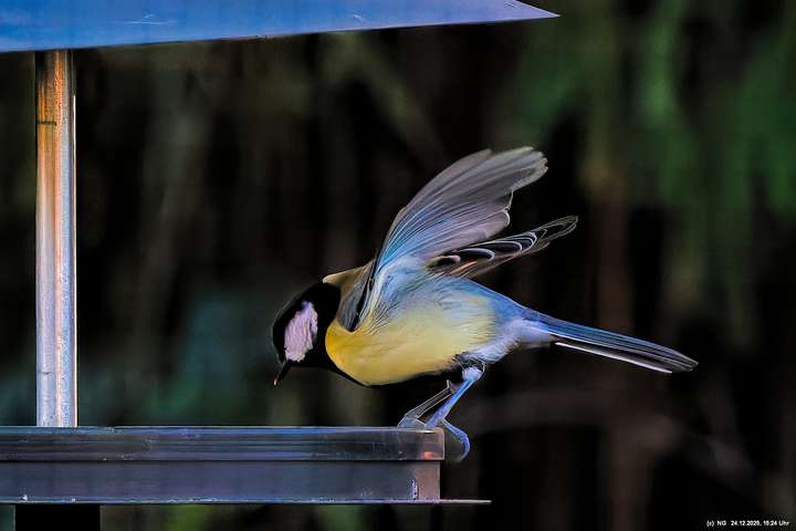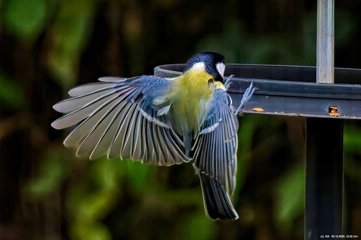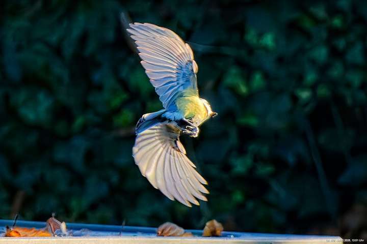 An 3 kleinen Stellen gab es ein unterschiedliches Angebot: Ein kleines Haus, eine Futterschale und einen Meisenknödelspender. Schon nach kurzer Zeit wurden die Plätze angenommen und regelmäßig besucht. Beim Fotografieren gab es das Problem, dass Morgens gegen 10 Uhr das Haus im Gegenlicht stand und die Schale schon vor 15 Uhr viel zu dunkel war. Dazu kam, dass die Vögel doch recht scheu waren und aus versteckter Position mit sehr kurzer Belichtungszeit (1/4.000 sec.) und hohem ISO-Wert (10.000) fotografiert werden musste. So nach und nach ist dann eine Sammlung entstanden, die die Flugkünste der Kleinen deutlich zeigt. Es war spannend und man fühlte so etwas wie Jagdfieber.