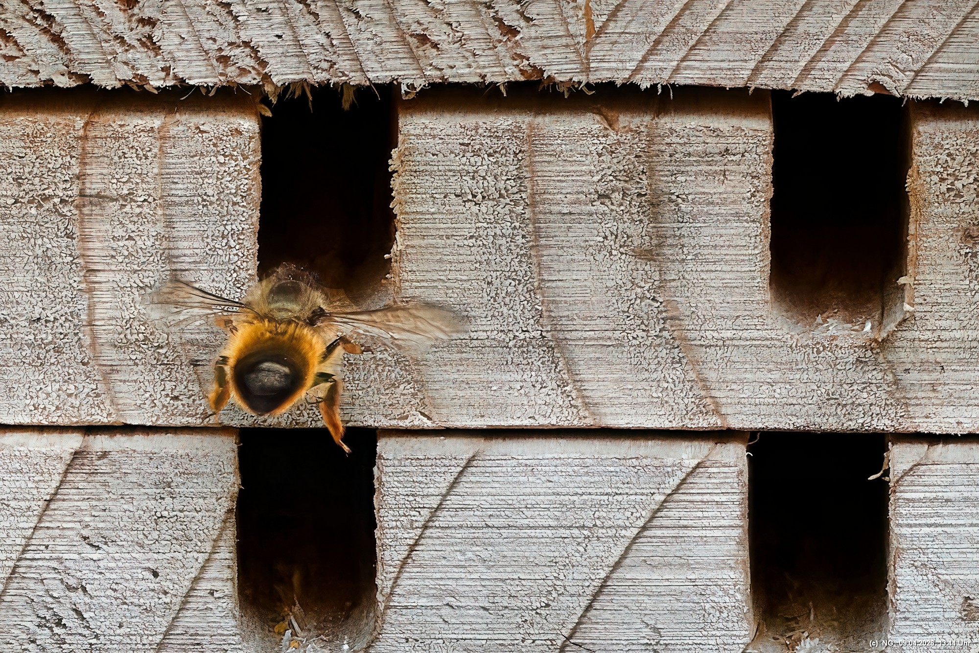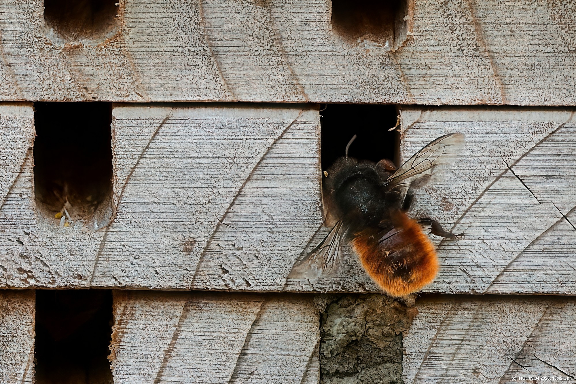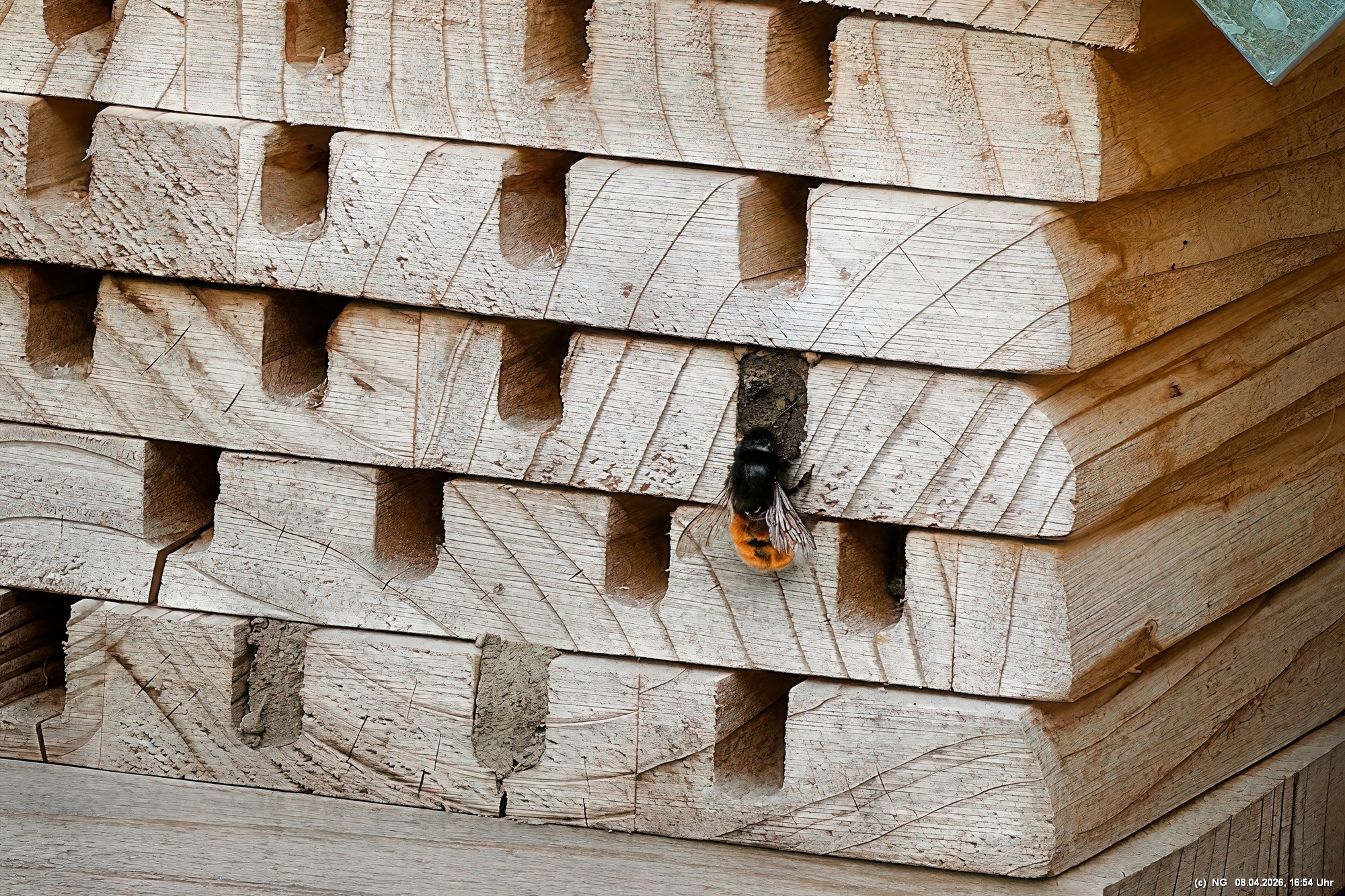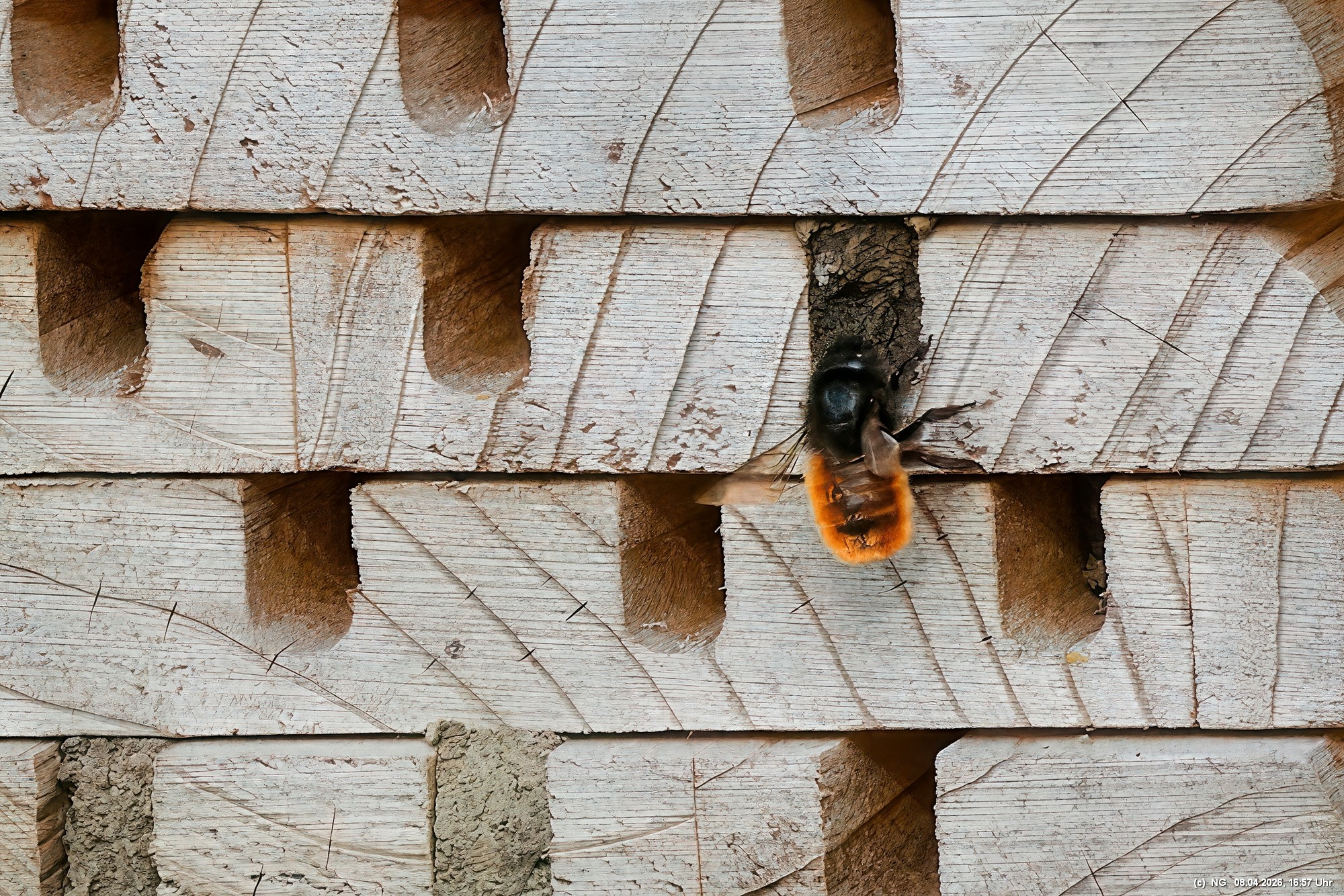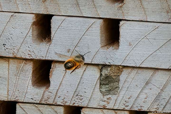 Vor fast einem Jahr haben wir von einer Freundin ein kleines Bienenhotel geschenkt bekommen und es gleich aufgehängt. Natürlich hat sich da auch über den Winter hat sich nichts getan. Vor einigen Tagen haben wir dann ein Mauerbienenpaar bei der Paarung beobachtet und schon wurde das erste Zimmer bezogen und die Tür geschlossen. Da hatte die Biene aber schon innen viel zu tun gehabt. Sie legt von hinten angefangen mehrere Kammern an und versorgt sie mit Pollen und etwas Nektar. Nachdem sie ein Ei gelegt hat, wird die Kammer verschlossen und es geht weiter nach vorne. Sie kann übrigens selbst bestimmen, ob Weibchen oder Männchen entstehen. Aus befruchteten Eiern entstehen Weibchen. Diese werden meist in den hinteren Kammern gezogen. Vorne kommt dann ein Männchen und die letzte Kammer bleibt leer, als Täuschung für raubende Vögel. Nach wenigen Tagen schlüpfen die Larven und ernähren sich von den Vorräten. Dann häuten sie sich mehrmals und spinnen danach einen Kokon. Am Ende der Metamorphose schlüpfen sie dann als fertige Bienen, meist aber erst im nächsten Frühjahr.