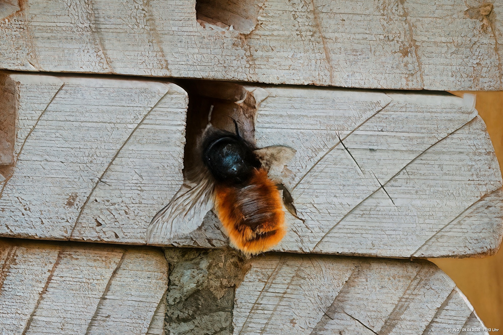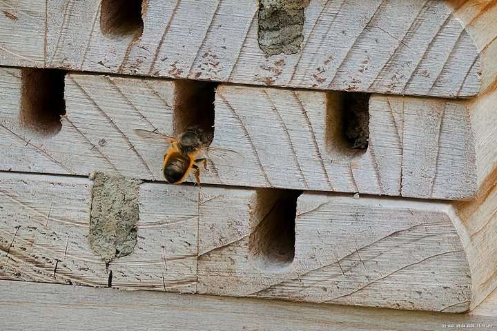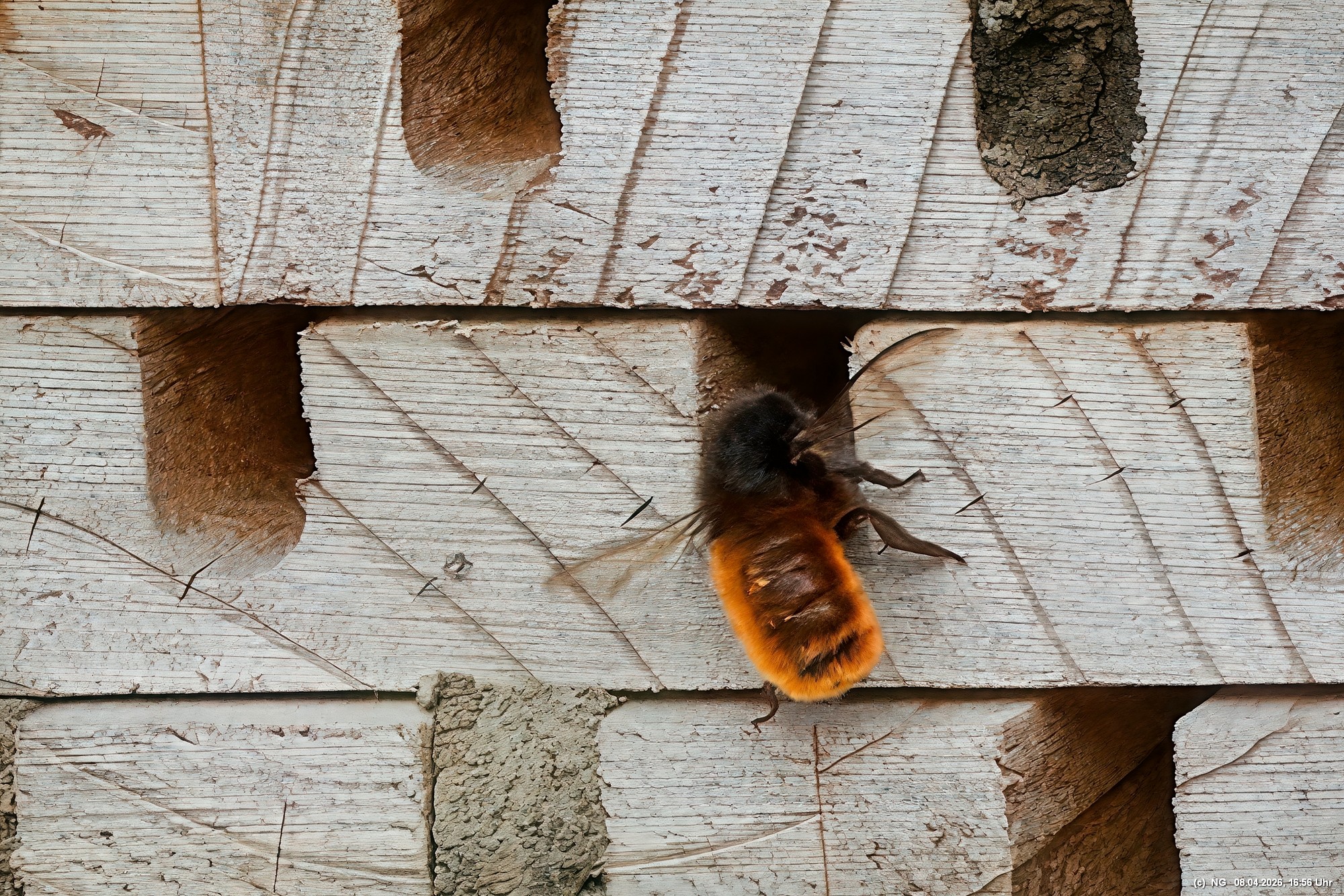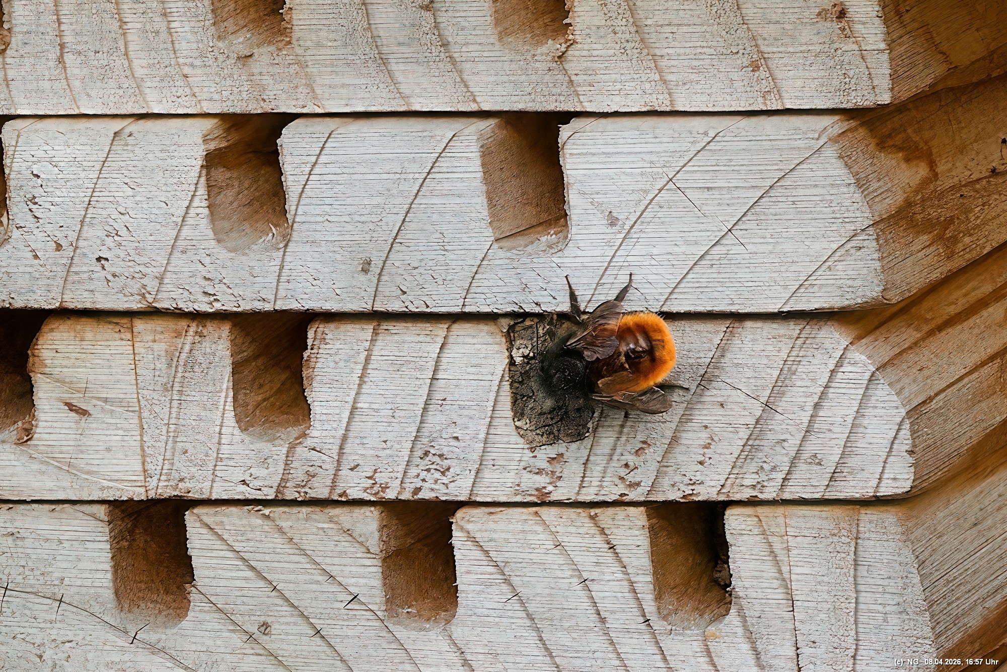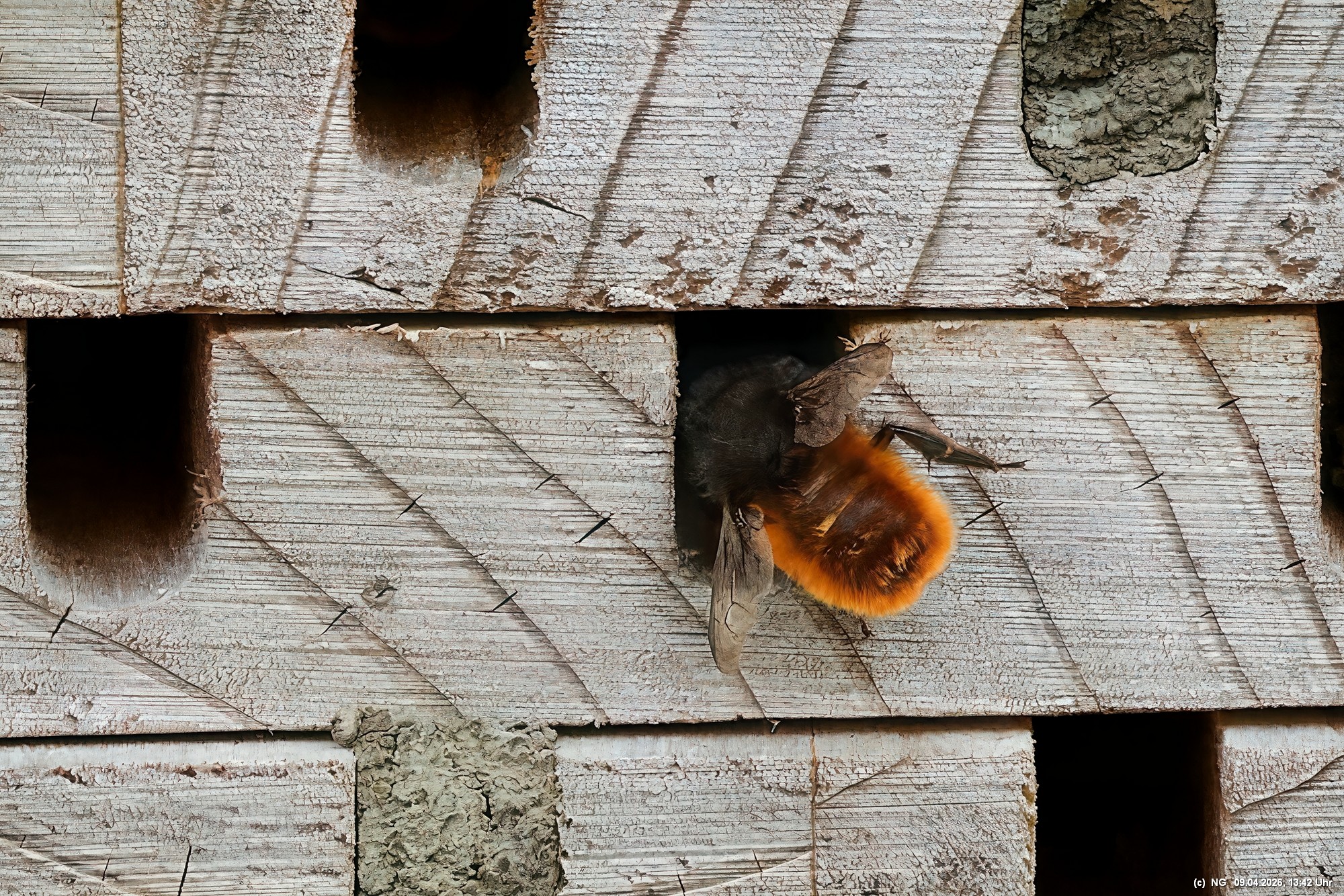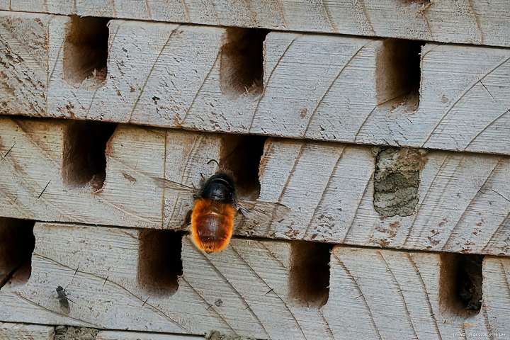 Vor fast einem Jahr haben wir von einer Freundin ein kleines Bienenhotel geschenkt bekommen und es gleich aufgehängt. Natürlich hat sich da auch über den Winter hat sich nichts getan. Vor einigen Tagen haben wir dann ein Mauerbienenpaar bei der Paarung beobachtet und schon wurde das erste Zimmer bezogen und die Tür geschlossen. Da hatte die Biene aber schon innen viel zu tun gehabt. Sie legt von hinten angefangen mehrere Kammern an und versorgt sie mit Pollen und etwas Nektar. Nachdem sie ein Ei gelegt hat, wird die Kammer verschlossen und es geht weiter nach vorne. Sie kann übrigens selbst bestimmen, ob Weibchen oder Männchen entstehen. Aus befruchteten Eiern entstehen Weibchen. Diese werden meist in den hinteren Kammern gezogen. Vorne kommt dann ein Männchen und die letzte Kammer bleibt leer, als Täuschung für raubende Vögel. Nach wenigen Tagen schlüpfen die Larven und ernähren sich von den Vorräten. Dann häuten sie sich mehrmals und spinnen danach einen Kokon. Am Ende der Metamorphose schlüpfen sie dann als fertige Bienen, meist aber erst im nächsten Frühjahr.