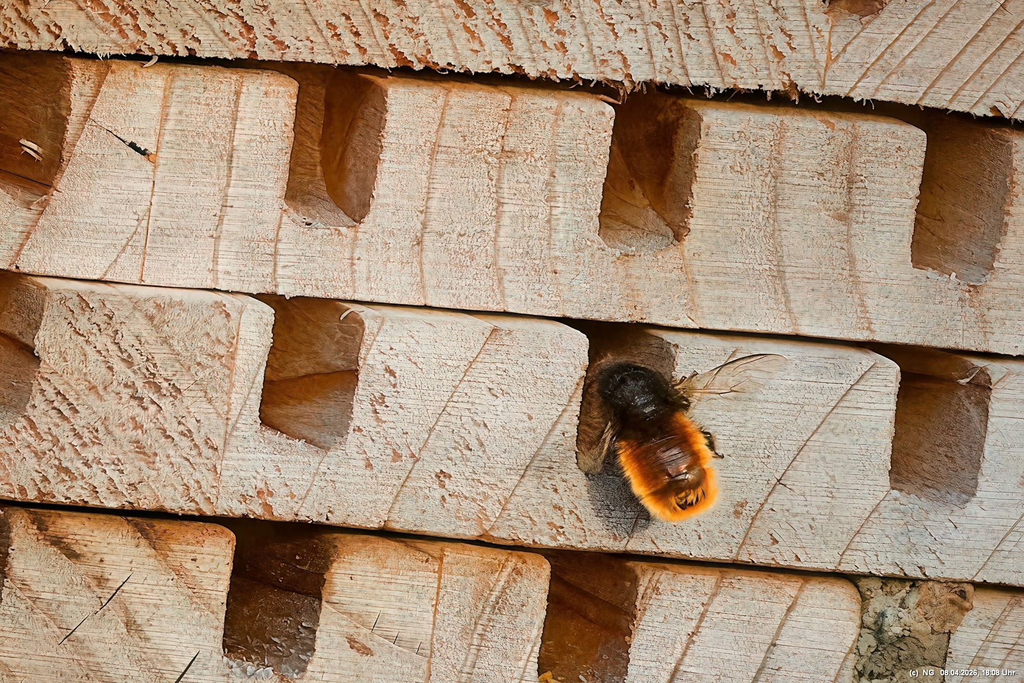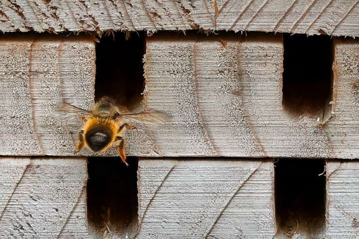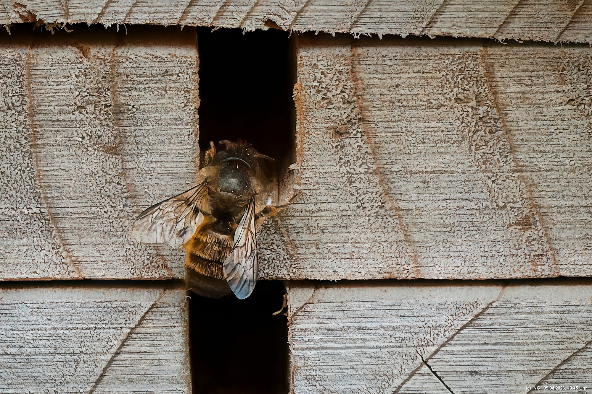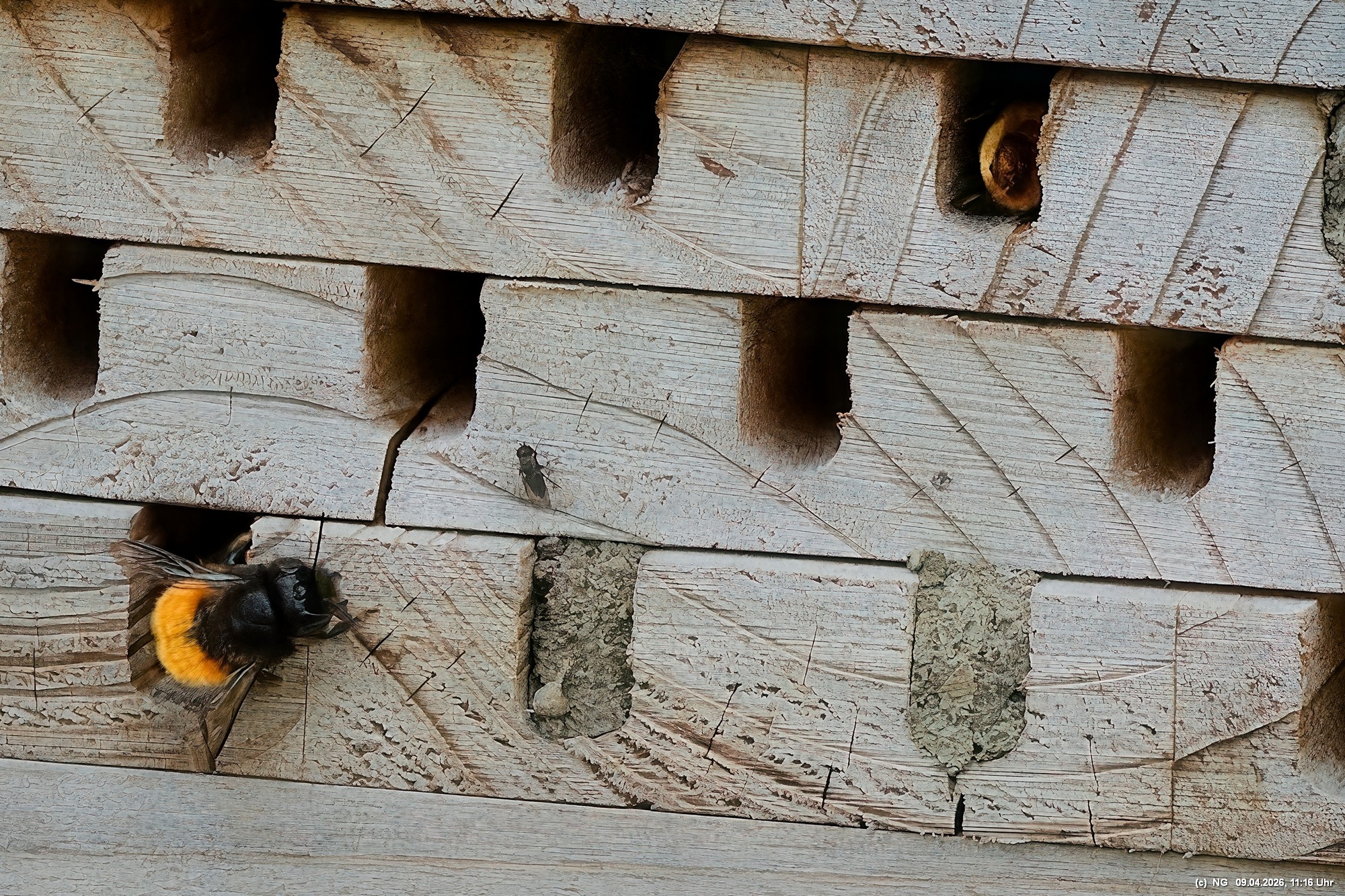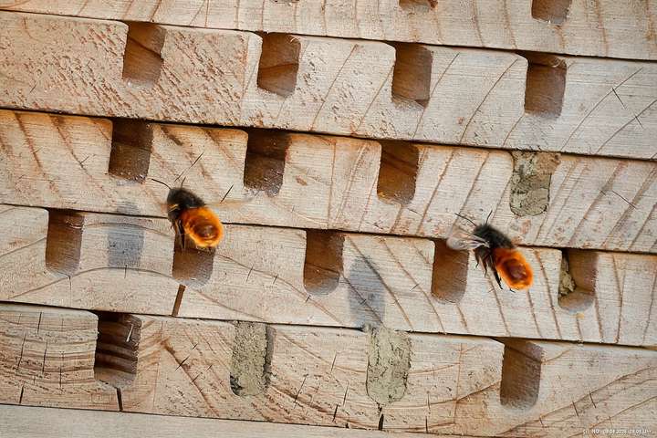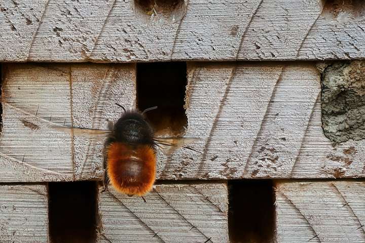Vor fast einem Jahr haben wir von einer Freundin ein kleines Bienenhotel geschenkt bekommen und es gleich aufgehängt. Natürlich hat sich da auch über den Winter hat sich nichts getan. Vor einigen Tagen haben wir dann ein Mauerbienenpaar bei der Paarung beobachtet und schon wurde das erste Zimmer bezogen und die Tür geschlossen. Da hatte die Biene aber schon innen viel zu tun gehabt. Sie legt von hinten angefangen mehrere Kammern an und versorgt sie mit Pollen und etwas Nektar. Nachdem sie ein Ei gelegt hat, wird die Kammer verschlossen und es geht weiter nach vorne. Sie kann übrigens selbst bestimmen, ob Weibchen oder Männchen entstehen. Aus befruchteten Eiern entstehen Weibchen. Diese werden meist in den hinteren Kammern gezogen. Vorne kommt dann ein Männchen und die letzte Kammer bleibt leer, als Täuschung für raubende Vögel. Nach wenigen Tagen schlüpfen die Larven und ernähren sich von den Vorräten. Dann häuten sie sich mehrmals und spinnen danach einen Kokon. Am Ende der Metamorphose schlüpfen sie dann als fertige Bienen, meist aber erst im nächsten Frühjahr.