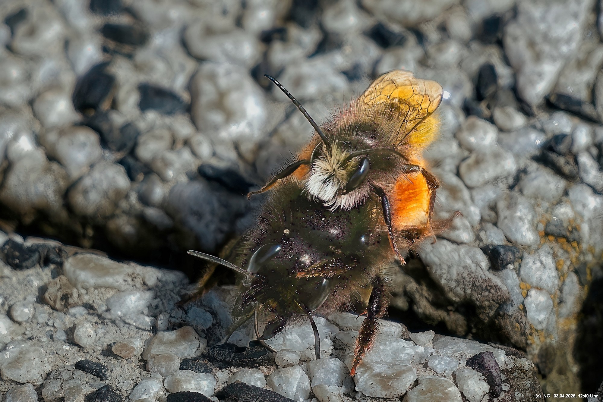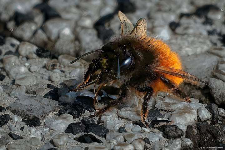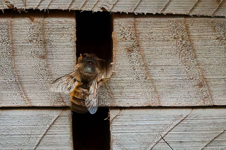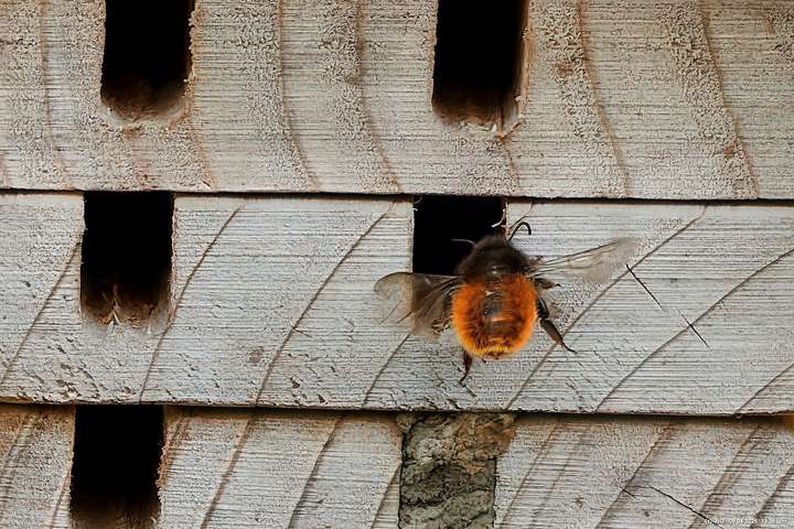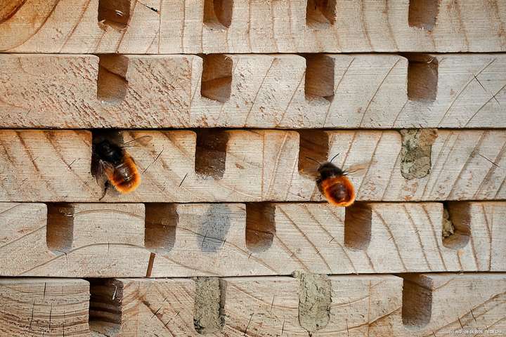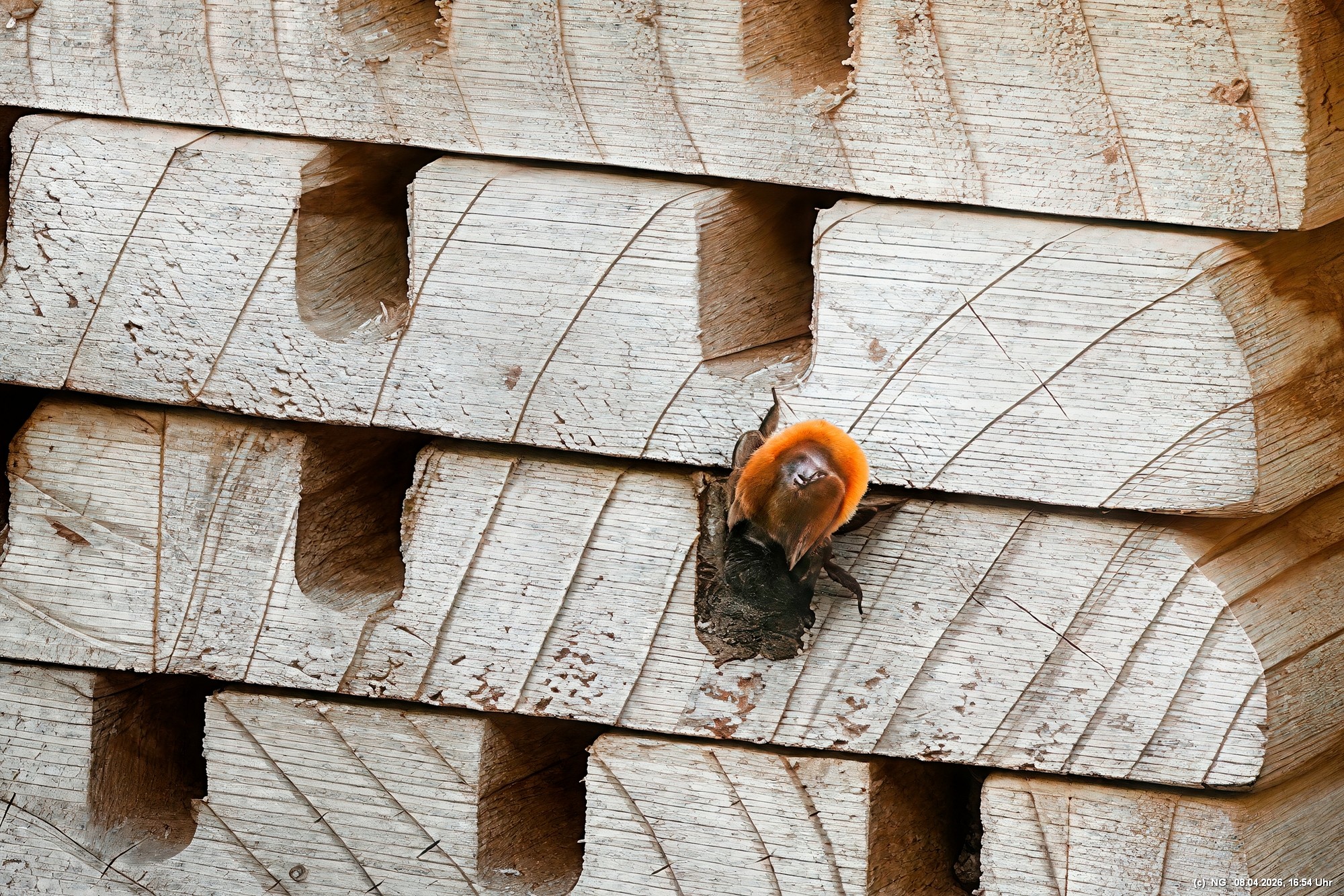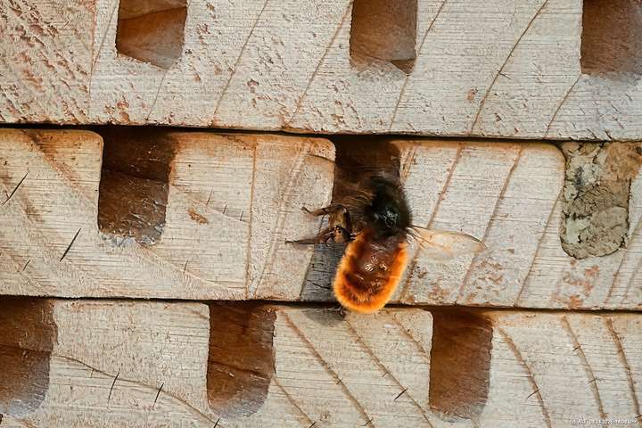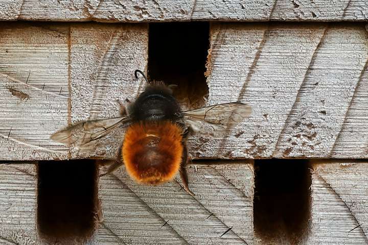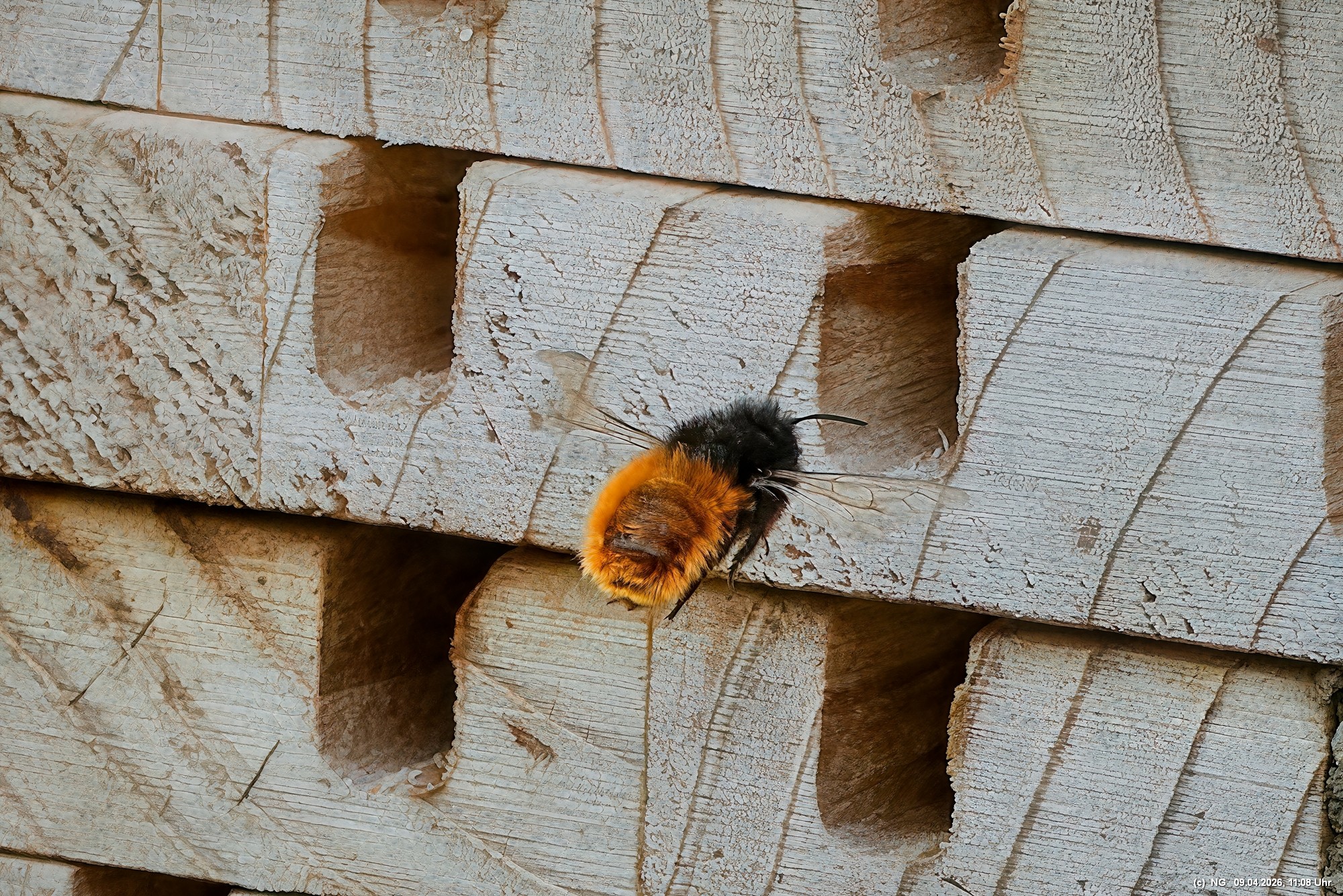 Vor fast einem Jahr haben wir von einer Freundin ein kleines Bienenhotel geschenkt bekommen und es gleich aufgehängt. Natürlich hat sich da auch über den Winter hat sich nichts getan. Vor einigen Tagen haben wir dann ein Mauerbienenpaar bei der Paarung beobachtet und schon wurde das erste Zimmer bezogen und die Tür geschlossen. Da hatte die Biene aber schon innen viel zu tun gehabt. Sie legt von hinten angefangen mehrere Kammern an und versorgt sie mit Pollen und etwas Nektar. Nachdem sie ein Ei gelegt hat, wird die Kammer verschlossen und es geht weiter nach vorne. Sie kann übrigens selbst bestimmen, ob Weibchen oder Männchen entstehen. Aus befruchteten Eiern entstehen Weibchen. Diese werden meist in den hinteren Kammern gezogen. Vorne kommt dann ein Männchen und die letzte Kammer bleibt leer, als Täuschung für raubende Vögel. Nach wenigen Tagen schlüpfen die Larven und ernähren sich von den Vorräten. Dann häuten sie sich mehrmals und spinnen danach einen Kokon. Am Ende der Metamorphose schlüpfen sie dann als fertige Bienen, meist aber erst im nächsten Frühjahr.