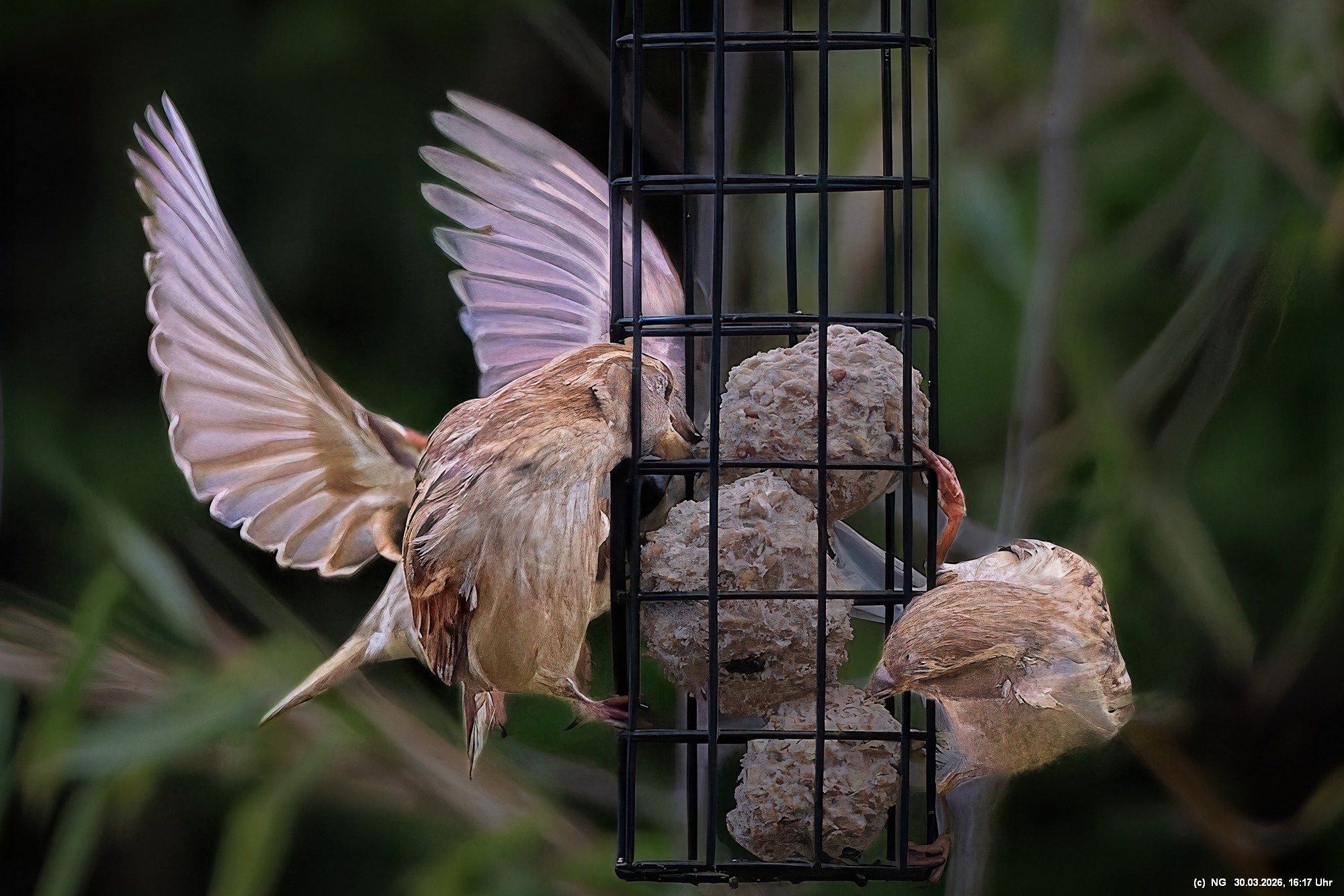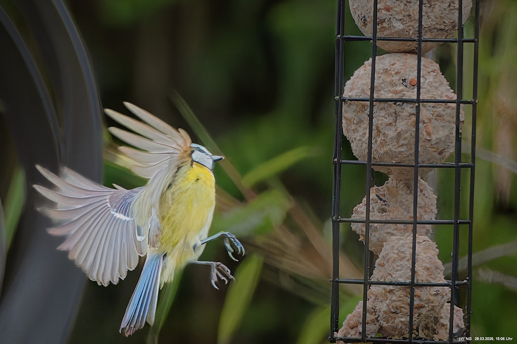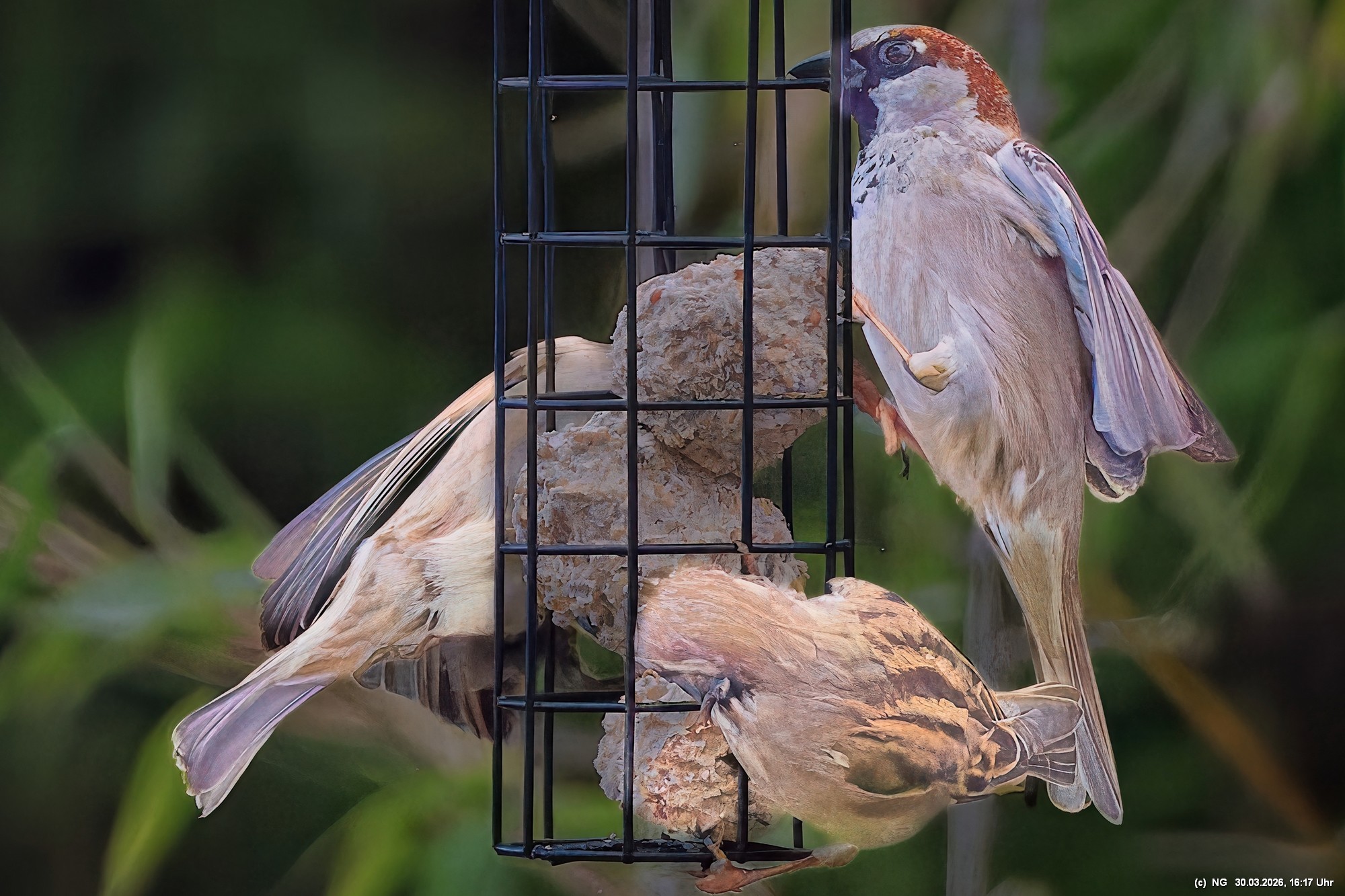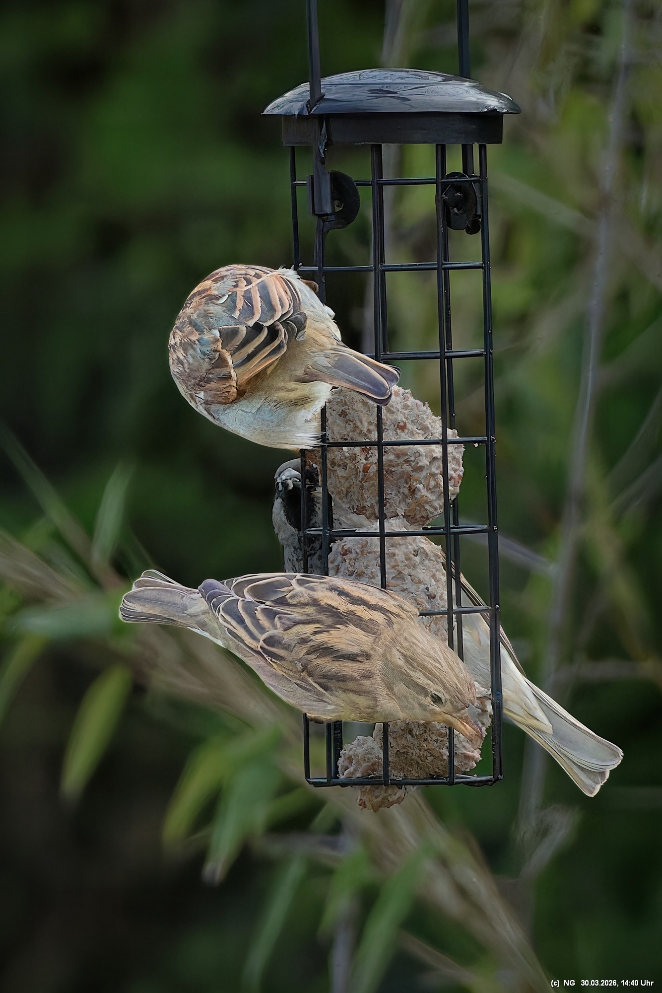 Es werden Kräfte für die kommende Saison getankt - und zwar reichlich. Das Tempo für den Ersatz von Maisenknödeln (auch die Spatzen gehen gerne dran) hat gewaltig zugelegt. Der Fotoapparat hat sie belauert. Da die Meisen das Futter immer sortieren und bei Missfallen einfach mit Schwung nach unten werfen und Ratten damit anlocken, haben wir jetzt größeren Drahtgitterschalen darunter befestigt (hier noch nicht zu sehen). Wir freuen uns über so viel Leben im Garten durch Vögel und Insekten!