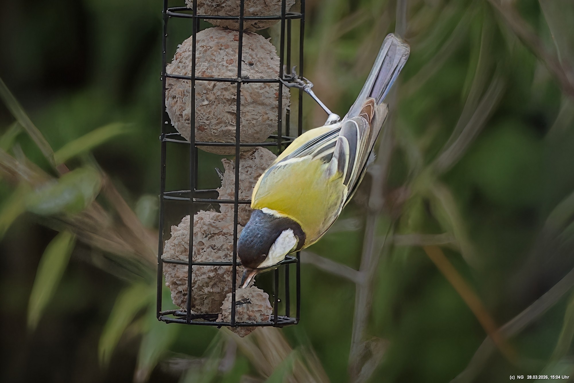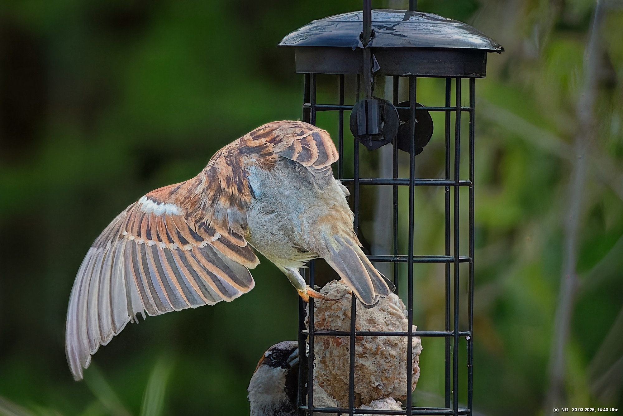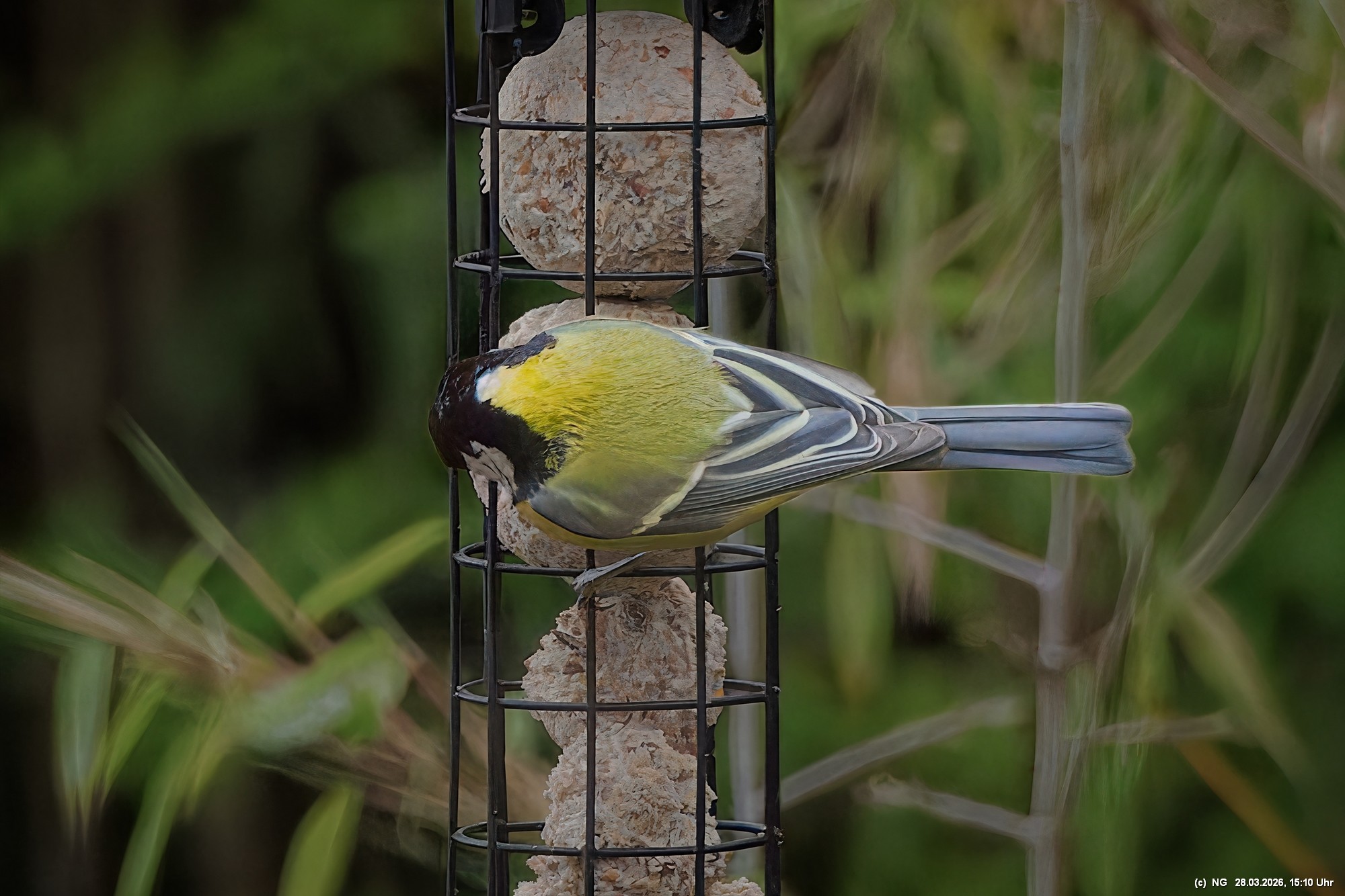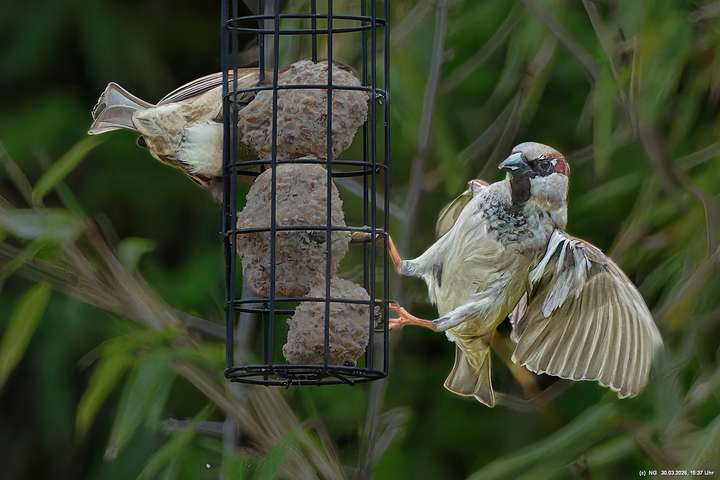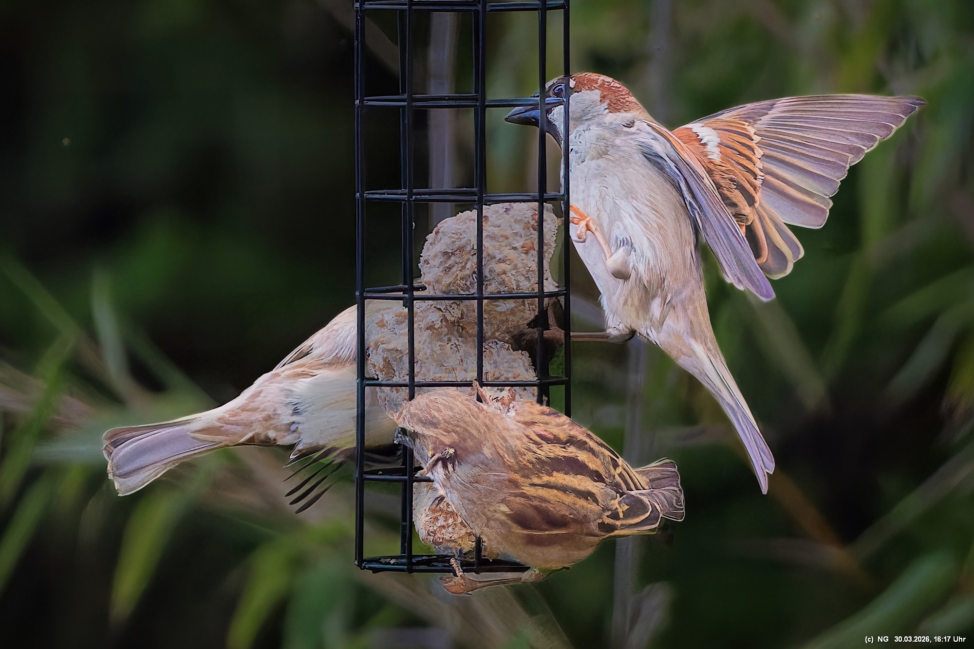 Es werden Kräfte für die kommende Saison getankt - und zwar reichlich. Das Tempo für den Ersatz von Maisenknödeln (auch die Spatzen gehen gerne dran) hat gewaltig zugelegt. Der Fotoapparat hat sie belauert. Da die Meisen das Futter immer sortieren und bei Missfallen einfach mit Schwung nach unten werfen und Ratten damit anlocken, haben wir jetzt größeren Drahtgitterschalen darunter befestigt (hier noch nicht zu sehen). Wir freuen uns über so viel Leben im Garten durch Vögel und Insekten!