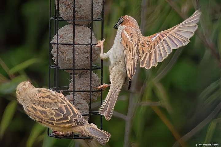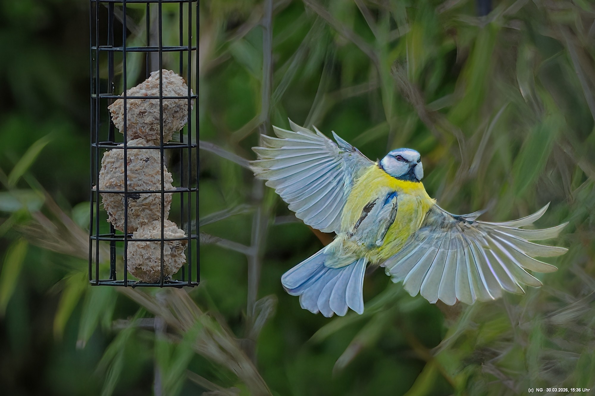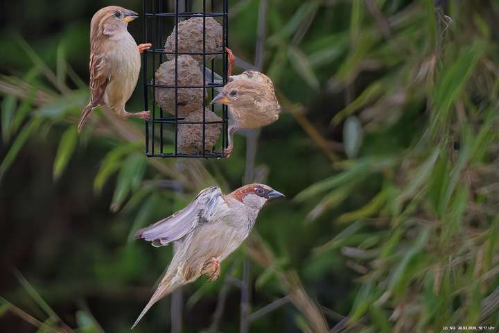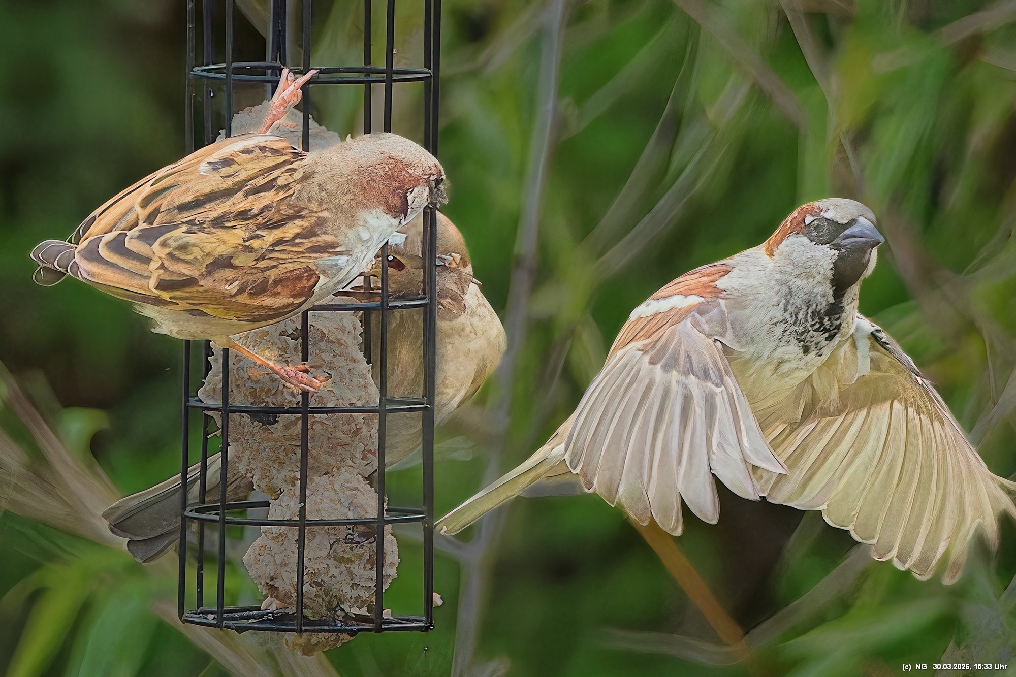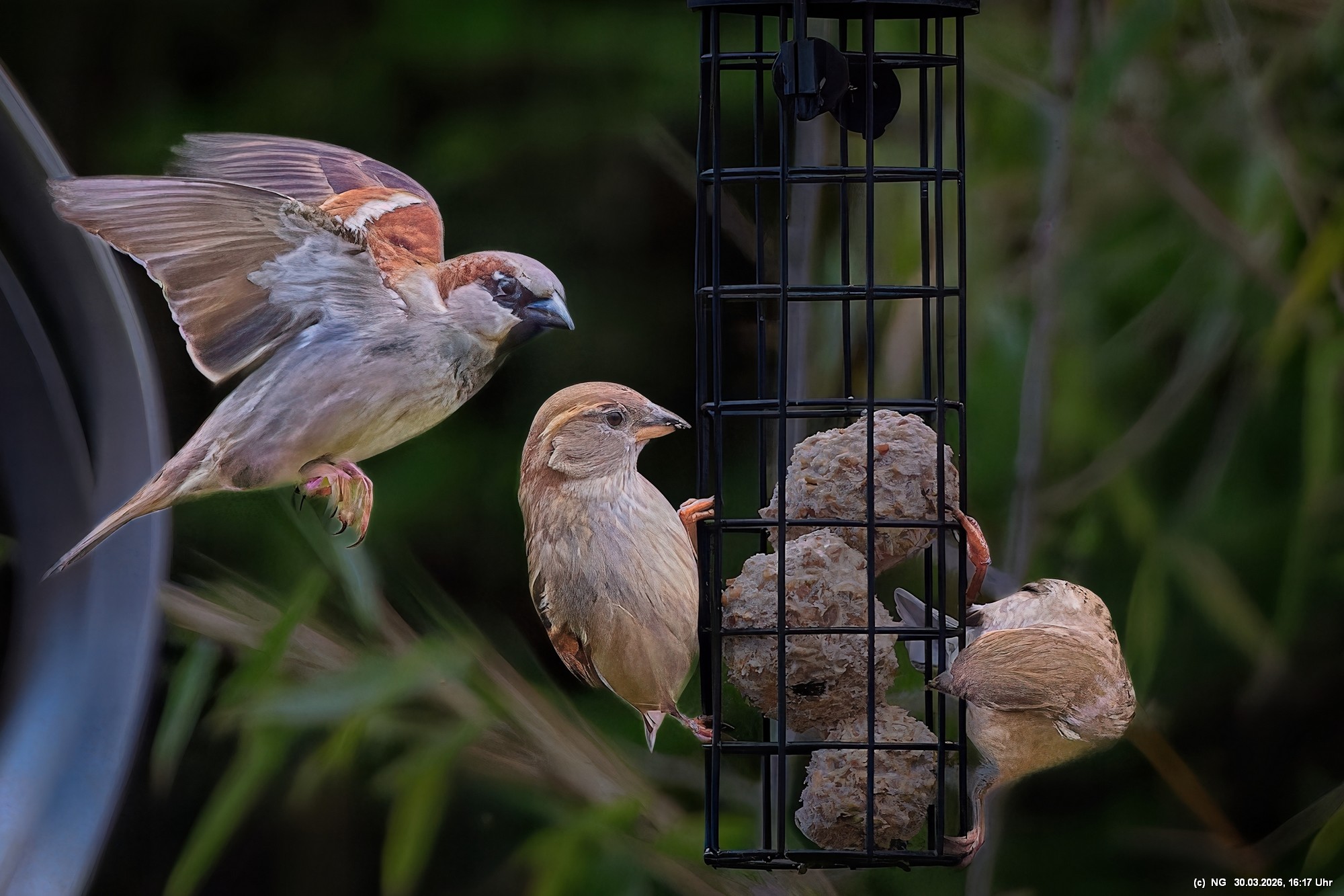Es werden Kräfte für die kommende Saison getankt - und zwar reichlich. Das Tempo für den Ersatz von Maisenknödeln (auch die Spatzen gehen gerne dran) hat gewaltig zugelegt. Der Fotoapparat hat sie belauert. Da die Meisen das Futter immer sortieren und bei Missfallen einfach mit Schwung nach unten werfen und Ratten damit anlocken, haben wir jetzt größeren Drahtgitterschalen darunter befestigt (hier noch nicht zu sehen). Wir freuen uns über so viel Leben im Garten durch Vögel und Insekten!