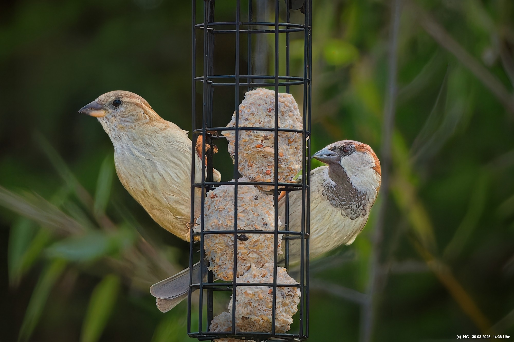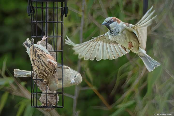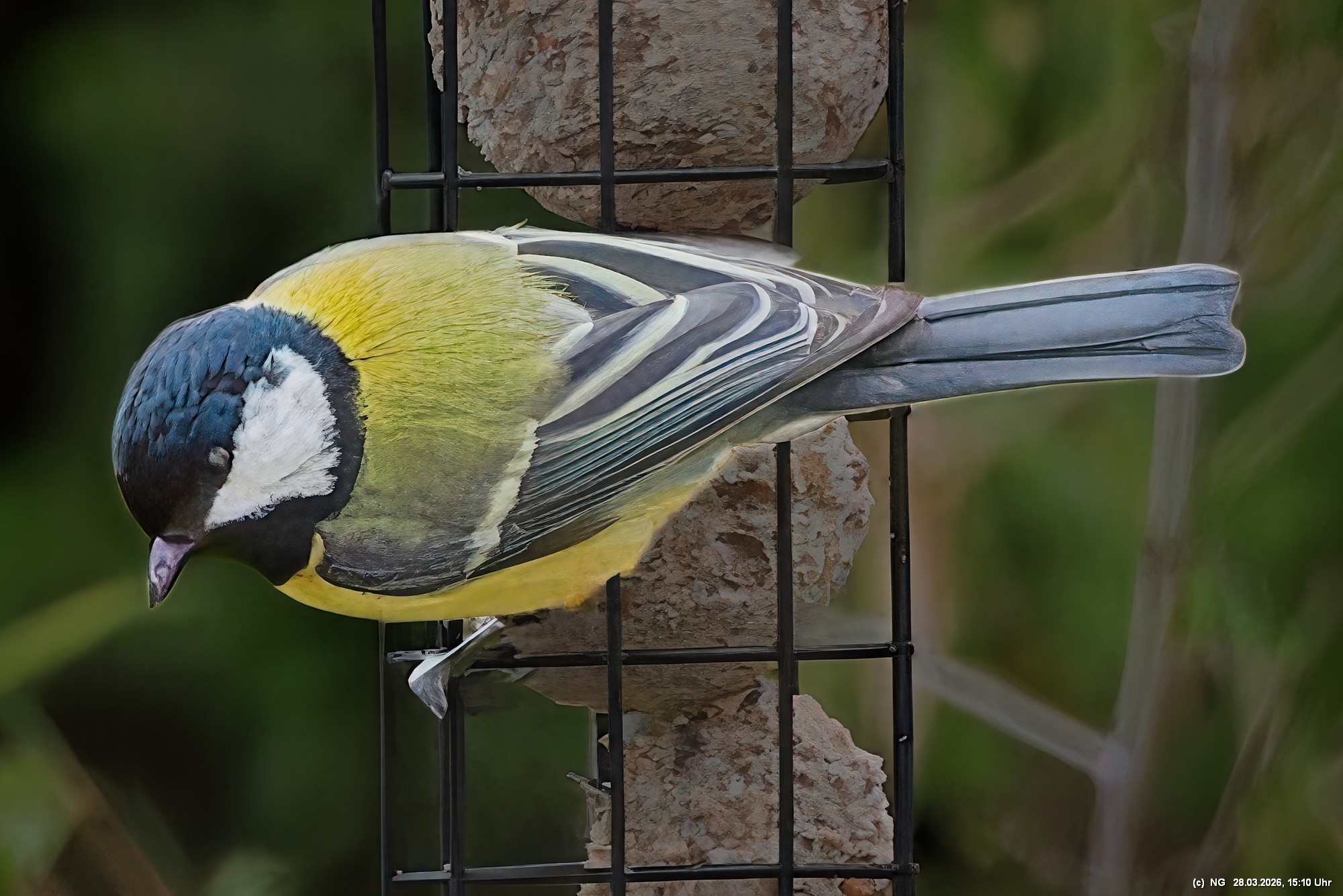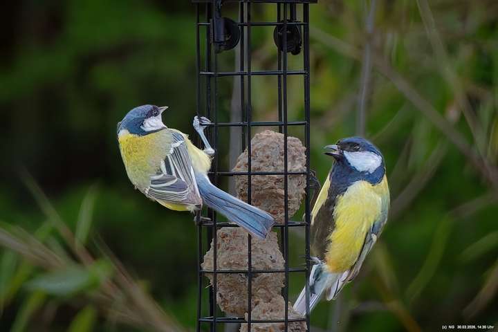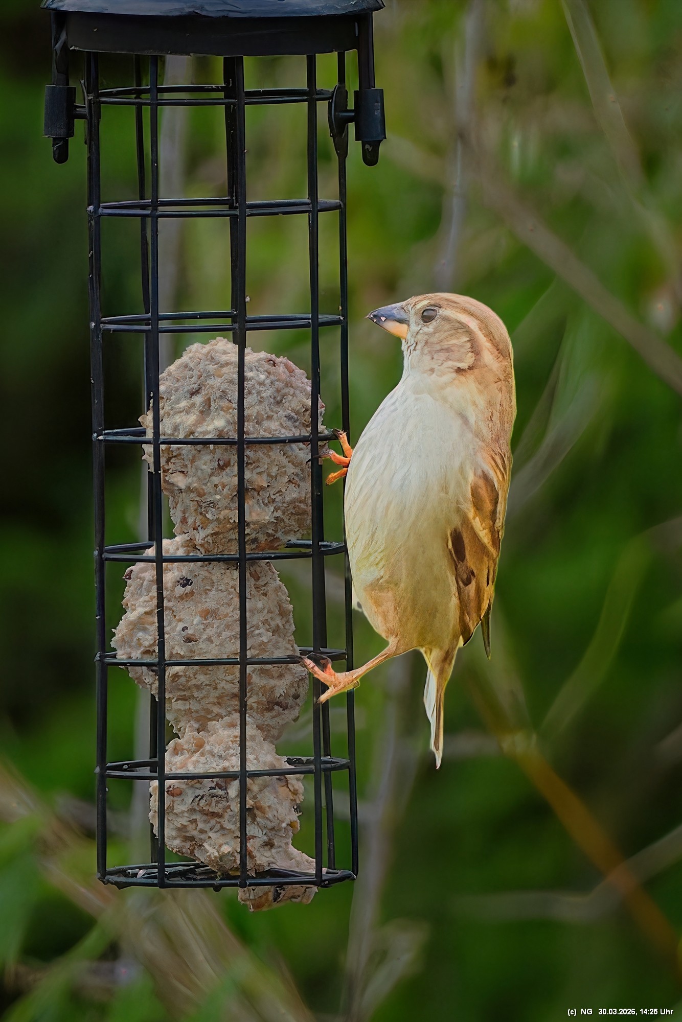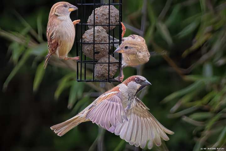 Es werden Kräfte für die kommende Saison getankt - und zwar reichlich. Das Tempo für den Ersatz von Maisenknödeln (auch die Spatzen gehen gerne dran) hat gewaltig zugelegt. Der Fotoapparat hat sie belauert. Da die Meisen das Futter immer sortieren und bei Missfallen einfach mit Schwung nach unten werfen und Ratten damit anlocken, haben wir jetzt größeren Drahtgitterschalen darunter befestigt (hier noch nicht zu sehen). Wir freuen uns über so viel Leben im Garten durch Vögel und Insekten!