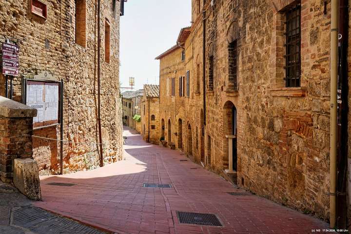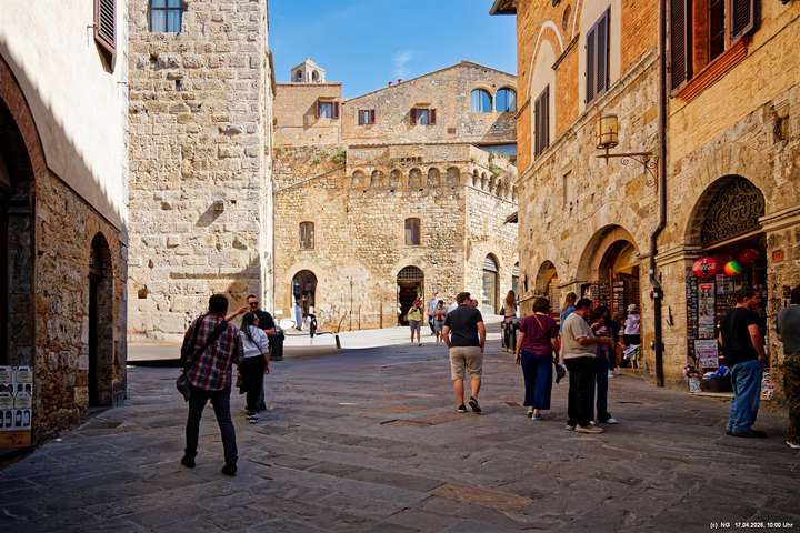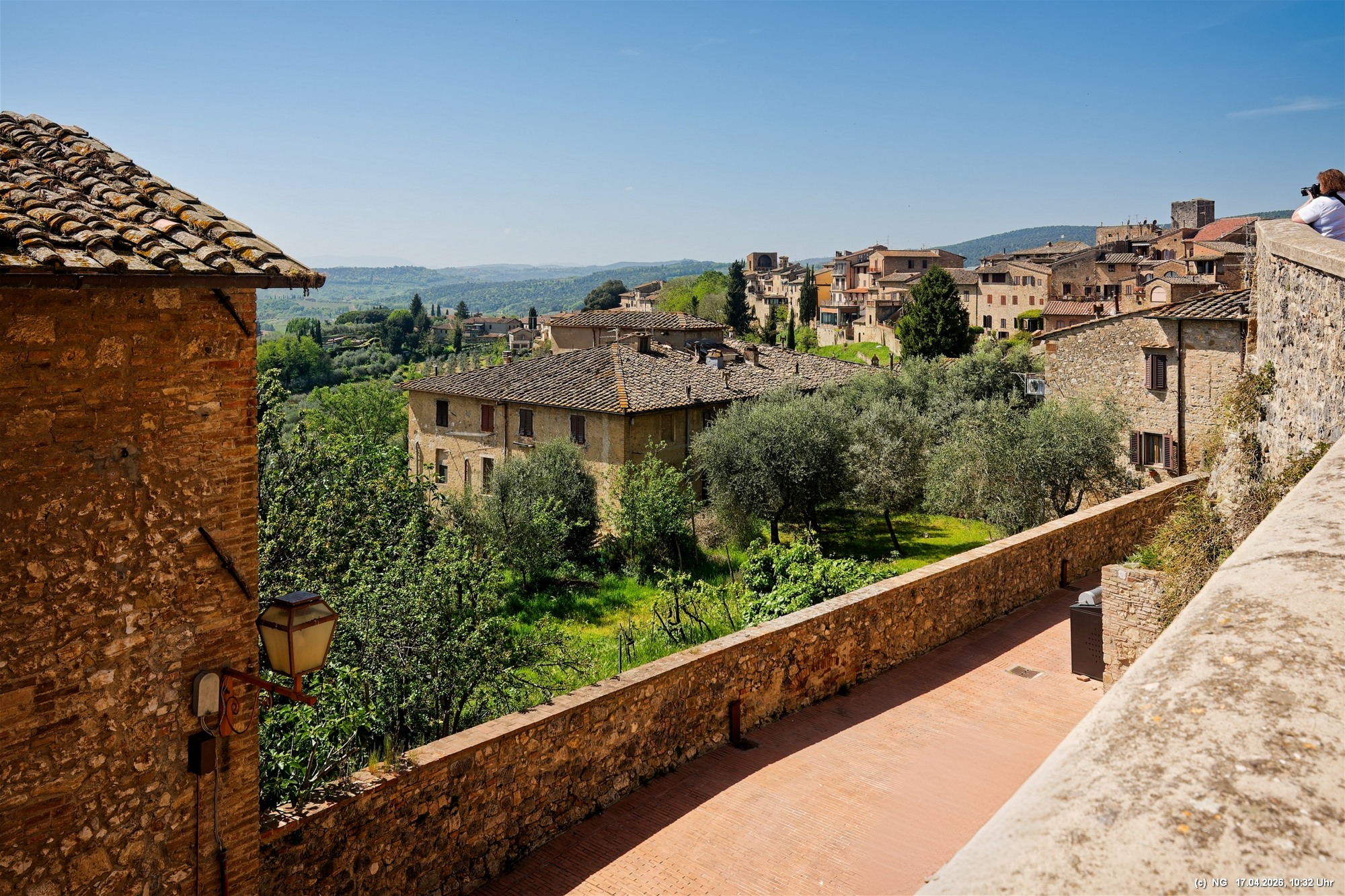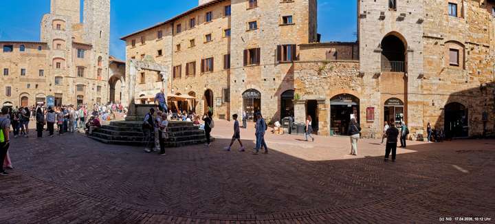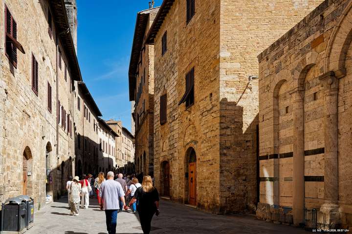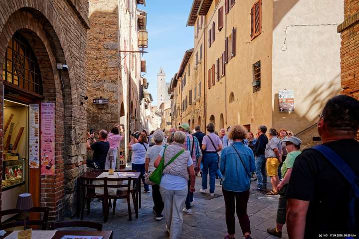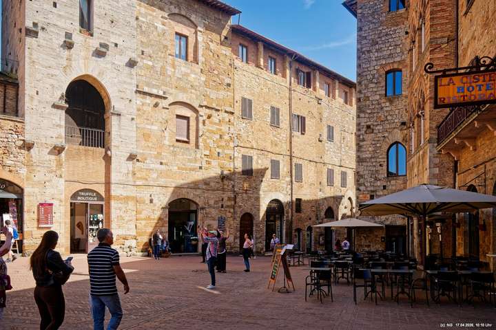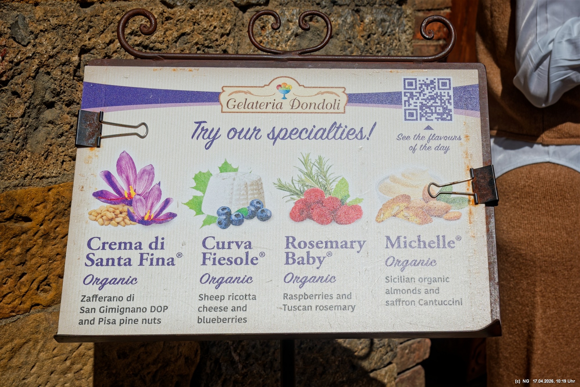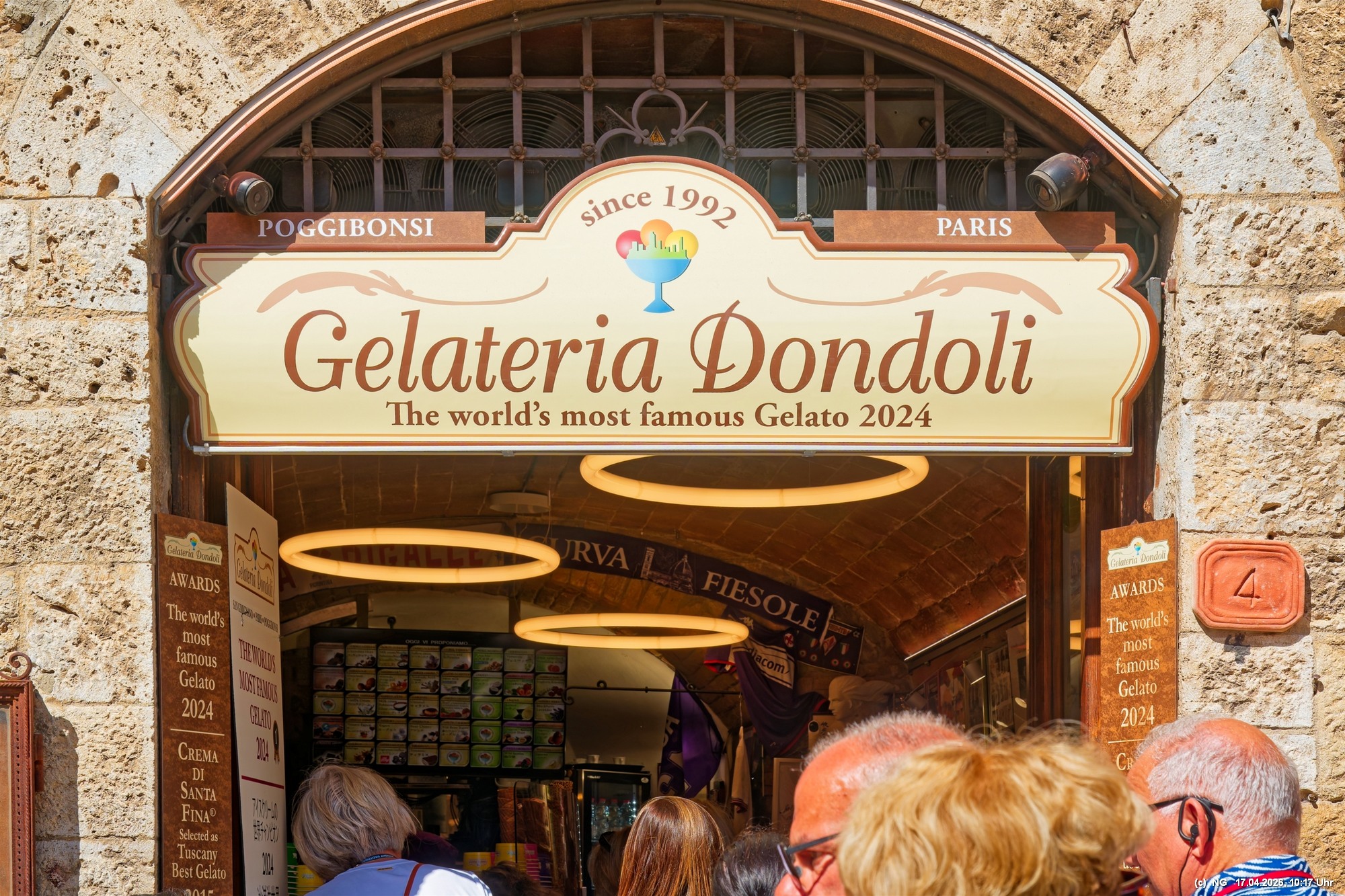 Sie befindet sich auf einem Hügel (rund 334 m) und ist Weltkulturerbe, ein touristisches Highlight. Immerhin gibt es dort die preisgekrönte "Gelateria Dondoli" mit meisterlichen Bewertungen. Der Eigentest gibt den Bewertern absolut Recht und findet auch weitere Leckereien. Nett ist es dort und man legt Wert auf ein sauberes Erscheinungsbild.