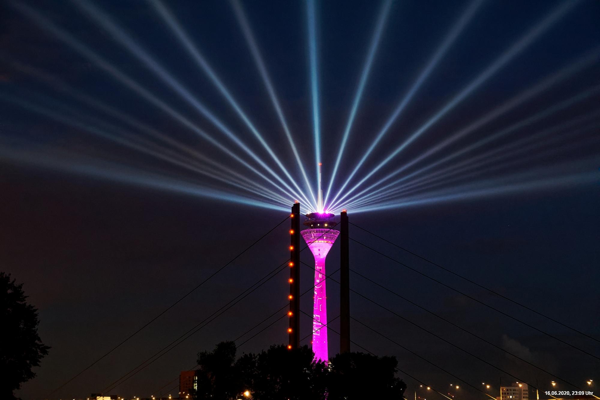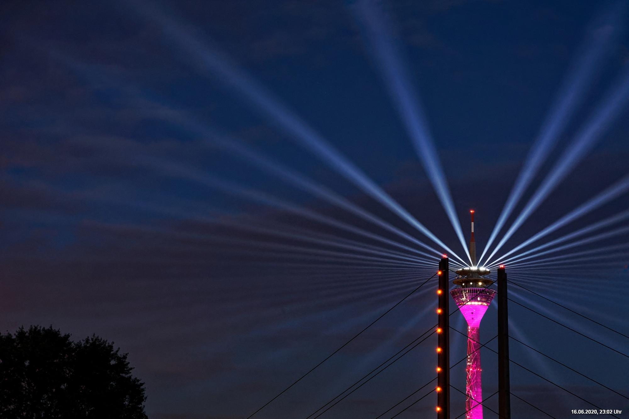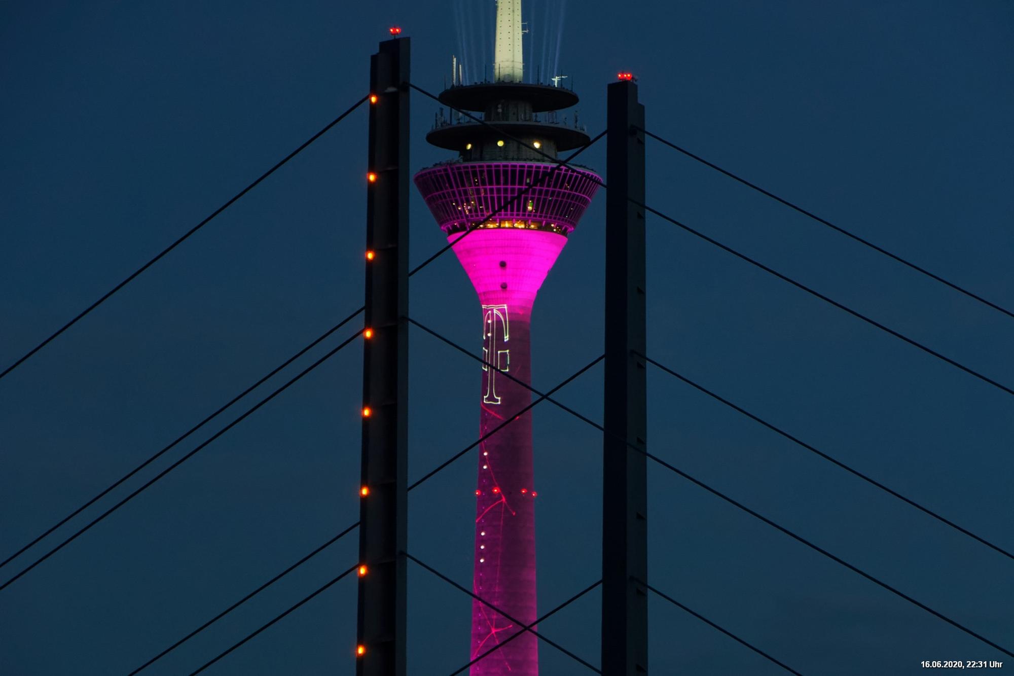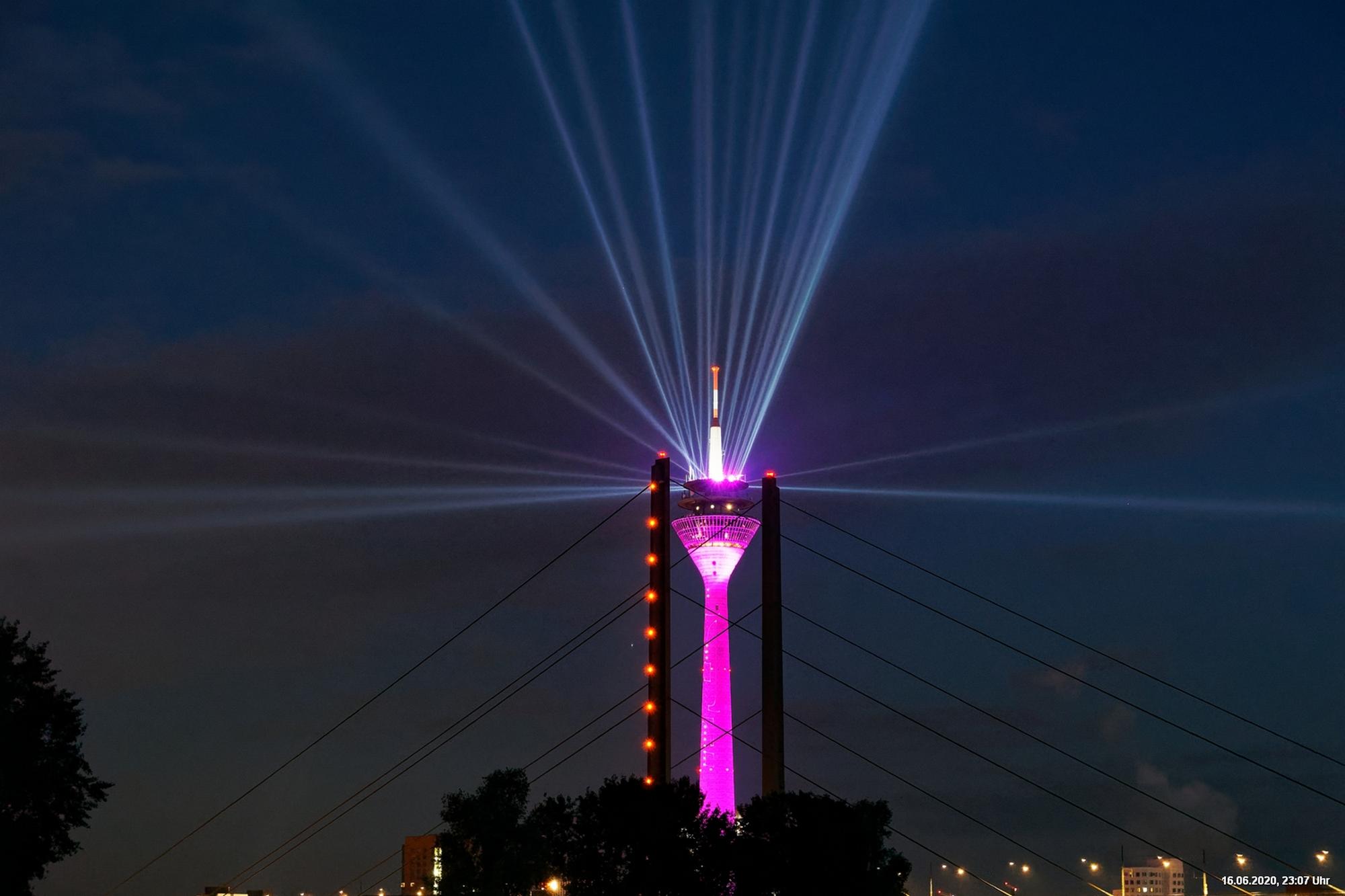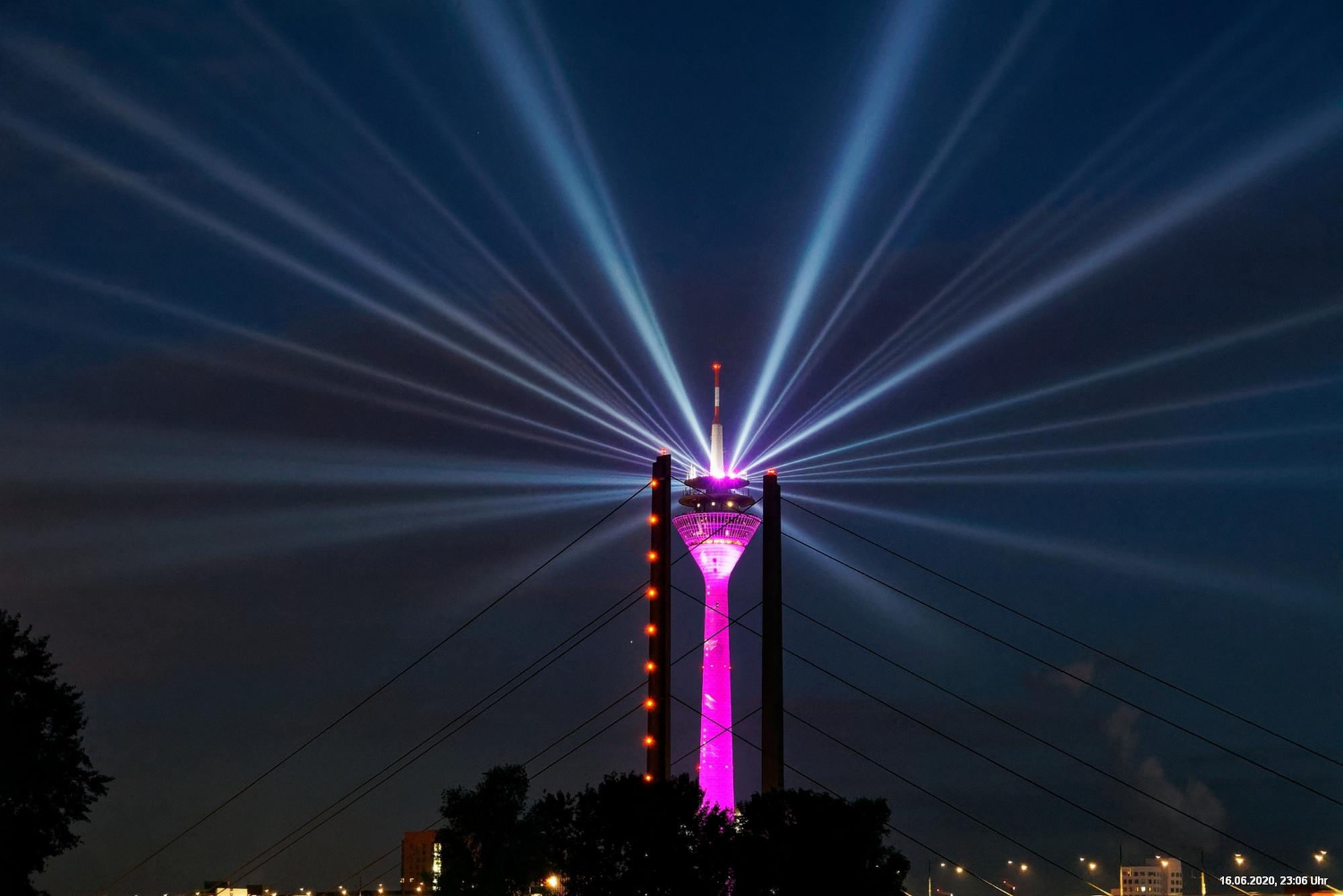 Die damalige Installation entwarf der Lichtkünstler Klaus Gendrung zum 70. Geburtstag des Landes NRW. Jetzt startet die Deutsche Telekom ihr 5G-Netz mit einer Werbeaktion in Mangentafarben, die mit den vielen und starken Strahlern dort oben doch irgendwie daran erinnert. In 195 m Höhe wurden mehr als 60 dieser beweglichen „Lichtkanonen“ aufgebaut. Die Xenon-Gasentladungslampen bilden damit den stärksten Lichtstrahl der Welt. Alle 30 Minuten gibt es eine „Lichtshow“ und bewegte Farben auf das Turmgebäude. Zwischendurch richten sich alle Strahler senkrecht gen Himmel. Der Turm sieht dann aus wie eine riesige Taschenlampe. Ist schon sehr interessant und lockt zahlreiche Besucher und besonders Fotografen an. Parkplätze findet man daher eher nicht. Nur 2 Stunden vorher