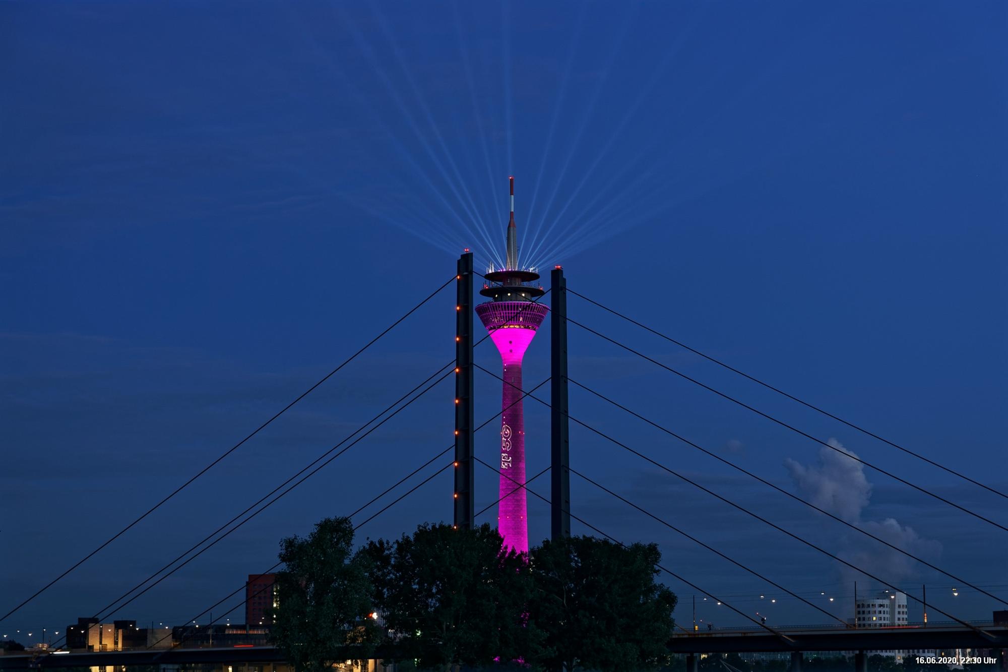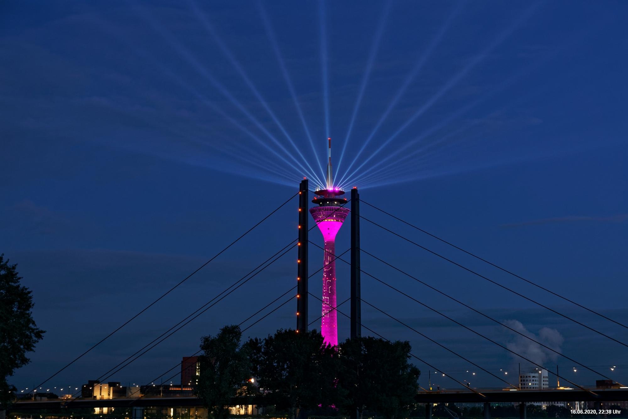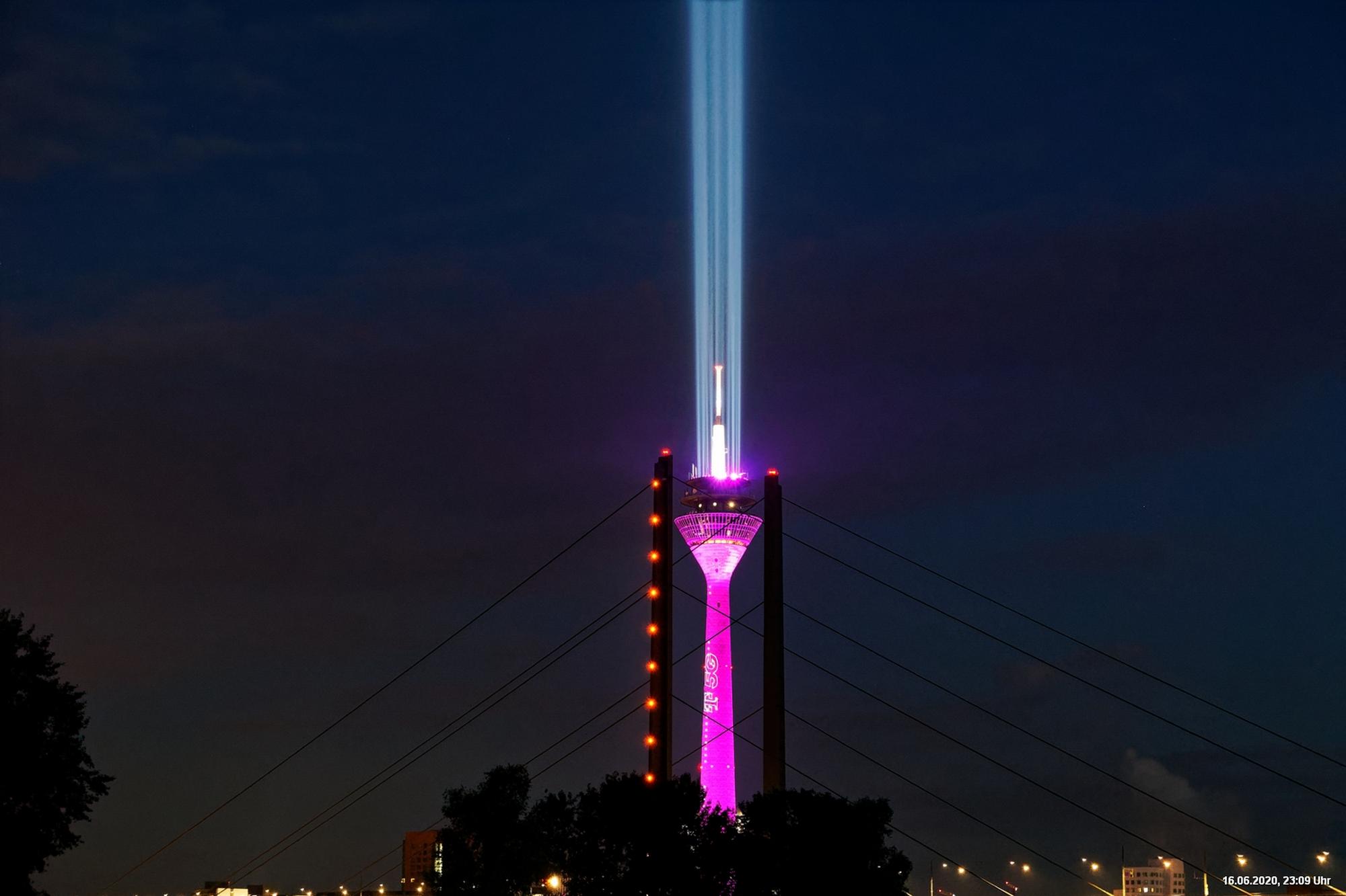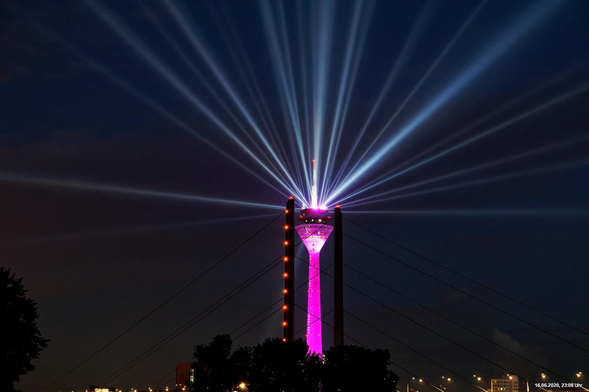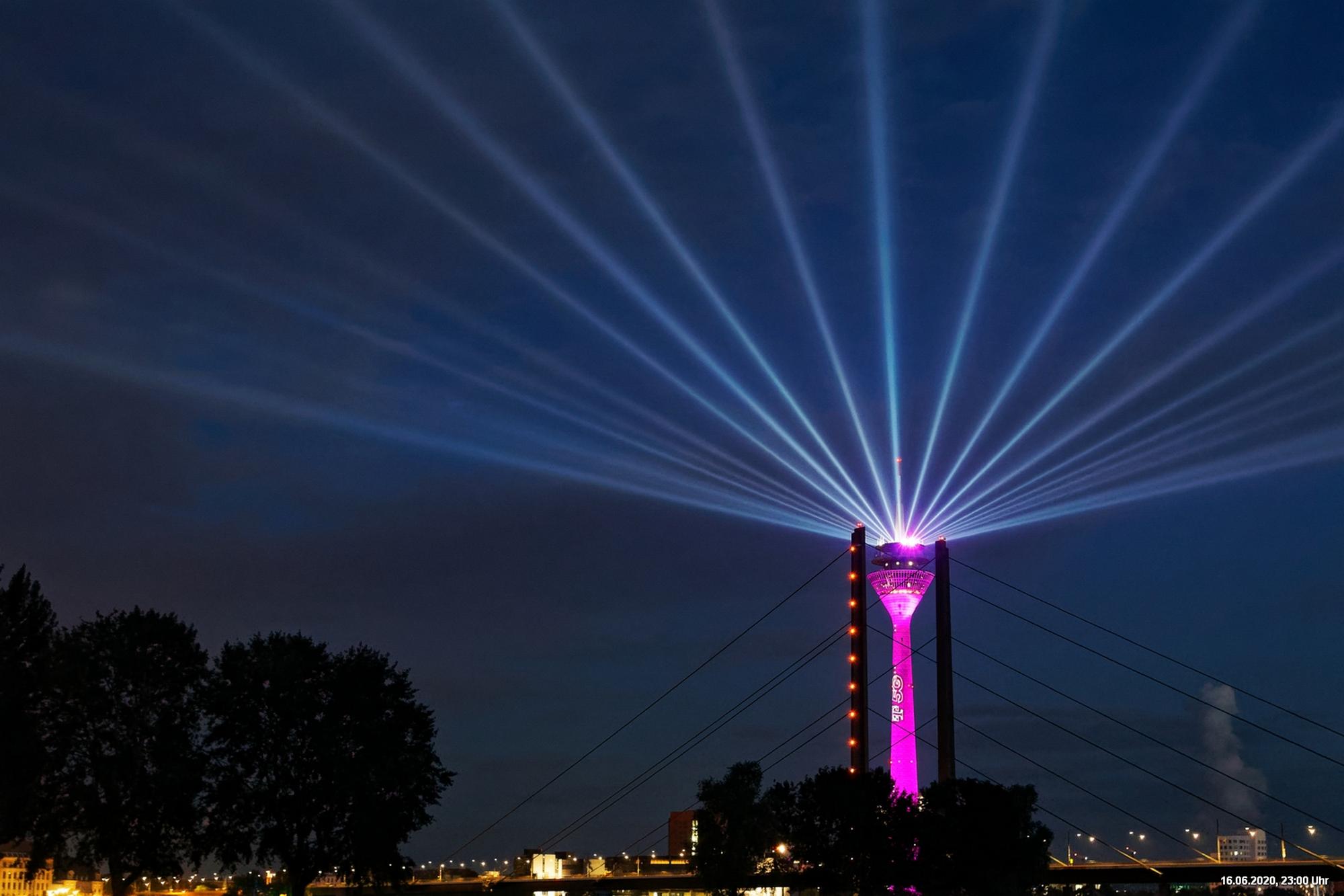 Die damalige Installation entwarf der Lichtkünstler Klaus Gendrung zum 70. Geburtstag des Landes NRW. Jetzt startet die Deutsche Telekom ihr 5G-Netz mit einer Werbeaktion in Mangentafarben, die mit den vielen und starken Strahlern dort oben doch irgendwie daran erinnert. In 195 m Höhe wurden mehr als 60 dieser beweglichen „Lichtkanonen“ aufgebaut. Die Xenon-Gasentladungslampen bilden damit den stärksten Lichtstrahl der Welt. Alle 30 Minuten gibt es eine „Lichtshow“ und bewegte Farben auf das Turmgebäude. Zwischendurch richten sich alle Strahler senkrecht gen Himmel. Der Turm sieht dann aus wie eine riesige Taschenlampe. Ist schon sehr interessant und lockt zahlreiche Besucher und besonders Fotografen an. Parkplätze findet man daher eher nicht. Nur 2 Stunden vorher