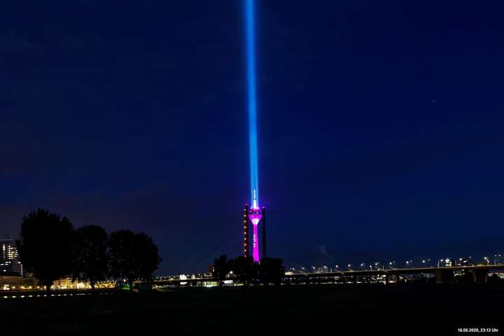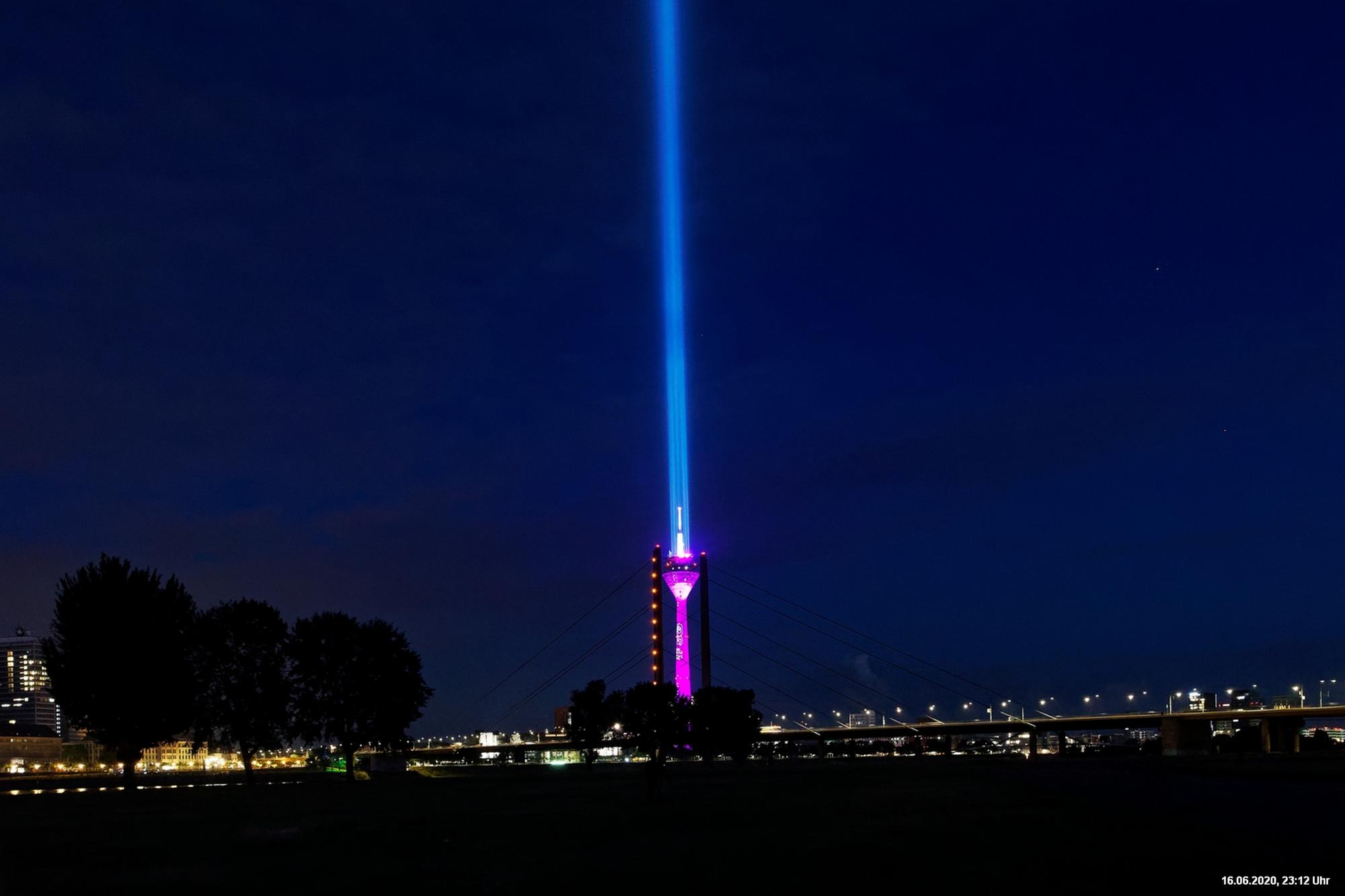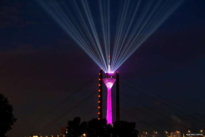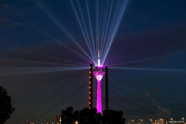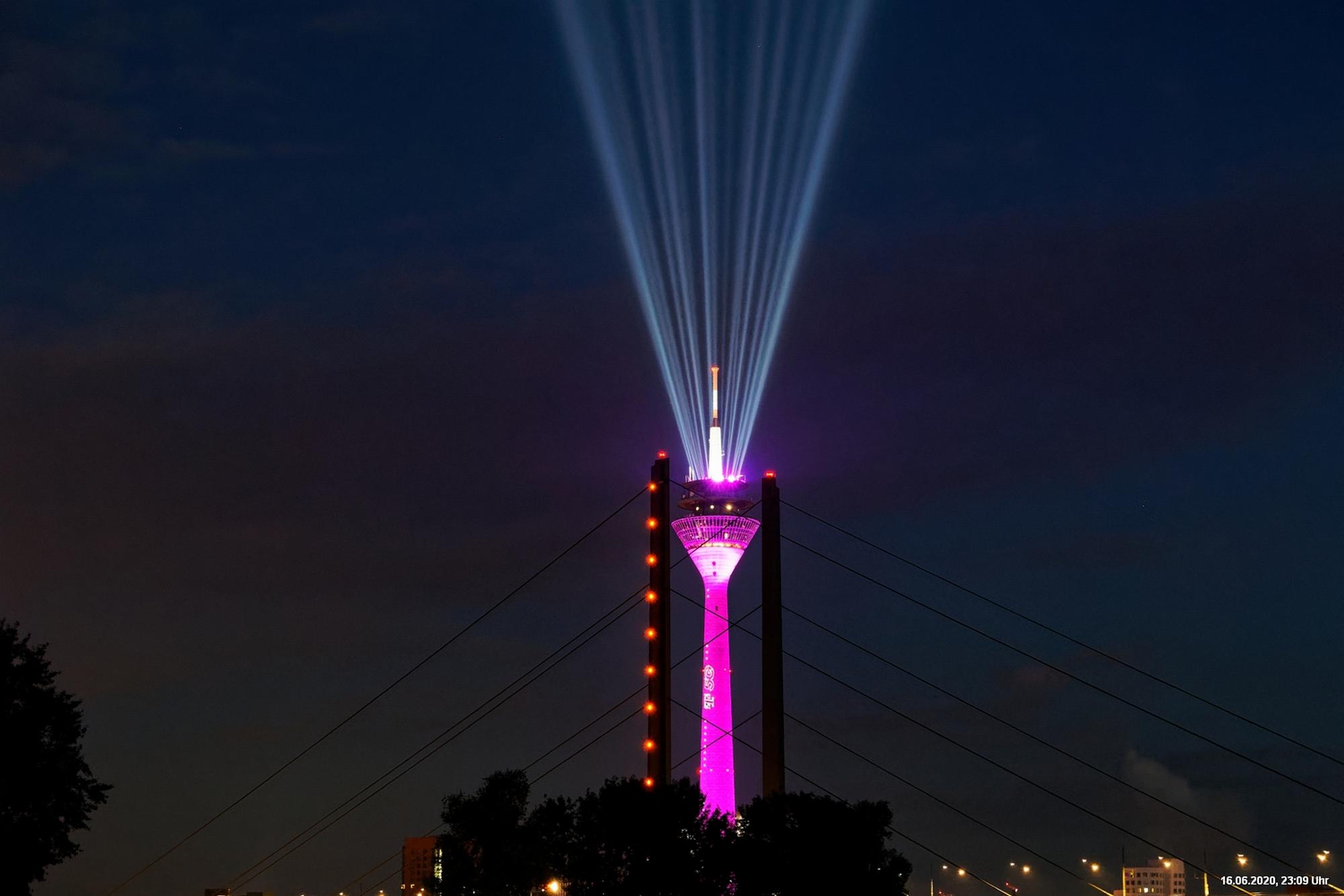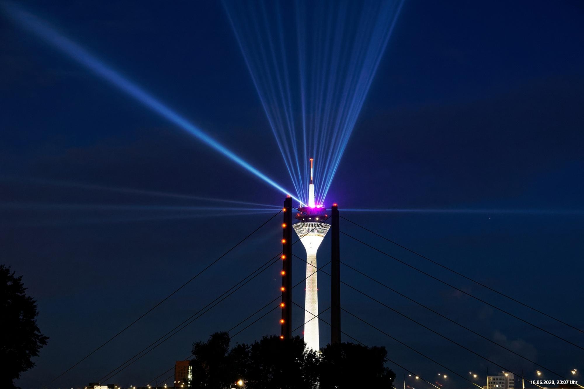 Die damalige Installation entwarf der Lichtkünstler Klaus Gendrung zum 70. Geburtstag des Landes NRW. Jetzt startet die Deutsche Telekom ihr 5G-Netz mit einer Werbeaktion in Mangentafarben, die mit den vielen und starken Strahlern dort oben doch irgendwie daran erinnert. In 195 m Höhe wurden mehr als 60 dieser beweglichen „Lichtkanonen“ aufgebaut. Die Xenon-Gasentladungslampen bilden damit den stärksten Lichtstrahl der Welt. Alle 30 Minuten gibt es eine „Lichtshow“ und bewegte Farben auf das Turmgebäude. Zwischendurch richten sich alle Strahler senkrecht gen Himmel. Der Turm sieht dann aus wie eine riesige Taschenlampe. Ist schon sehr interessant und lockt zahlreiche Besucher und besonders Fotografen an. Parkplätze findet man daher eher nicht. Nur 2 Stunden vorher
