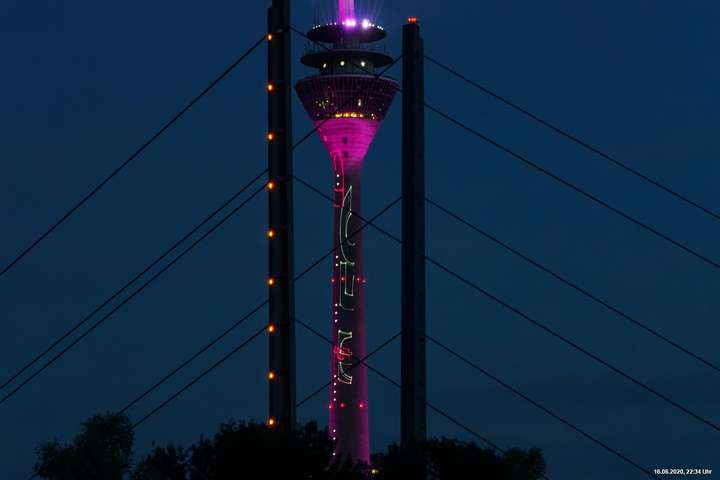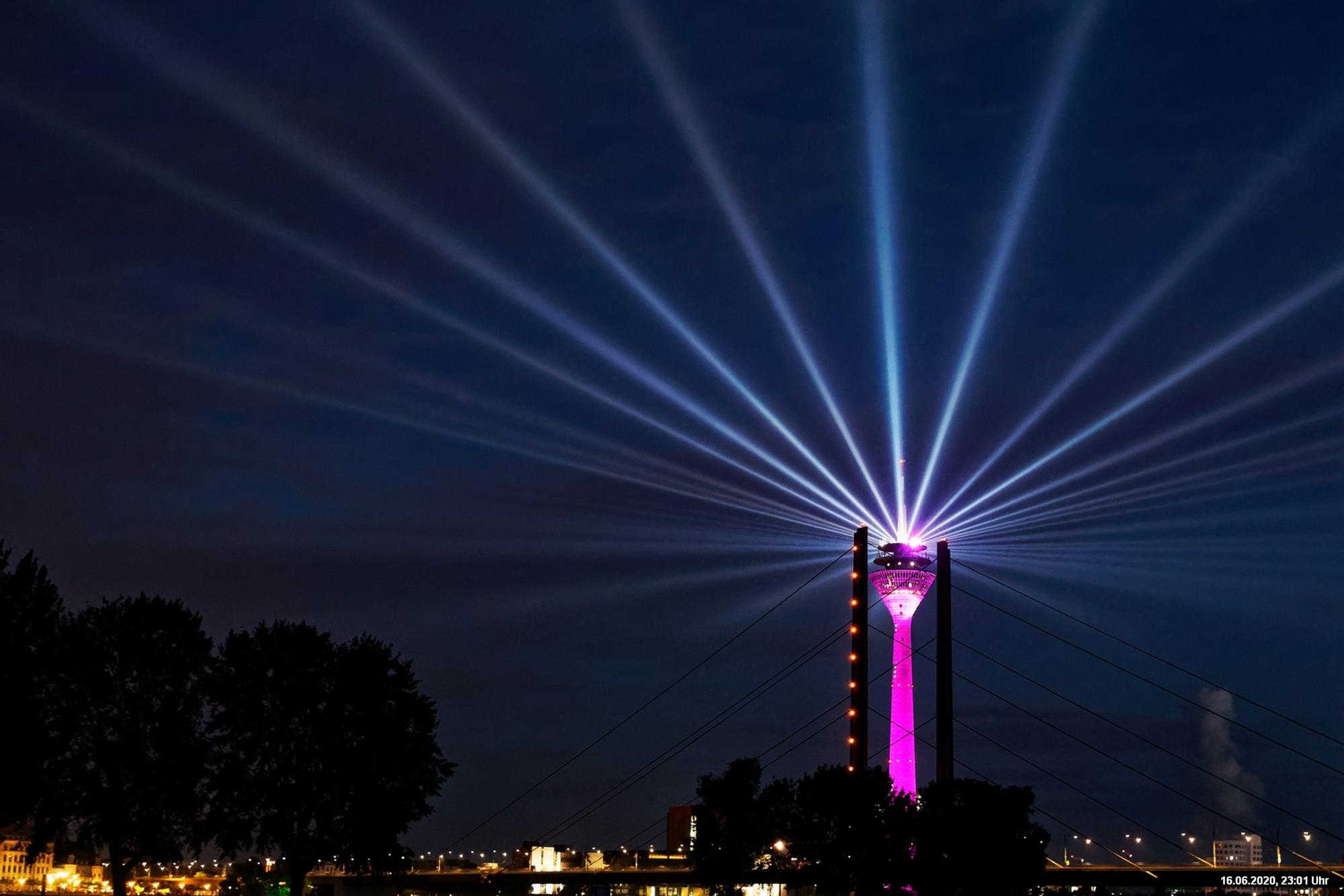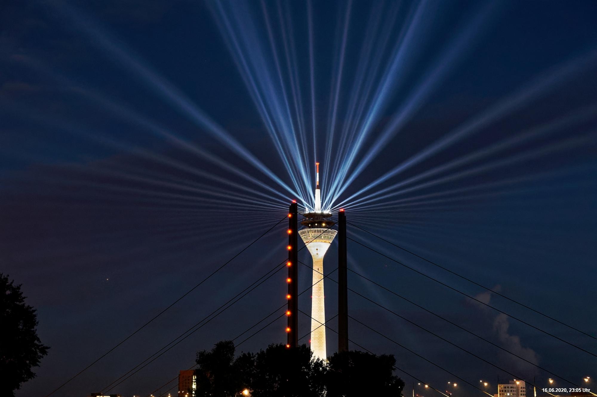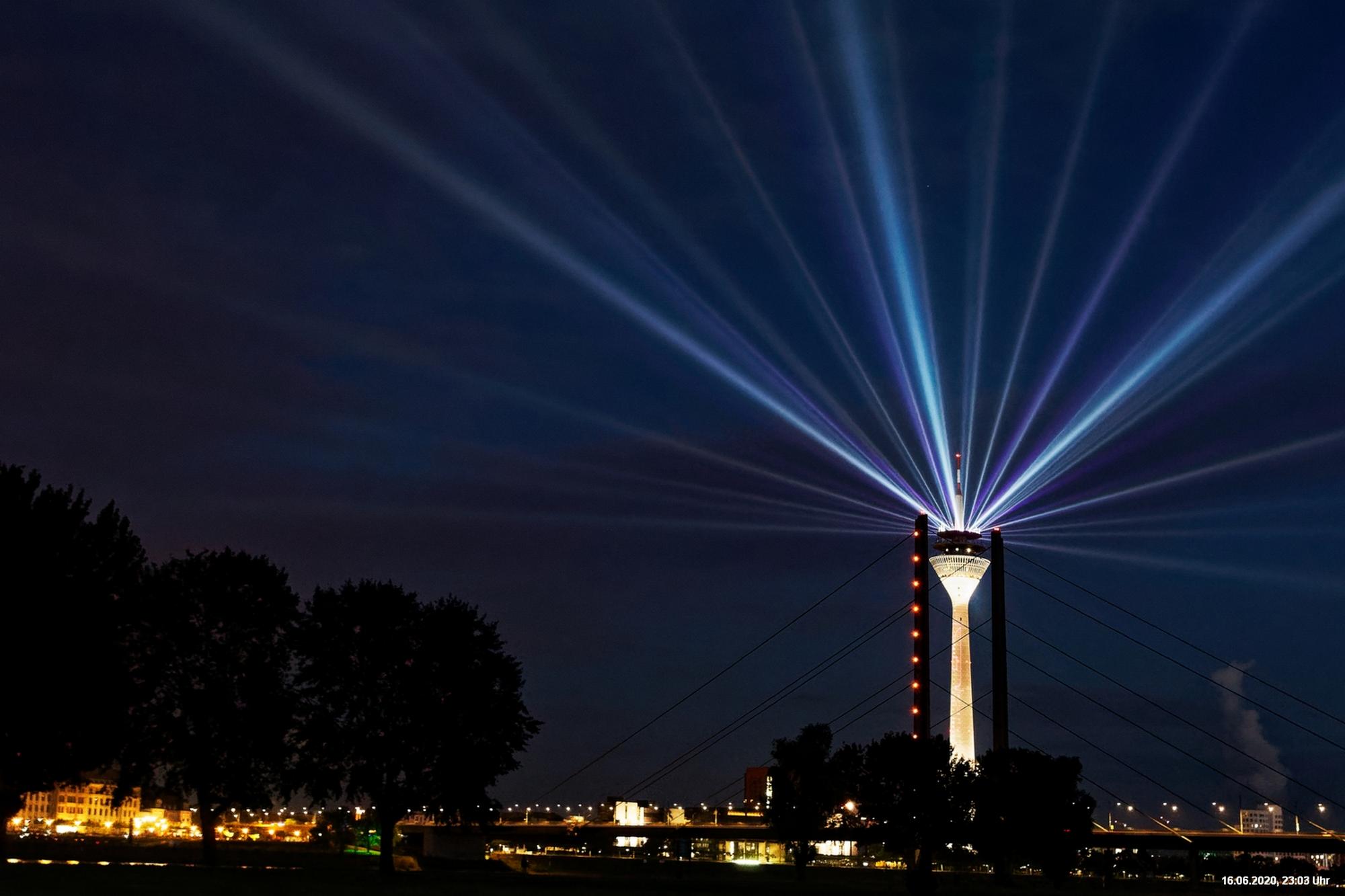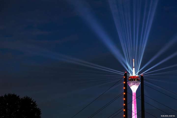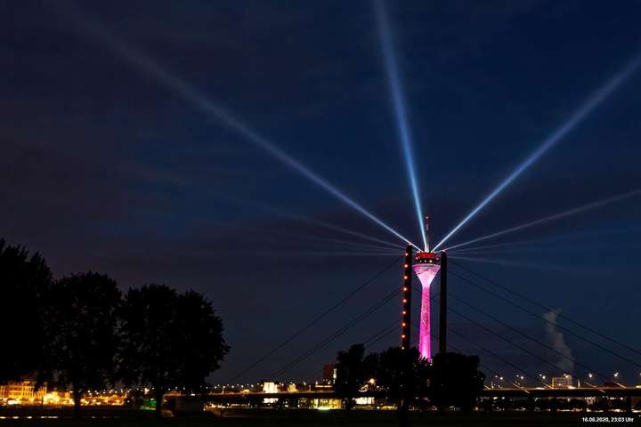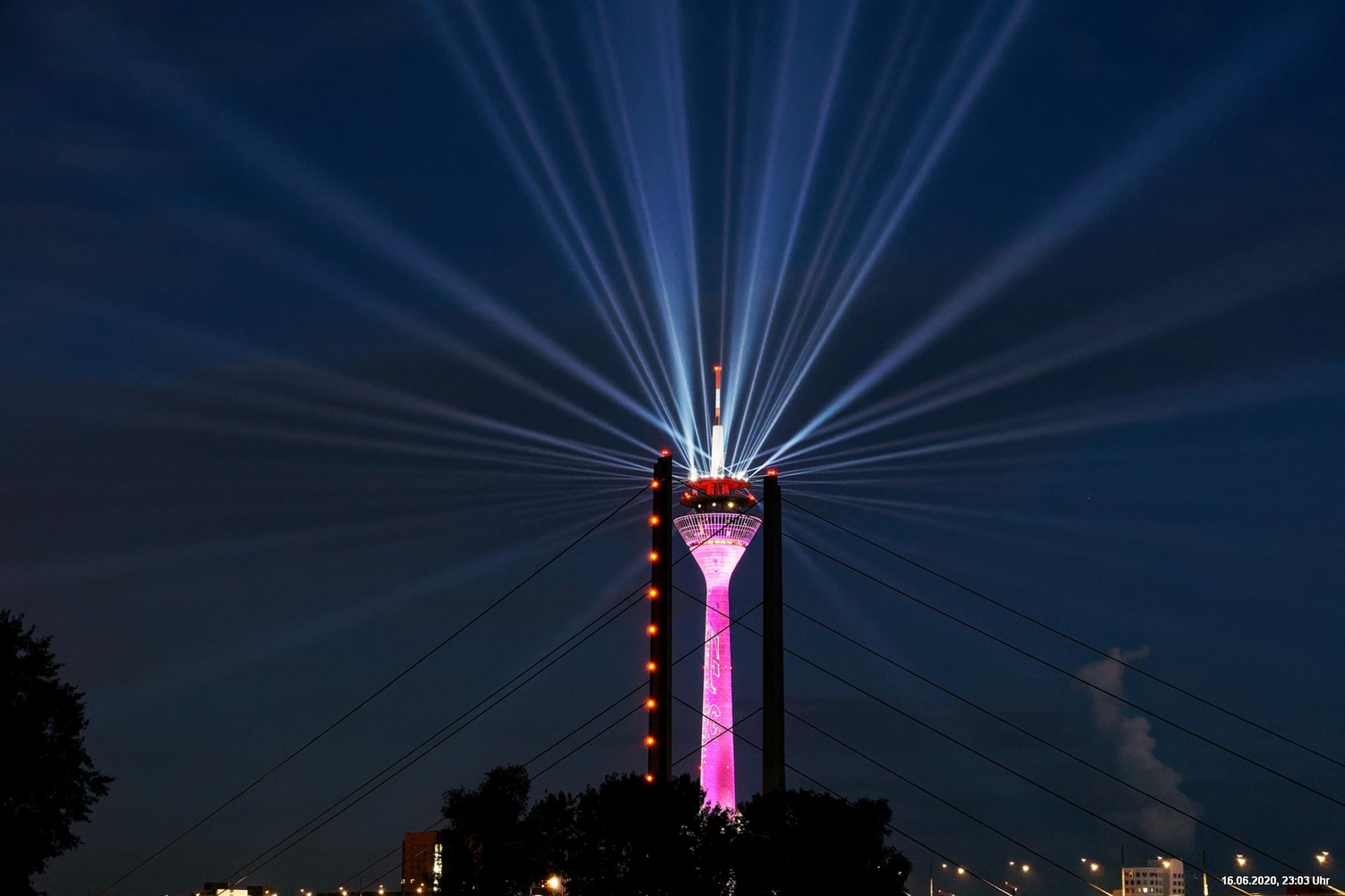 Die damalige Installation entwarf der Lichtkünstler Klaus Gendrung zum 70. Geburtstag des Landes NRW. Jetzt startet die Deutsche Telekom ihr 5G-Netz mit einer Werbeaktion in Mangentafarben, die mit den vielen und starken Strahlern dort oben doch irgendwie daran erinnert. In 195 m Höhe wurden mehr als 60 dieser beweglichen „Lichtkanonen“ aufgebaut. Die Xenon-Gasentladungslampen bilden damit den stärksten Lichtstrahl der Welt. Alle 30 Minuten gibt es eine „Lichtshow“ und bewegte Farben auf das Turmgebäude. Zwischendurch richten sich alle Strahler senkrecht gen Himmel. Der Turm sieht dann aus wie eine riesige Taschenlampe. Ist schon sehr interessant und lockt zahlreiche Besucher und besonders Fotografen an. Parkplätze findet man daher eher nicht. Nur 2 Stunden vorher