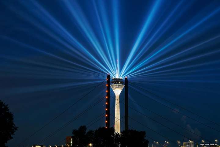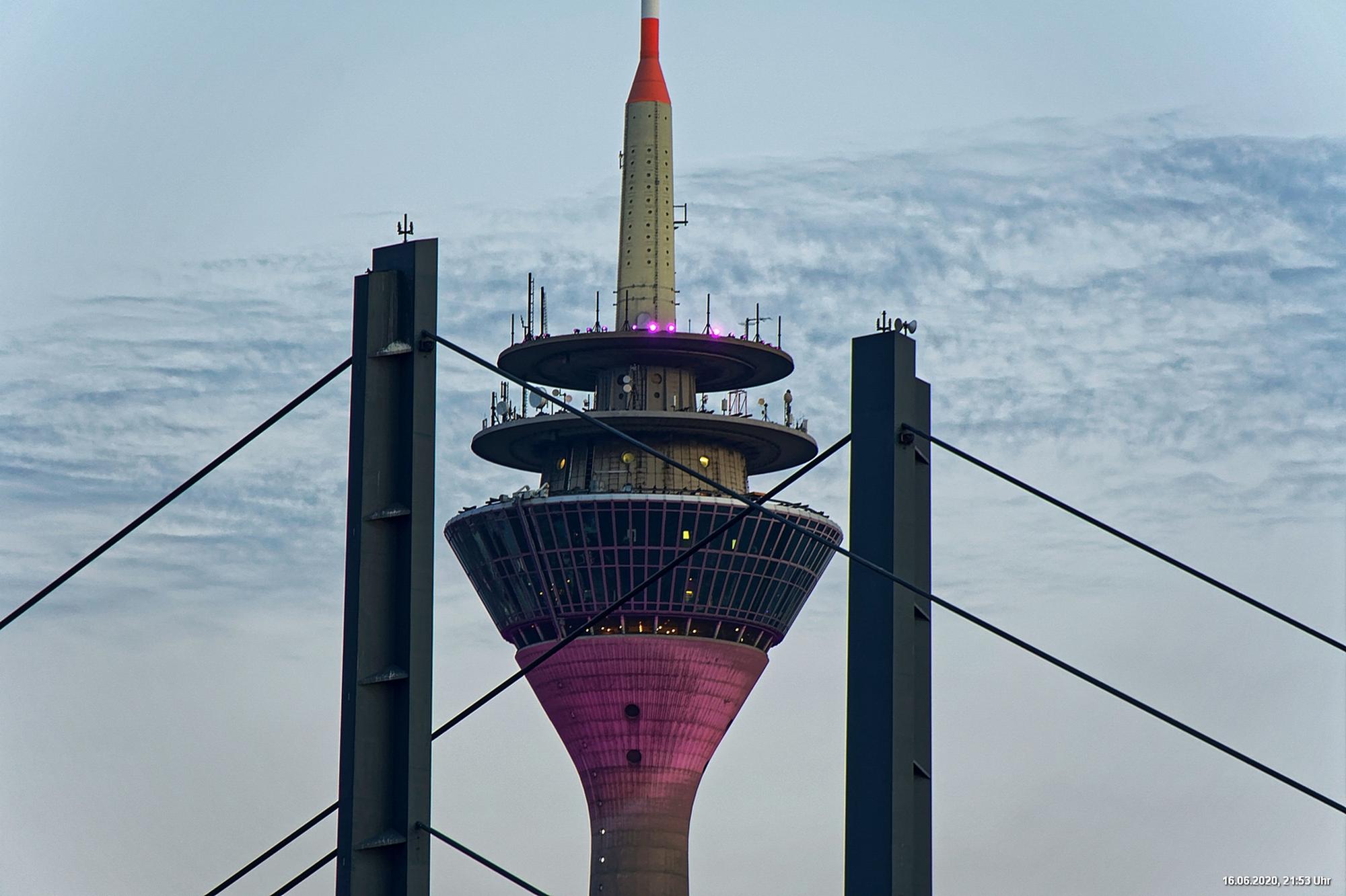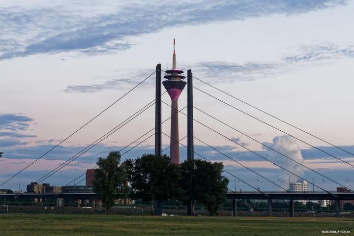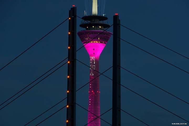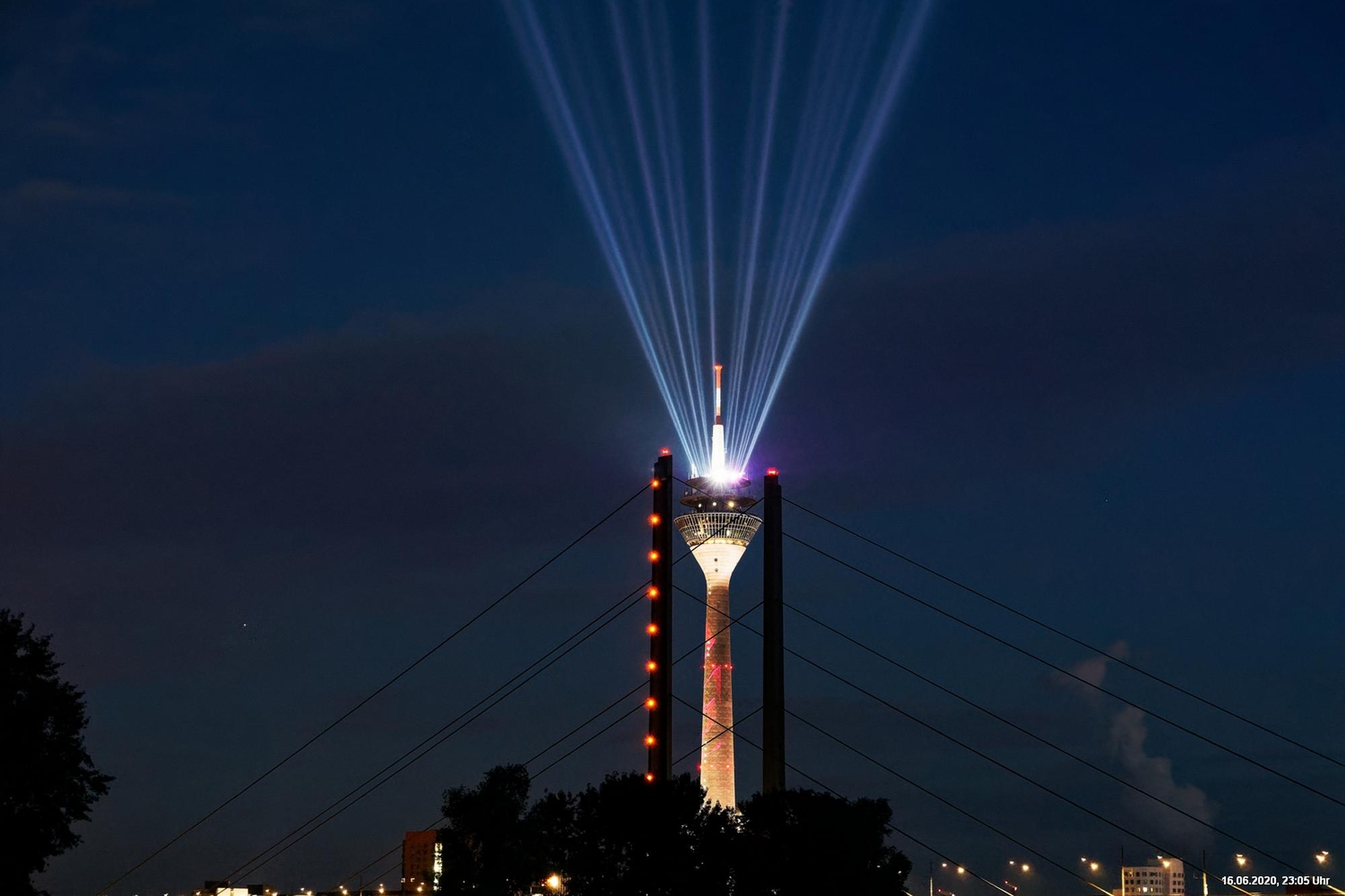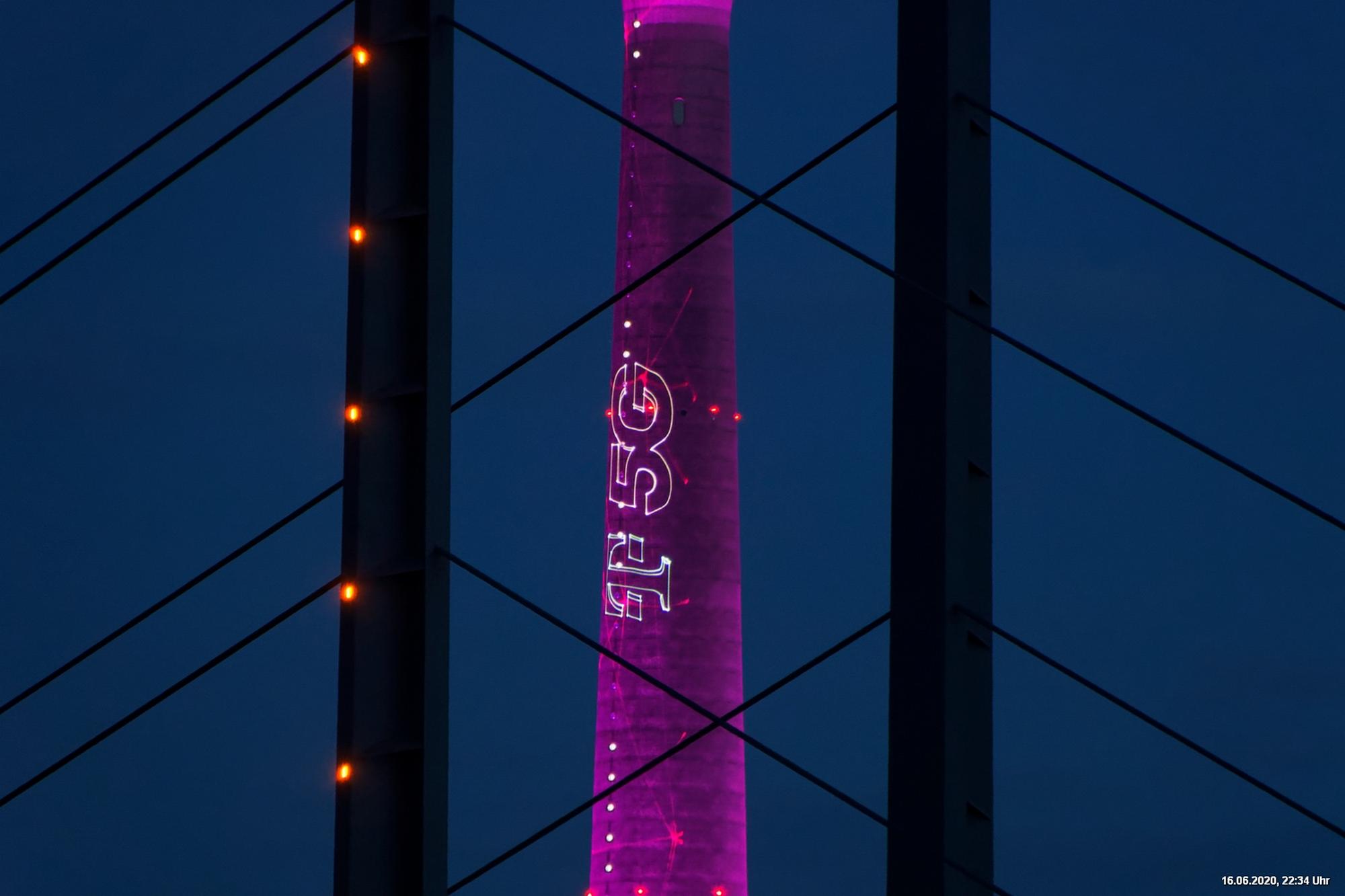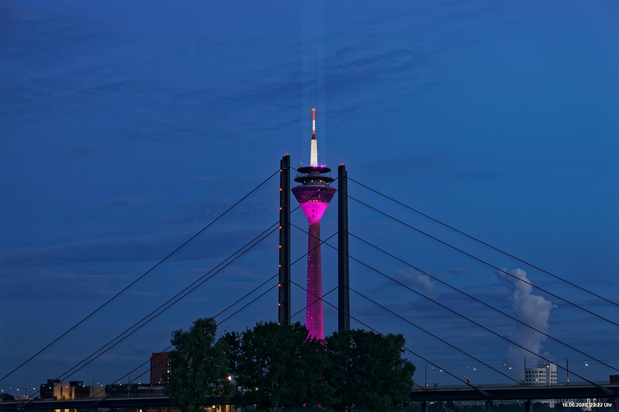 Die damalige Installation entwarf der Lichtkünstler Klaus Gendrung zum 70. Geburtstag des Landes NRW. Jetzt startet die Deutsche Telekom ihr 5G-Netz mit einer Werbeaktion in Mangentafarben, die mit den vielen und starken Strahlern dort oben doch irgendwie daran erinnert. In 195 m Höhe wurden mehr als 60 dieser beweglichen „Lichtkanonen“ aufgebaut. Die Xenon-Gasentladungslampen bilden damit den stärksten Lichtstrahl der Welt. Alle 30 Minuten gibt es eine „Lichtshow“ und bewegte Farben auf das Turmgebäude. Zwischendurch richten sich alle Strahler senkrecht gen Himmel. Der Turm sieht dann aus wie eine riesige Taschenlampe. Ist schon sehr interessant und lockt zahlreiche Besucher und besonders Fotografen an. Parkplätze findet man daher eher nicht. Nur 2 Stunden vorher