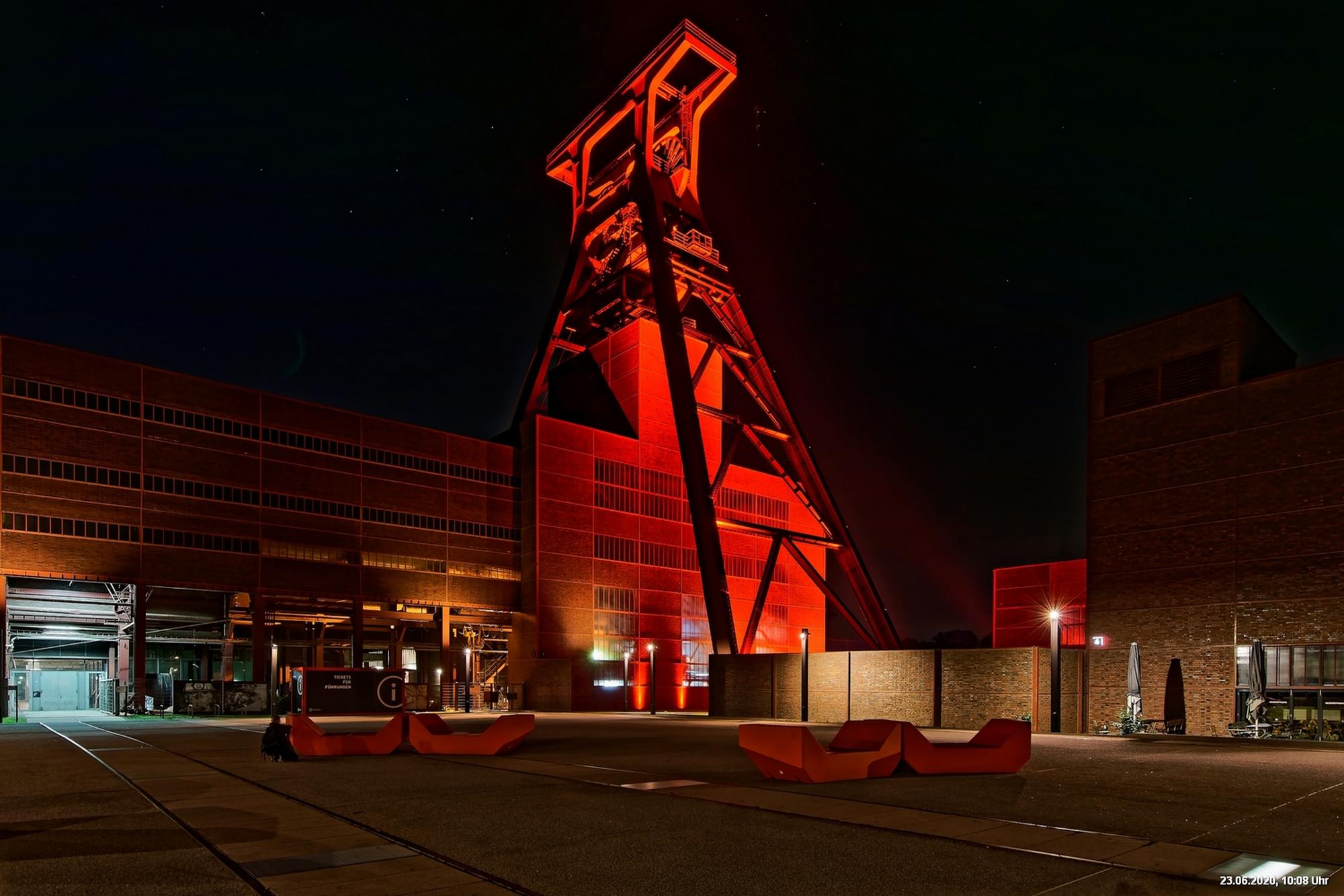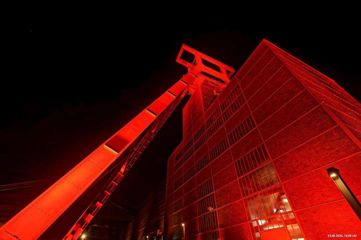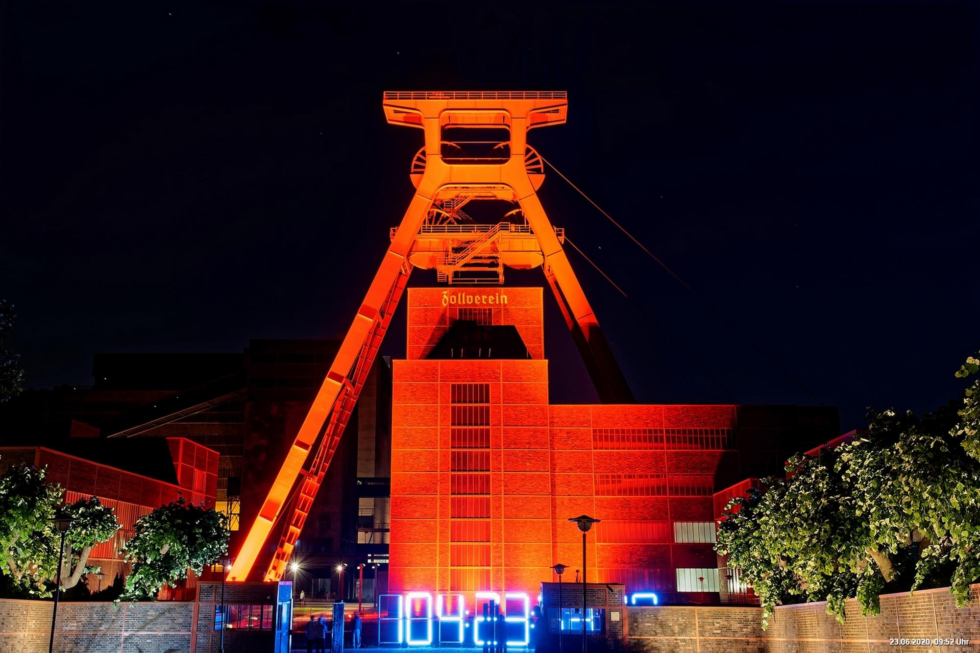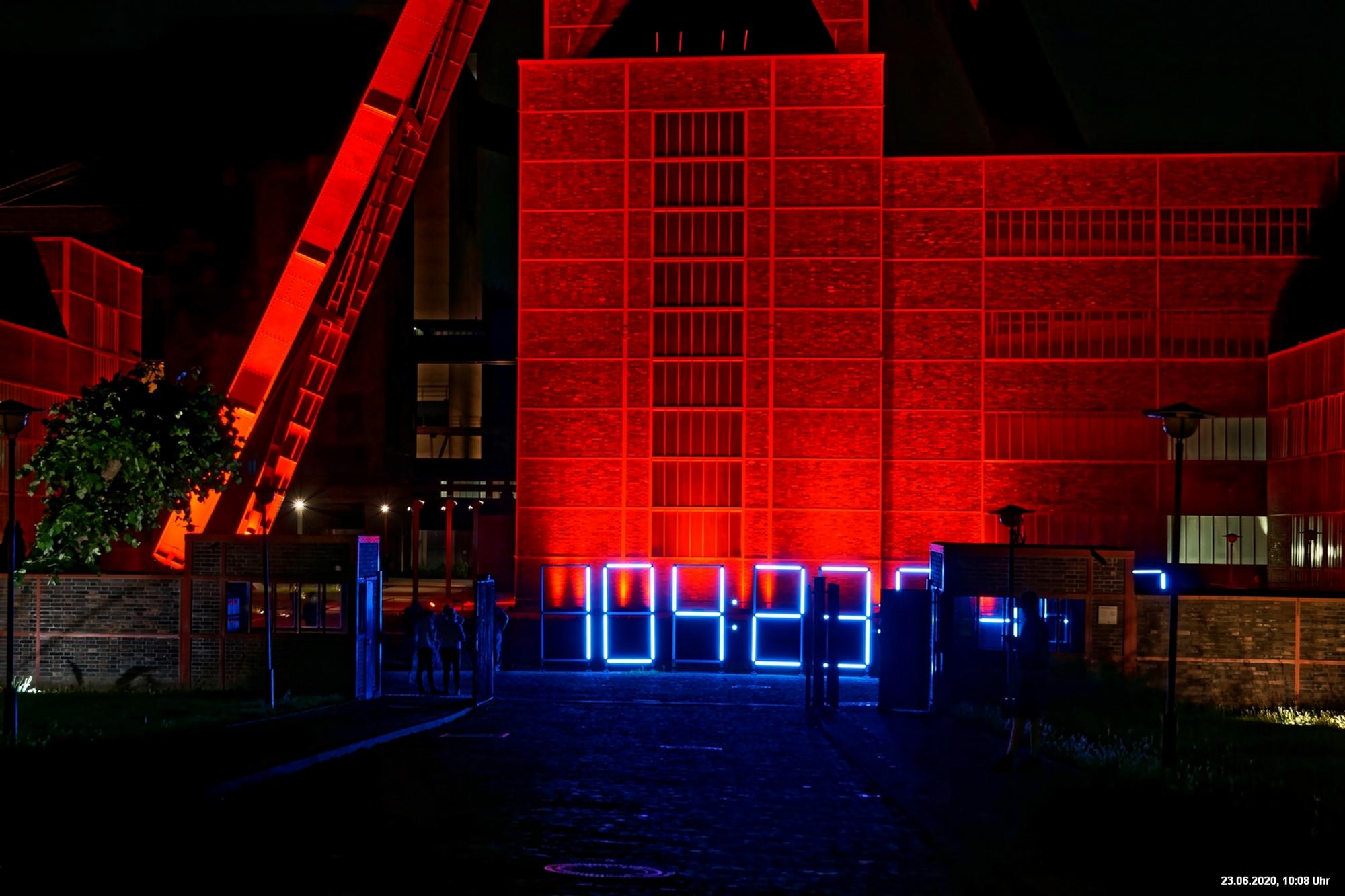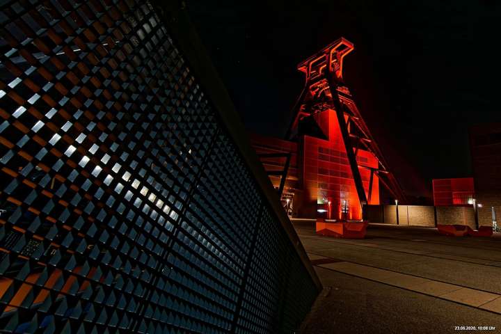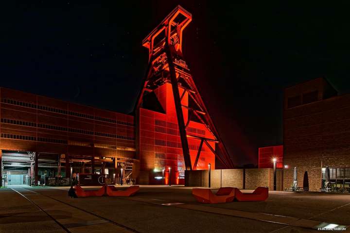 So, das war der offizielle Teil. Es gab nicht wirklich ein Programm und man musste sich über’s Internet orientieren. Also los – Ziele ausgesucht: Oberhausen Turbinenhalle (na ja) + Oberhausen Schloss (war prima gemacht) + Zollverein Essen Sanaa-Haus (eindrucksvoll – im Rhythmus des Herzschlages leuchtete das Licht auf) + Zollverein Essen Förderturm (immer wieder eine Augenweide). Auf Zollverein wurde auch eine digitale Uhr gezeigt mit der Dauer der Arbeitslosigkeit des Installateurs. Danach Rathaus Gladbeck – hab das rote Licht gesucht und nur 2 normale rote Lampen am Eingang gefunden (war nix). Danach war es dann zu spät (etwa 01:30 Uhr). Wollte eigentlich noch zum Theater nach Marl. War aber nicht sicher, ob dort das Licht schon aus war.
