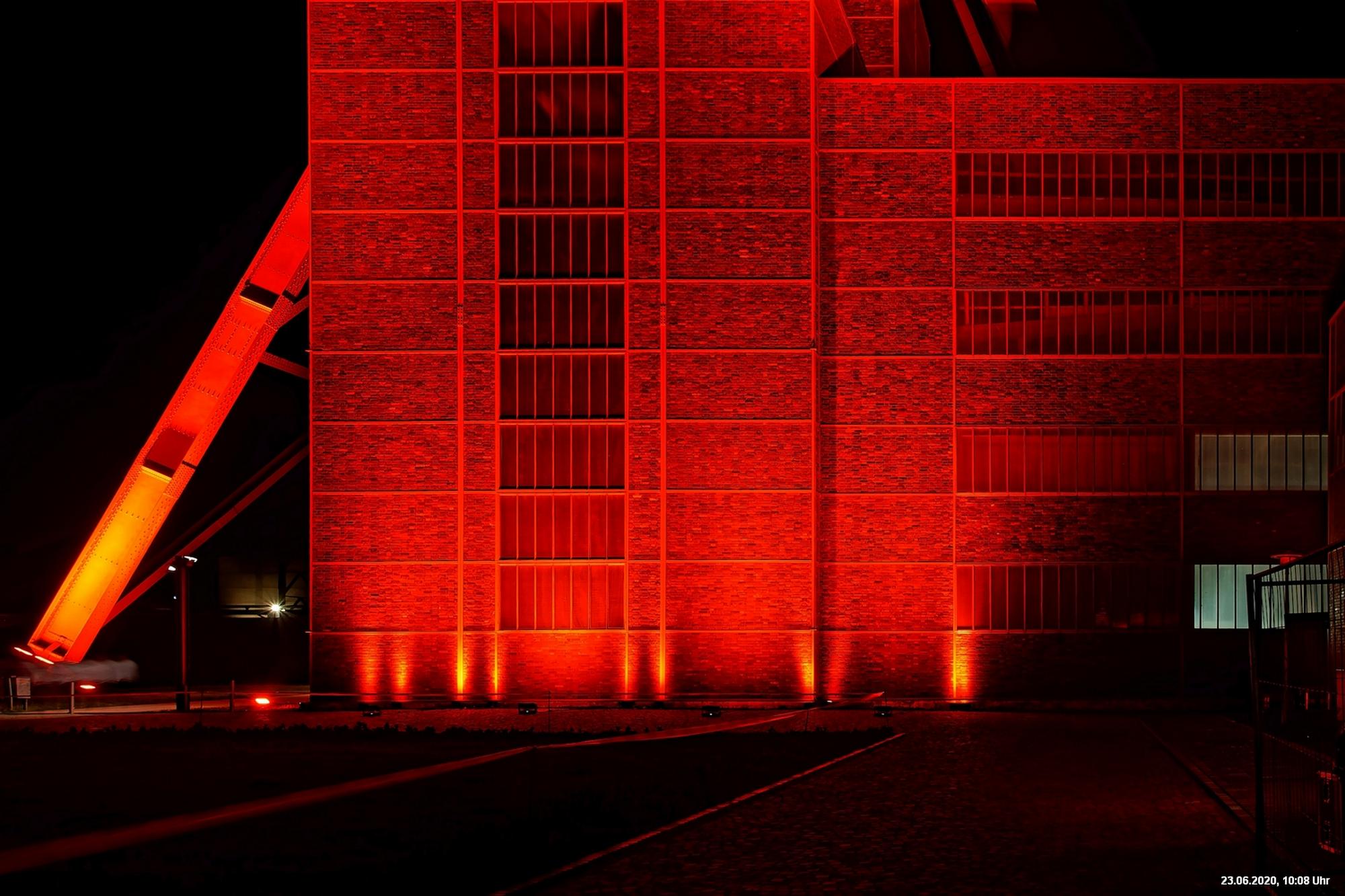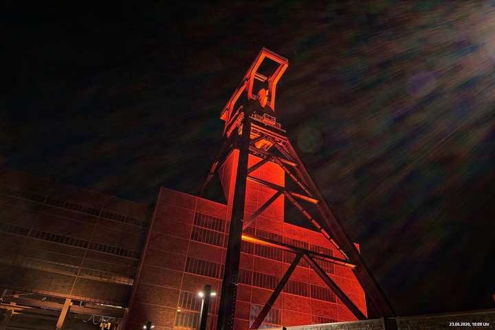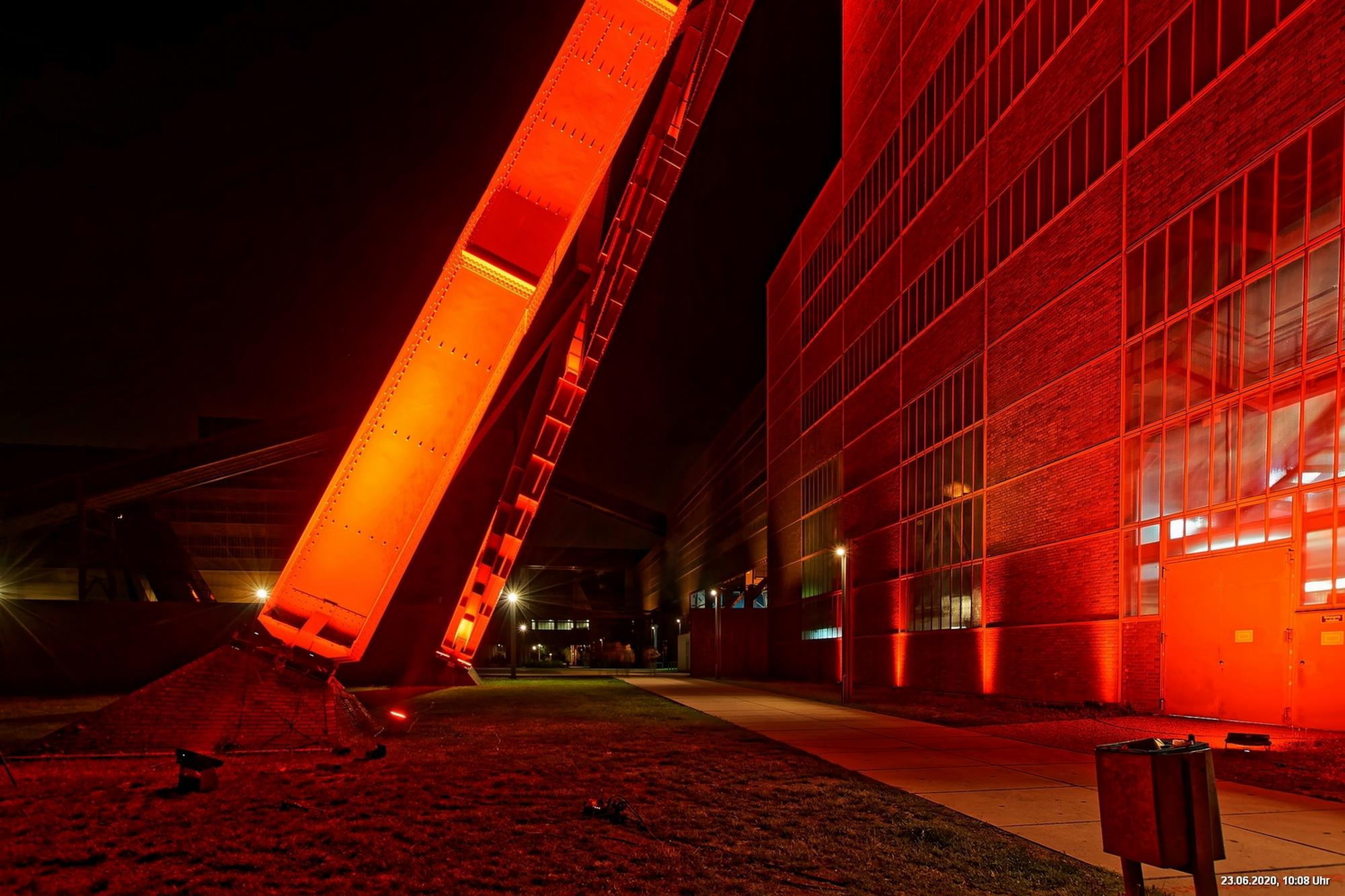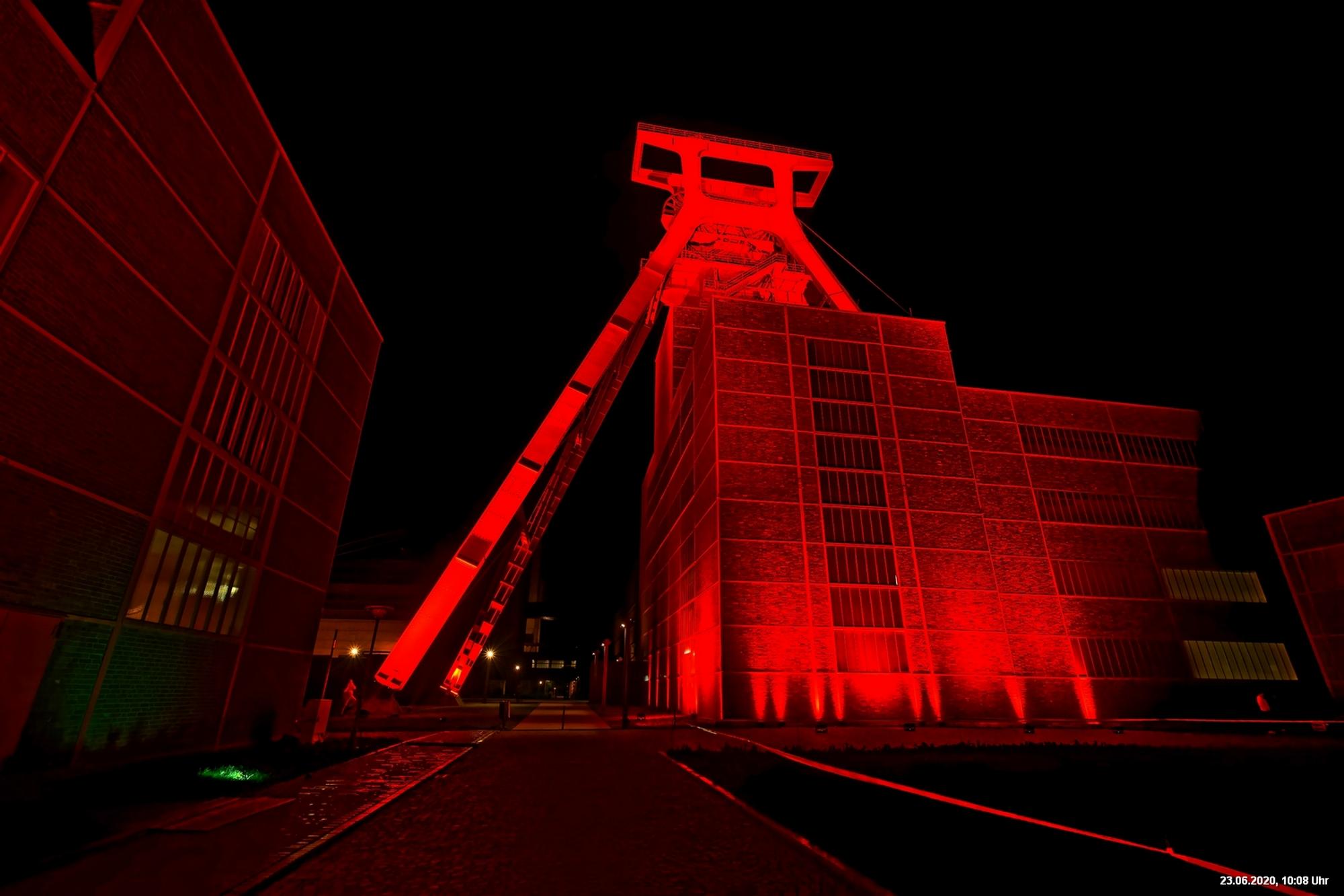 So, das war der offizielle Teil. Es gab nicht wirklich ein Programm und man musste sich über’s Internet orientieren. Also los – Ziele ausgesucht: Oberhausen Turbinenhalle (na ja) + Oberhausen Schloss (war prima gemacht) + Zollverein Essen Sanaa-Haus (eindrucksvoll – im Rhythmus des Herzschlages leuchtete das Licht auf) + Zollverein Essen Förderturm (immer wieder eine Augenweide). Auf Zollverein wurde auch eine digitale Uhr gezeigt mit der Dauer der Arbeitslosigkeit des Installateurs. Danach Rathaus Gladbeck – hab das rote Licht gesucht und nur 2 normale rote Lampen am Eingang gefunden (war nix). Danach war es dann zu spät (etwa 01:30 Uhr). Wollte eigentlich noch zum Theater nach Marl. War aber nicht sicher, ob dort das Licht schon aus war.