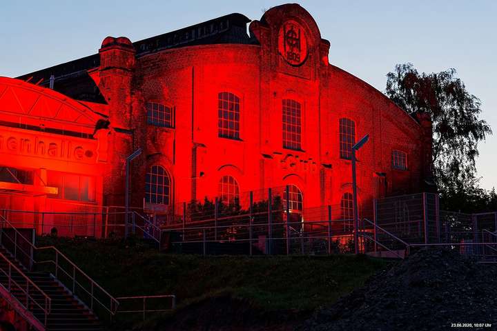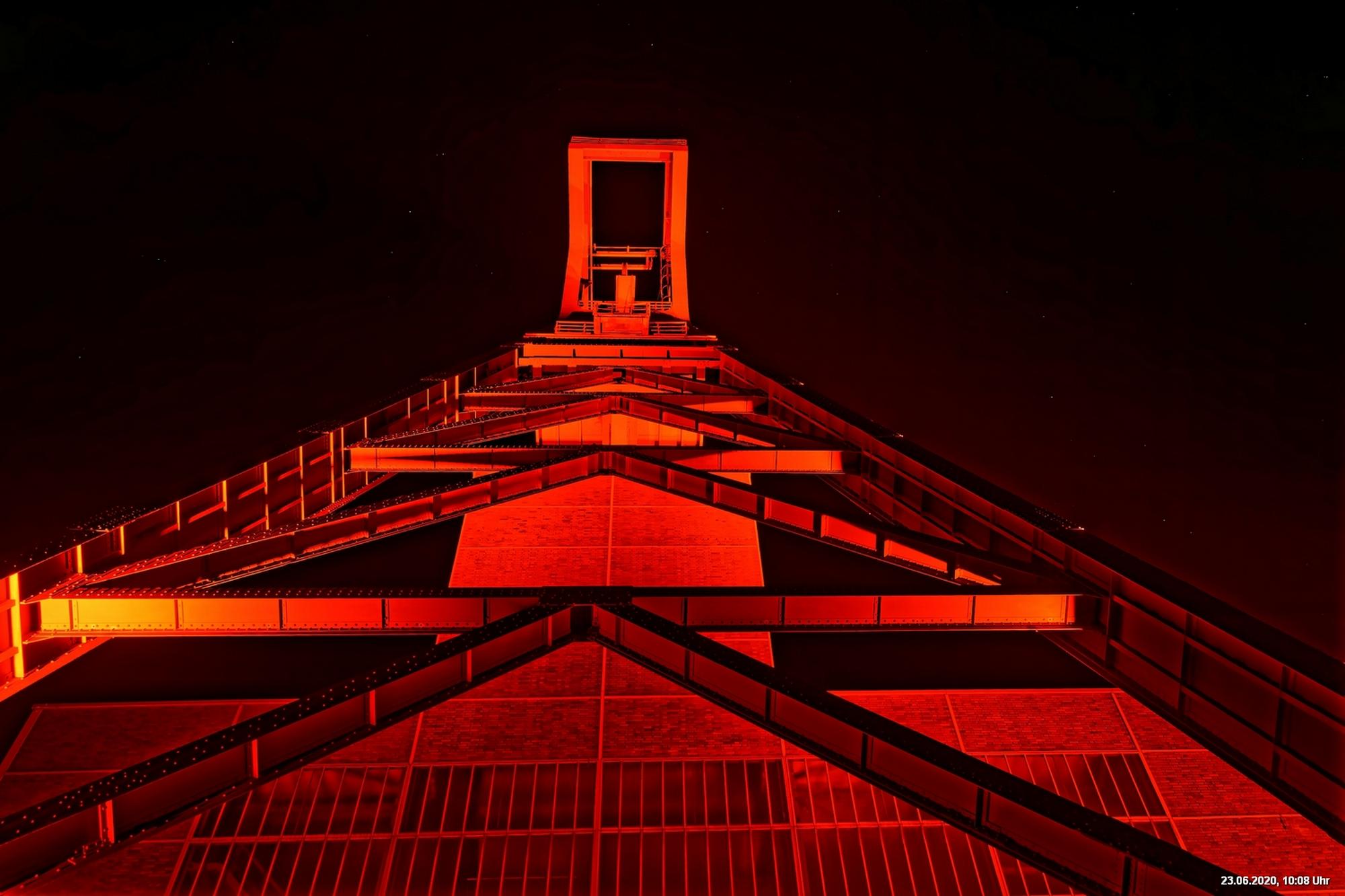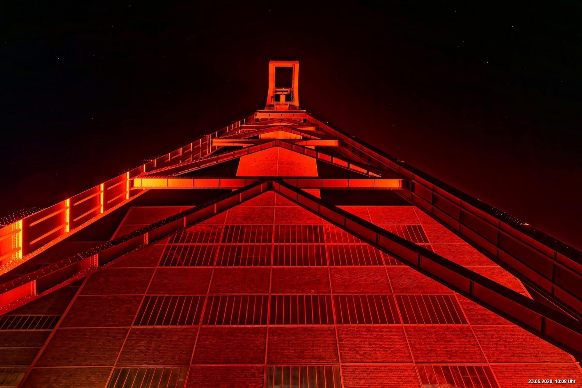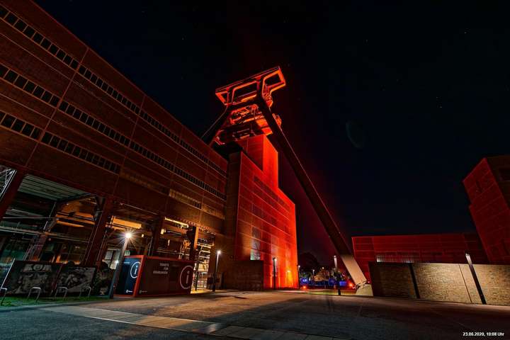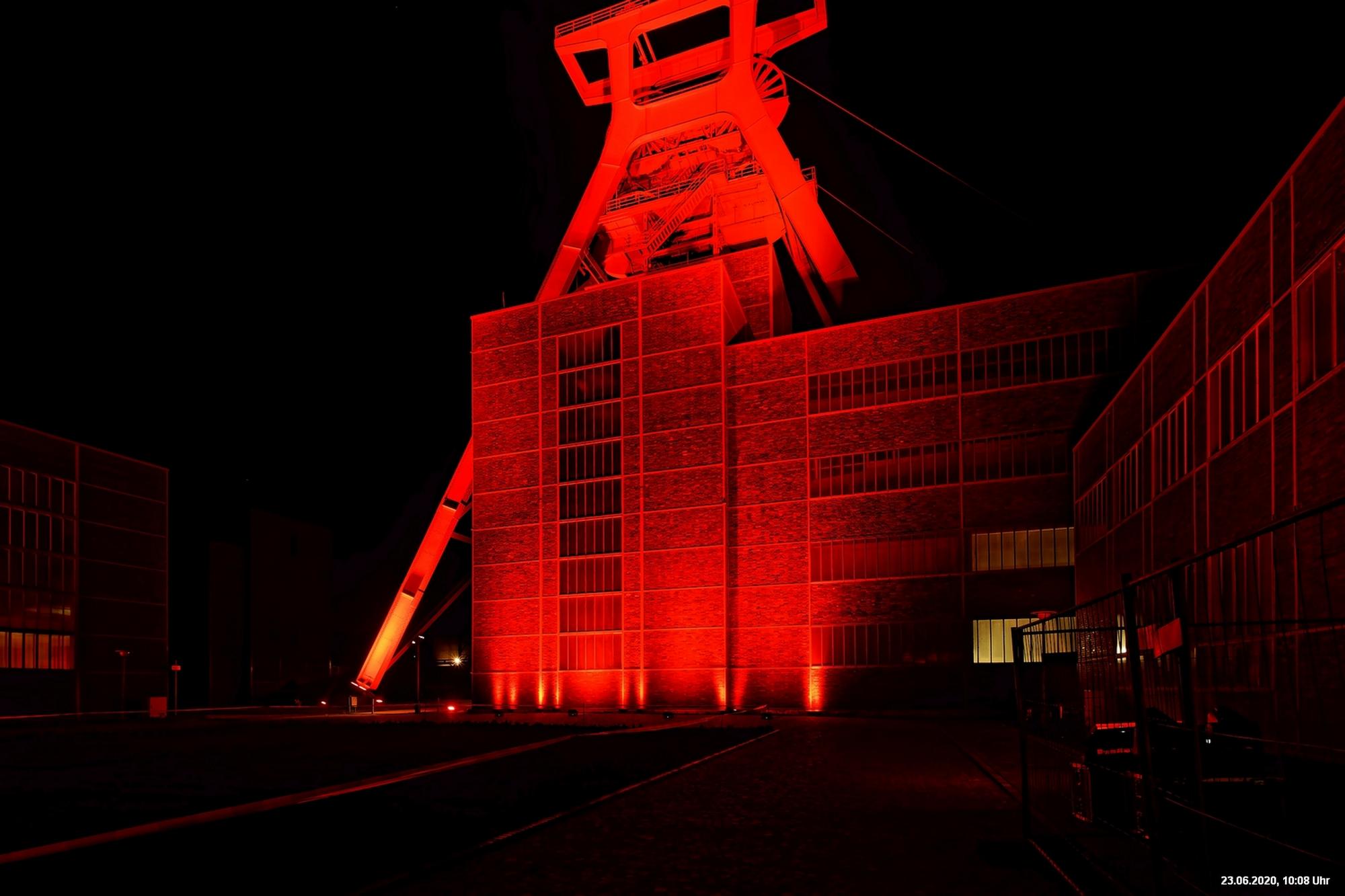 So, das war der offizielle Teil. Es gab nicht wirklich ein Programm und man musste sich über’s Internet orientieren. Also los – Ziele ausgesucht: Oberhausen Turbinenhalle (na ja) + Oberhausen Schloss (war prima gemacht) + Zollverein Essen Sanaa-Haus (eindrucksvoll – im Rhythmus des Herzschlages leuchtete das Licht auf) + Zollverein Essen Förderturm (immer wieder eine Augenweide). Auf Zollverein wurde auch eine digitale Uhr gezeigt mit der Dauer der Arbeitslosigkeit des Installateurs. Danach Rathaus Gladbeck – hab das rote Licht gesucht und nur 2 normale rote Lampen am Eingang gefunden (war nix). Danach war es dann zu spät (etwa 01:30 Uhr). Wollte eigentlich noch zum Theater nach Marl. War aber nicht sicher, ob dort das Licht schon aus war.