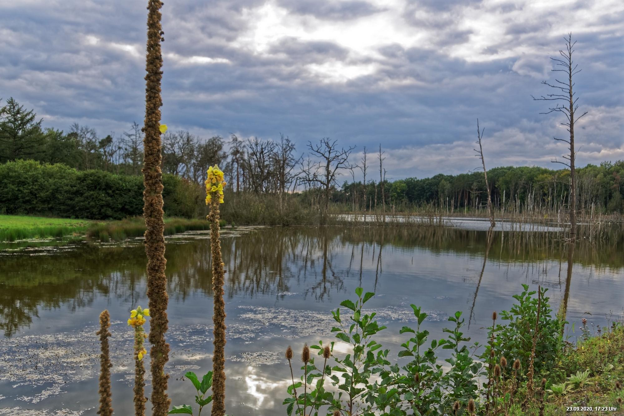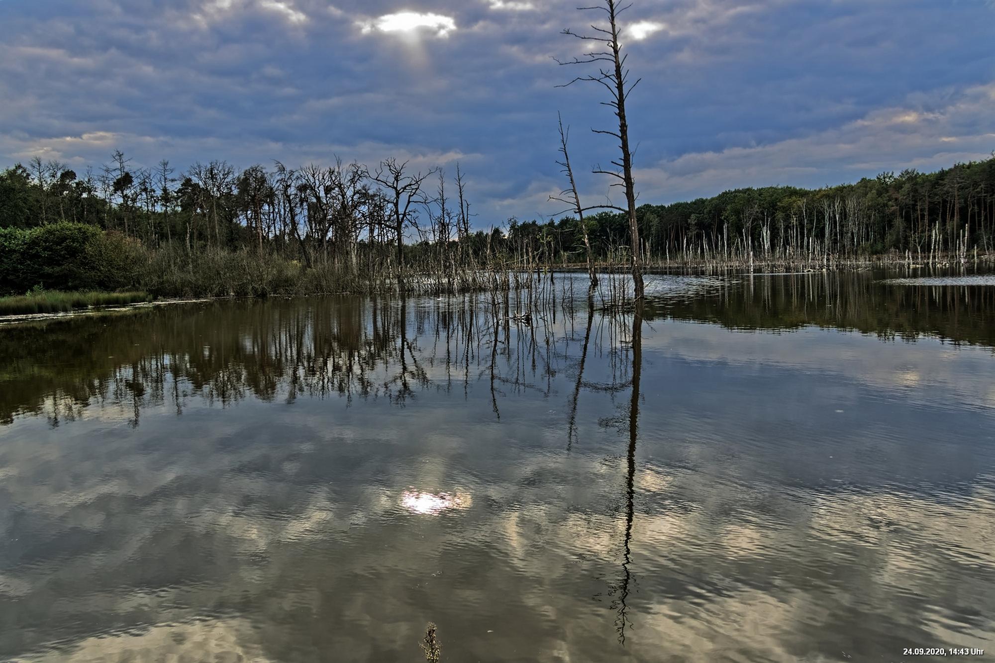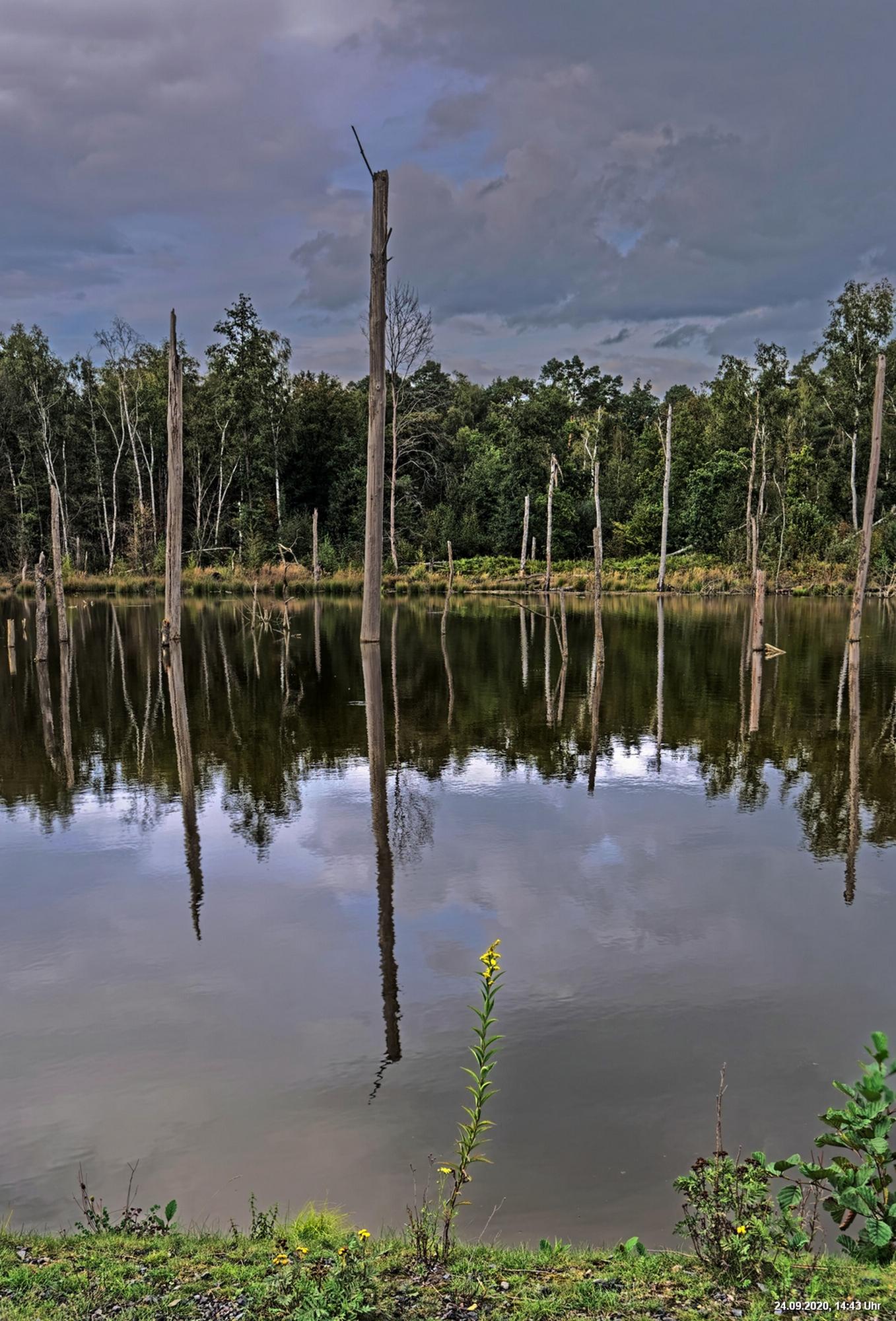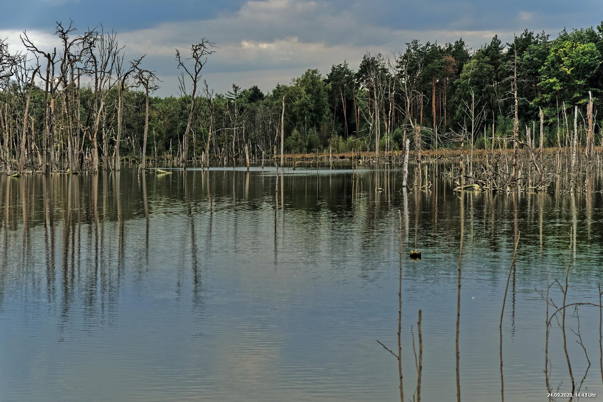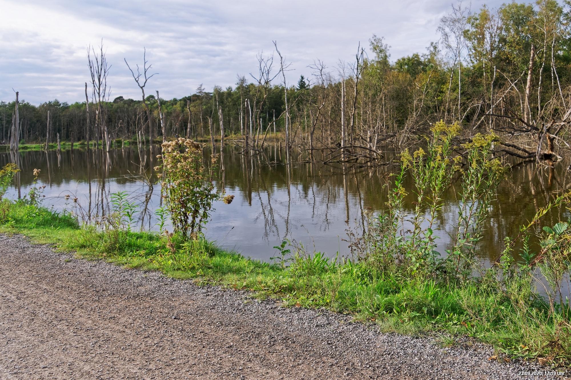 Dichte Wälder, viel Seen und Bäche und viel Natur finden wir wenige km von uns entfernt, also fast direkt vor der Haustür. Man muss allerdings laufen, rund 3,5 km am Heidsee vorbei und entdeckt dann ganz plötzlich eine fremde Welt. Durch Bergsenkungen entstanden hat sich ein See gebildet, in dem Bäume und Sträucher versunken sind. Ein Steg mit einer kleinen Brücke überquert ihn und von dort hat man beste Sicht. Es war später Nachmittag und Regenwolken zogen auf. Das Licht passte zu alten Sagen von Mooren und Gespenstern. Man möchte den Blick gar nicht davon lösen.