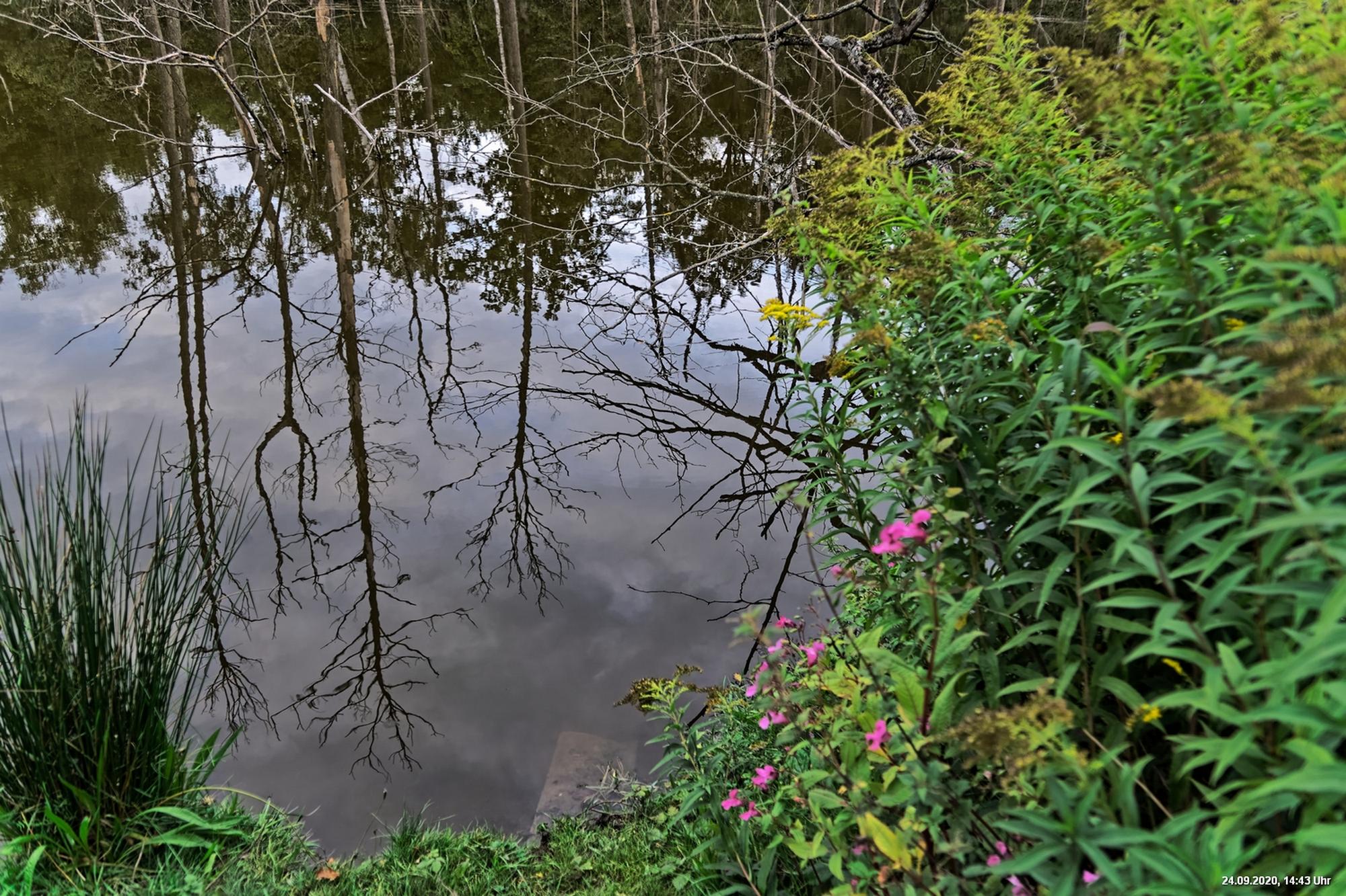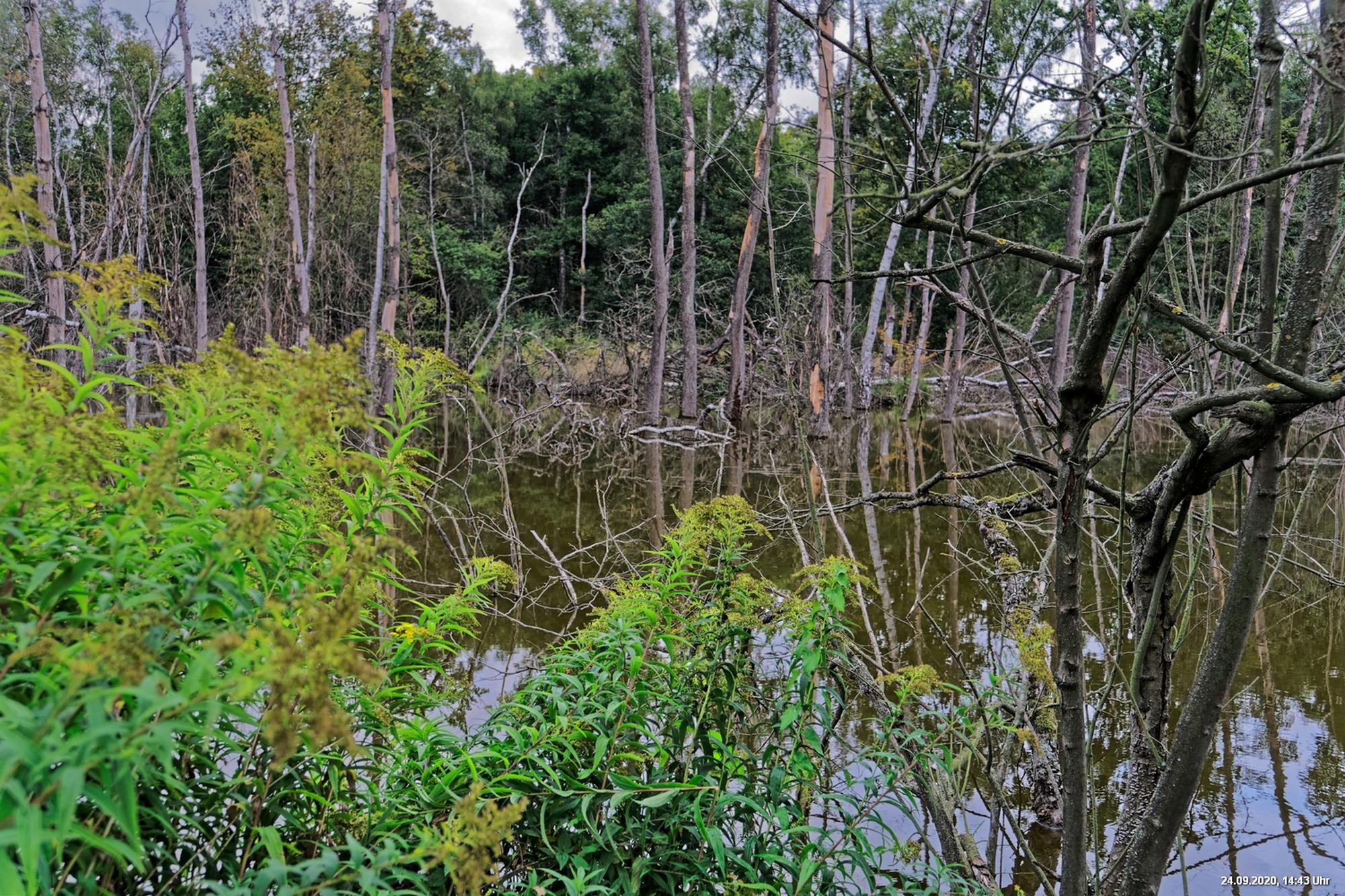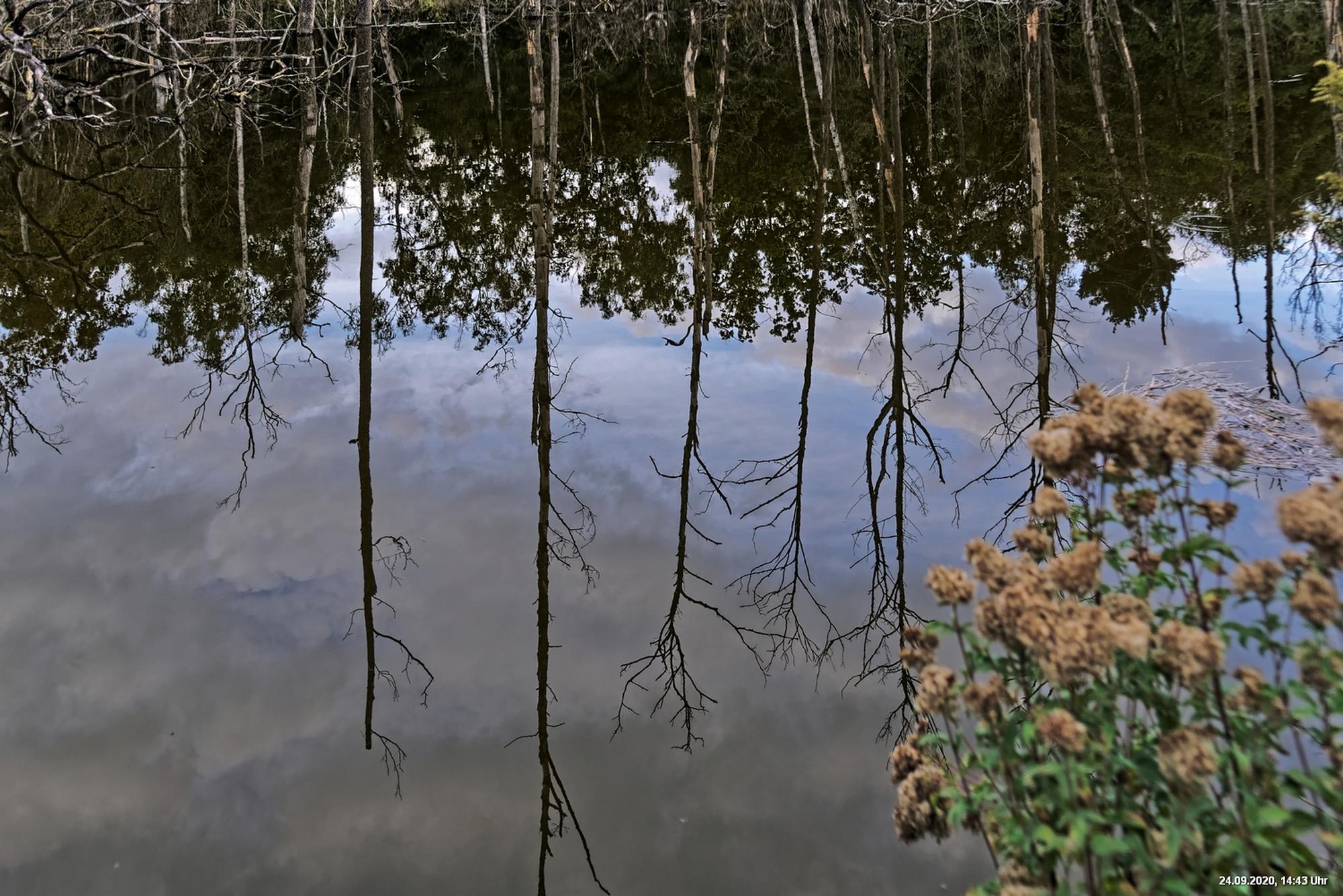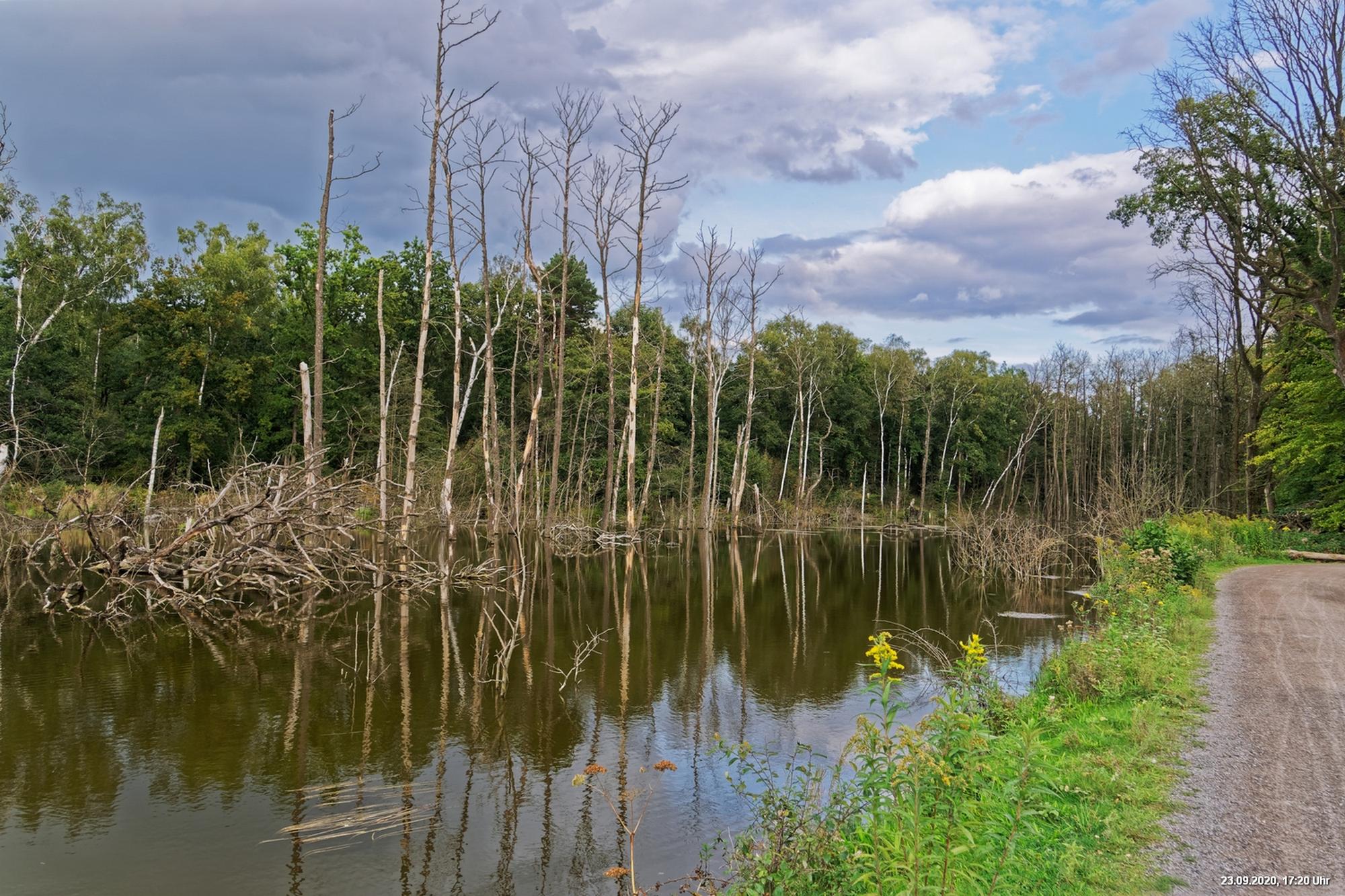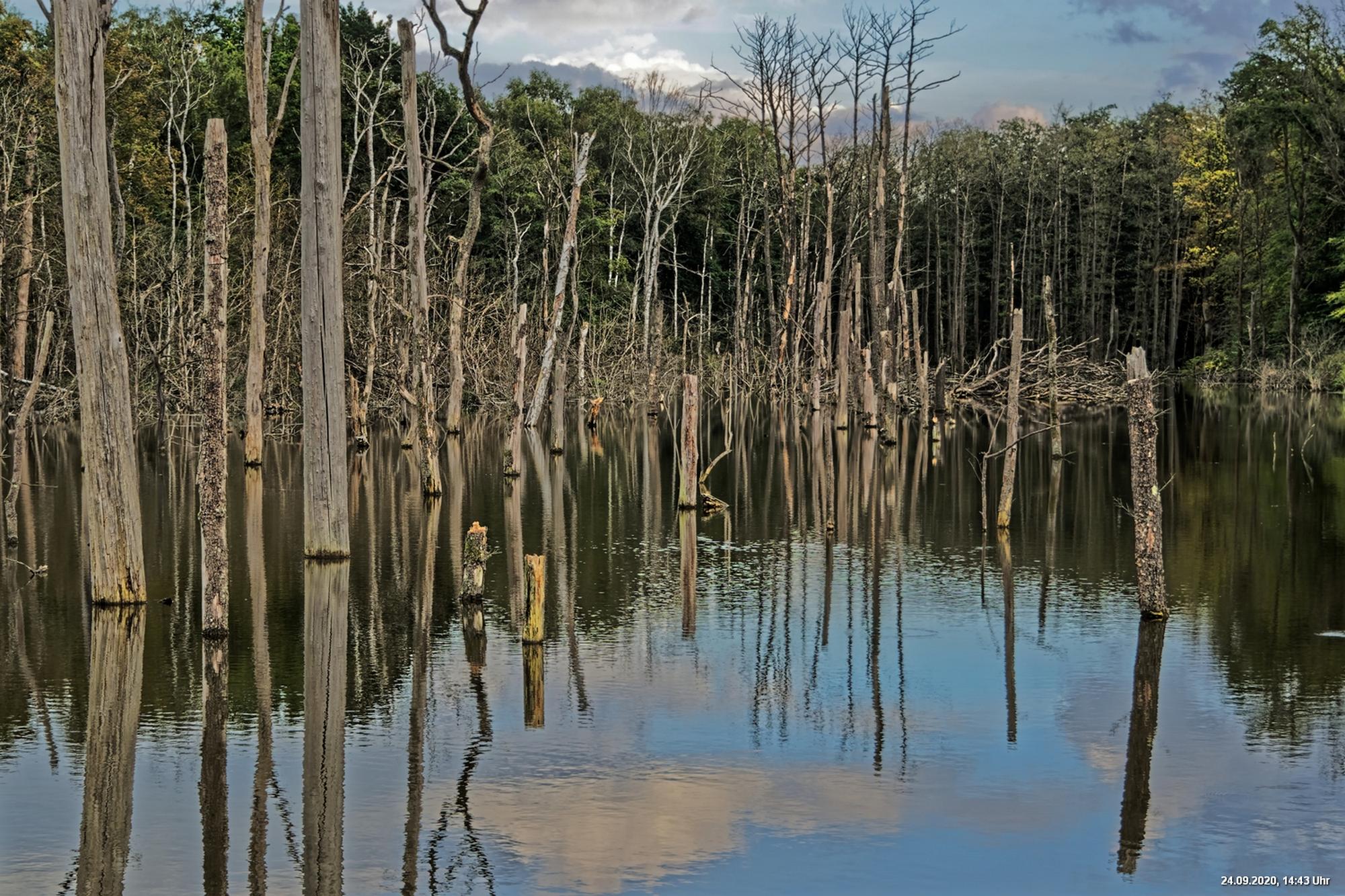 Dichte Wälder, viel Seen und Bäche und viel Natur finden wir wenige km von uns entfernt, also fast direkt vor der Haustür. Man muss allerdings laufen, rund 3,5 km am Heidsee vorbei und entdeckt dann ganz plötzlich eine fremde Welt. Durch Bergsenkungen entstanden hat sich ein See gebildet, in dem Bäume und Sträucher versunken sind. Ein Steg mit einer kleinen Brücke überquert ihn und von dort hat man beste Sicht. Es war später Nachmittag und Regenwolken zogen auf. Das Licht passte zu alten Sagen von Mooren und Gespenstern. Man möchte den Blick gar nicht davon lösen.