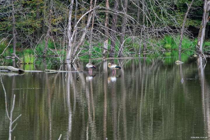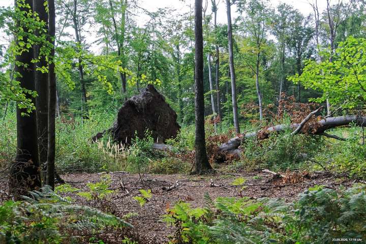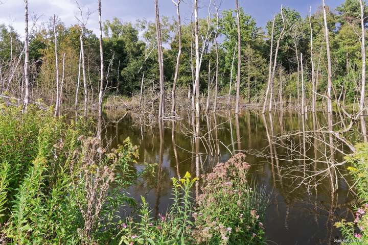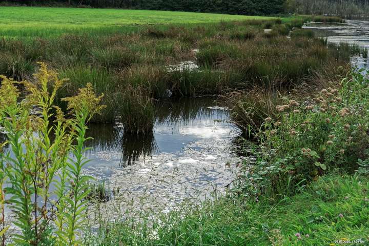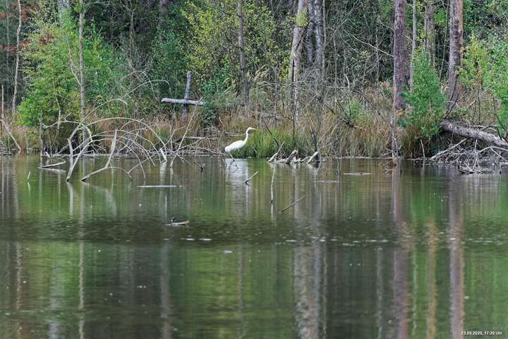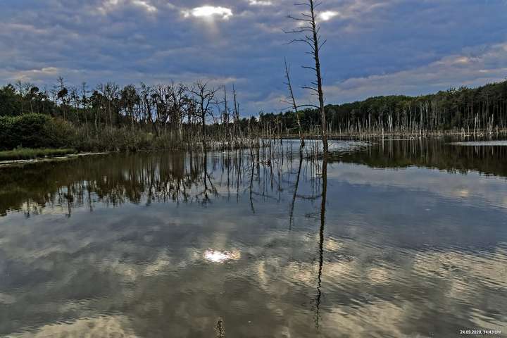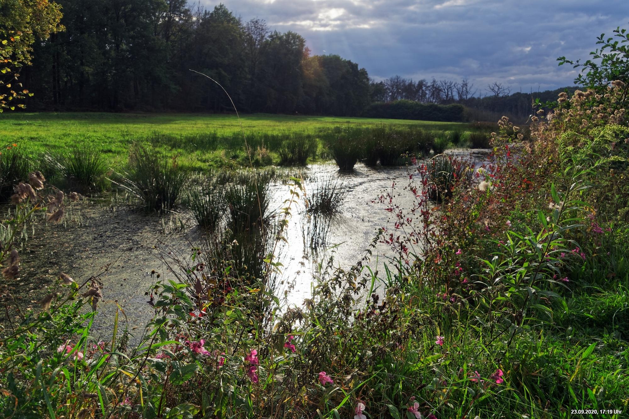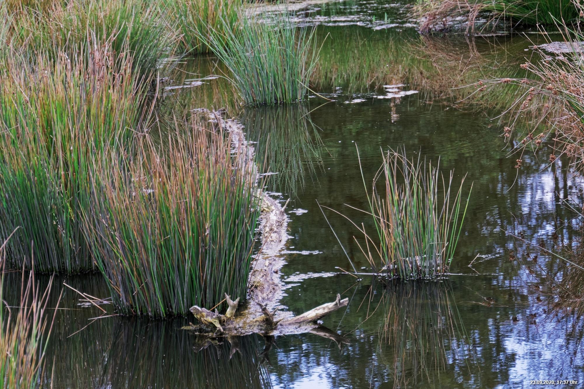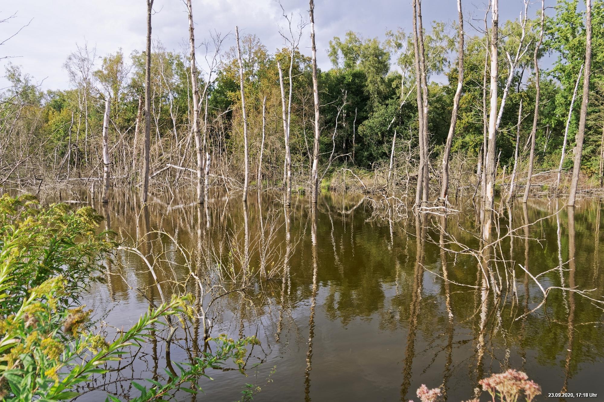 Dichte Wälder, viel Seen und Bäche und viel Natur finden wir wenige km von uns entfernt, also fast direkt vor der Haustür. Man muss allerdings laufen, rund 3,5 km am Heidsee vorbei und entdeckt dann ganz plötzlich eine fremde Welt. Durch Bergsenkungen entstanden hat sich ein See gebildet, in dem Bäume und Sträucher versunken sind. Ein Steg mit einer kleinen Brücke überquert ihn und von dort hat man beste Sicht. Es war später Nachmittag und Regenwolken zogen auf. Das Licht passte zu alten Sagen von Mooren und Gespenstern. Man möchte den Blick gar nicht davon lösen.