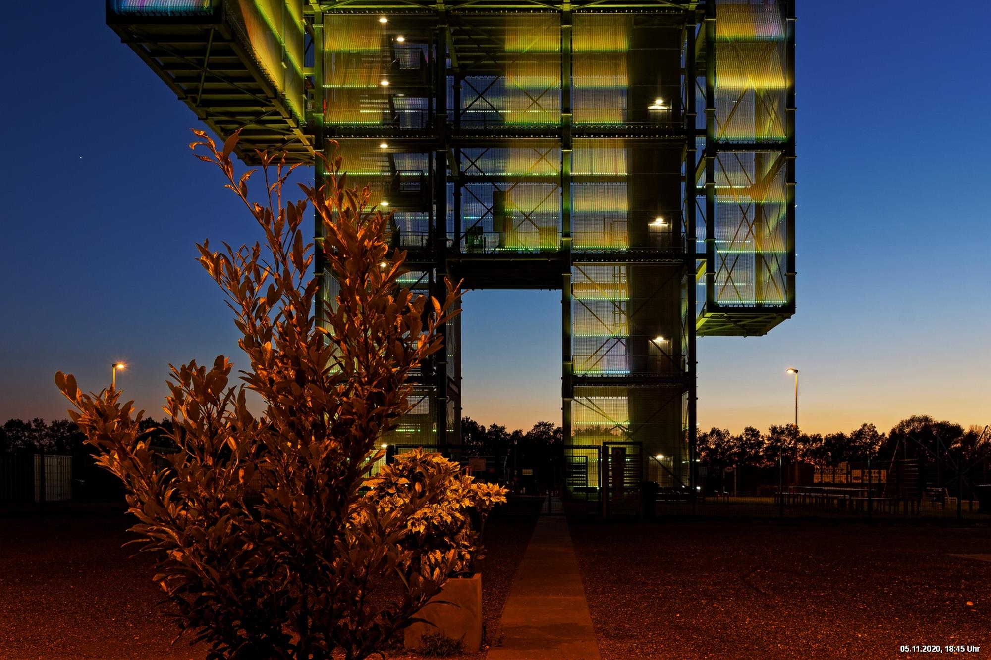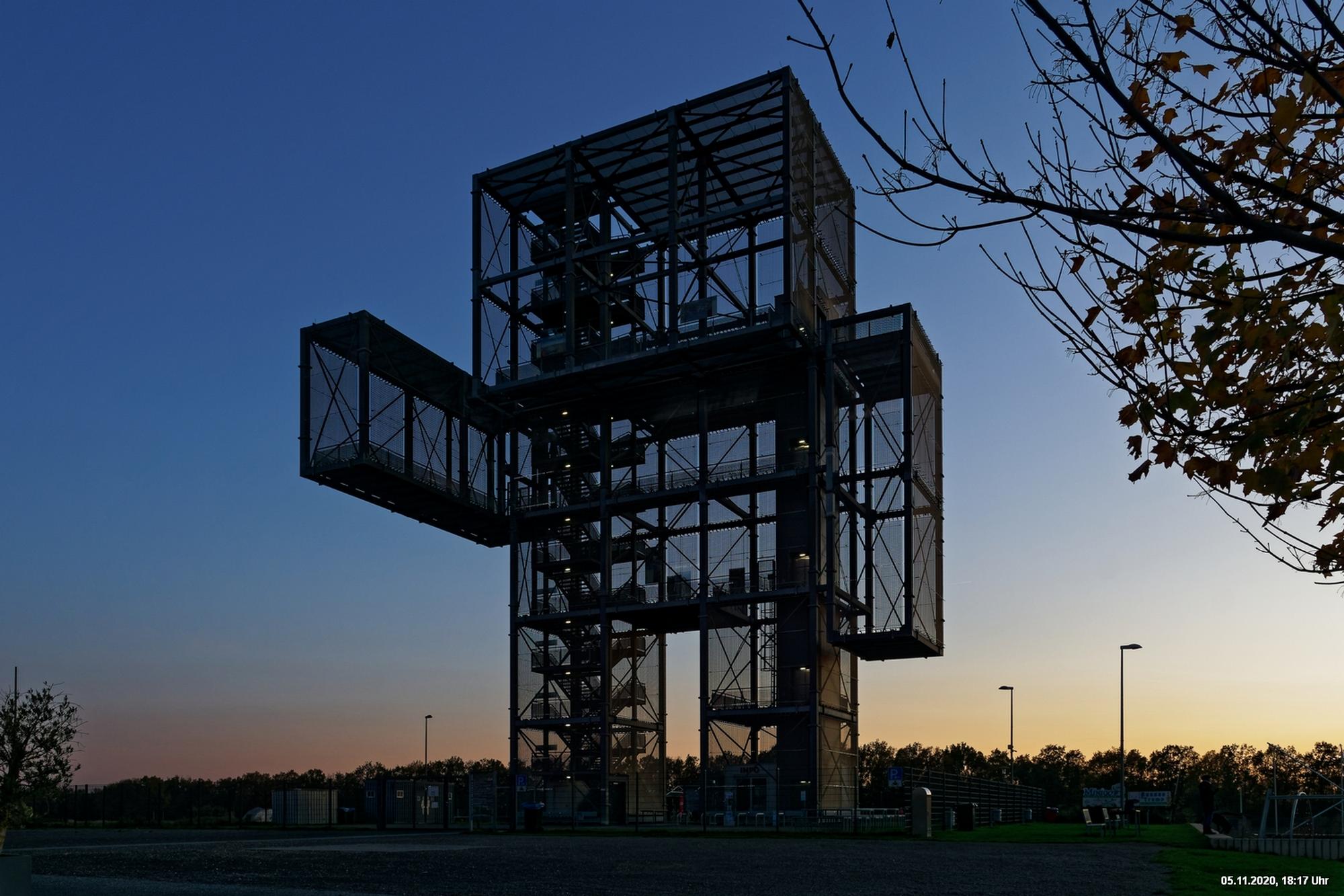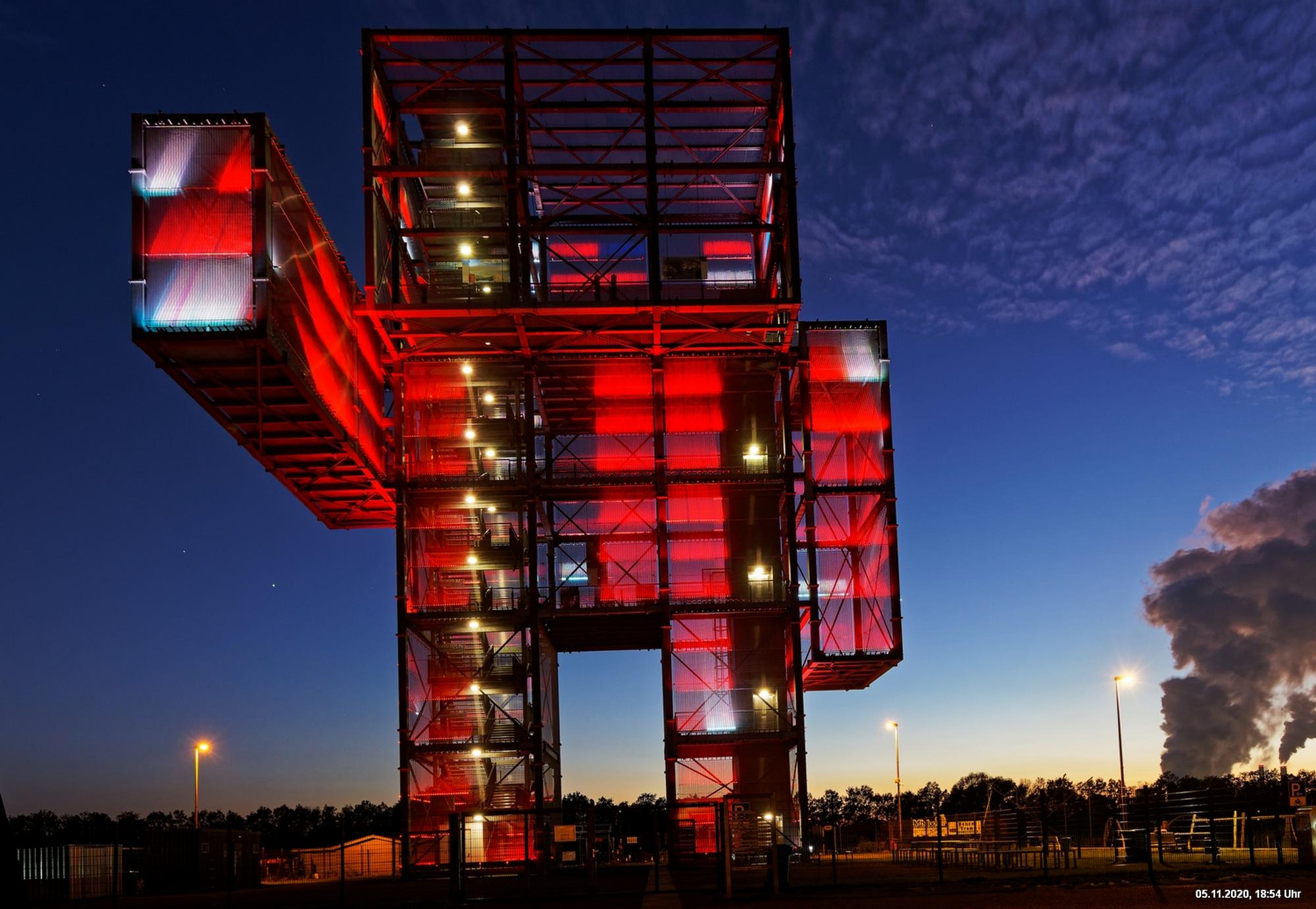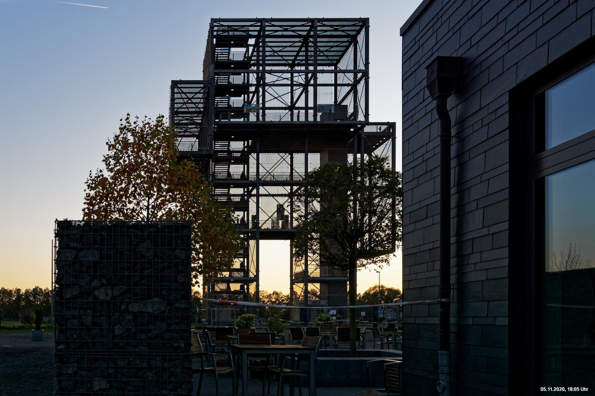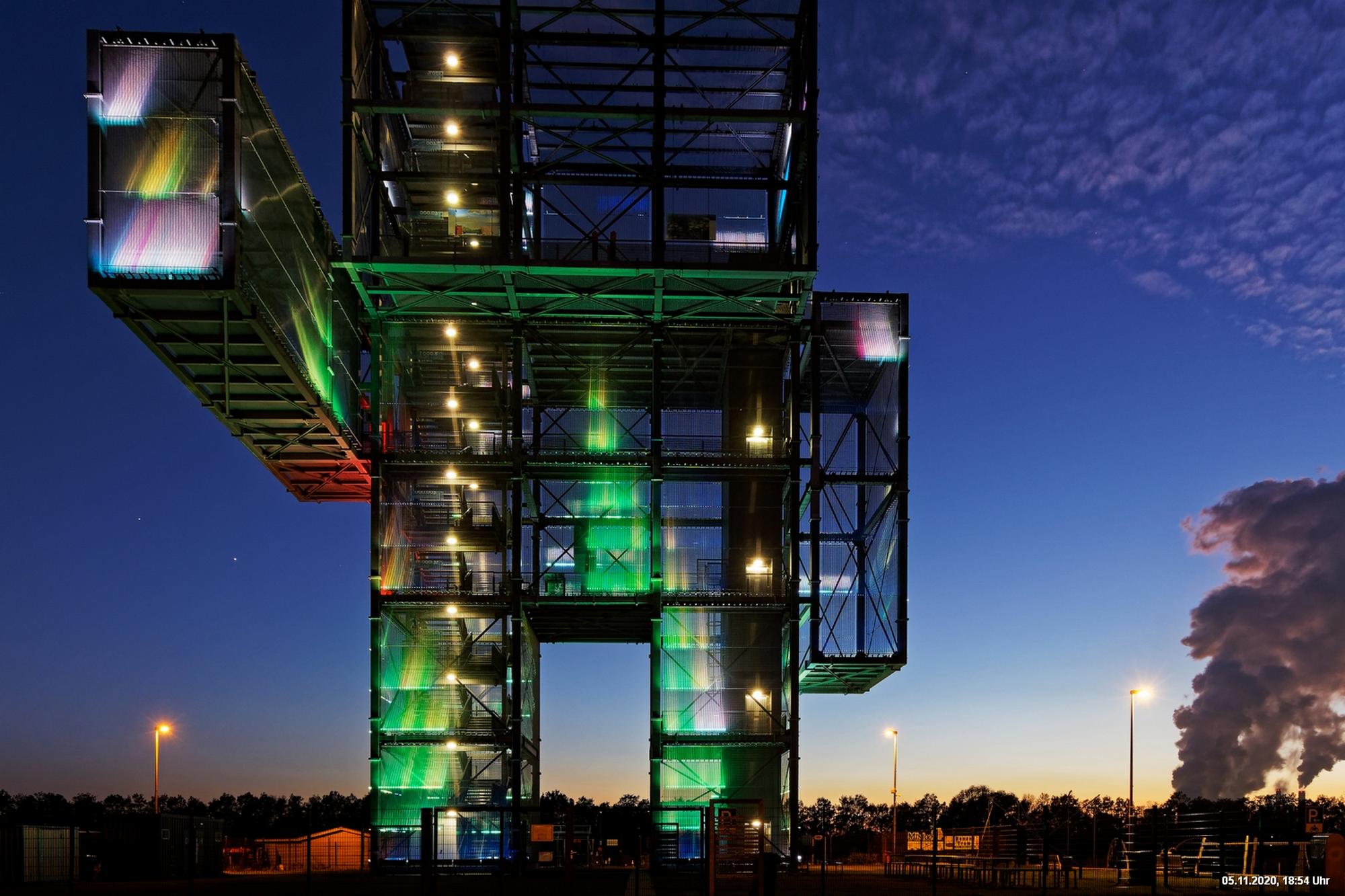 Man könnte glauben, sein Arm zeigt mahnend in Richtung des Tagebaus (die Richtung stimmt auch). Seine moderne Architektur steht für die technische Zukunft der Region. Die Konstruktion beeindruckt und wird nachts durch 40.000 LED’s illuminiert. Aufgrund der Corona-Beschränkungen war der Turm diesmal nicht zugänglich (verständlich, aber leider nirgendwo angekündigt). Es blieb aber das ruhige Lichtspiel ohne Kulisse (ab etwa 18:00 Uhr war es völlig leer dort auf dem großen Gelände) und konnte in Ruhe beobachtet werden. Anschließend noch ein kleiner Abstecher zum Tagebau Inden. Allerdings waren die Förderbagger leider relativ weit weg.