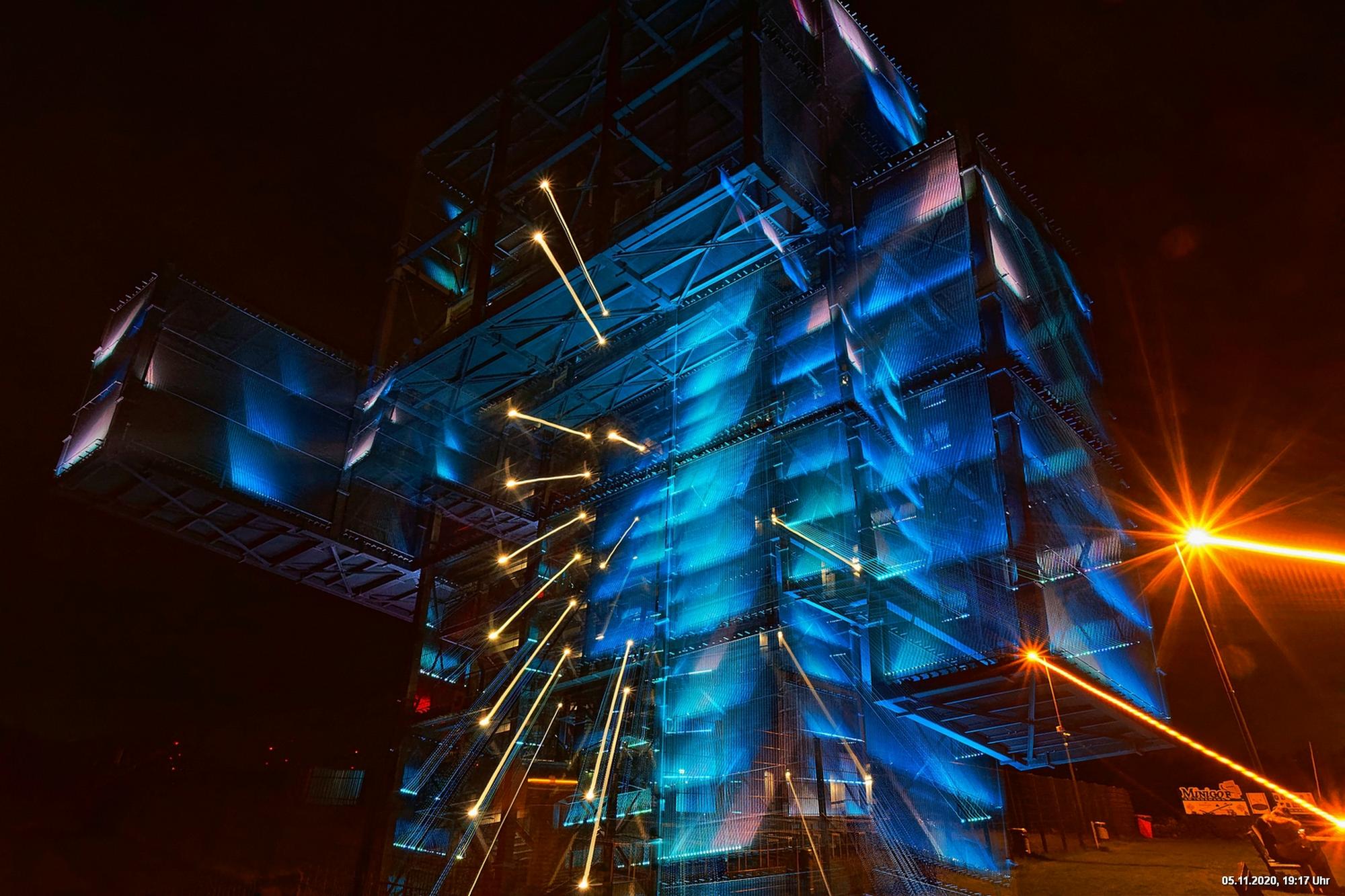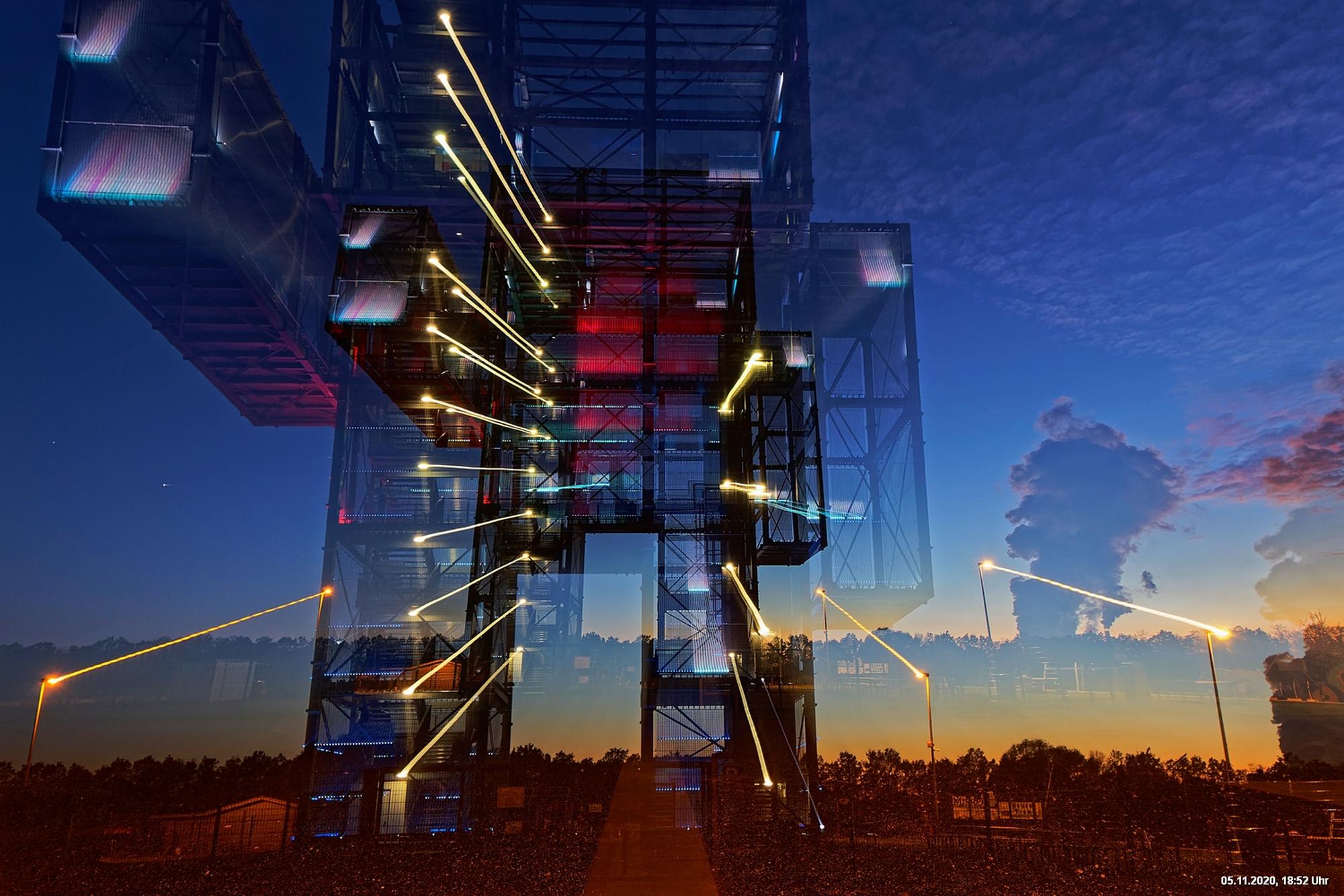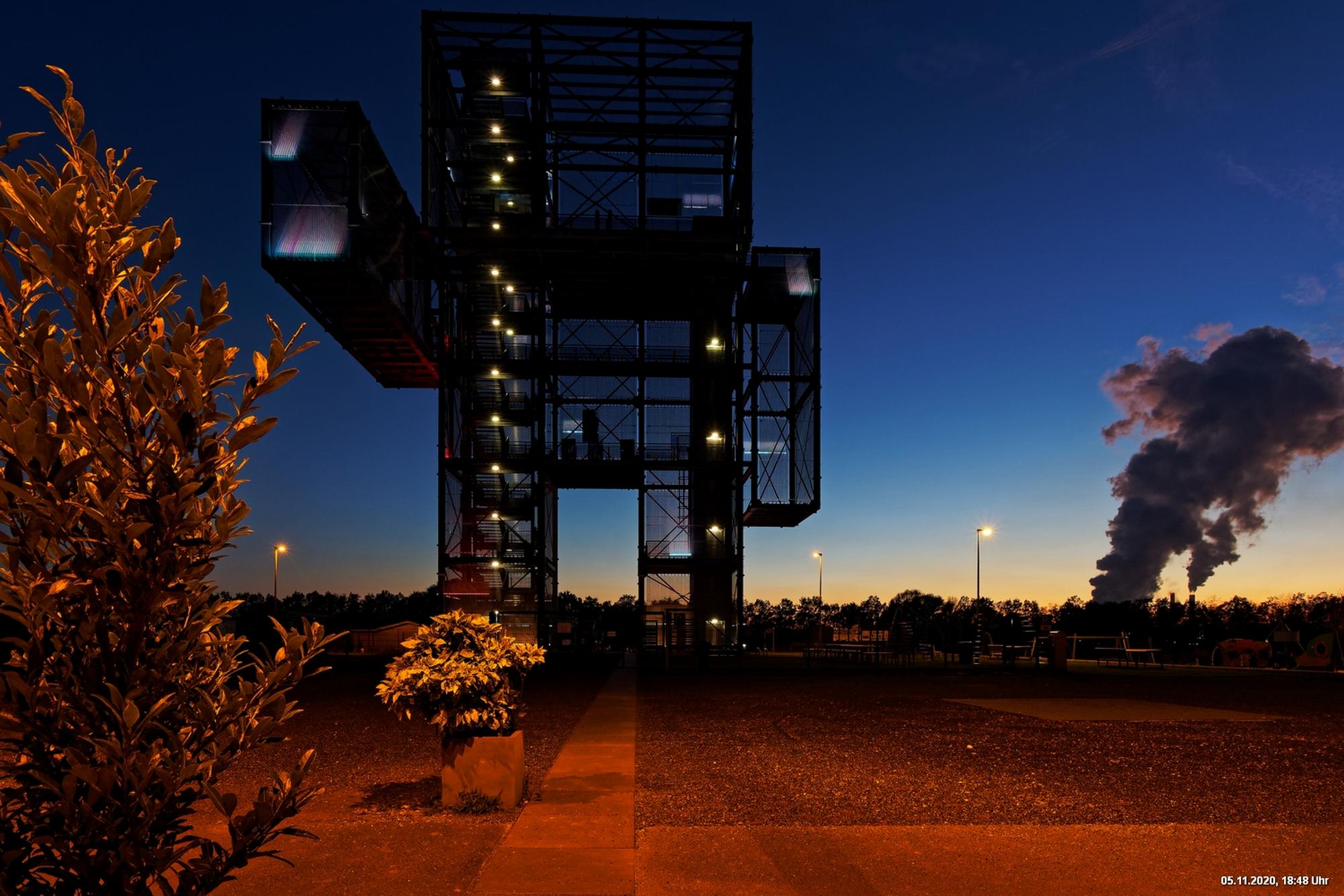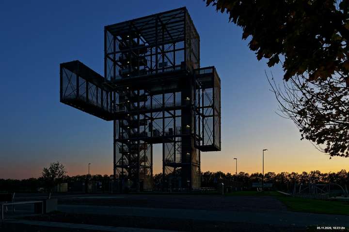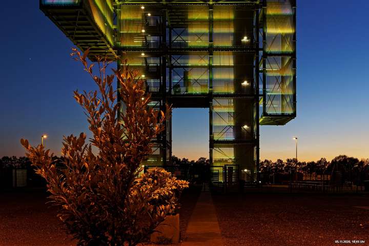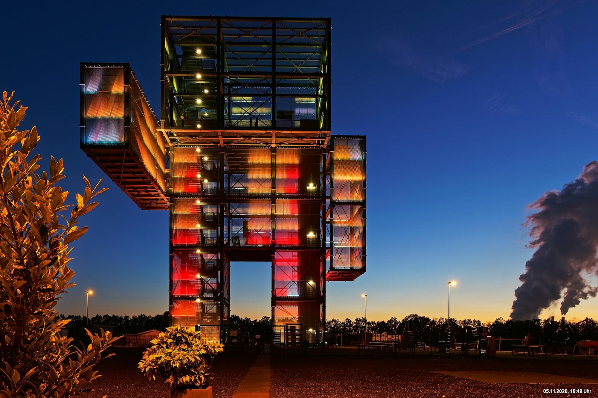 Man könnte glauben, sein Arm zeigt mahnend in Richtung des Tagebaus (die Richtung stimmt auch). Seine moderne Architektur steht für die technische Zukunft der Region. Die Konstruktion beeindruckt und wird nachts durch 40.000 LED’s illuminiert. Aufgrund der Corona-Beschränkungen war der Turm diesmal nicht zugänglich (verständlich, aber leider nirgendwo angekündigt). Es blieb aber das ruhige Lichtspiel ohne Kulisse (ab etwa 18:00 Uhr war es völlig leer dort auf dem großen Gelände) und konnte in Ruhe beobachtet werden. Anschließend noch ein kleiner Abstecher zum Tagebau Inden. Allerdings waren die Förderbagger leider relativ weit weg.