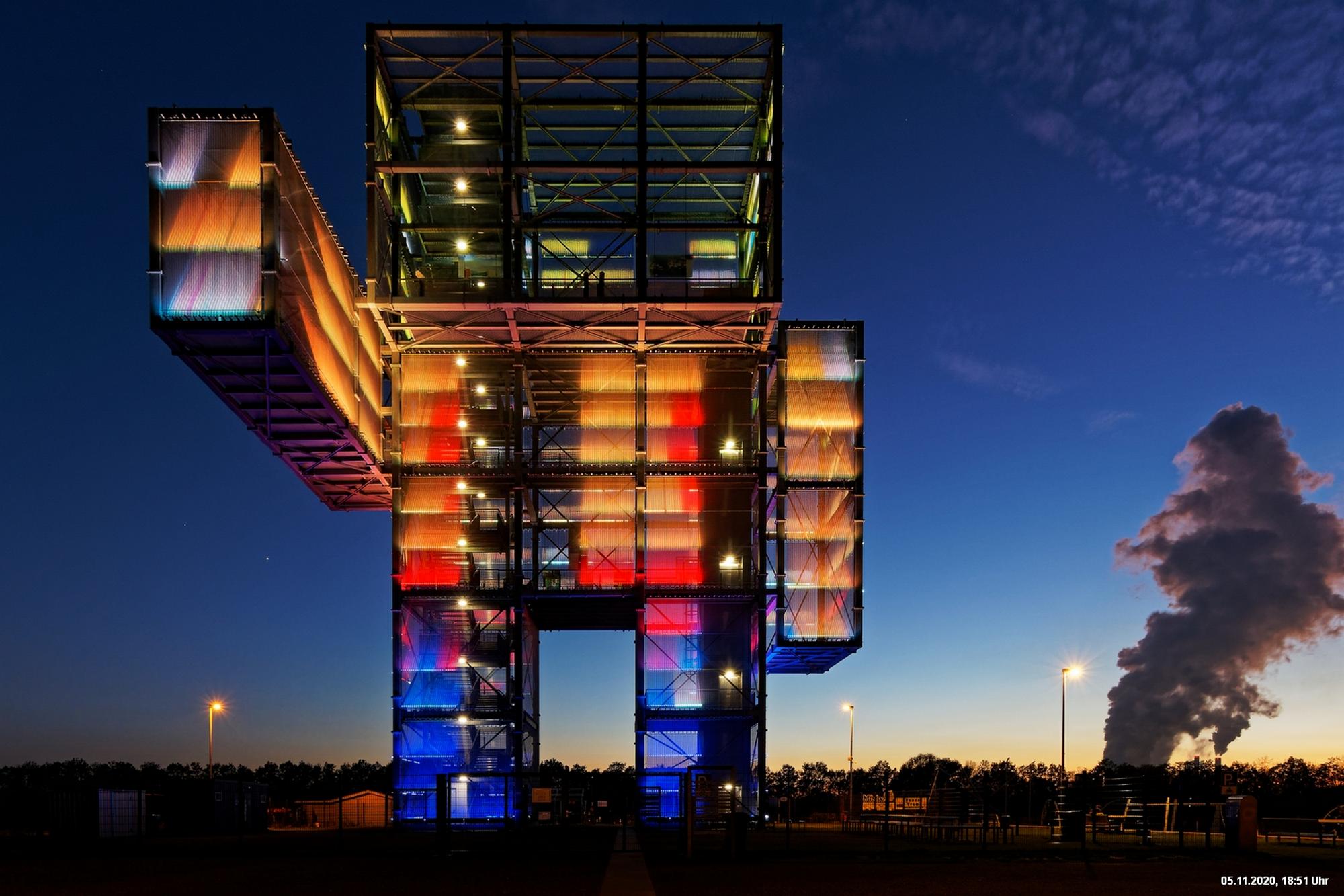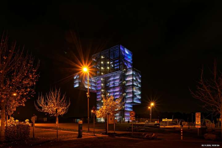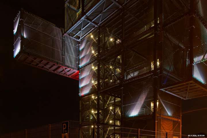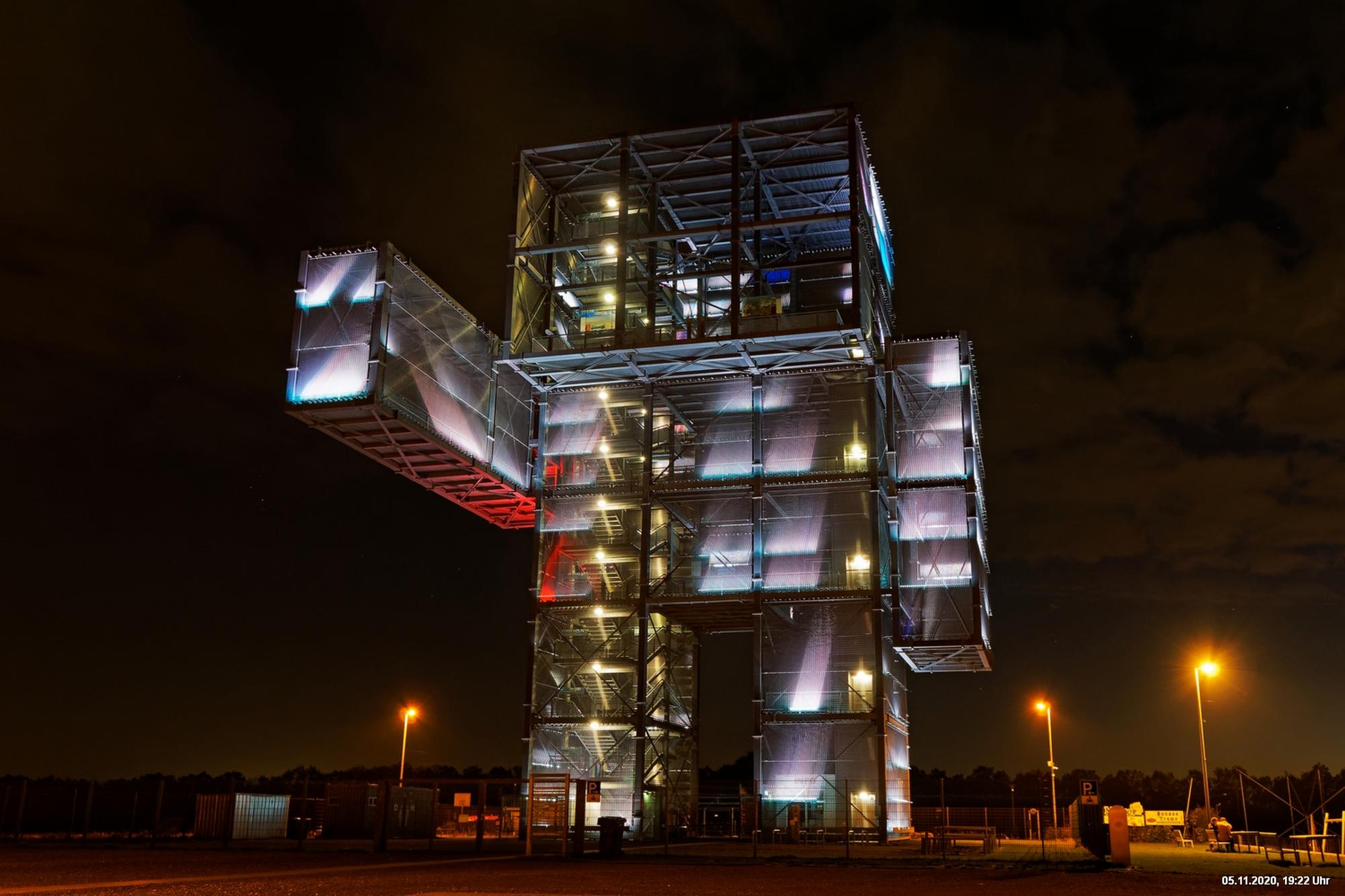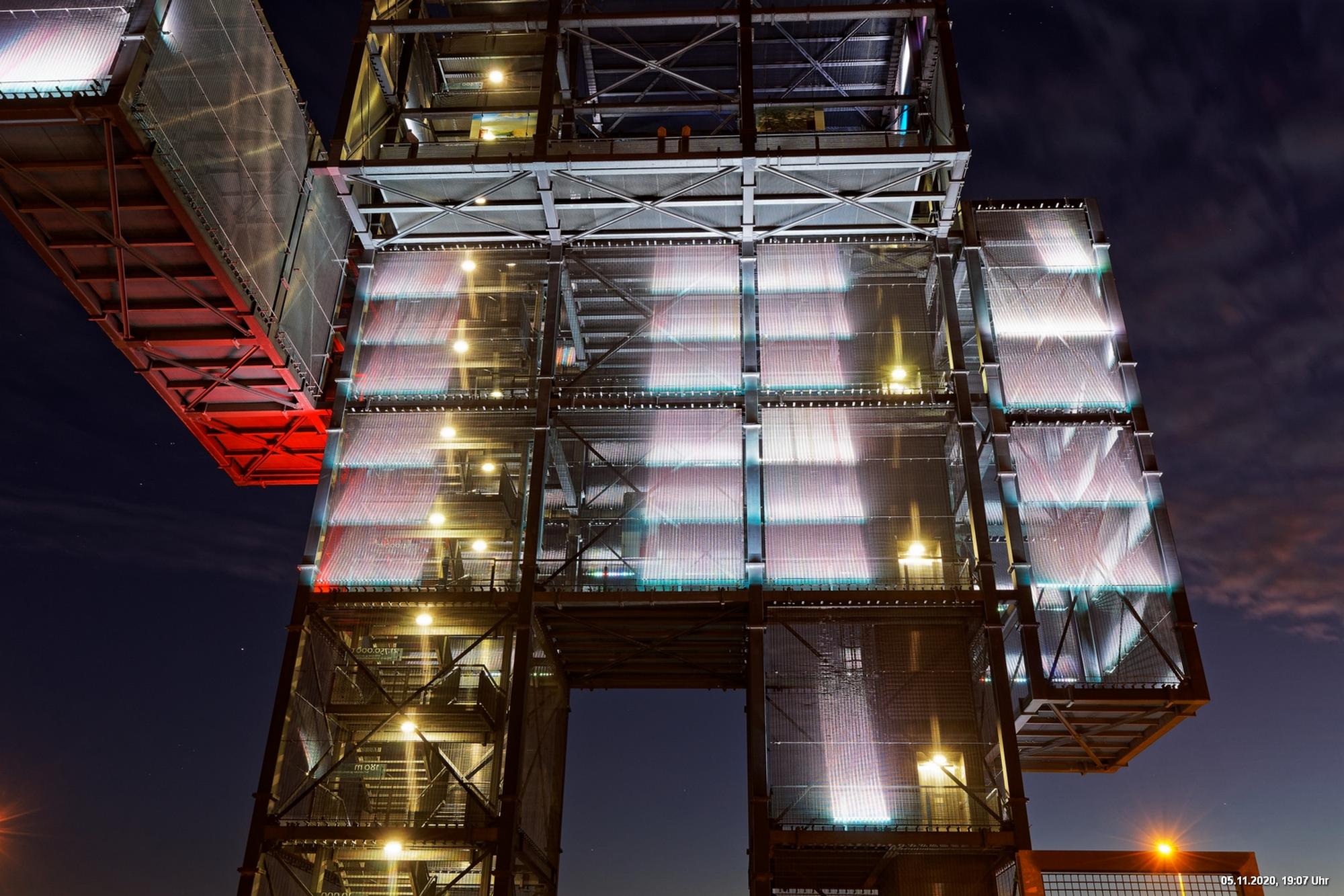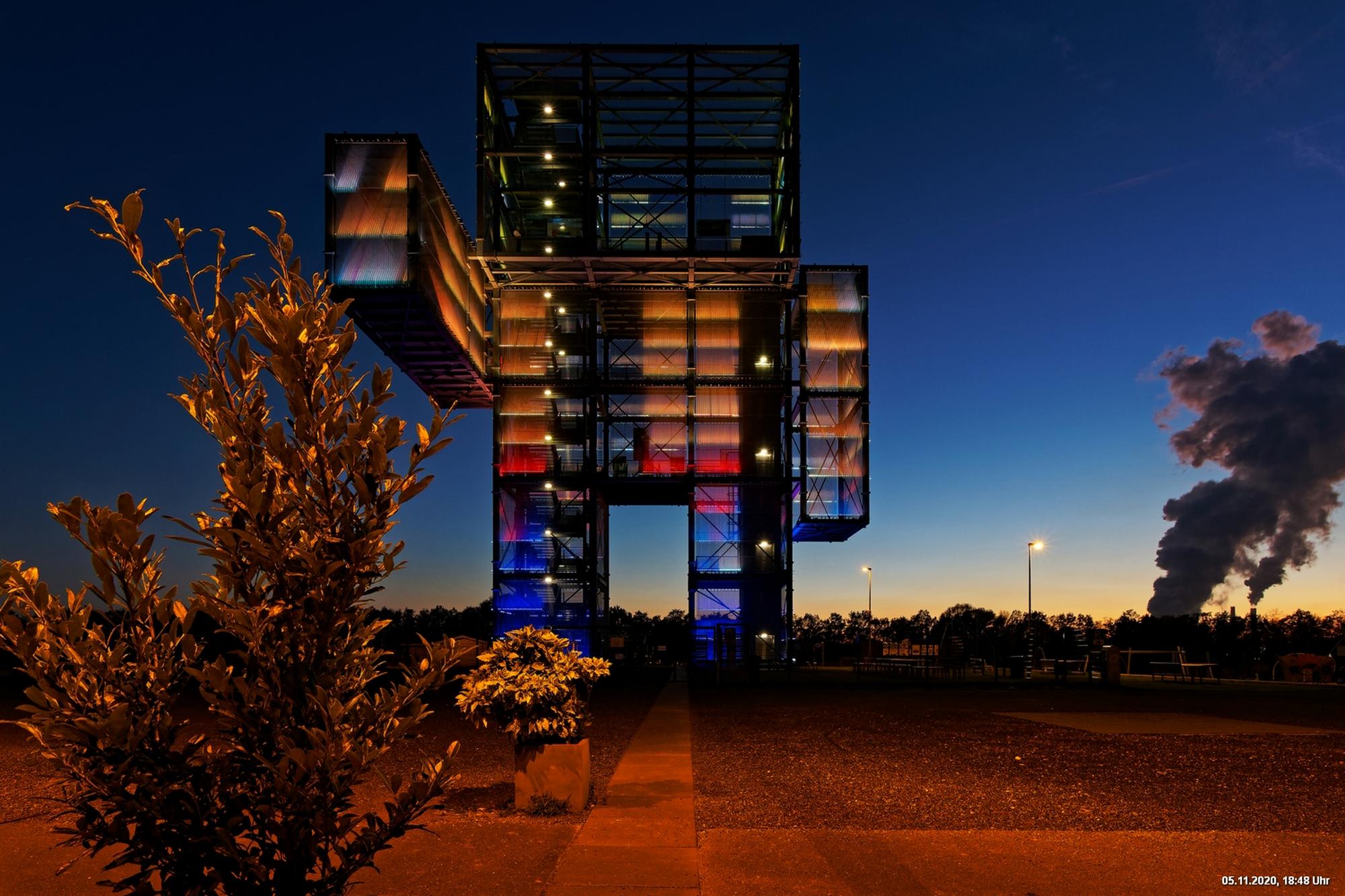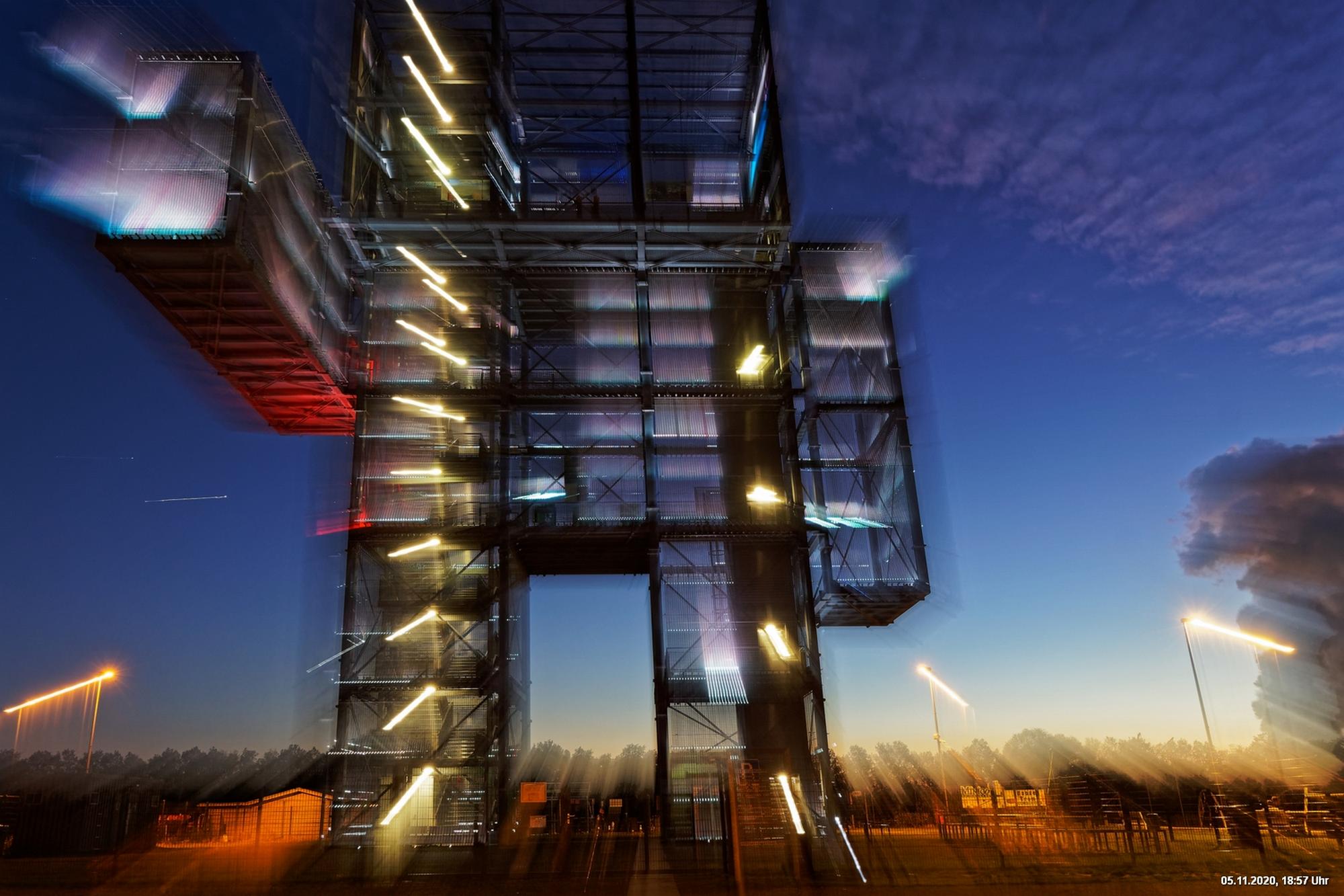 Man könnte glauben, sein Arm zeigt mahnend in Richtung des Tagebaus (die Richtung stimmt auch). Seine moderne Architektur steht für die technische Zukunft der Region. Die Konstruktion beeindruckt und wird nachts durch 40.000 LED’s illuminiert. Aufgrund der Corona-Beschränkungen war der Turm diesmal nicht zugänglich (verständlich, aber leider nirgendwo angekündigt). Es blieb aber das ruhige Lichtspiel ohne Kulisse (ab etwa 18:00 Uhr war es völlig leer dort auf dem großen Gelände) und konnte in Ruhe beobachtet werden. Anschließend noch ein kleiner Abstecher zum Tagebau Inden. Allerdings waren die Förderbagger leider relativ weit weg.