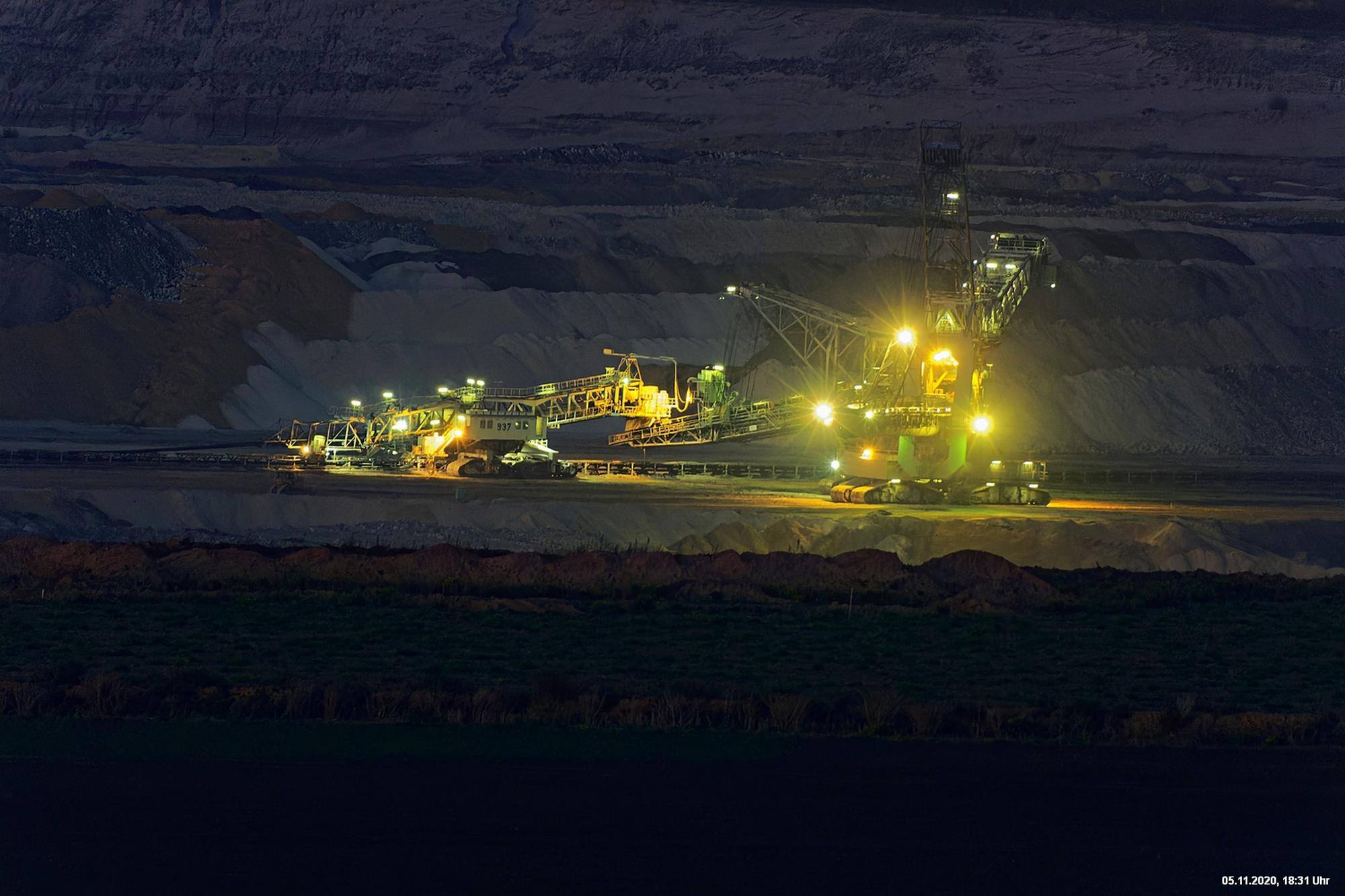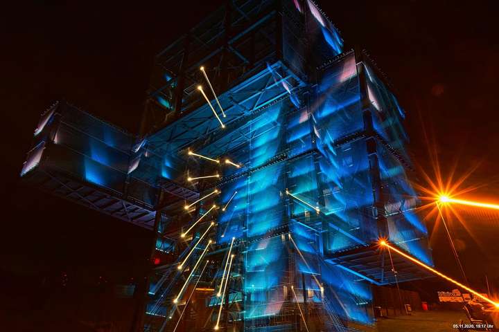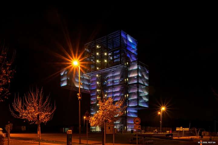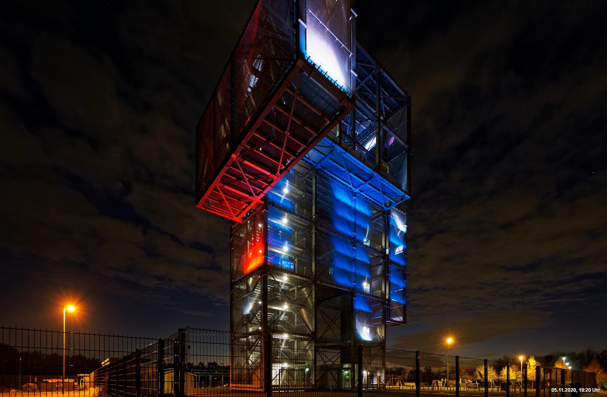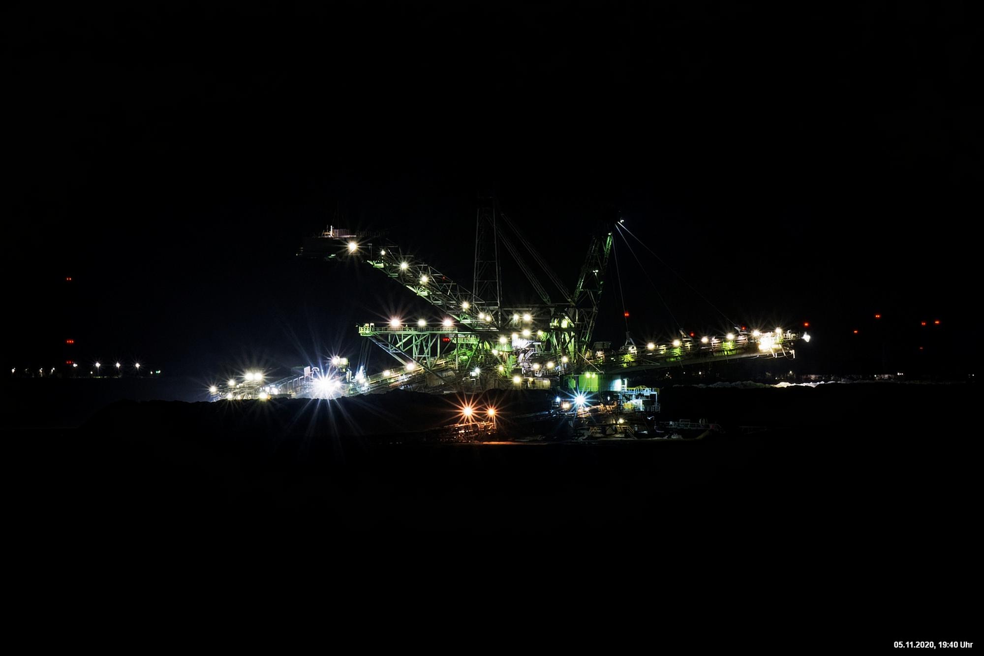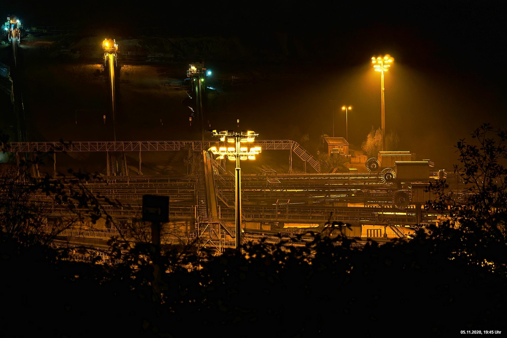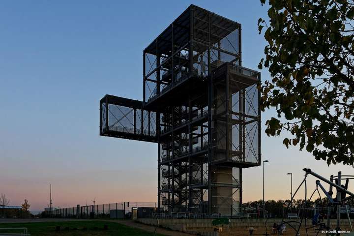 Man könnte glauben, sein Arm zeigt mahnend in Richtung des Tagebaus (die Richtung stimmt auch). Seine moderne Architektur steht für die technische Zukunft der Region. Die Konstruktion beeindruckt und wird nachts durch 40.000 LED’s illuminiert. Aufgrund der Corona-Beschränkungen war der Turm diesmal nicht zugänglich (verständlich, aber leider nirgendwo angekündigt). Es blieb aber das ruhige Lichtspiel ohne Kulisse (ab etwa 18:00 Uhr war es völlig leer dort auf dem großen Gelände) und konnte in Ruhe beobachtet werden. Anschließend noch ein kleiner Abstecher zum Tagebau Inden. Allerdings waren die Förderbagger leider relativ weit weg.