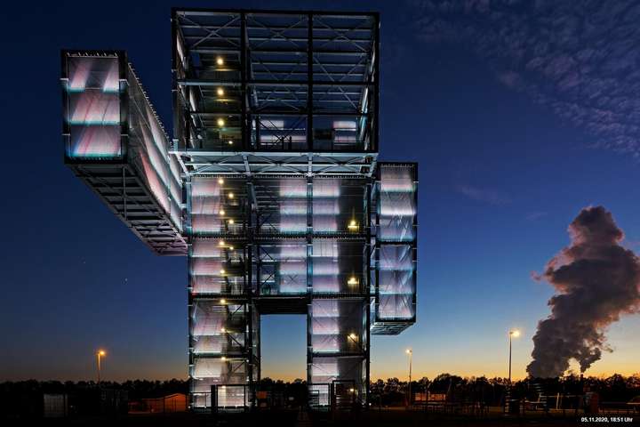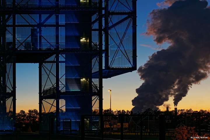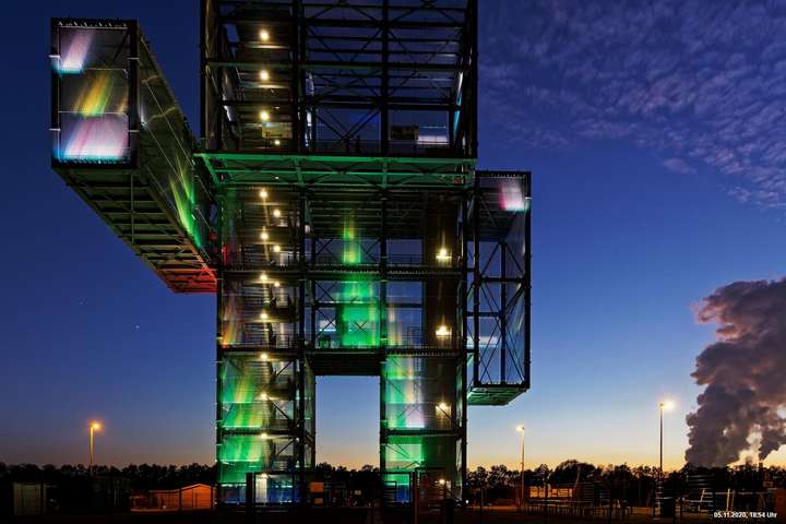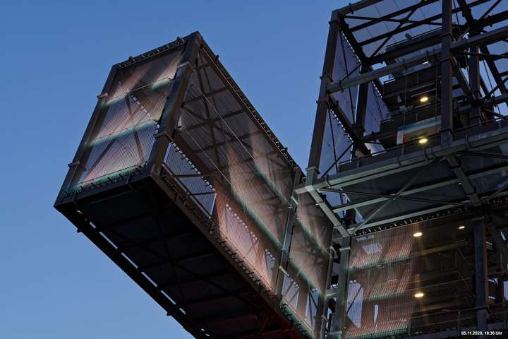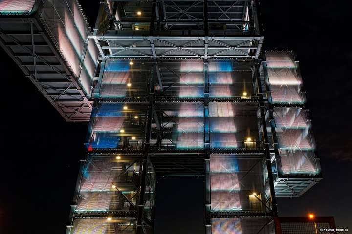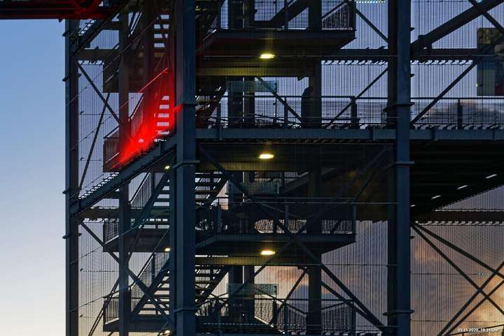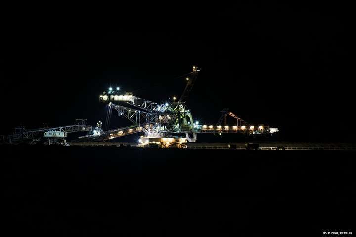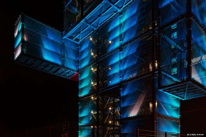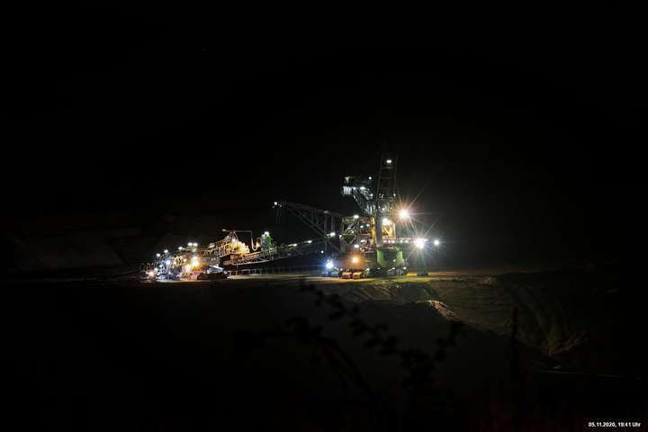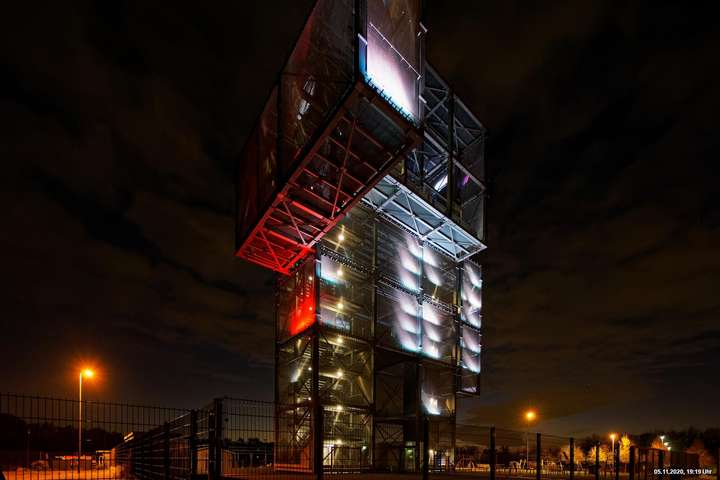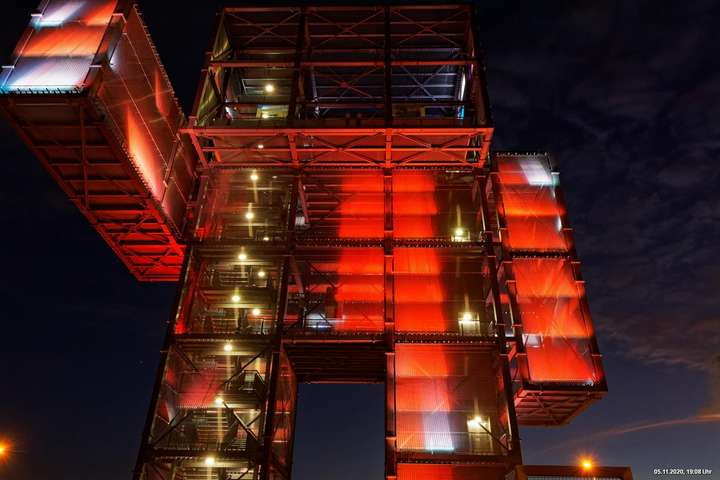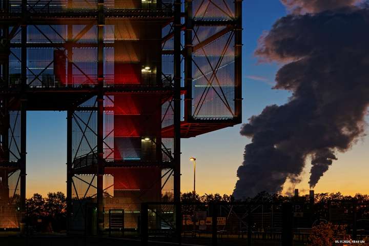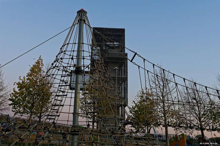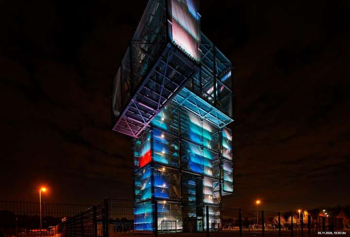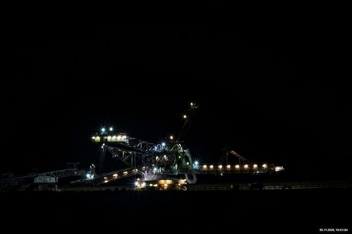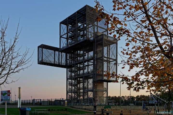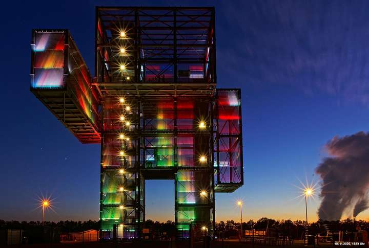 Man könnte glauben, sein Arm zeigt mahnend in Richtung des Tagebaus (die Richtung stimmt auch). Seine moderne Architektur steht für die technische Zukunft der Region. Die Konstruktion beeindruckt und wird nachts durch 40.000 LED’s illuminiert. Aufgrund der Corona-Beschränkungen war der Turm diesmal nicht zugänglich (verständlich, aber leider nirgendwo angekündigt). Es blieb aber das ruhige Lichtspiel ohne Kulisse (ab etwa 18:00 Uhr war es völlig leer dort auf dem großen Gelände) und konnte in Ruhe beobachtet werden. Anschließend noch ein kleiner Abstecher zum Tagebau Inden. Allerdings waren die Förderbagger leider relativ weit weg.