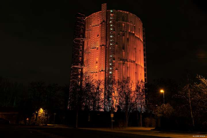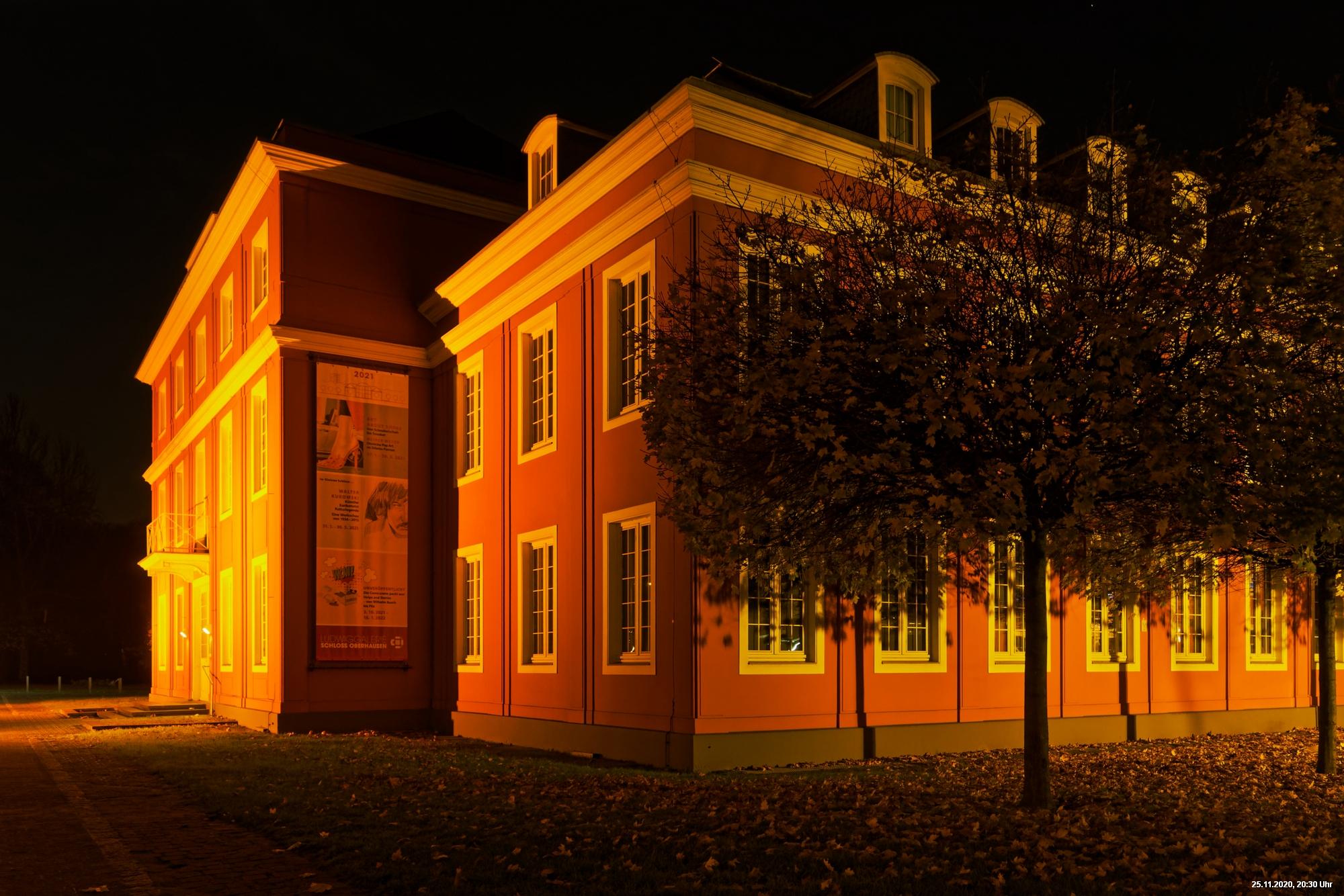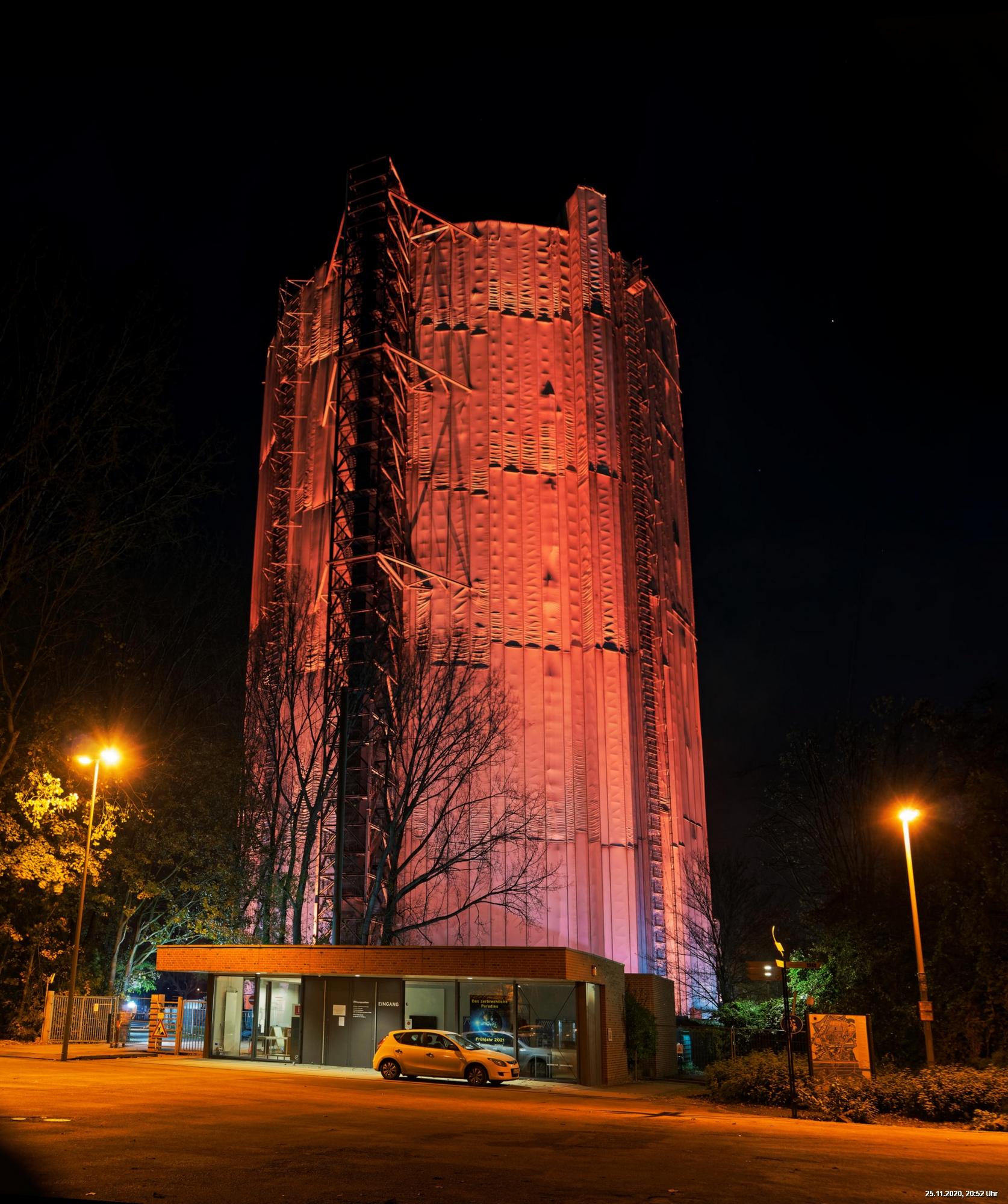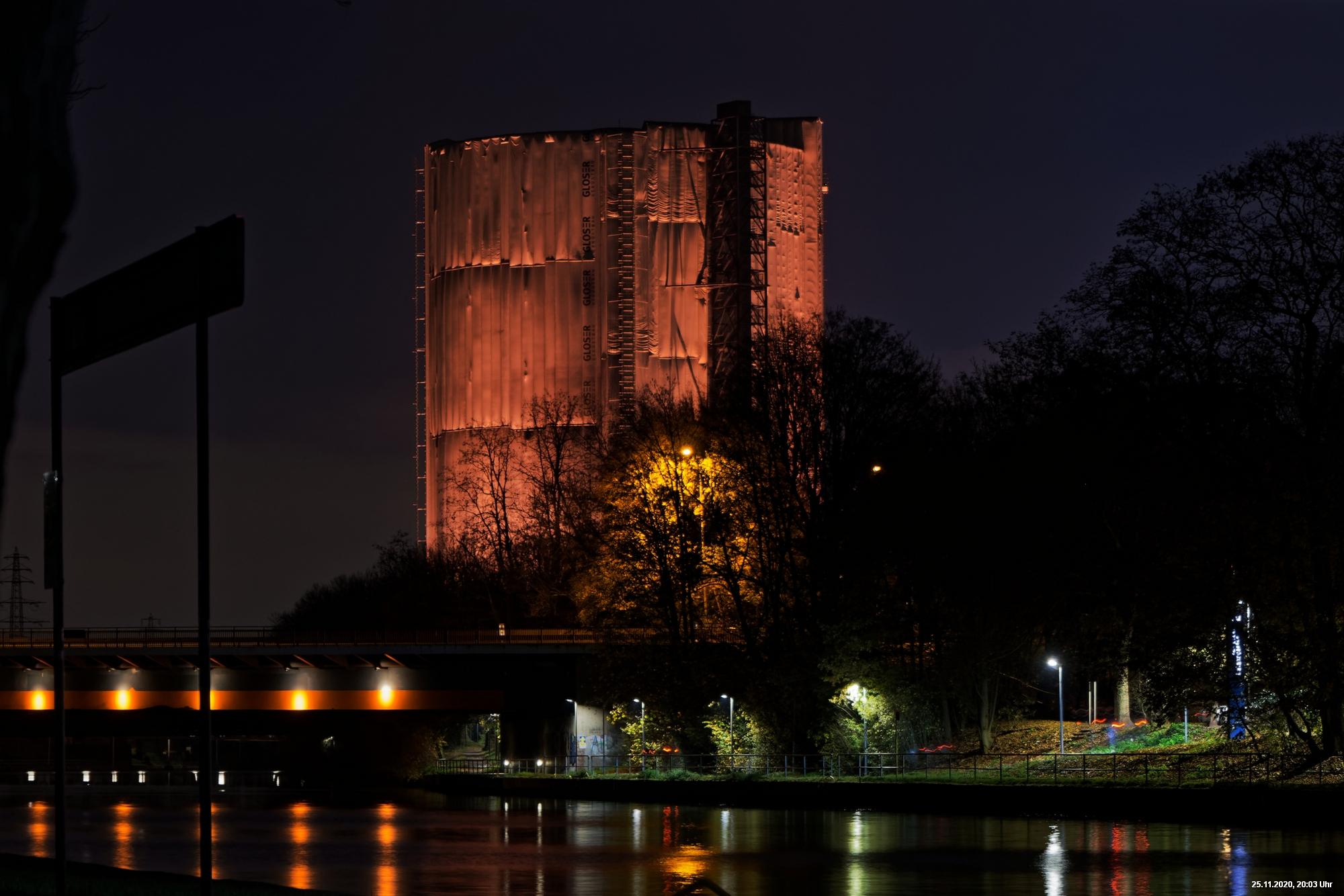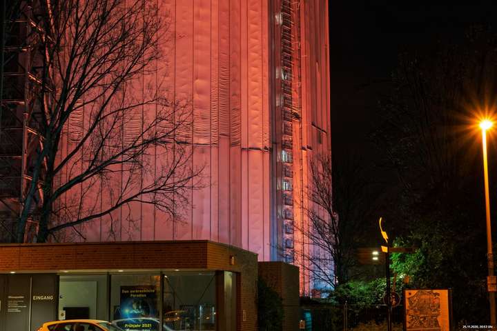 Es war ein weltweit sichtbares Zeichen gegen Gewalt an Frauen durch orangefarbene Kleidung, Fahnen und Beleuchtungen. Das war schon das Positive. Negativ schien, dass die vielen Mühen orangefarbene Beleuchtung an markanten Gebäuden (hier in Oberhausen das Schloss und der Gasometer) anzubringen ganz einfach an der Farbe "Orange" scheiterten. Wenn eine Fassade schon rot ist, dann scheitert orange. Genau so wie an der refelxionsmindernden Schutzverkleidung der Gerüste an der Großbaustelle des Gasometers in Oberhausen. Viele Gebäude wurden somit leider übersehen und wurden erst durch direkte Nähe wirklich auffällig.