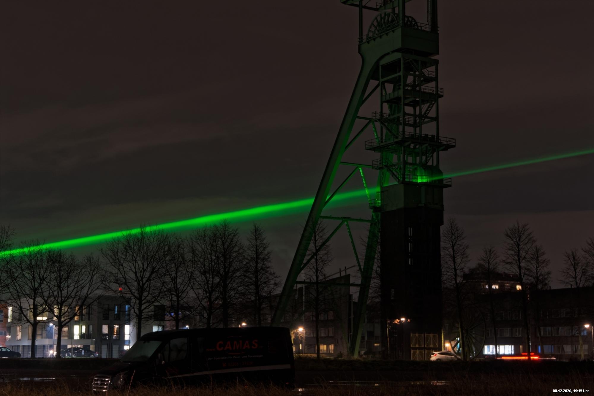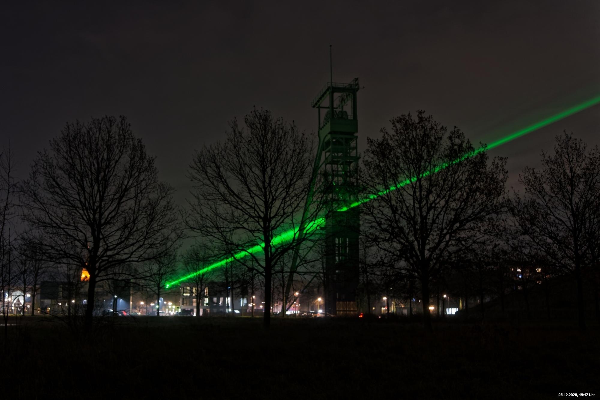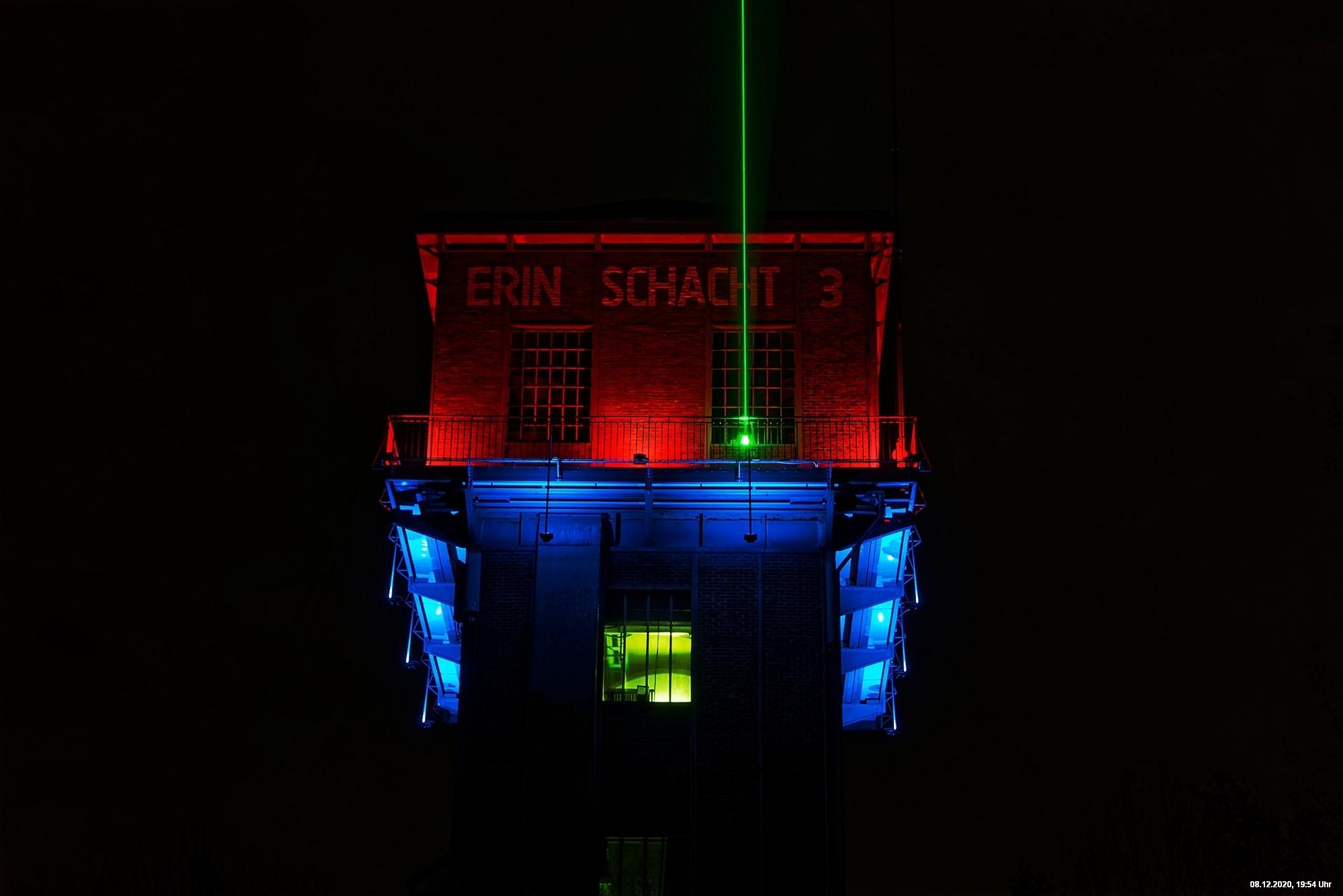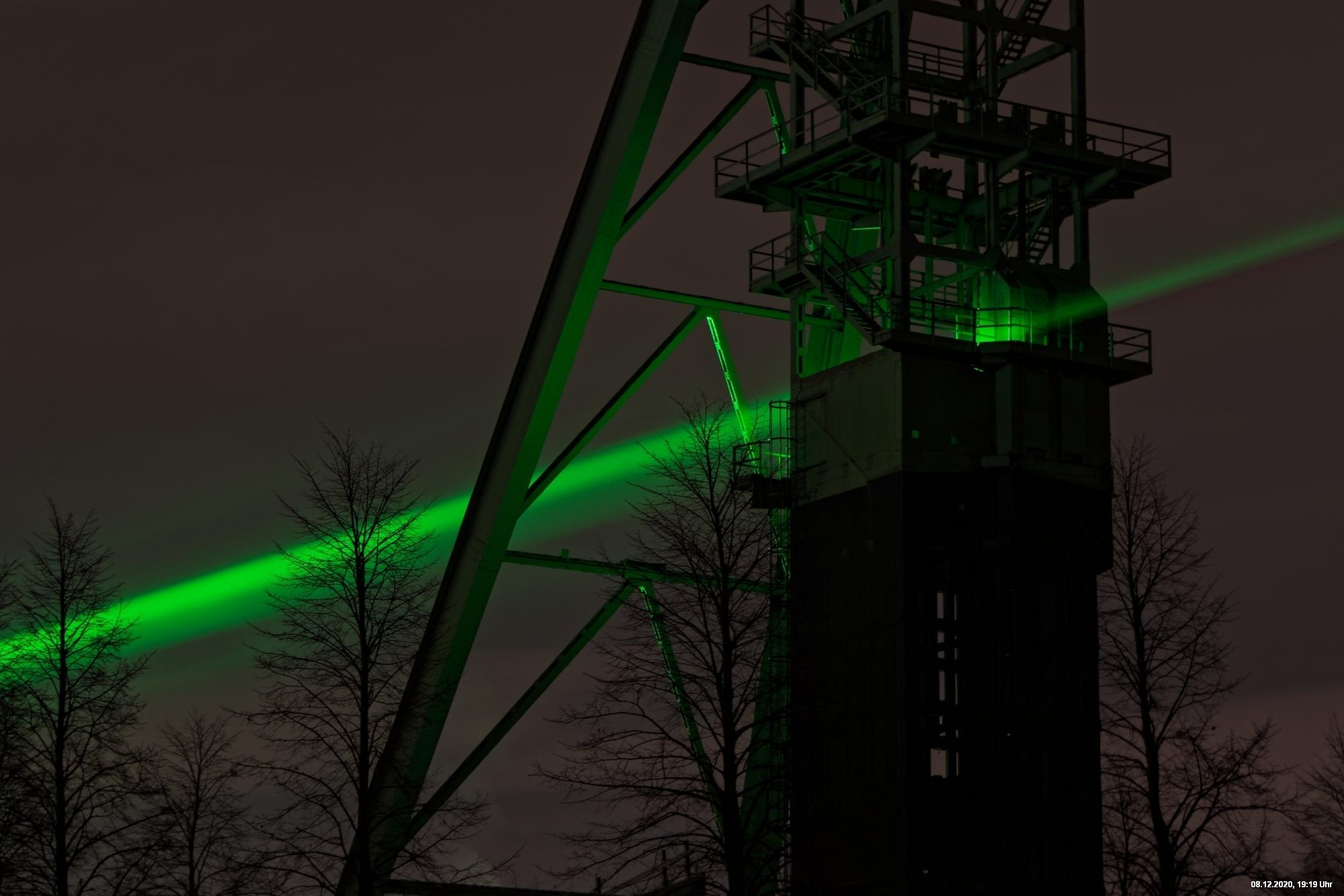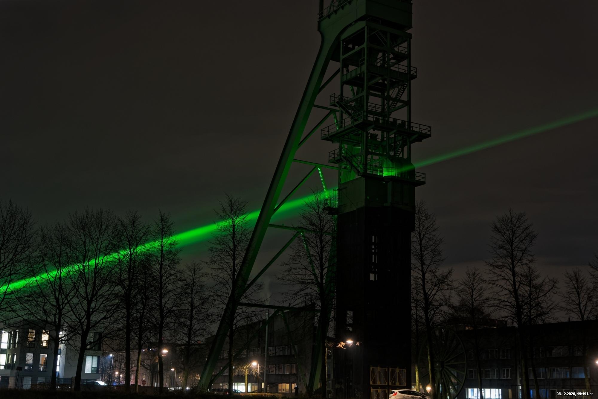 Es ist schon ein imposantes Bild, wenn man nach Castrop-Rauxel kommt und sieht quer über der Stadt diesen markanten, grünen Laserstrahl. Er wird vom Hammerkopfturm der ehemaligen Anlage Erin 3 geschickt zum Förderturm Erin 7. Ein Rest an Strahlen geht durch die Stahlkonstruktion durch und erreicht auch noch die dahinter liegende Halde.
