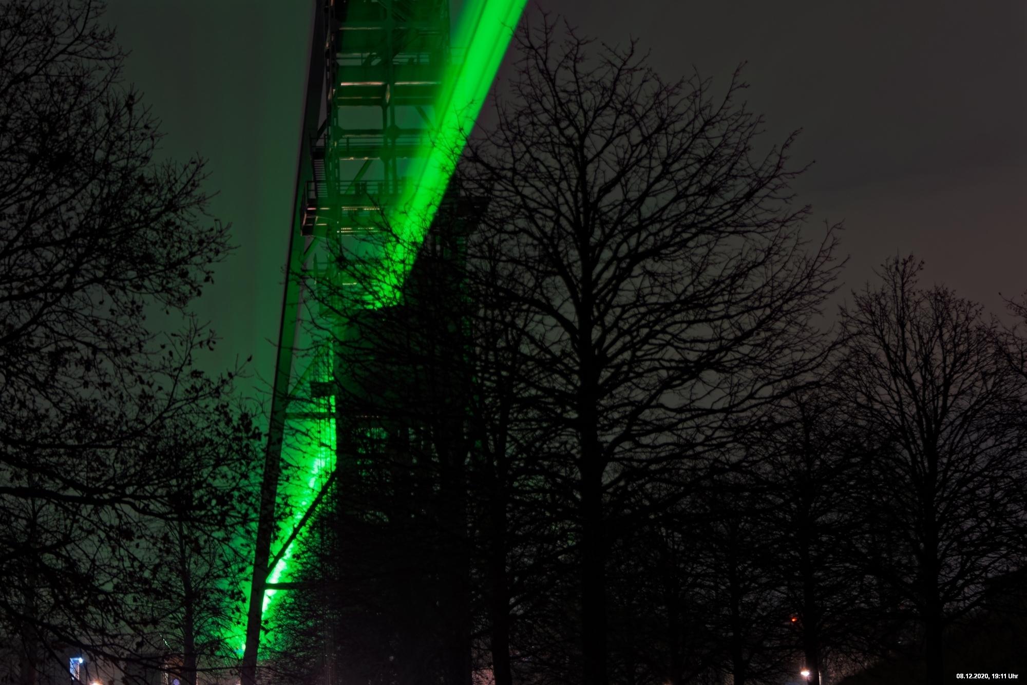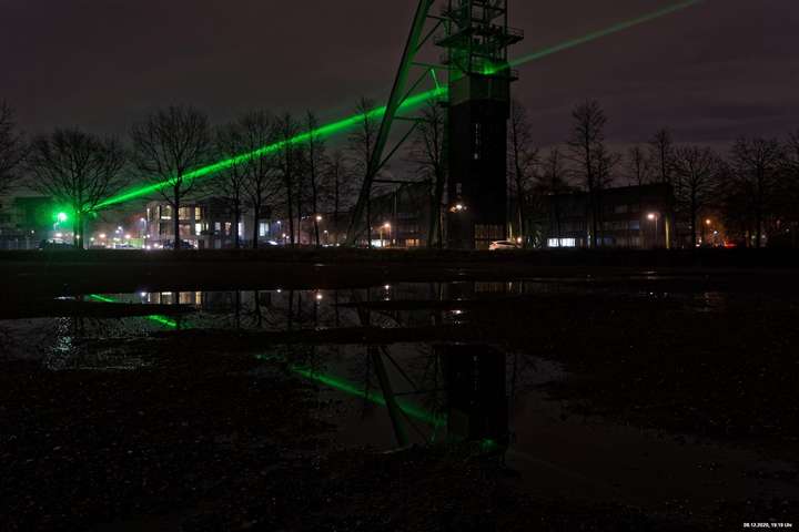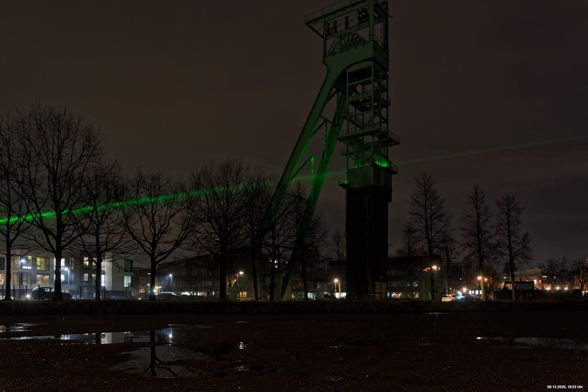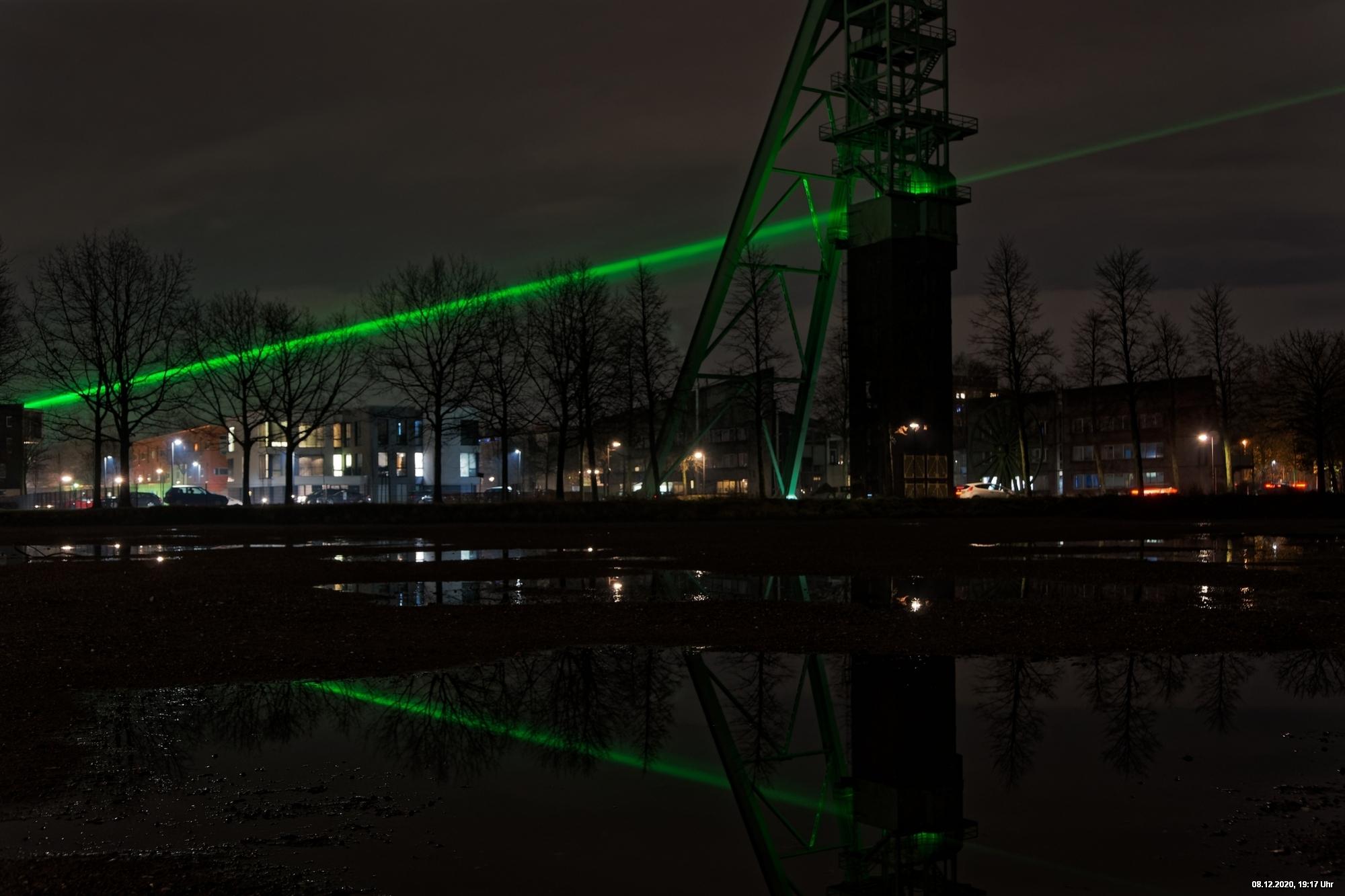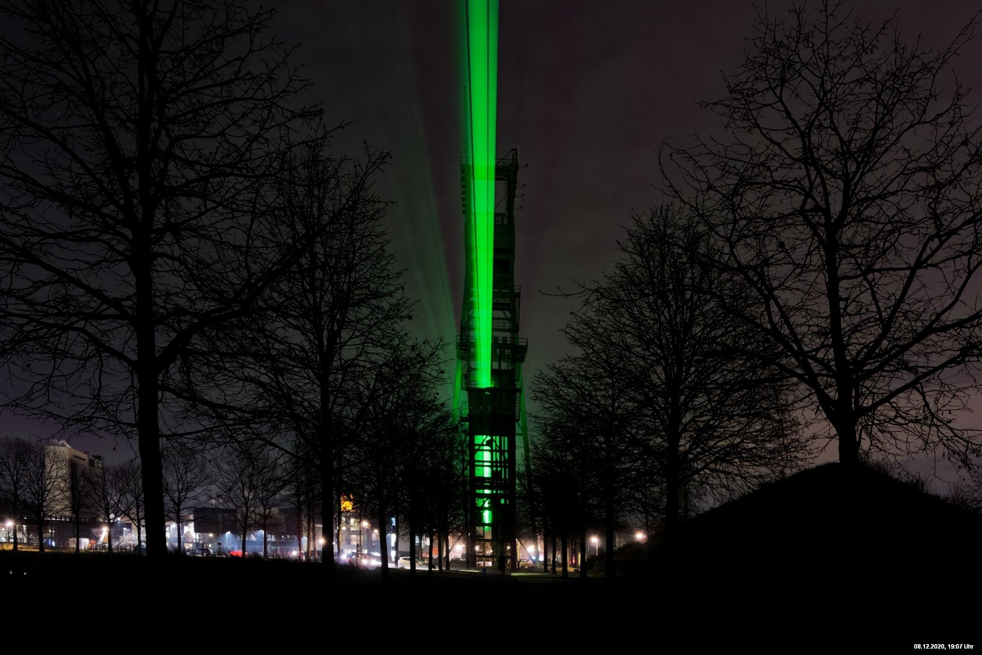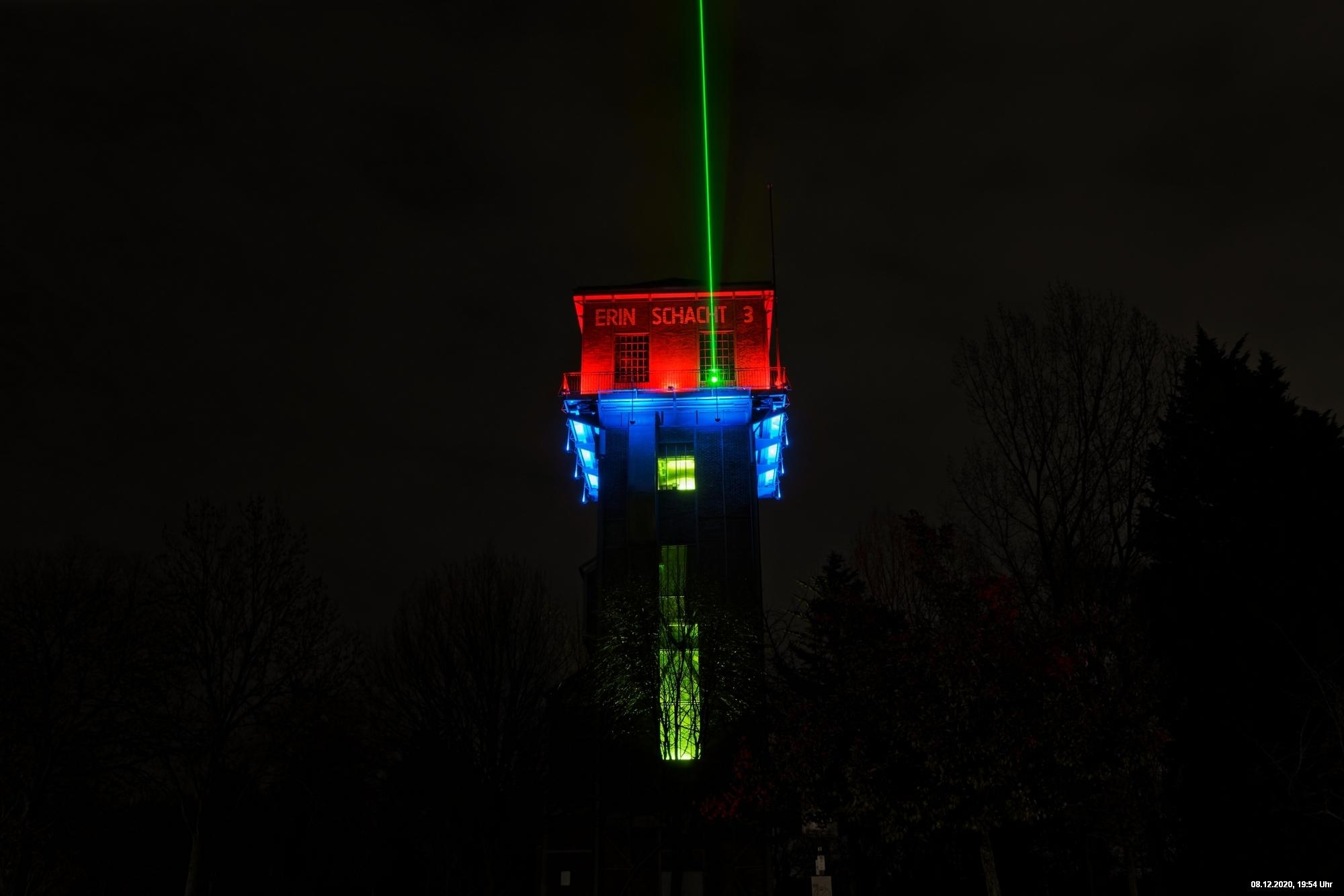 Es ist schon ein imposantes Bild, wenn man nach Castrop-Rauxel kommt und sieht quer über der Stadt diesen markanten, grünen Laserstrahl. Er wird vom Hammerkopfturm der ehemaligen Anlage Erin 3 geschickt zum Förderturm Erin 7. Ein Rest an Strahlen geht durch die Stahlkonstruktion durch und erreicht auch noch die dahinter liegende Halde.