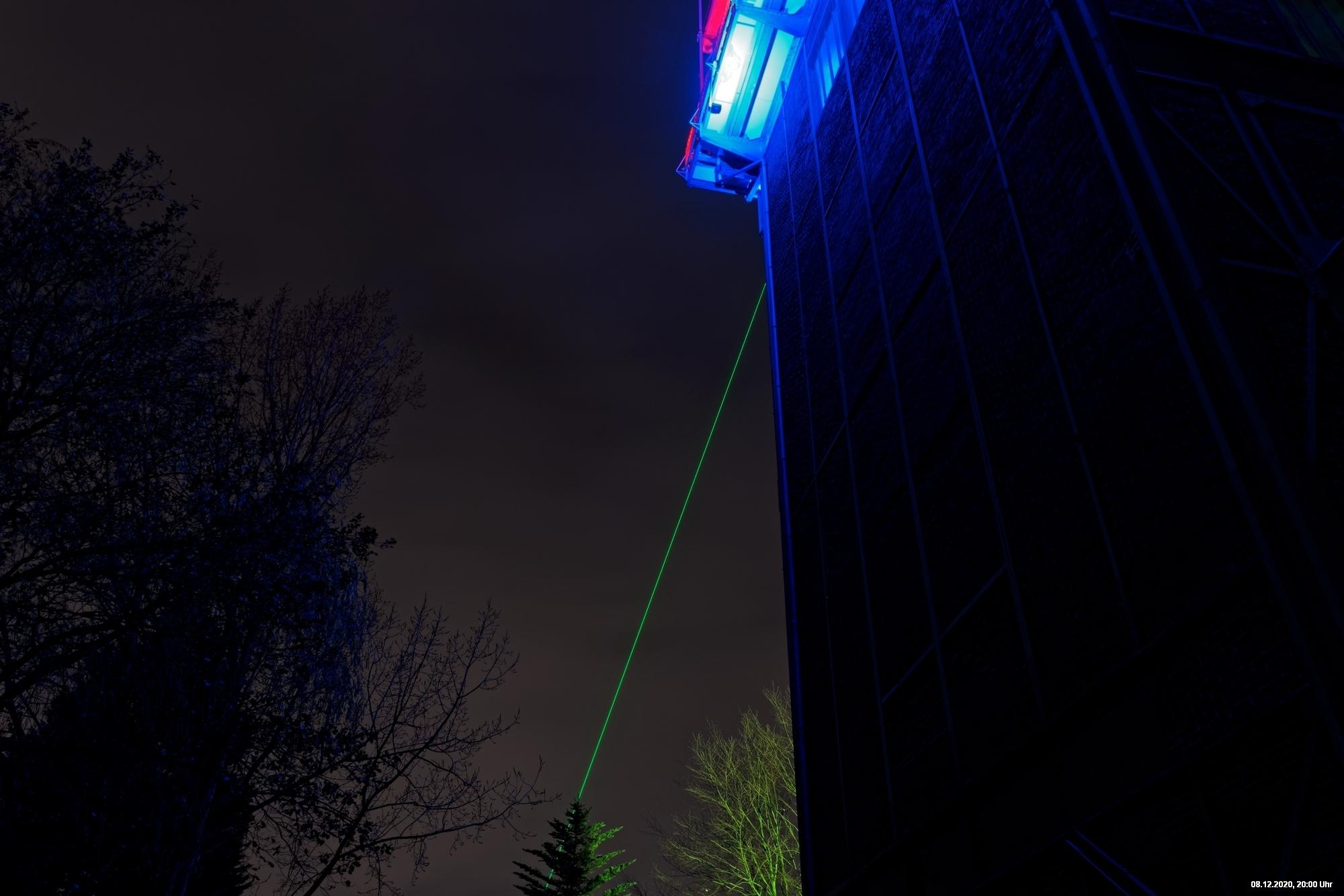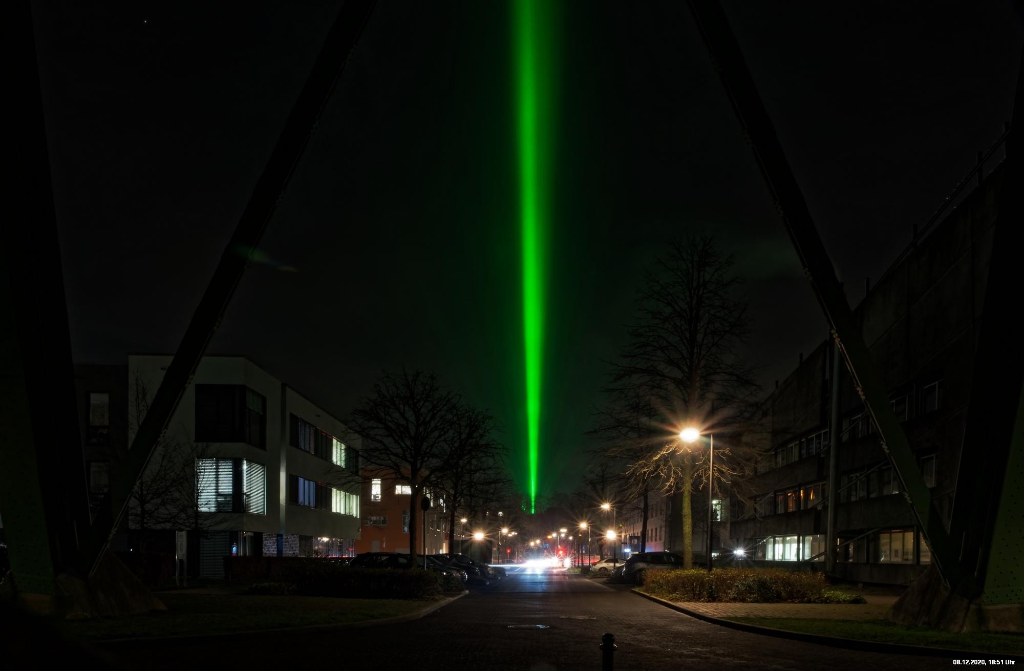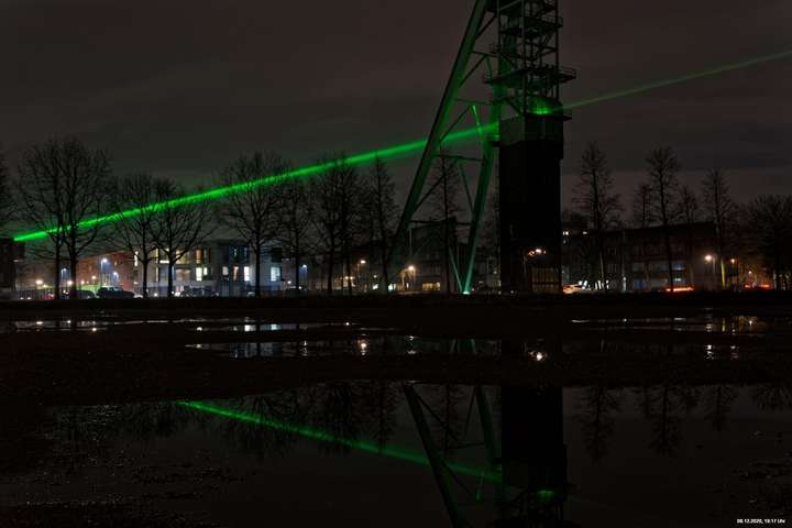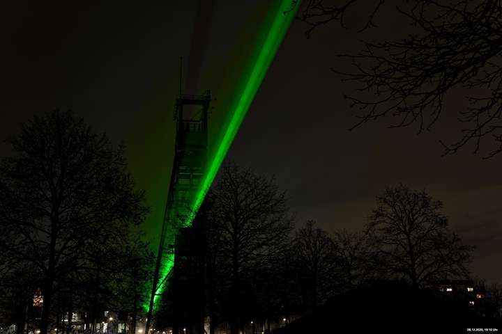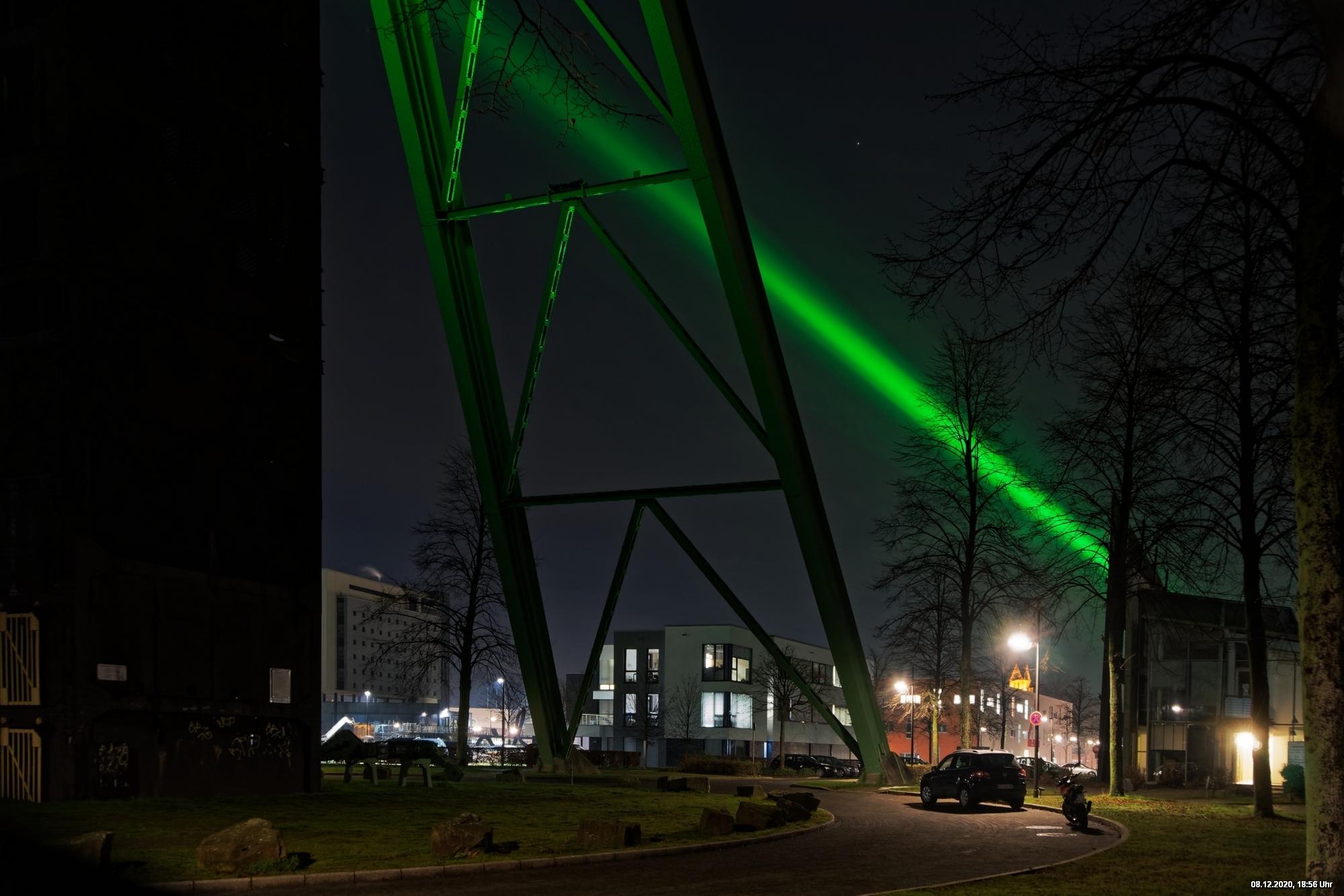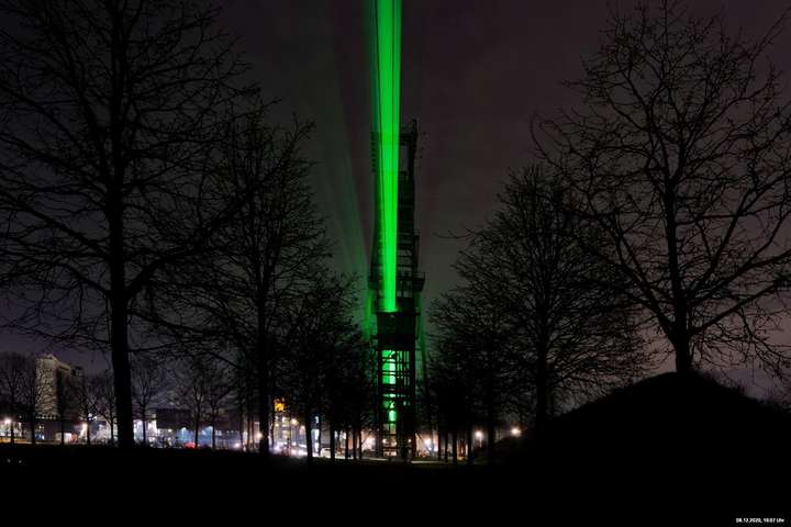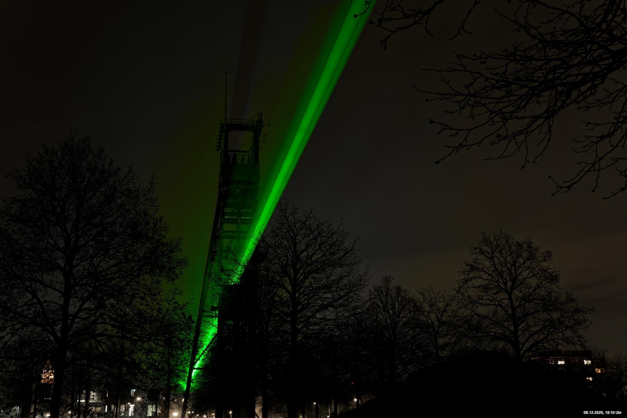 Es ist schon ein imposantes Bild, wenn man nach Castrop-Rauxel kommt und sieht quer über der Stadt diesen markanten, grünen Laserstrahl. Er wird vom Hammerkopfturm der ehemaligen Anlage Erin 3 geschickt zum Förderturm Erin 7. Ein Rest an Strahlen geht durch die Stahlkonstruktion durch und erreicht auch noch die dahinter liegende Halde.