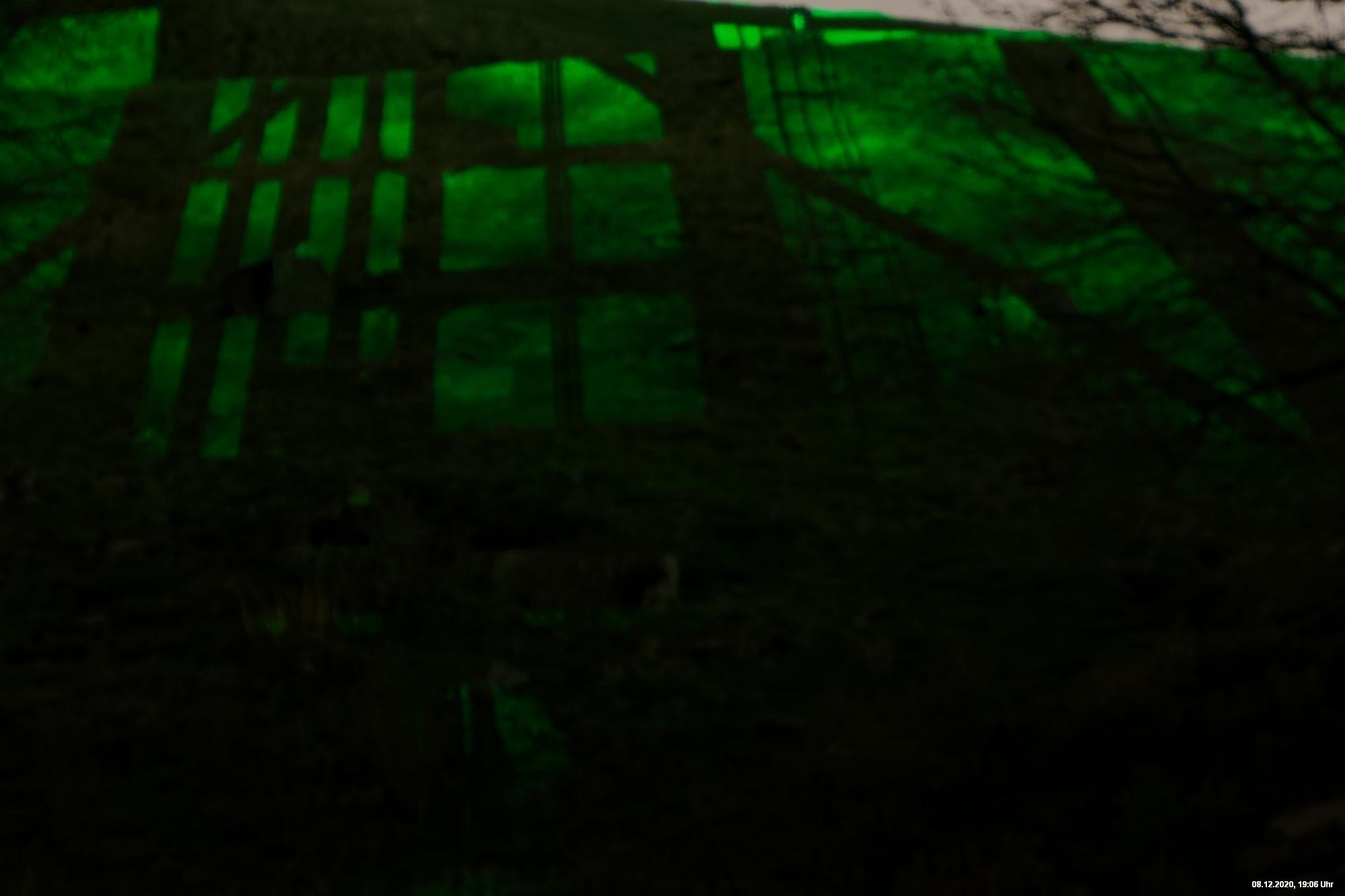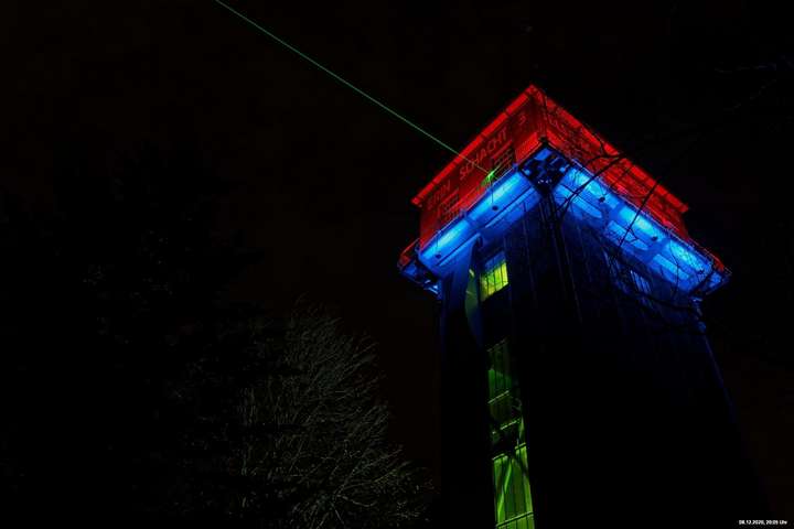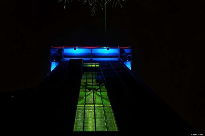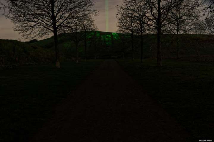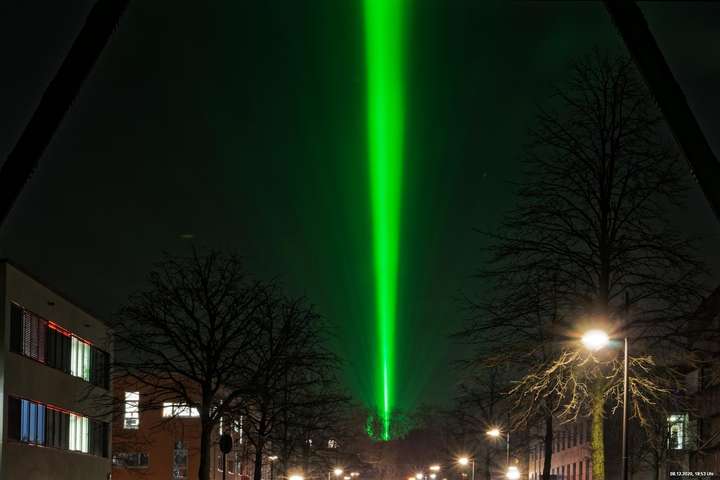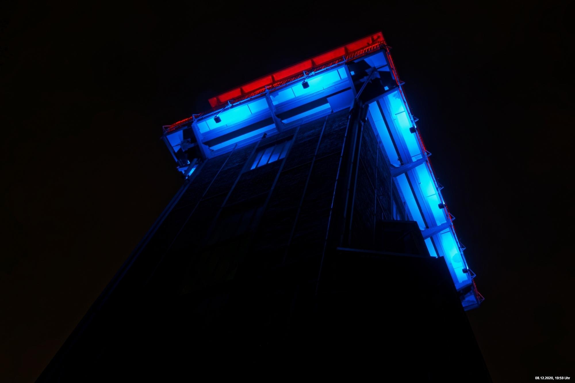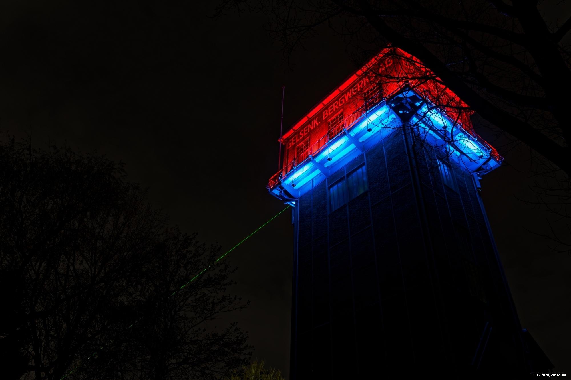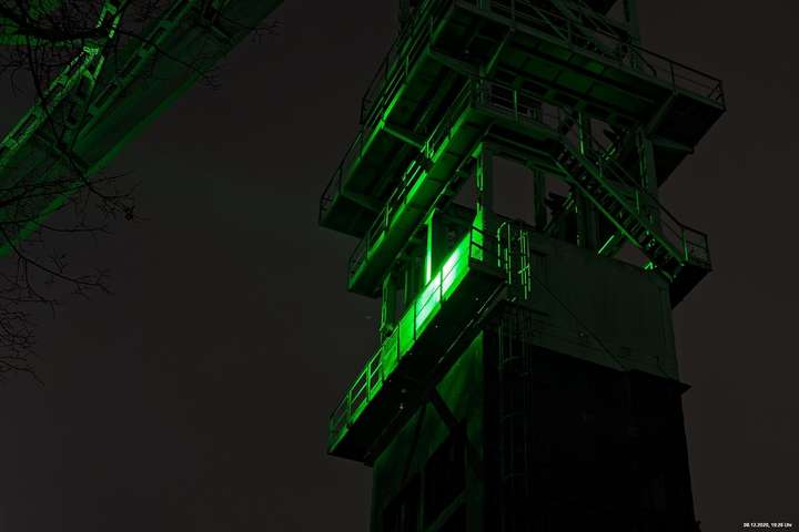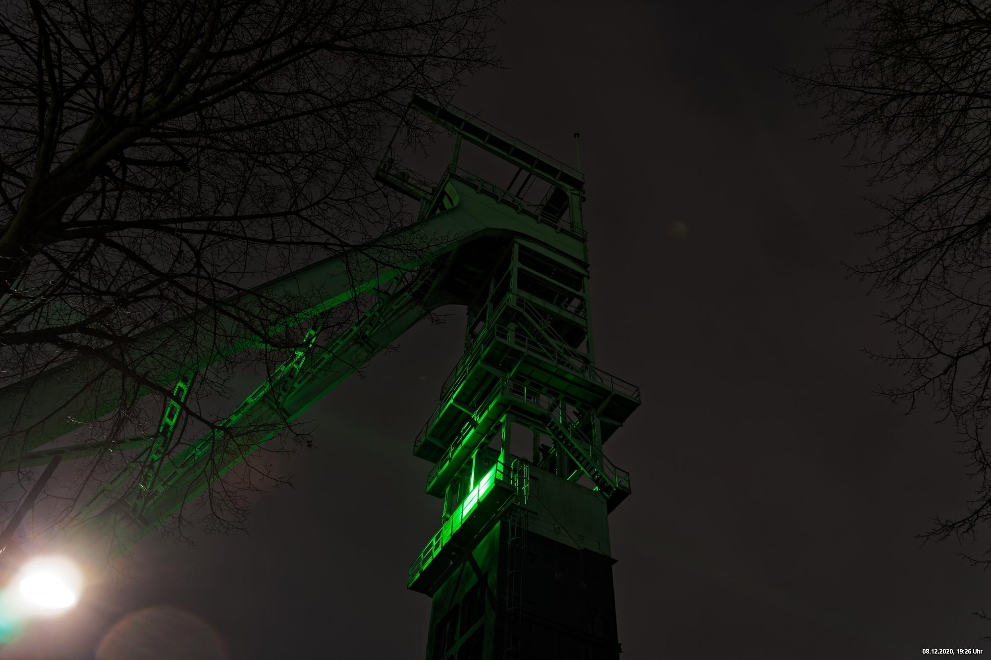 Es ist schon ein imposantes Bild, wenn man nach Castrop-Rauxel kommt und sieht quer über der Stadt diesen markanten, grünen Laserstrahl. Er wird vom Hammerkopfturm der ehemaligen Anlage Erin 3 geschickt zum Förderturm Erin 7. Ein Rest an Strahlen geht durch die Stahlkonstruktion durch und erreicht auch noch die dahinter liegende Halde.