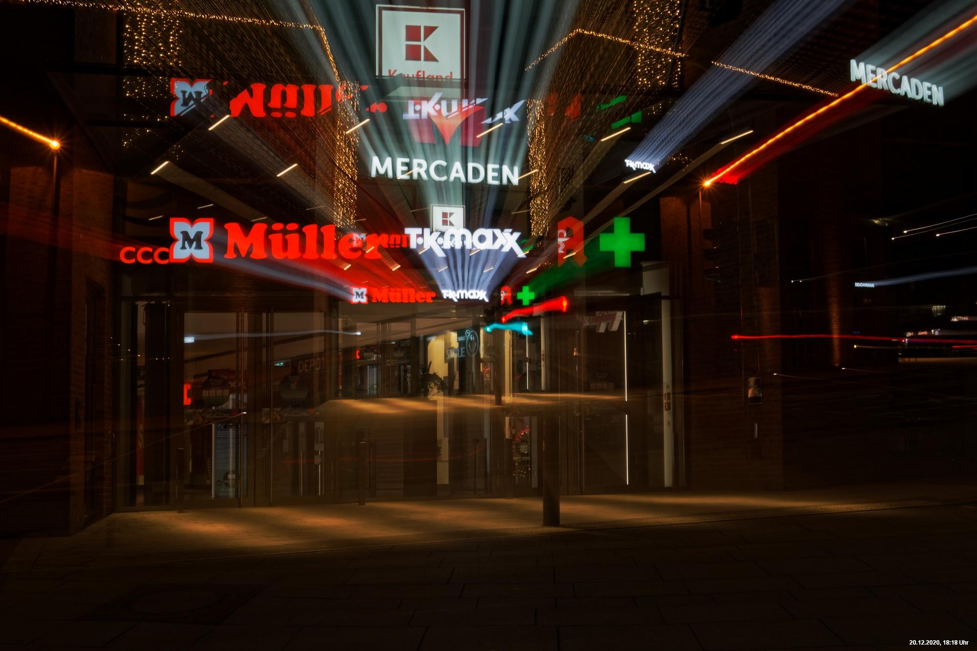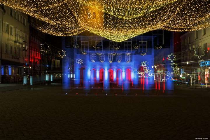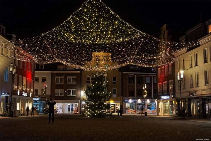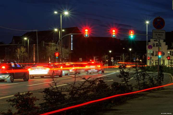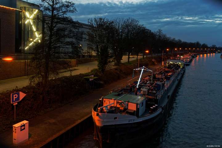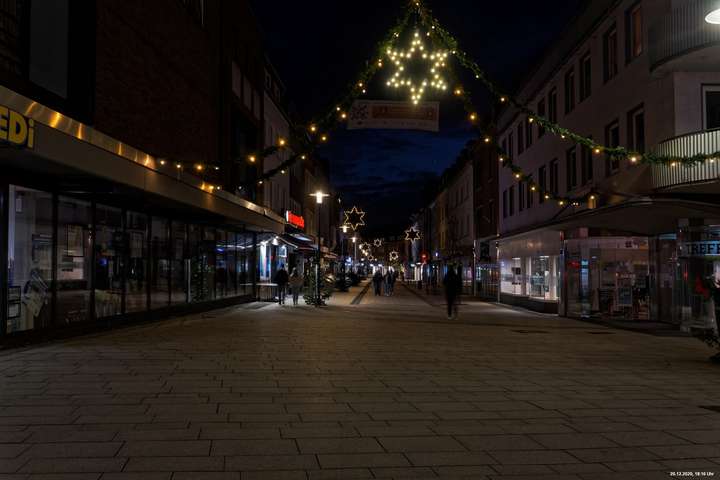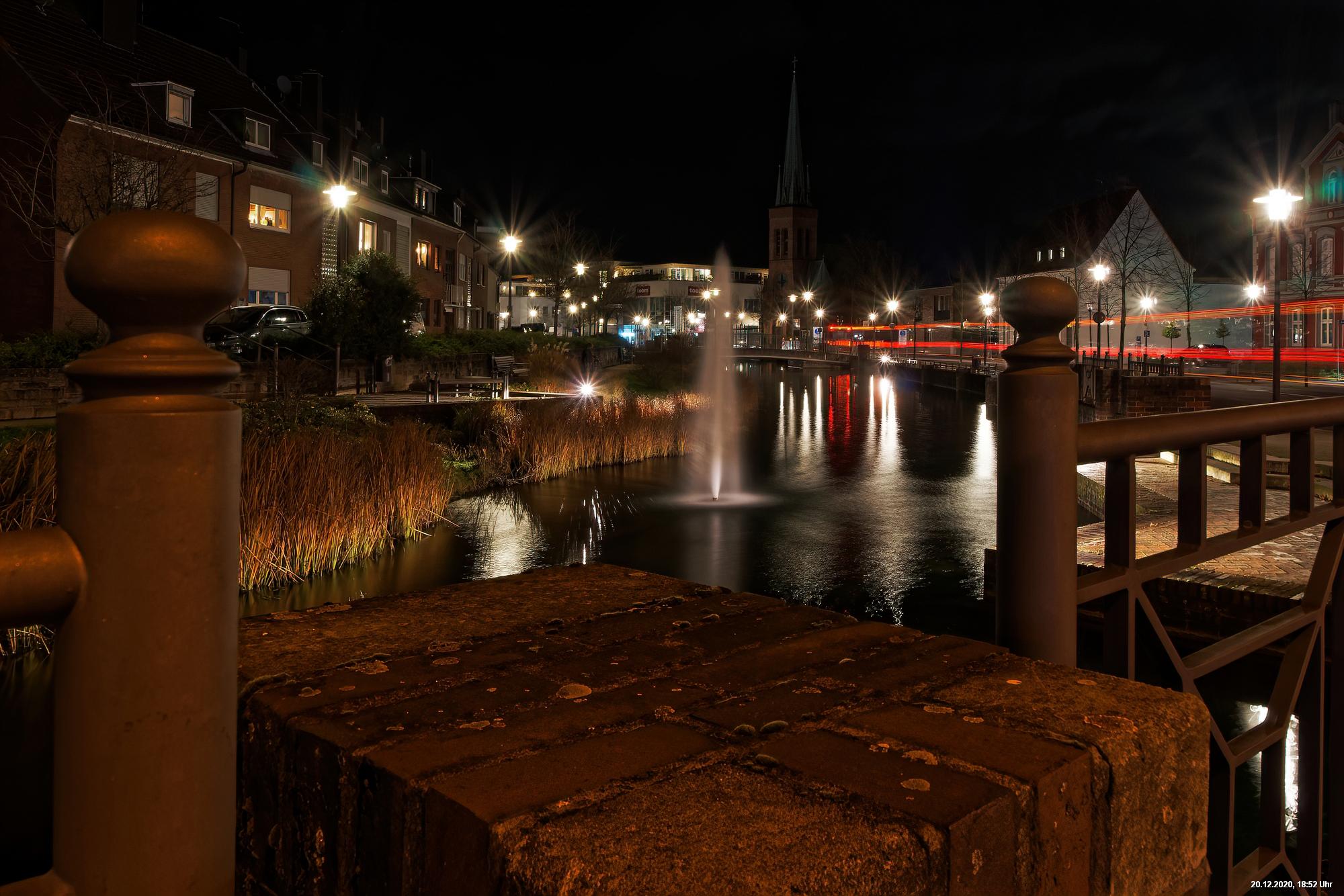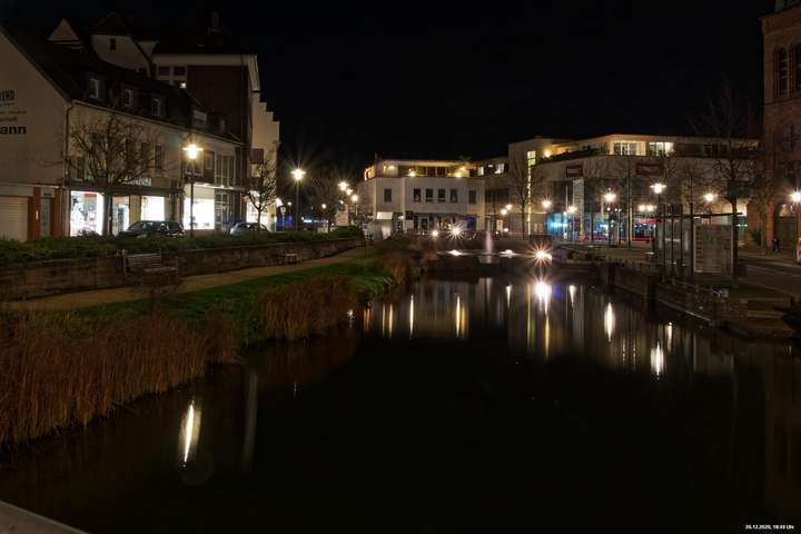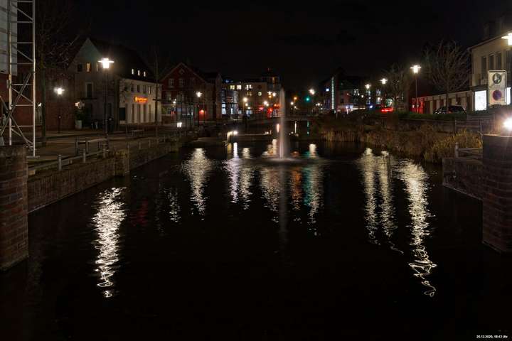 Eigentlich ist ja Coronazeit - und so sah Dorsten auch aus. Es war ziemlich leer. Das gastronomische Treiben auf dem Marktplatz findet nicht statt. Trotzdem hat Dorsten sein bestes Kleid angelegt und versucht zu strahlen. Auf dem Kanal war relativ viel Verkehr - auf den Straßen eigentlich auch. Die Lichtstreifen der Fahrzeuge mischen sich unter die Weihnachtsbeleuchtung. Die Lichter der Grabenanlage machen sich gut in der Nacht und die Springbrunnen laufen noch.