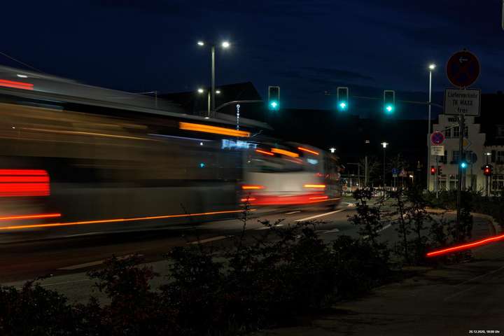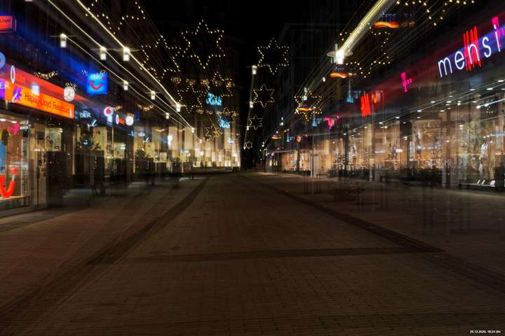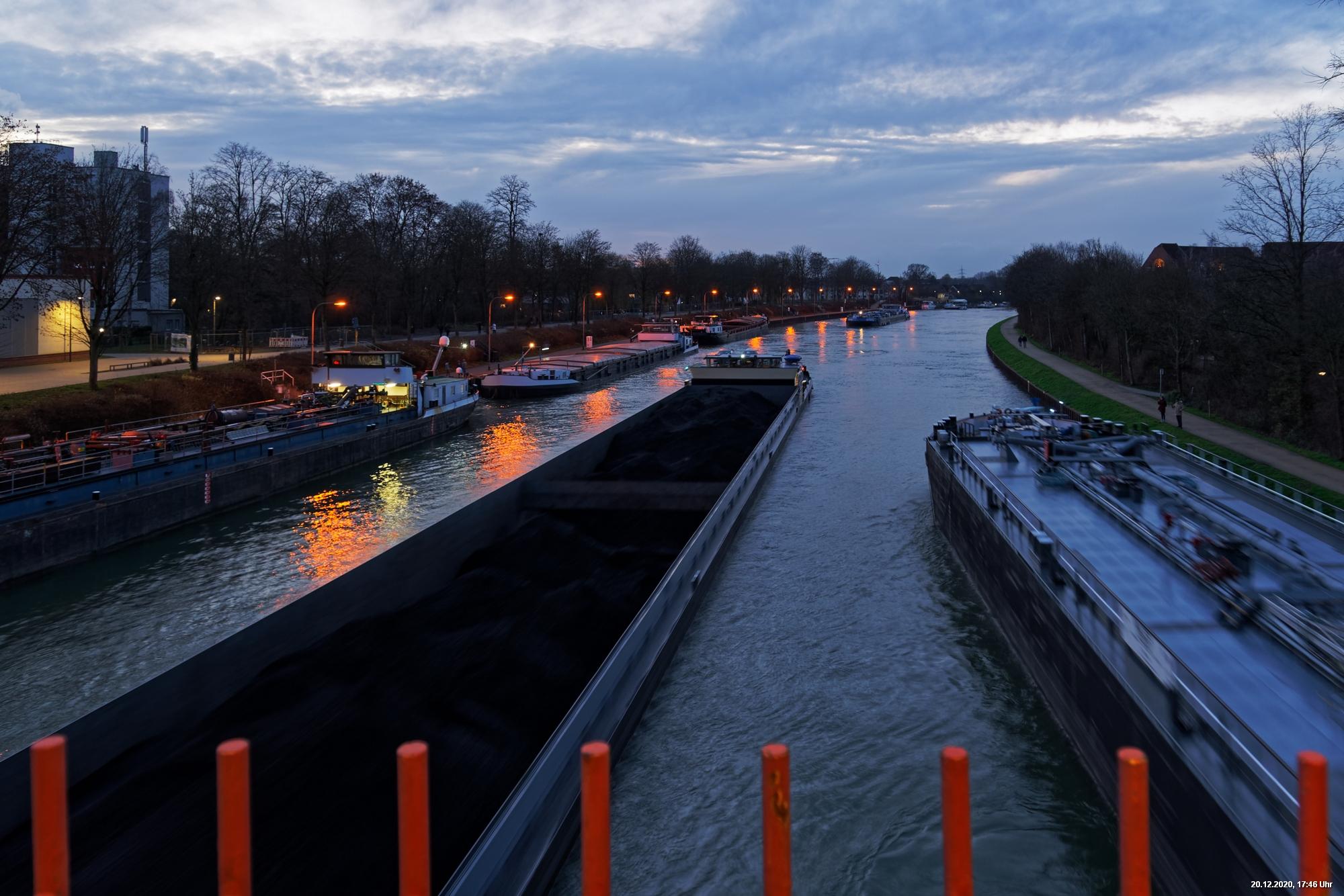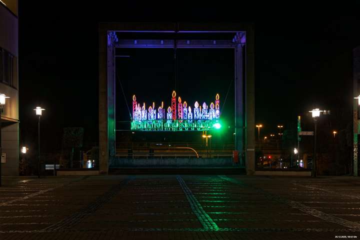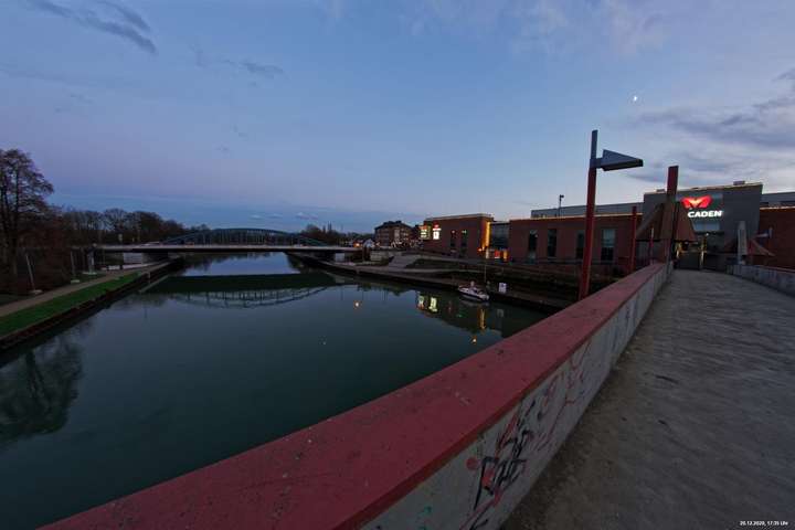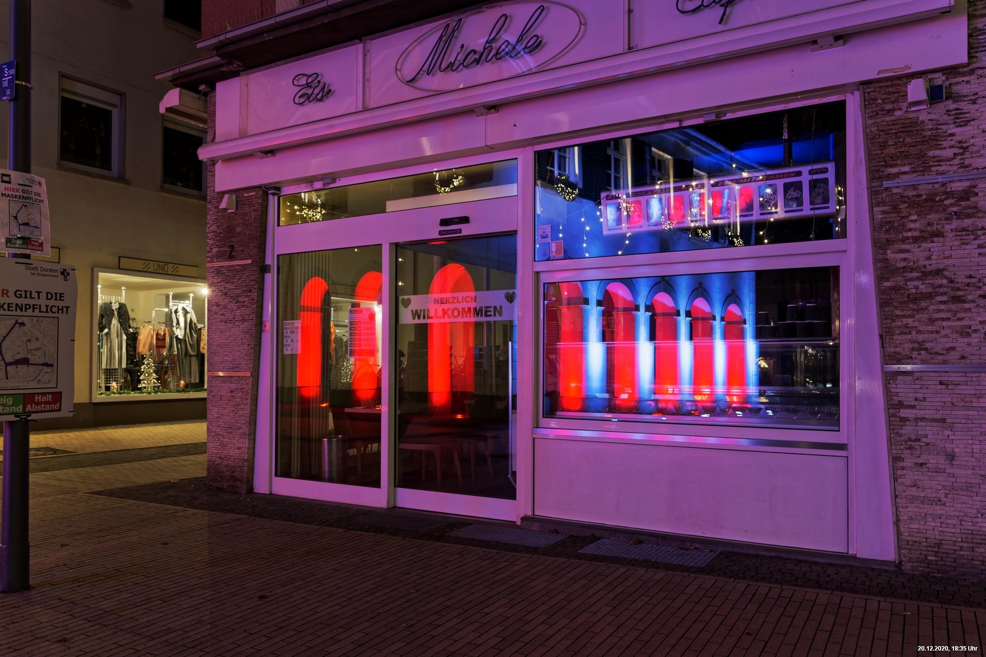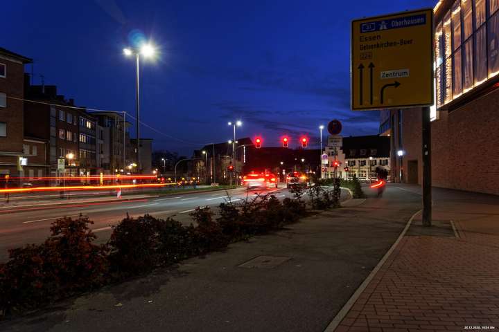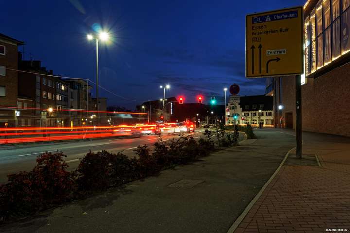 Eigentlich ist ja Coronazeit - und so sah Dorsten auch aus. Es war ziemlich leer. Das gastronomische Treiben auf dem Marktplatz findet nicht statt. Trotzdem hat Dorsten sein bestes Kleid angelegt und versucht zu strahlen. Auf dem Kanal war relativ viel Verkehr - auf den Straßen eigentlich auch. Die Lichtstreifen der Fahrzeuge mischen sich unter die Weihnachtsbeleuchtung. Die Lichter der Grabenanlage machen sich gut in der Nacht und die Springbrunnen laufen noch.