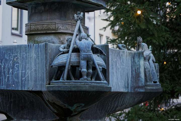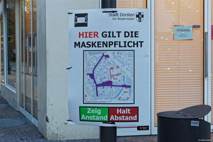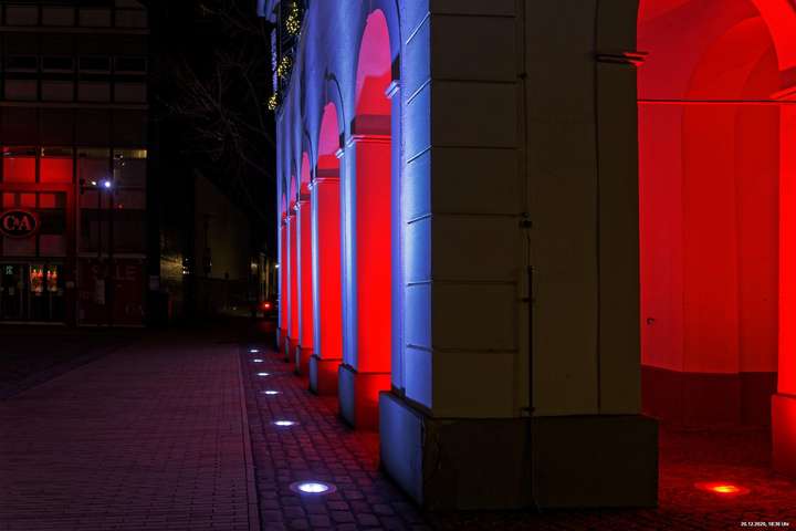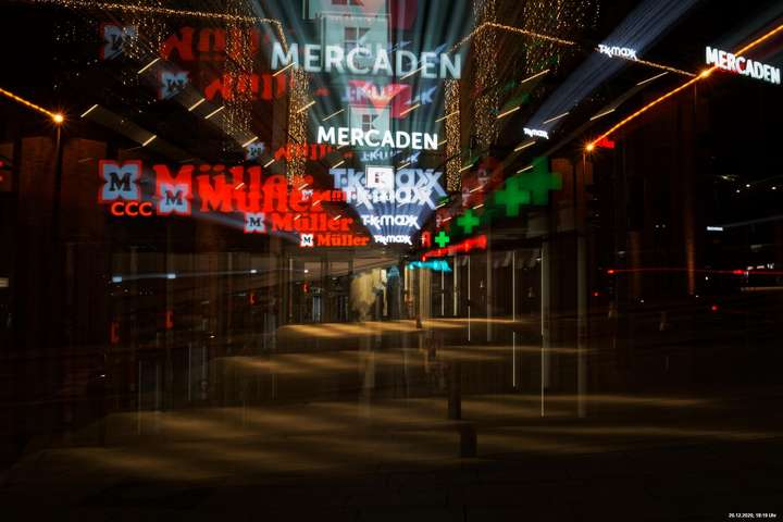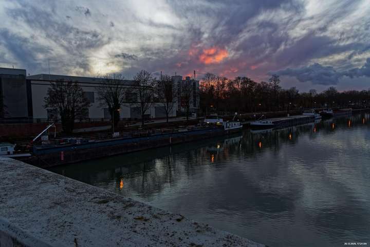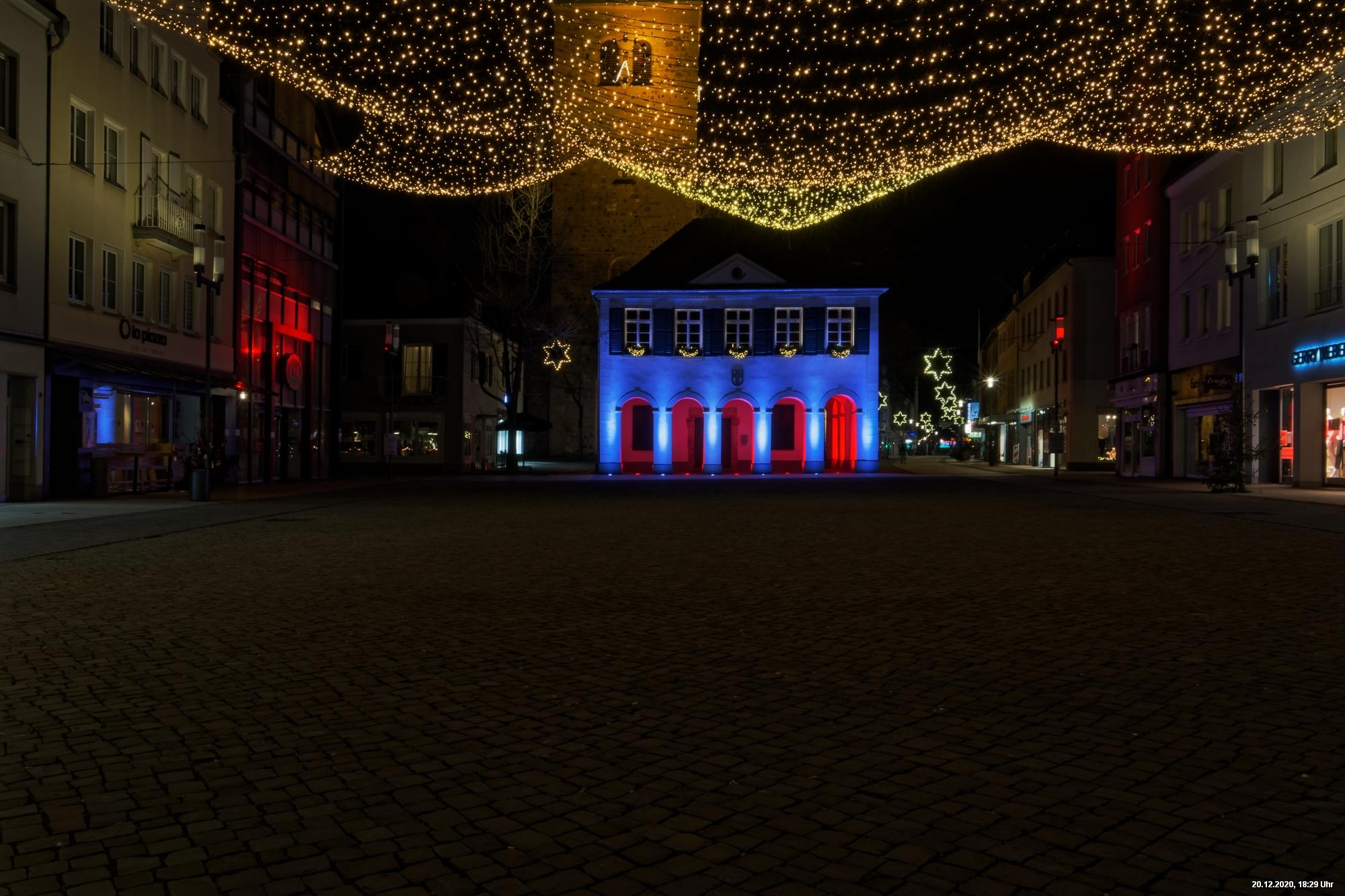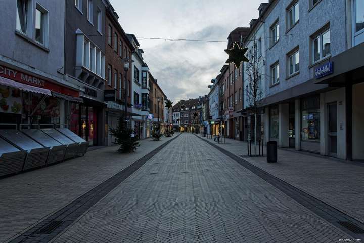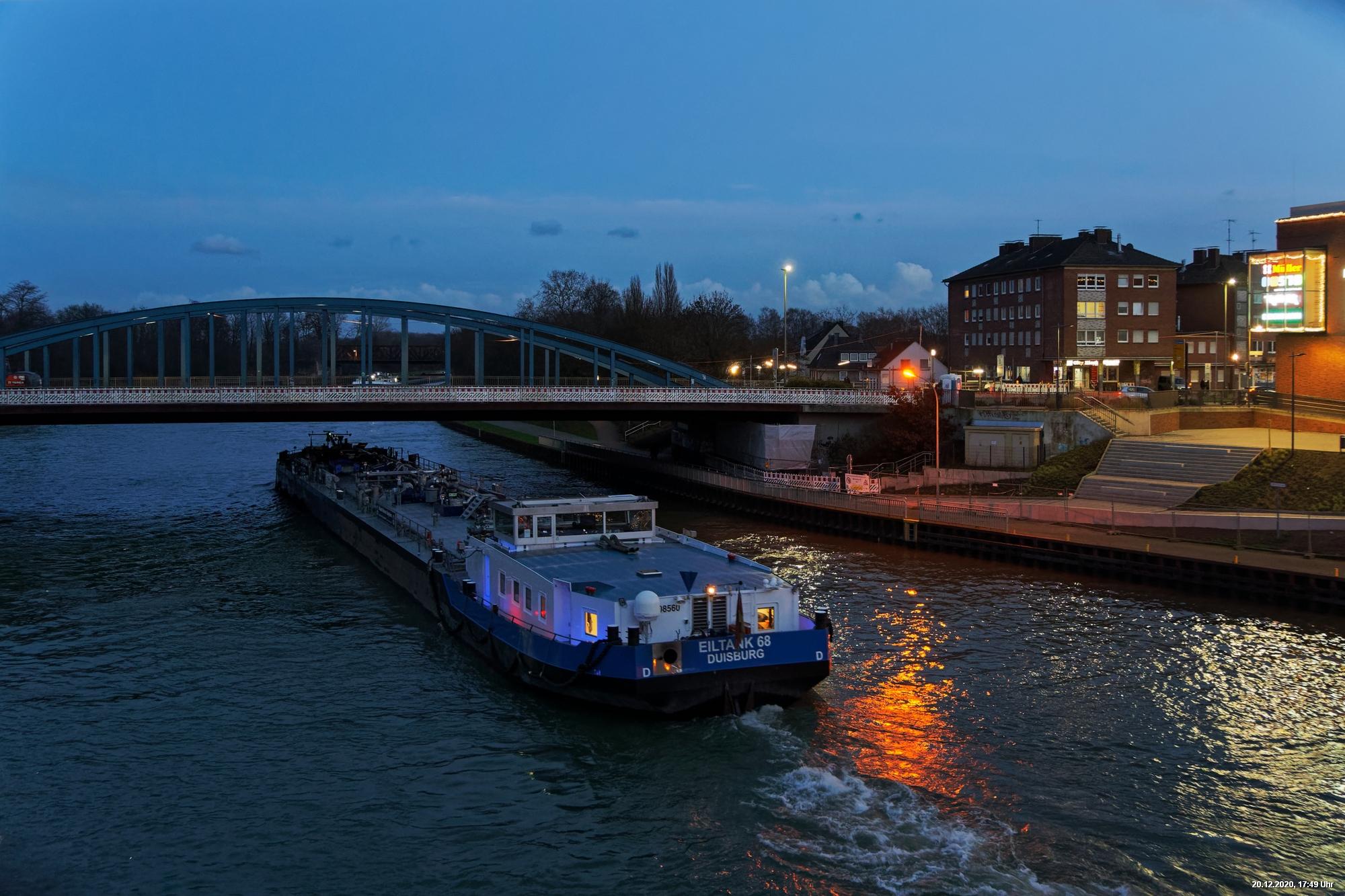 Eigentlich ist ja Coronazeit - und so sah Dorsten auch aus. Es war ziemlich leer. Das gastronomische Treiben auf dem Marktplatz findet nicht statt. Trotzdem hat Dorsten sein bestes Kleid angelegt und versucht zu strahlen. Auf dem Kanal war relativ viel Verkehr - auf den Straßen eigentlich auch. Die Lichtstreifen der Fahrzeuge mischen sich unter die Weihnachtsbeleuchtung. Die Lichter der Grabenanlage machen sich gut in der Nacht und die Springbrunnen laufen noch.