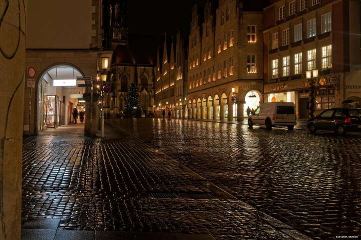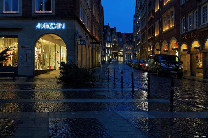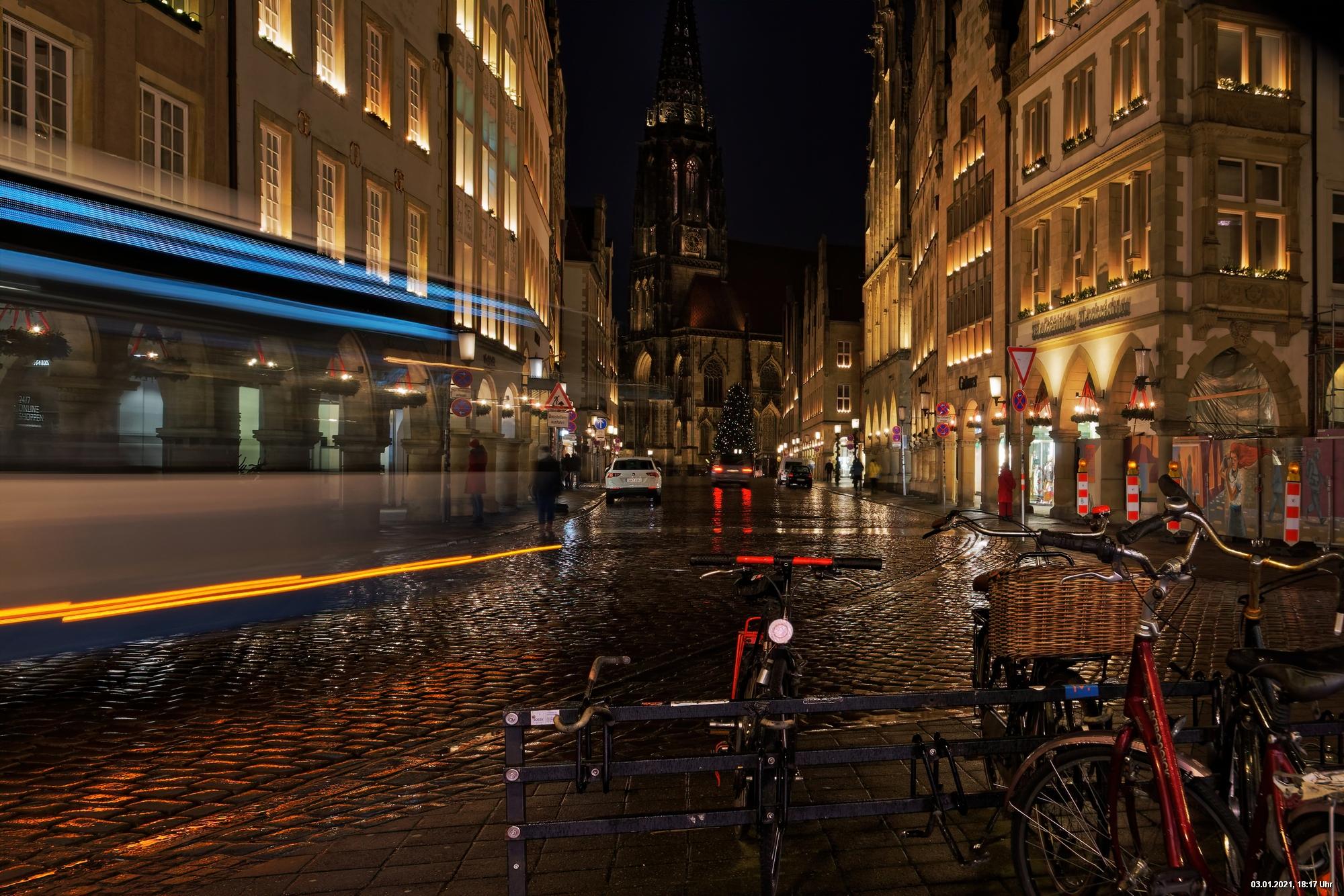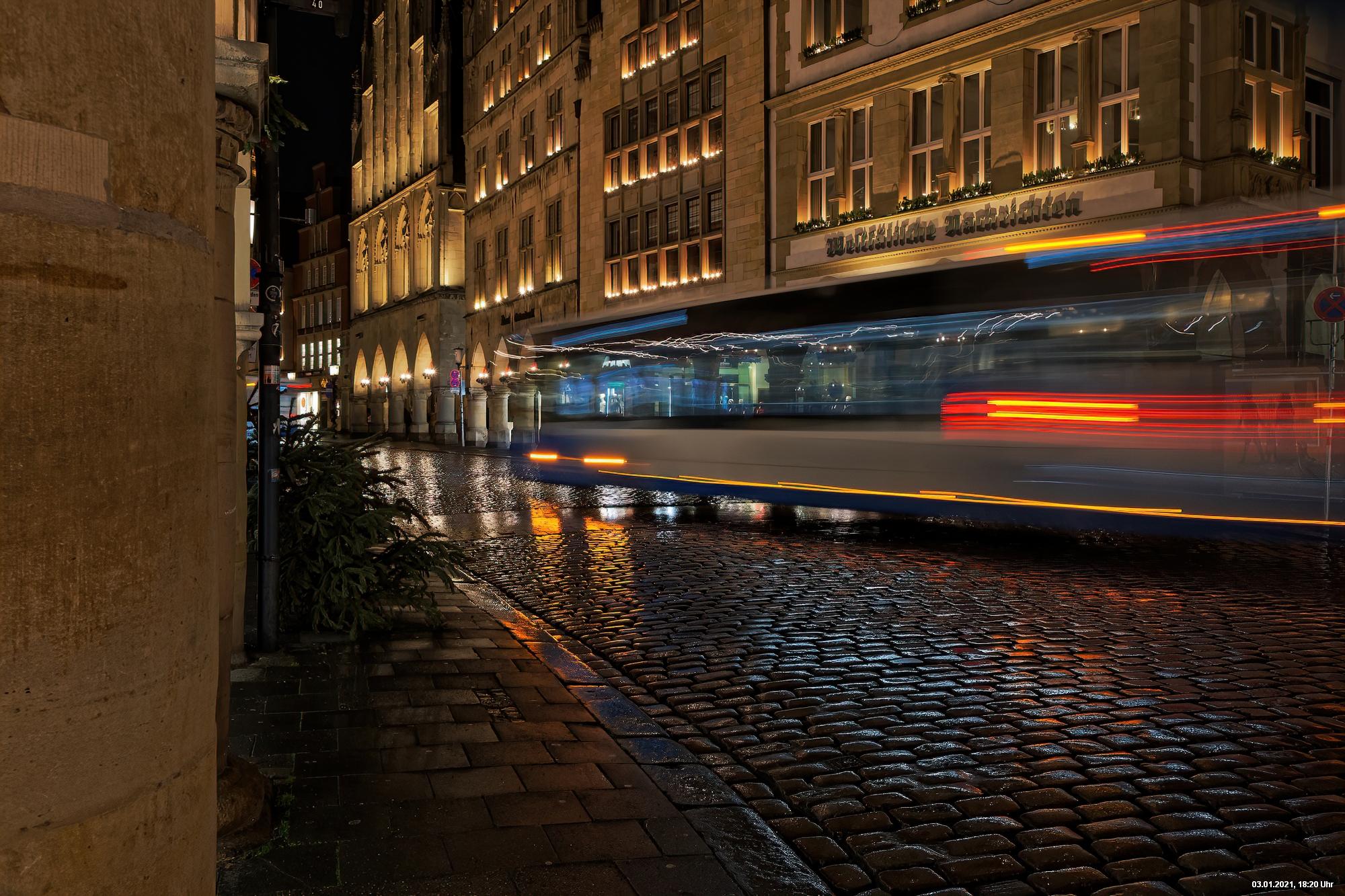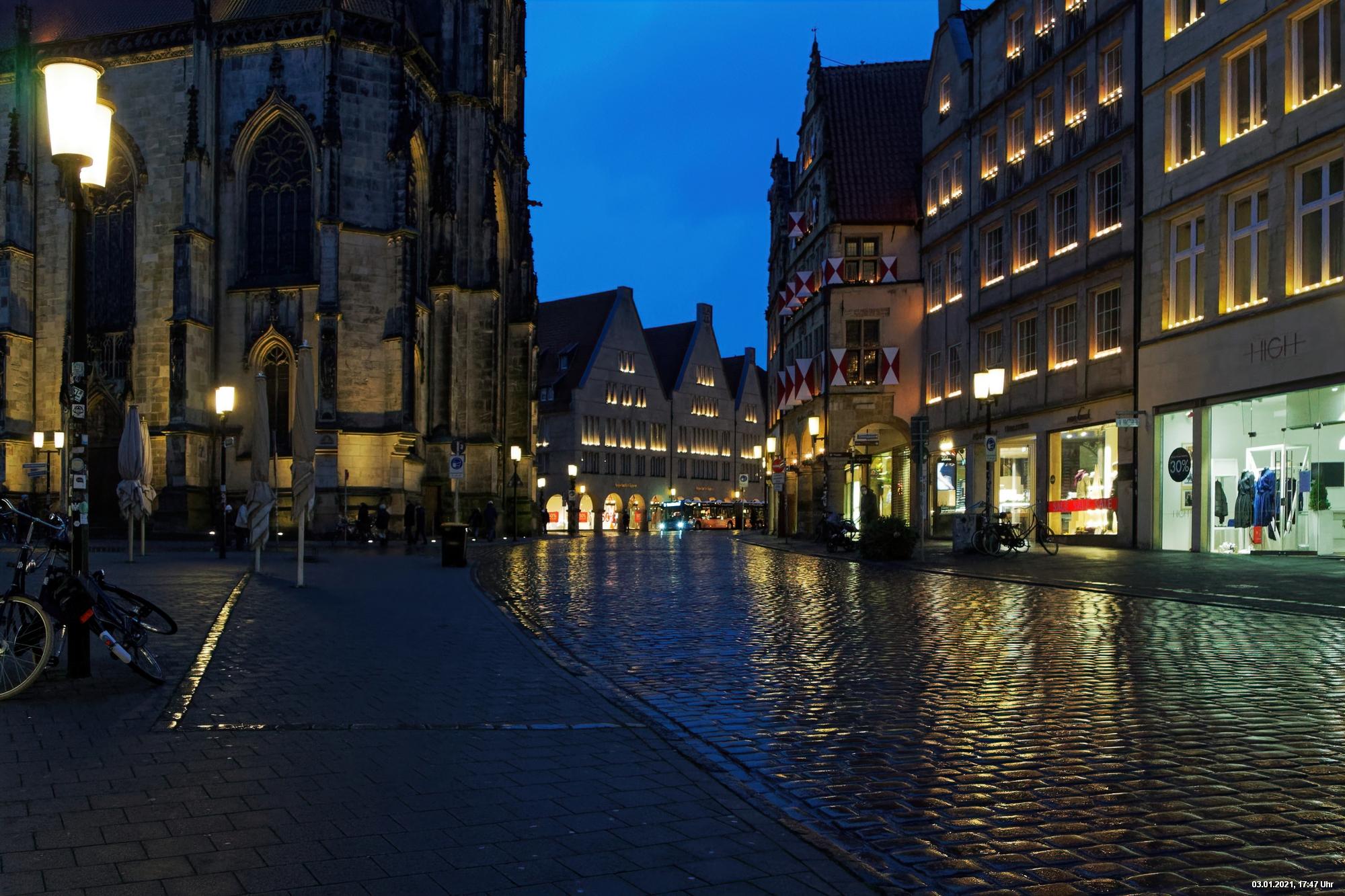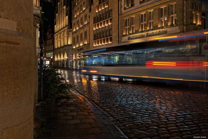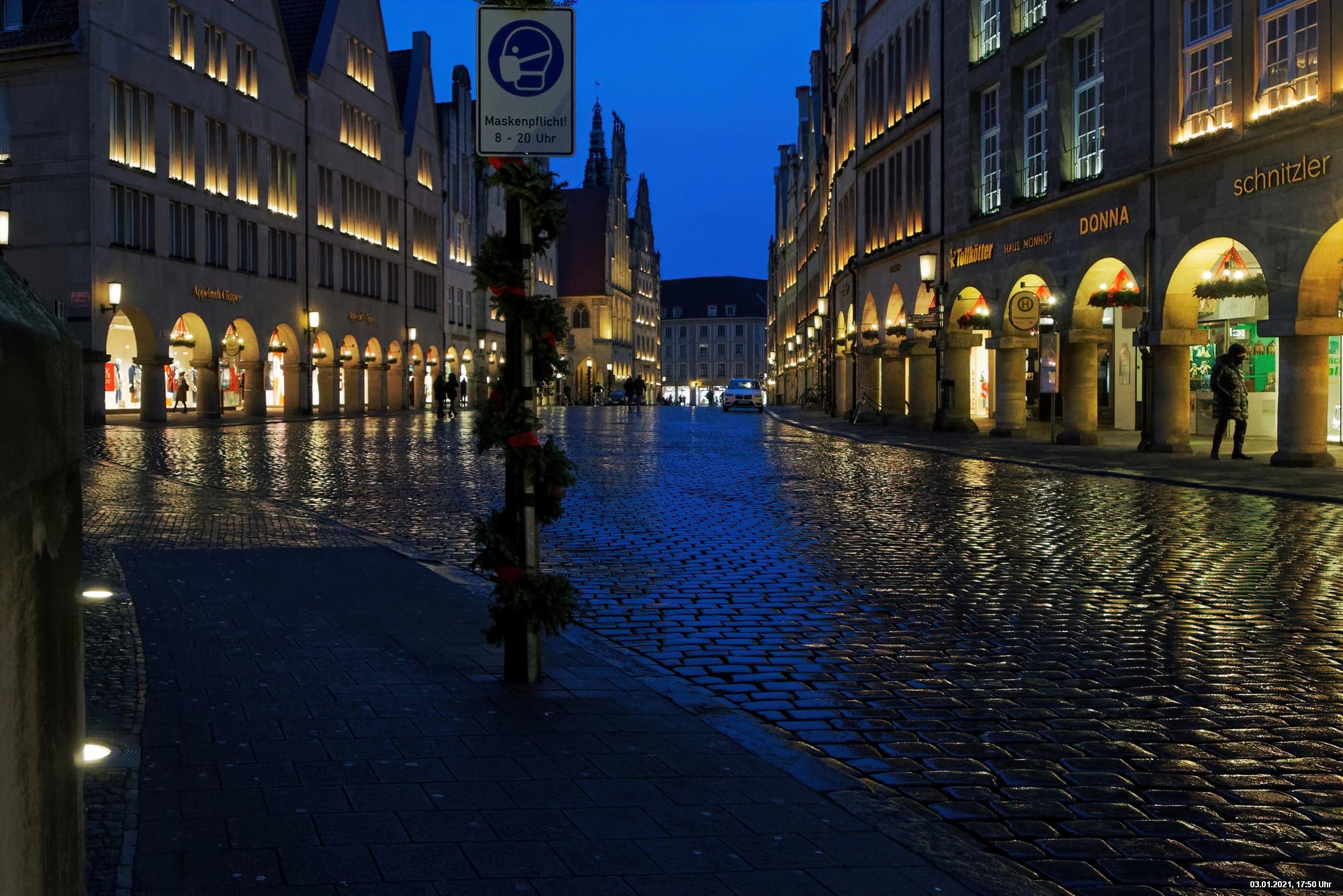 Dann war es also Sonntag, und abends, und dunkel, und kalt, und nass. Corona hat auch in Münster die Straßen ziemlich leergefegt. Die, die sich nach draußen gertaut haben, haben sich sehr diszipliniert an die Schutzverordnung gehalten. So konnten einige Fotos gemacht werden, die ansonsten kaum gelingen würden.