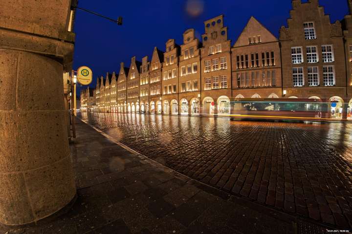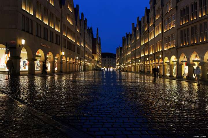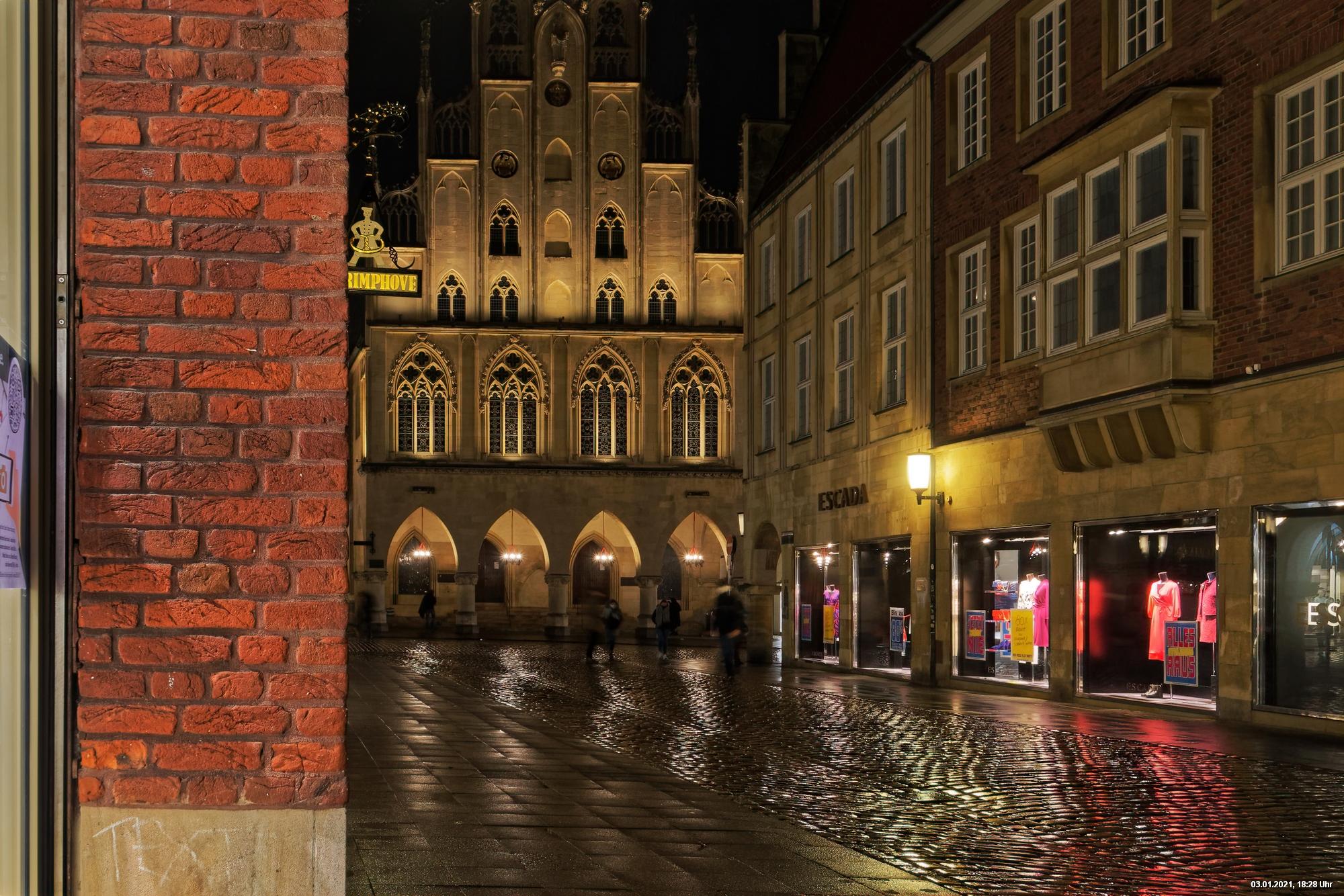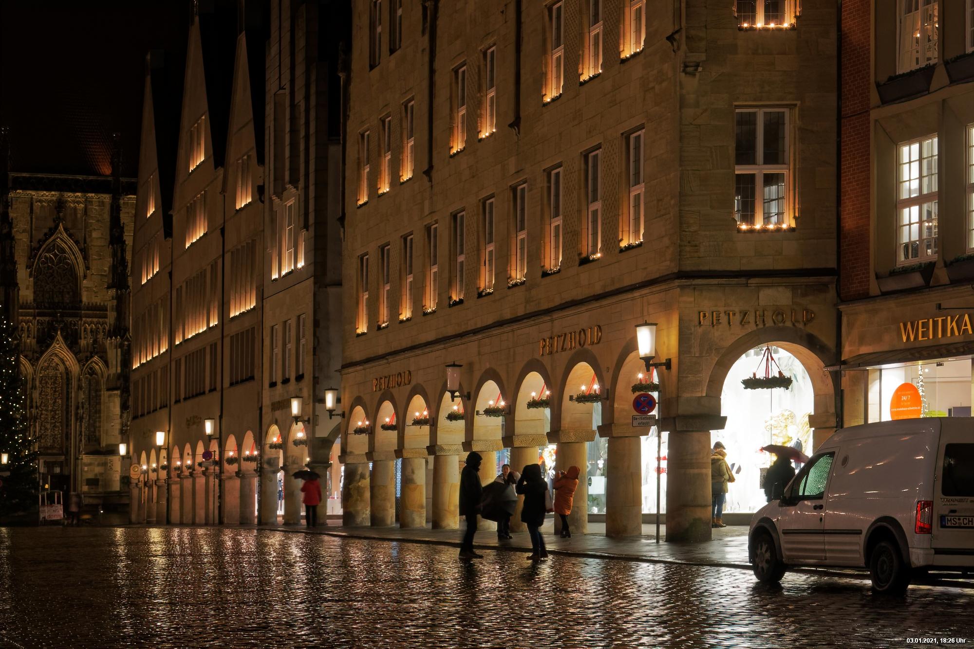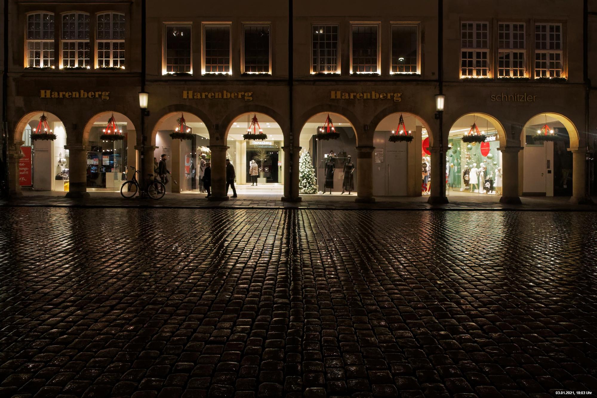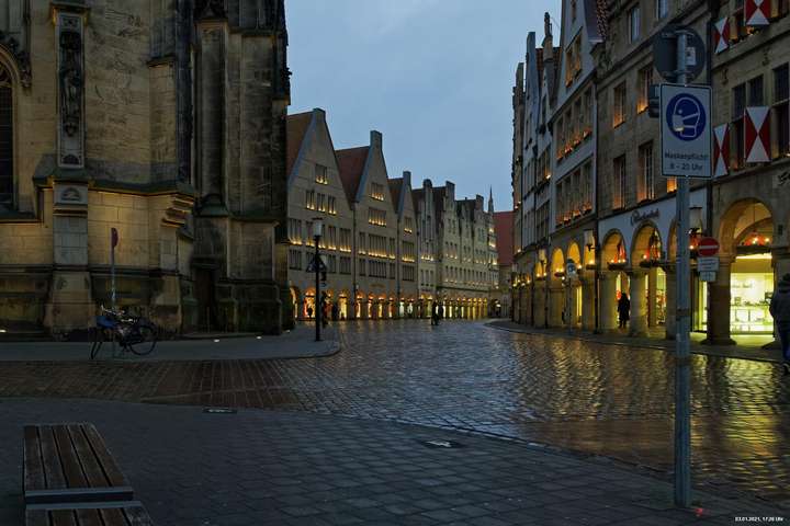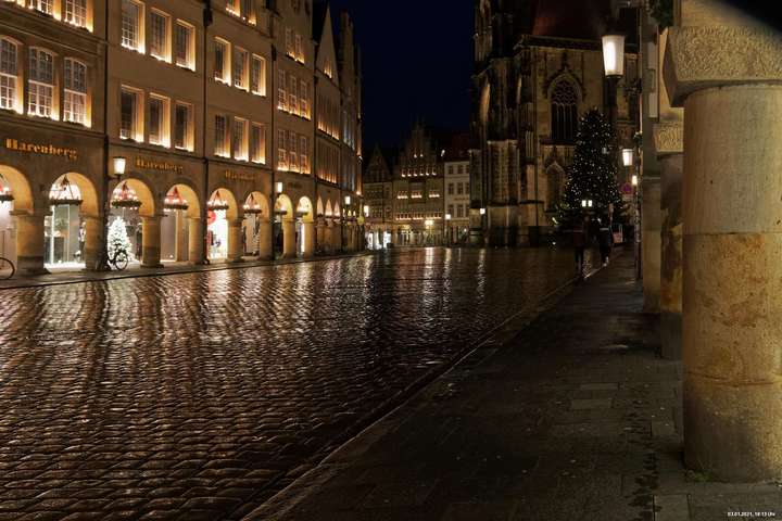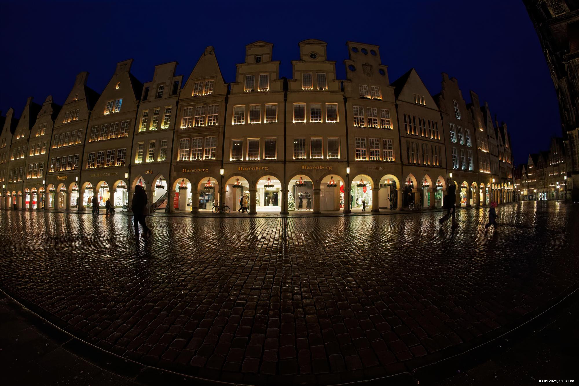 Dann war es also Sonntag, und abends, und dunkel, und kalt, und nass. Corona hat auch in Münster die Straßen ziemlich leergefegt. Die, die sich nach draußen gertaut haben, haben sich sehr diszipliniert an die Schutzverordnung gehalten. So konnten einige Fotos gemacht werden, die ansonsten kaum gelingen würden.