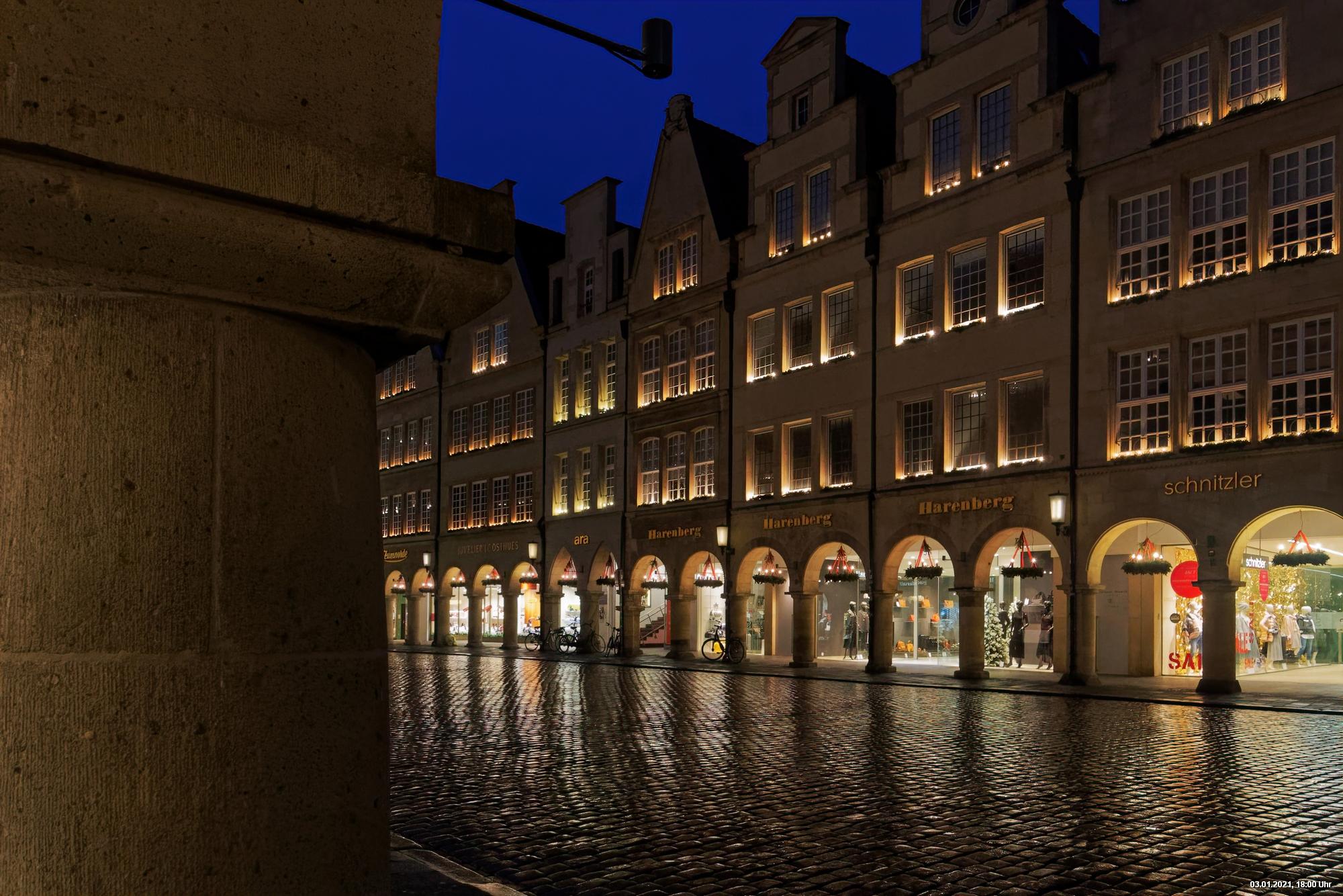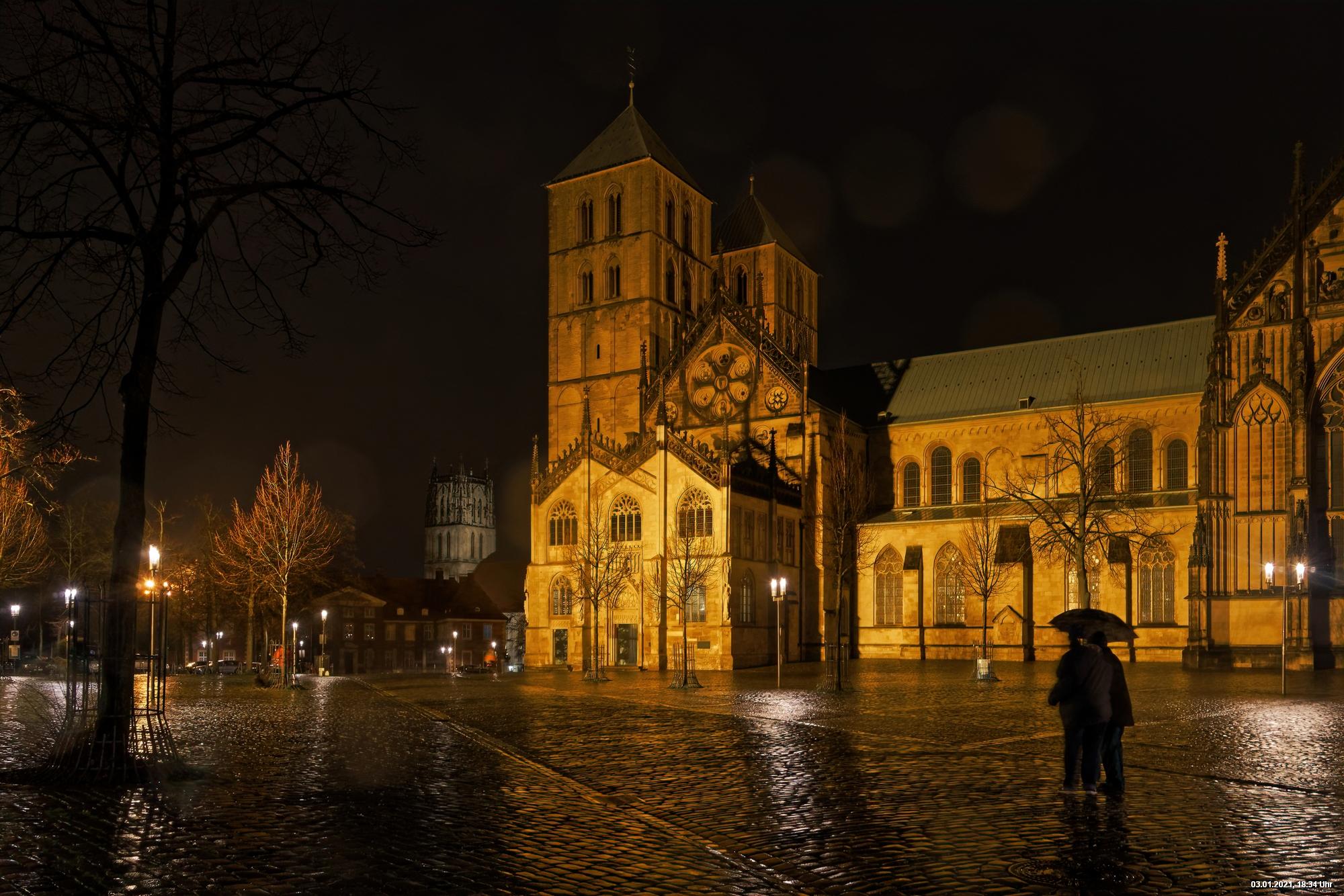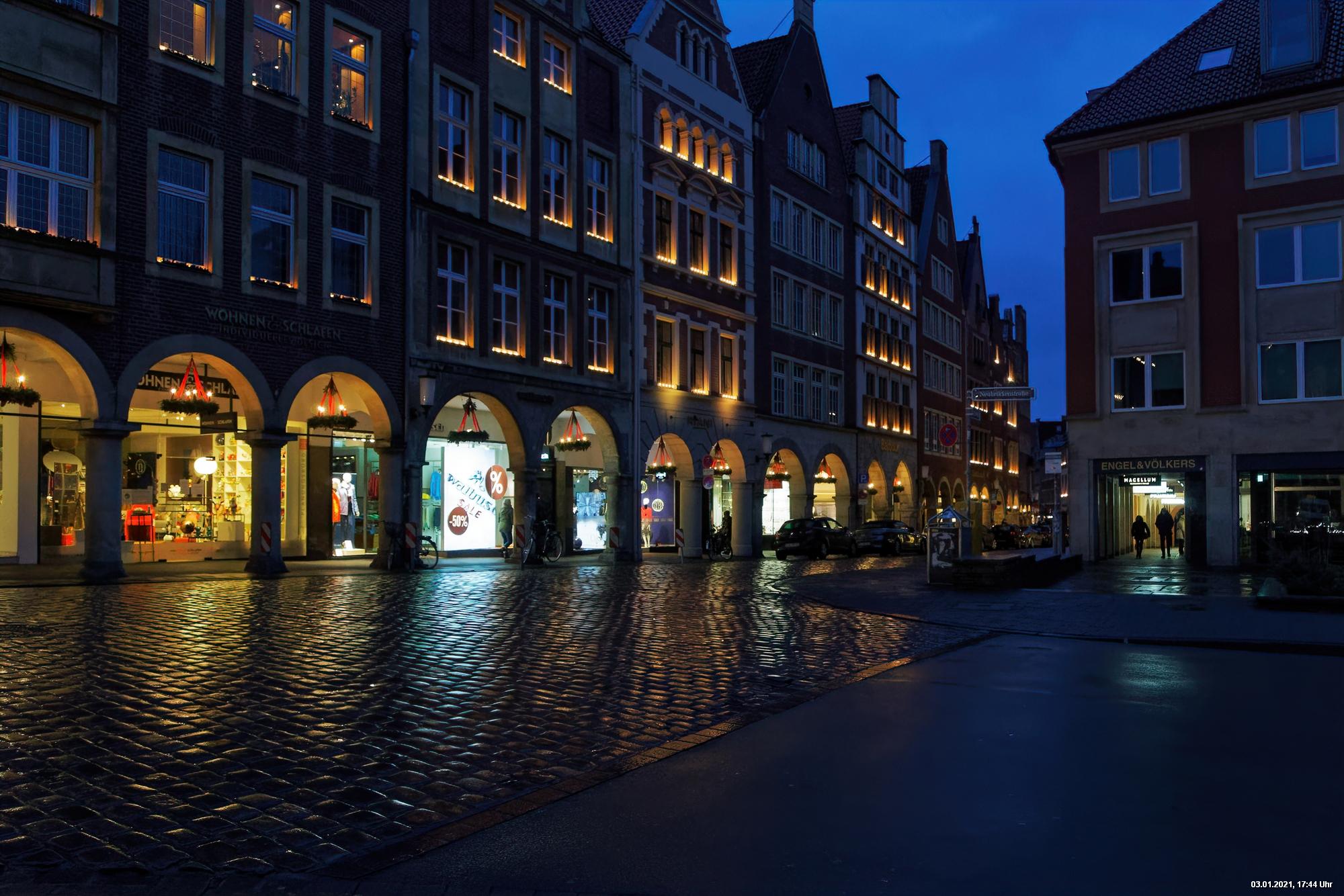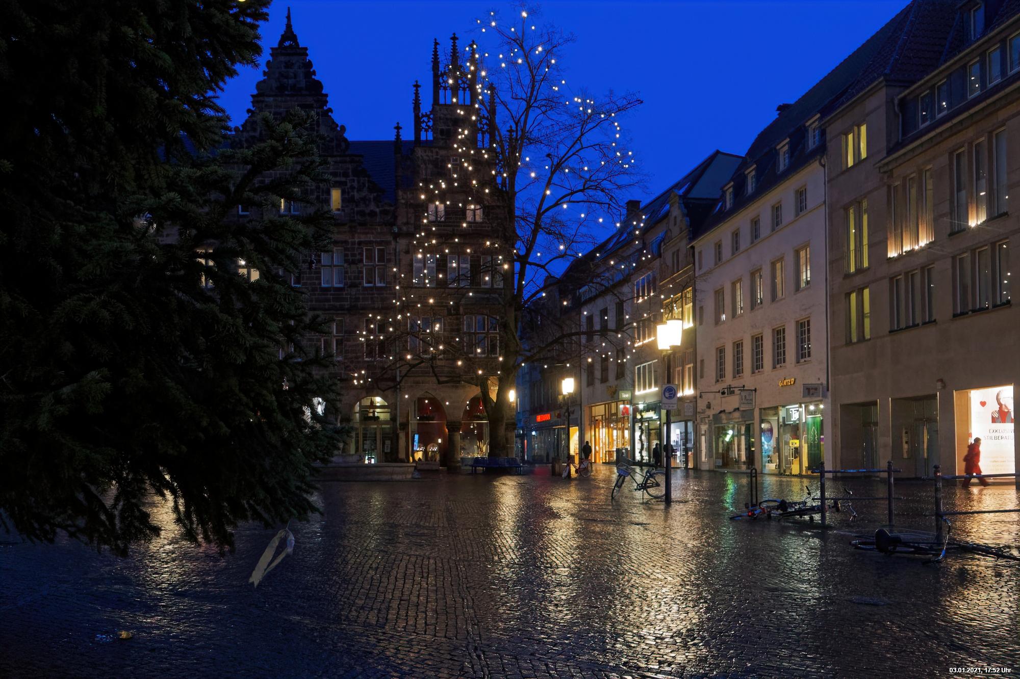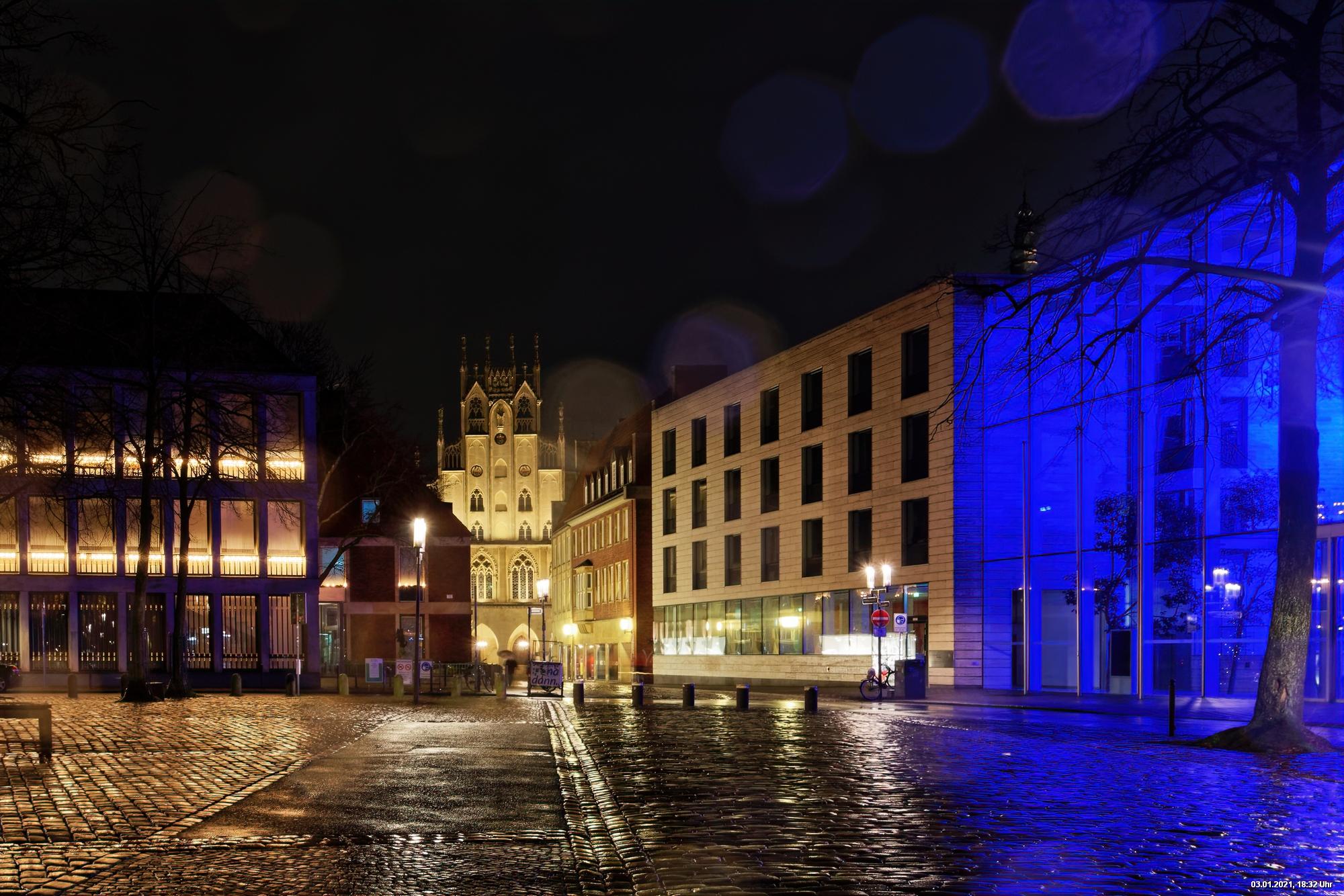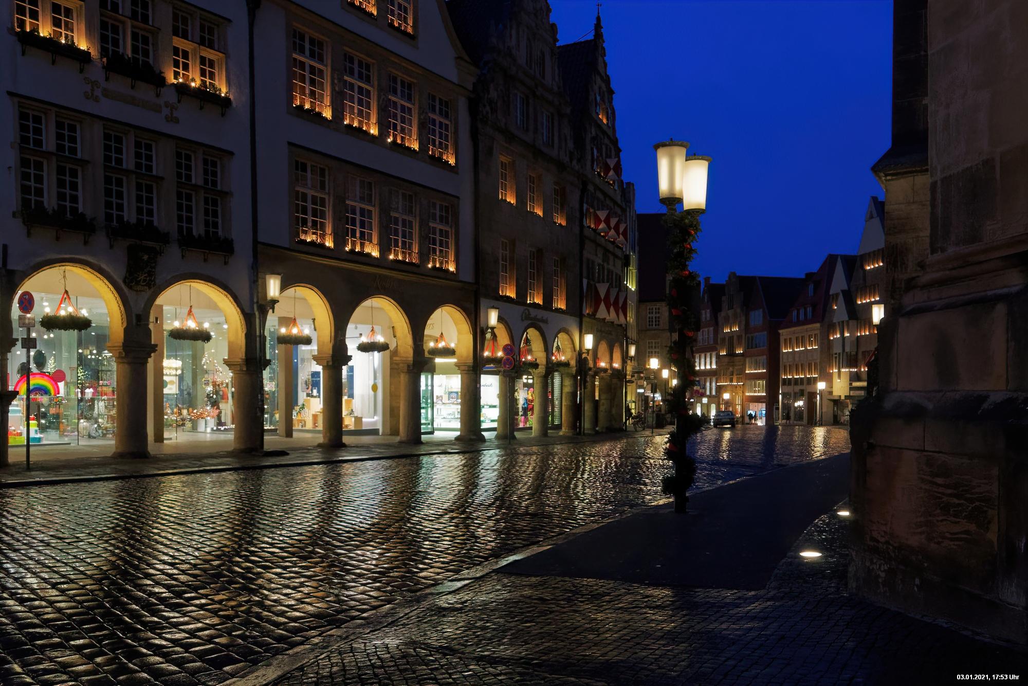 Dann war es also Sonntag, und abends, und dunkel, und kalt, und nass. Corona hat auch in Münster die Straßen ziemlich leergefegt. Die, die sich nach draußen gertaut haben, haben sich sehr diszipliniert an die Schutzverordnung gehalten. So konnten einige Fotos gemacht werden, die ansonsten kaum gelingen würden.