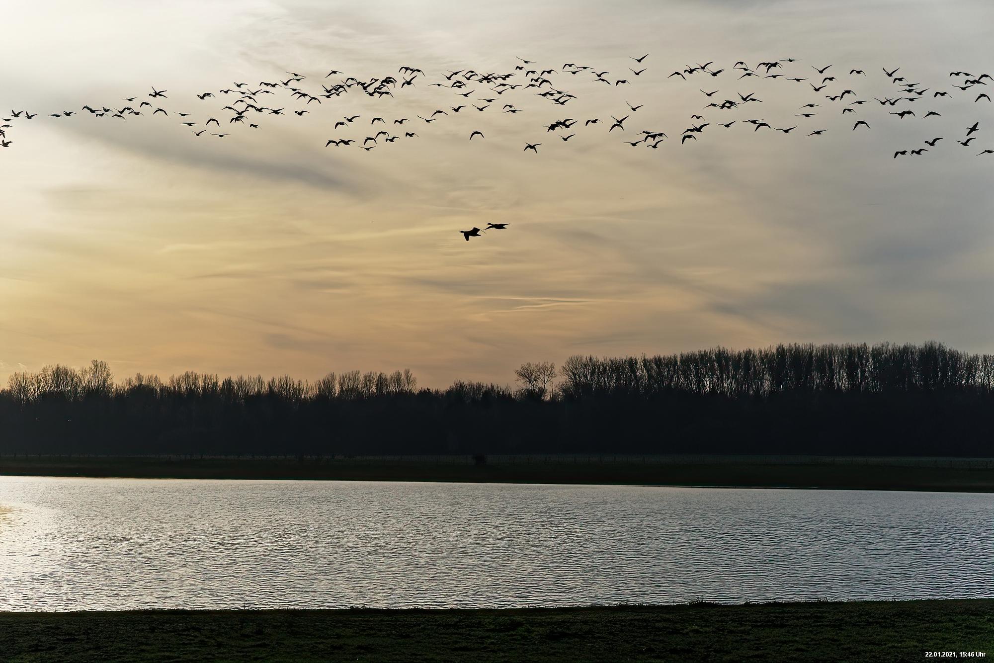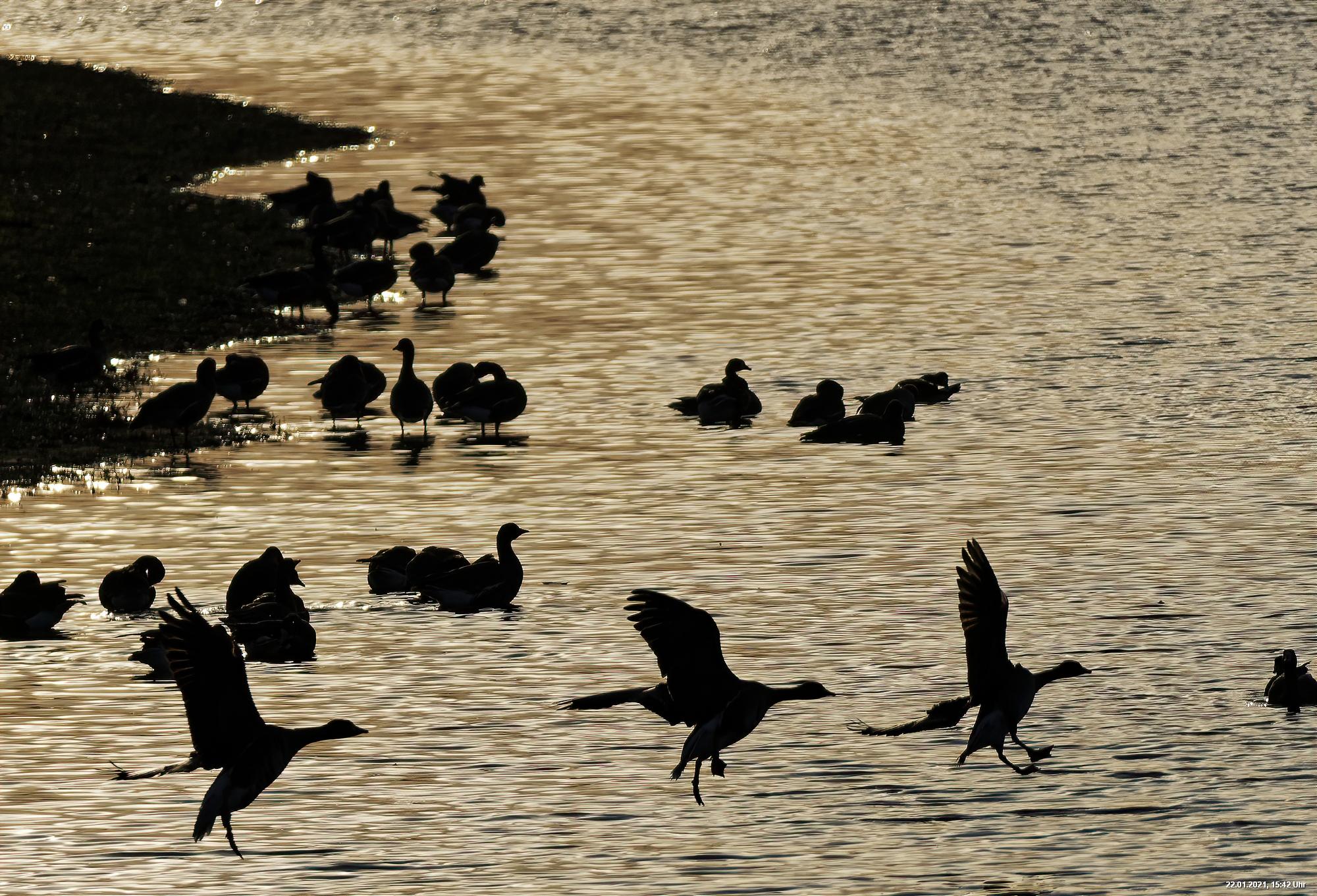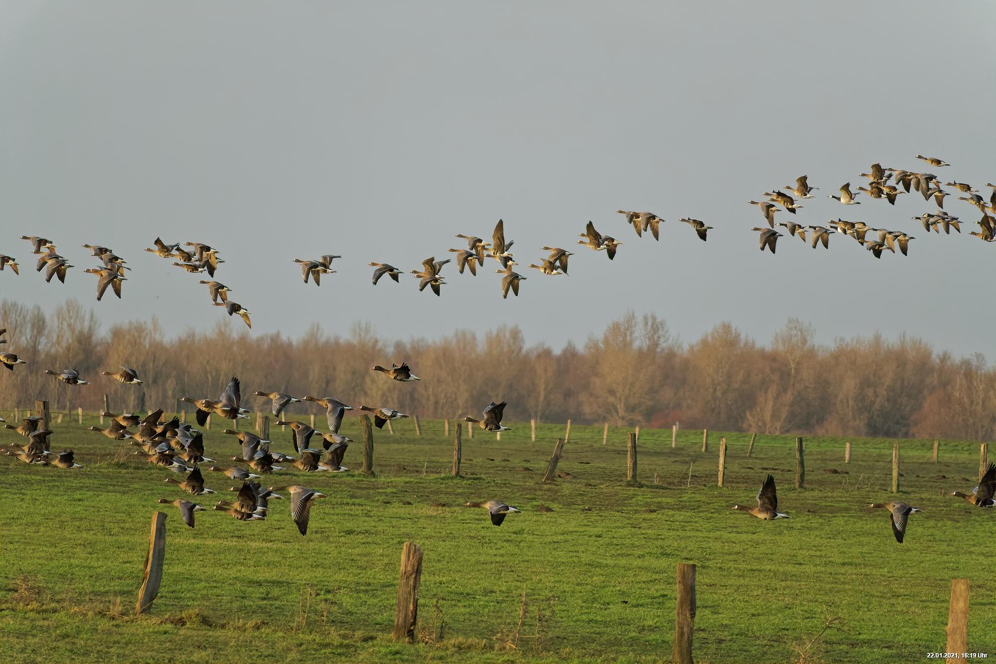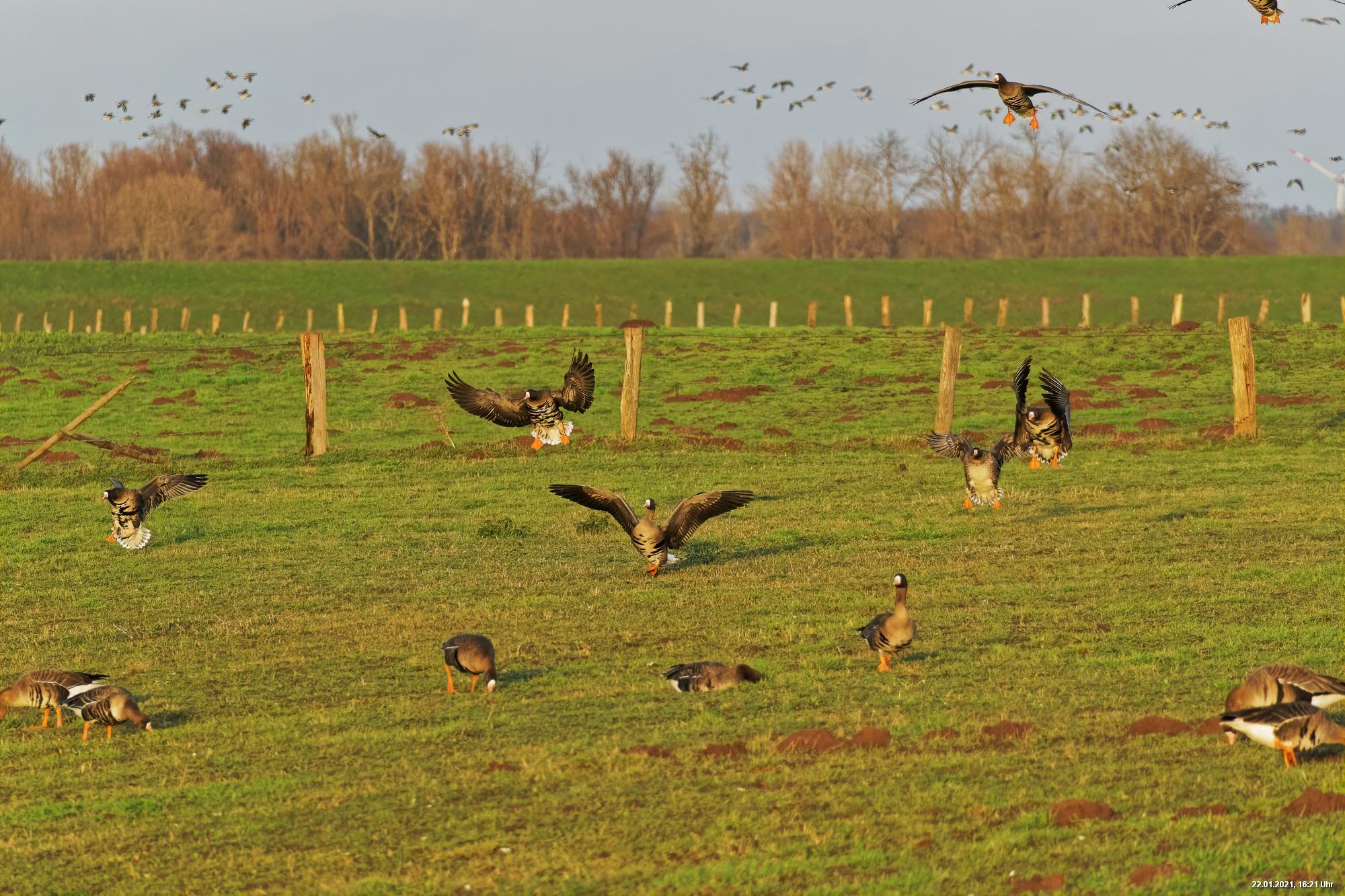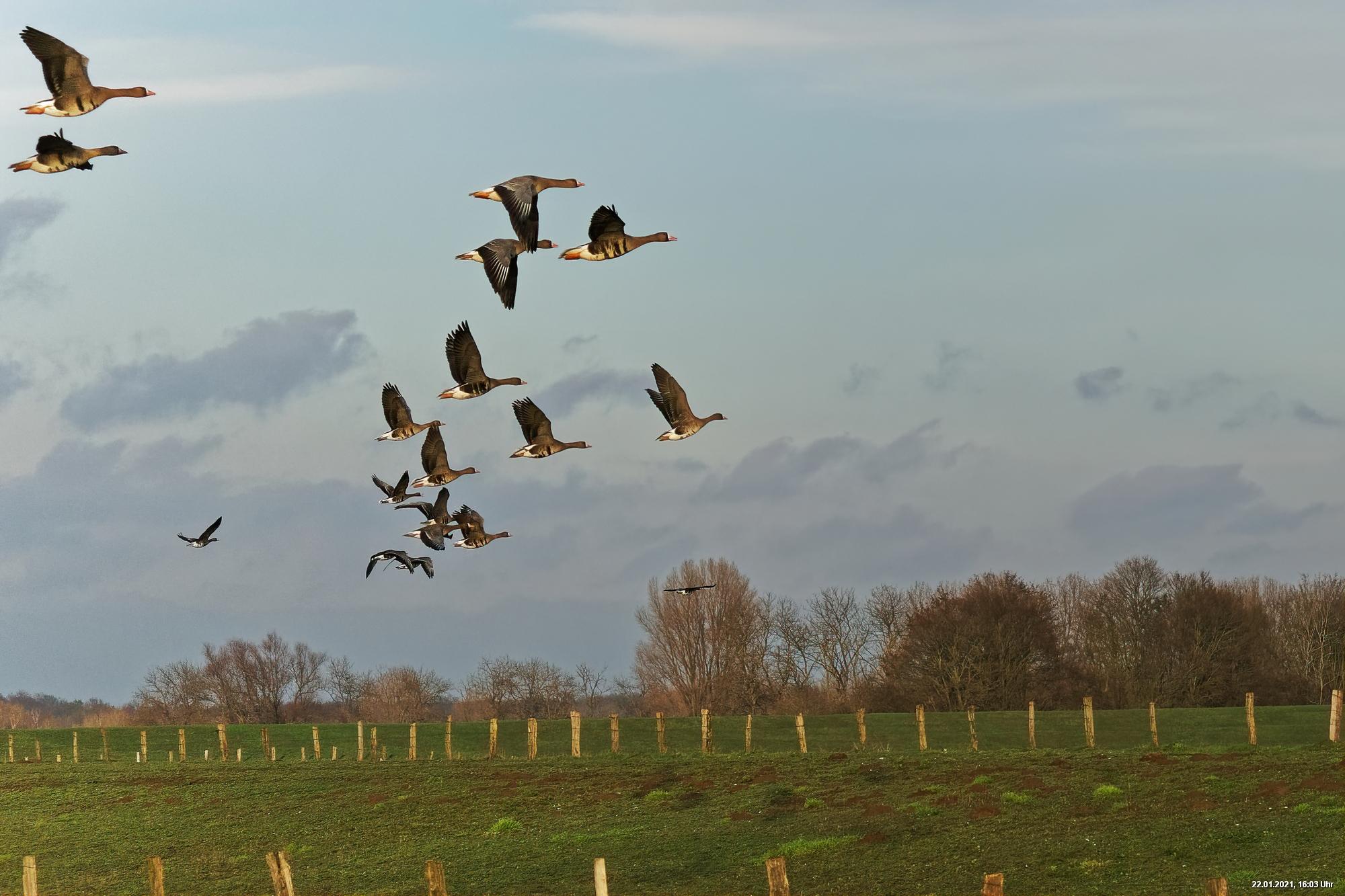 So oft bin ich schon mit mäßigem Erfolg dort gewesen. Jetzt wurde ich total entschädigt. Immer wieder starteten riesige Mengen der Wildgänse mit wilden Flügelschlag und lautem Geschnatter. Ganze Schwärme flogen oft an der tief stehenden Sonne vorbei und um mich herum. Gen Osten war der Himmel blau und gegen Westen spendete die Sonne ihr goldenes Licht. Ich konnte den Blick erst lösen, als die Gänse kurz vor Sonnenuntergang ihre Aktivitäten einstellten. Zuhause habe ich festgestellt, dass ich 998 Fotos gemacht habe. Hier eine kleine Auswahl: