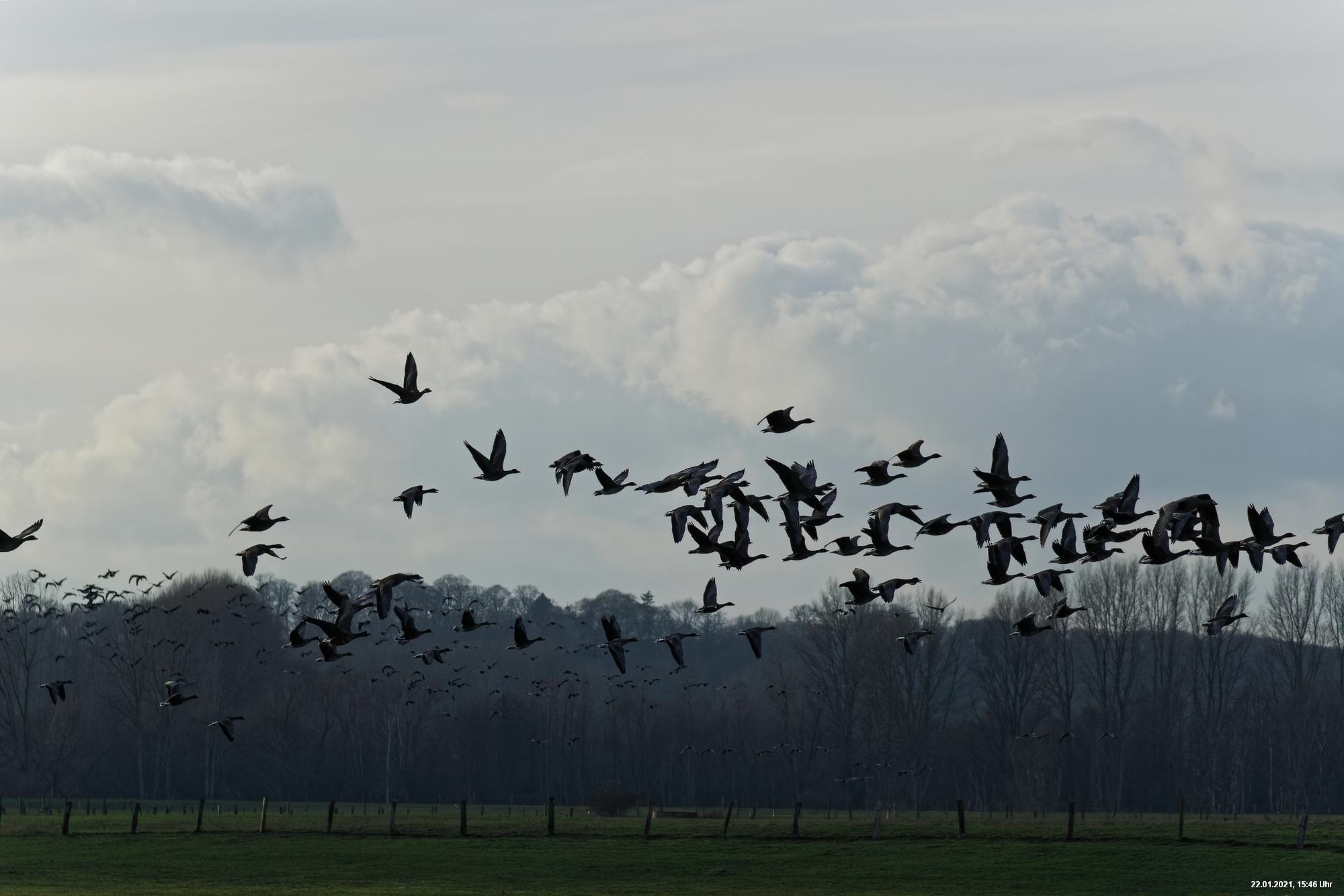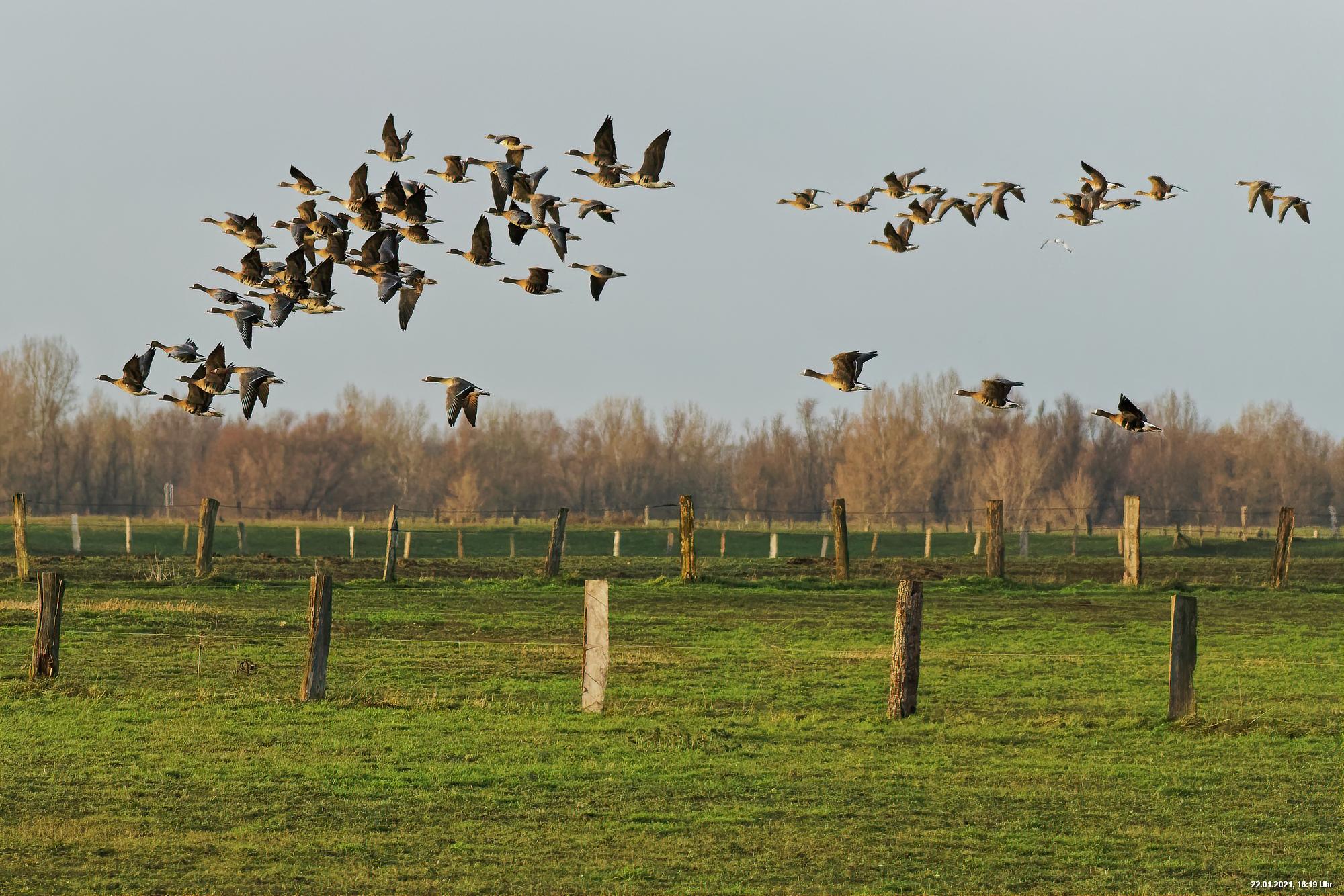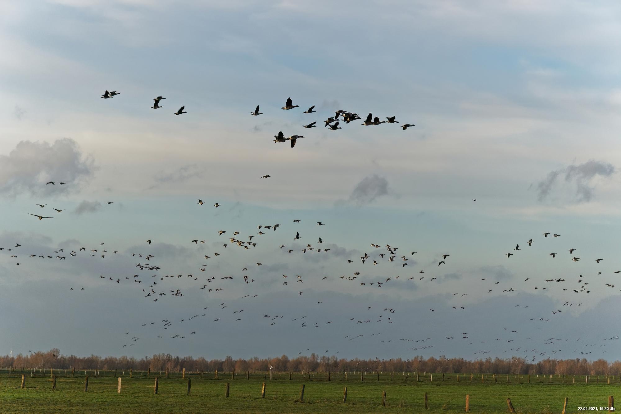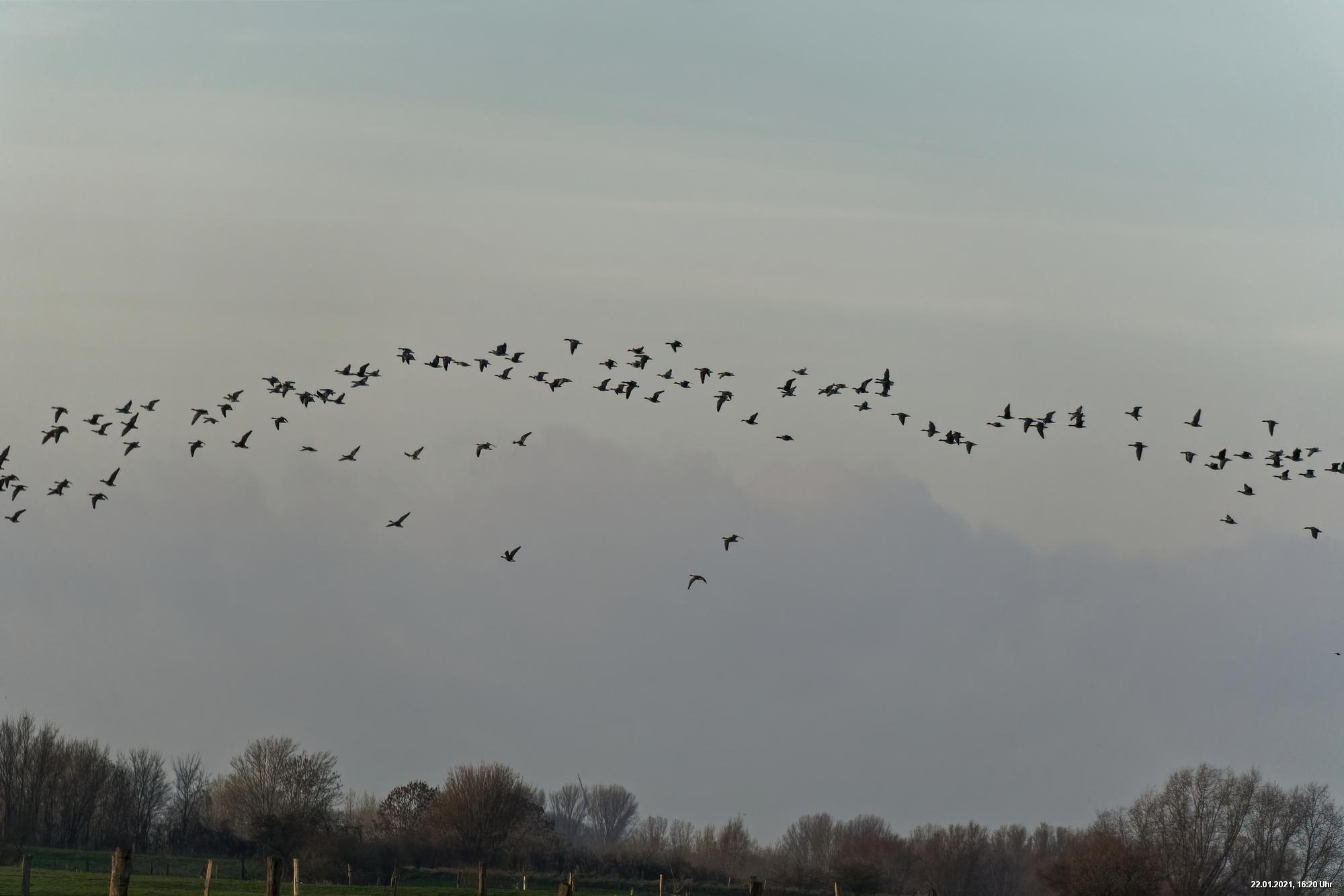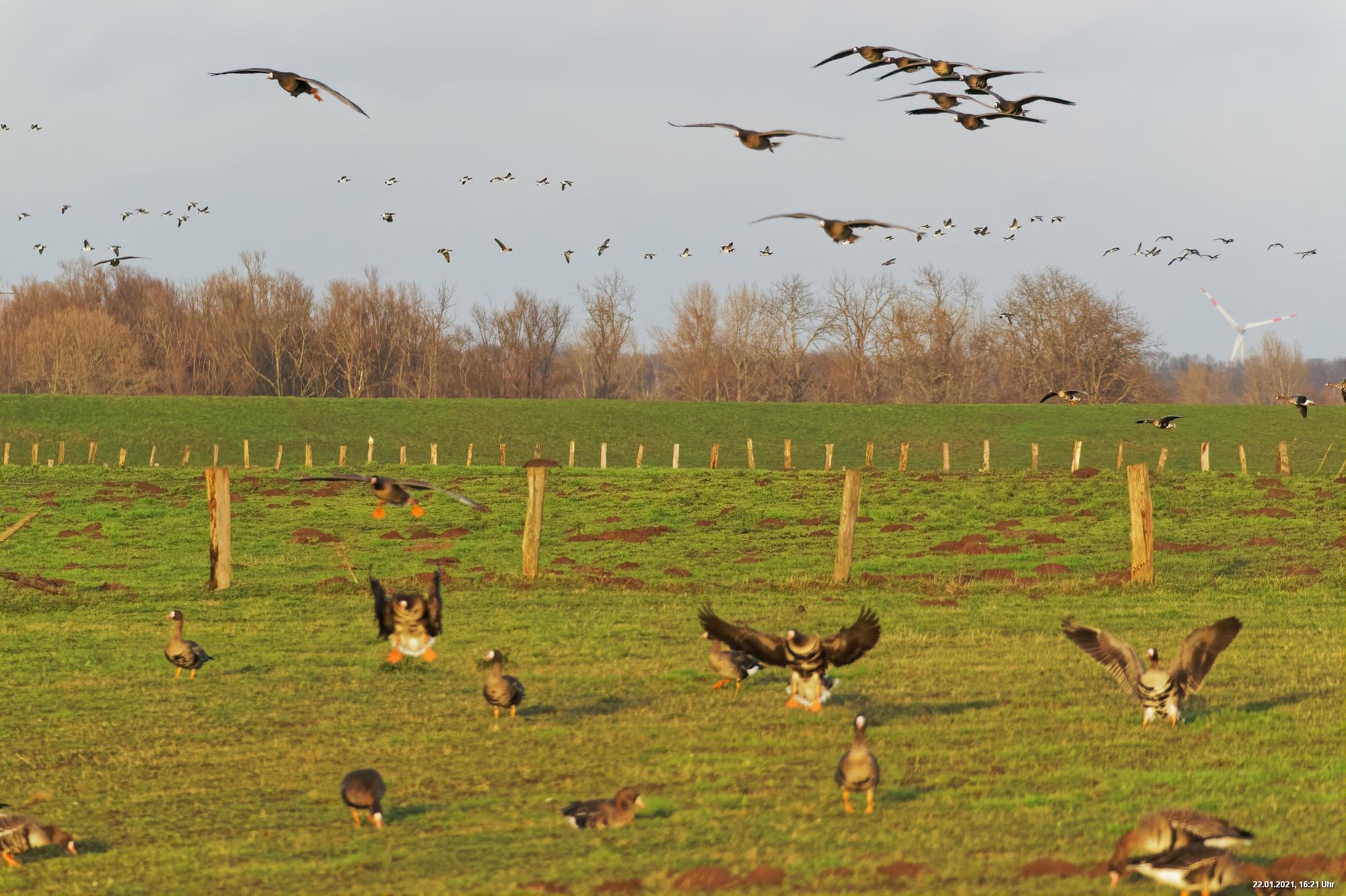 So oft bin ich schon mit mäßigem Erfolg dort gewesen. Jetzt wurde ich total entschädigt. Immer wieder starteten riesige Mengen der Wildgänse mit wilden Flügelschlag und lautem Geschnatter. Ganze Schwärme flogen oft an der tief stehenden Sonne vorbei und um mich herum. Gen Osten war der Himmel blau und gegen Westen spendete die Sonne ihr goldenes Licht. Ich konnte den Blick erst lösen, als die Gänse kurz vor Sonnenuntergang ihre Aktivitäten einstellten. Zuhause habe ich festgestellt, dass ich 998 Fotos gemacht habe. Hier eine kleine Auswahl:
