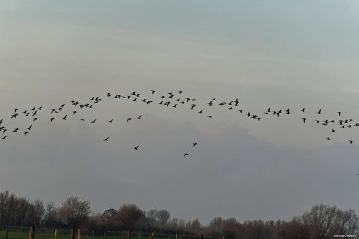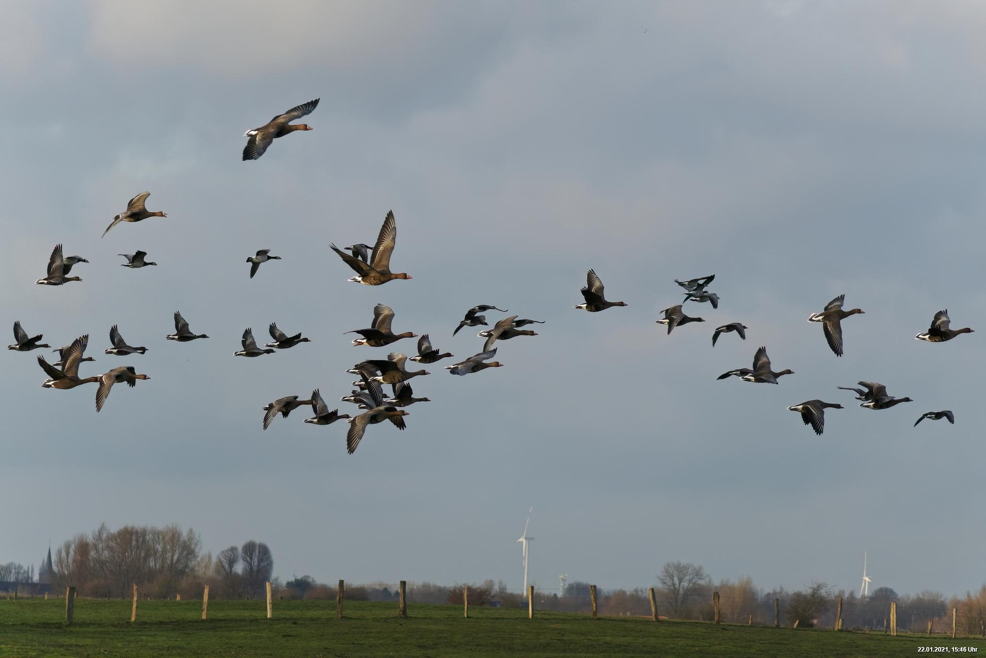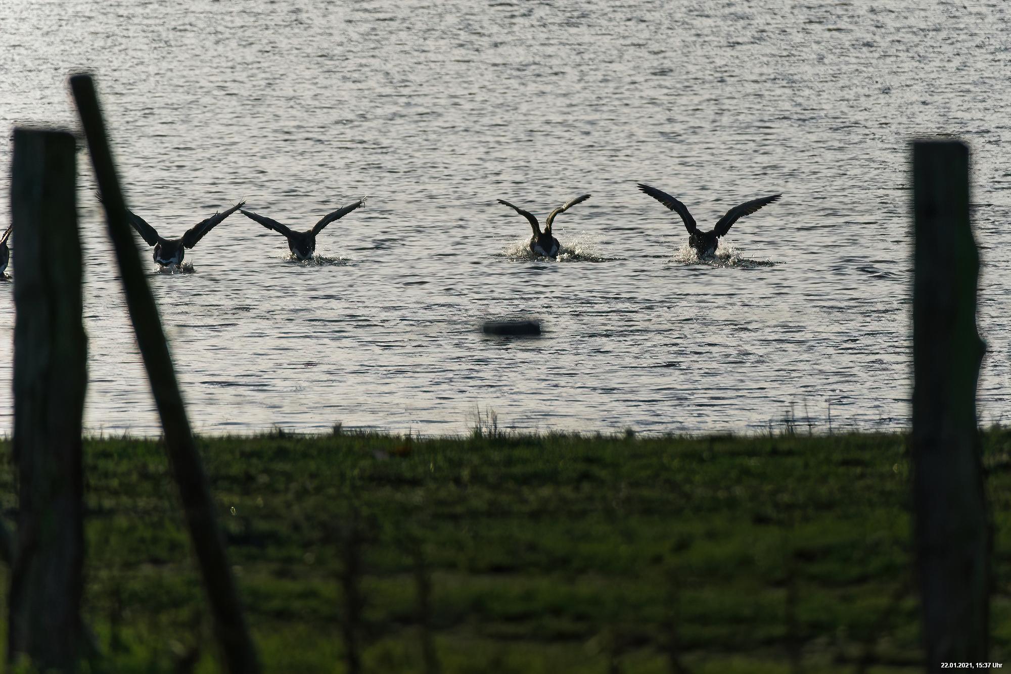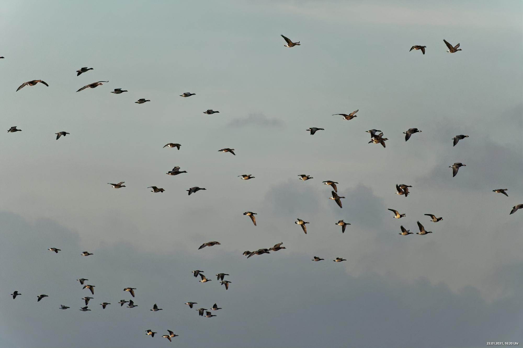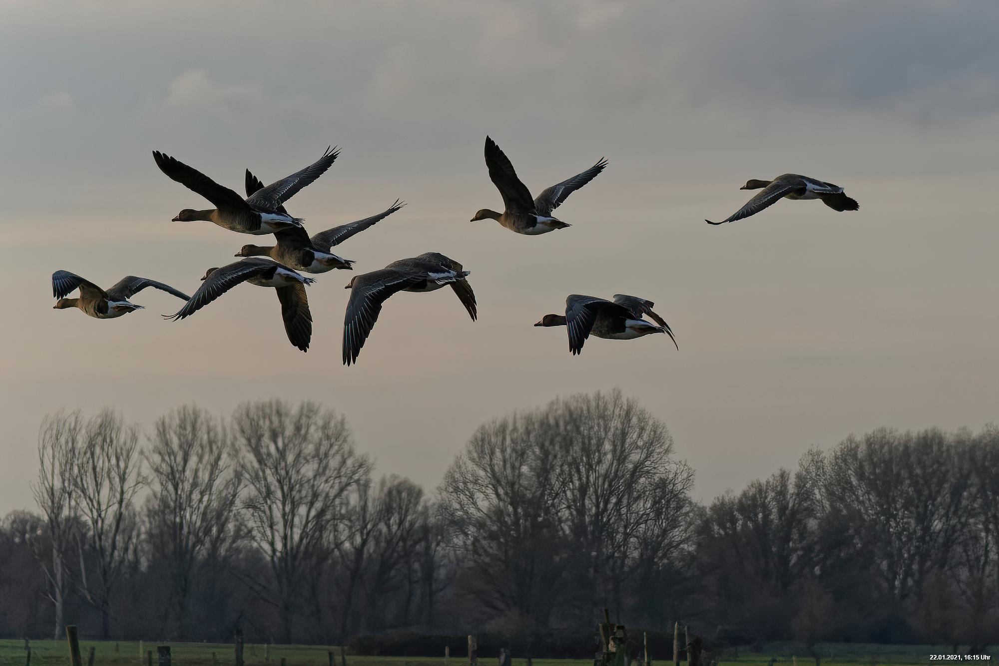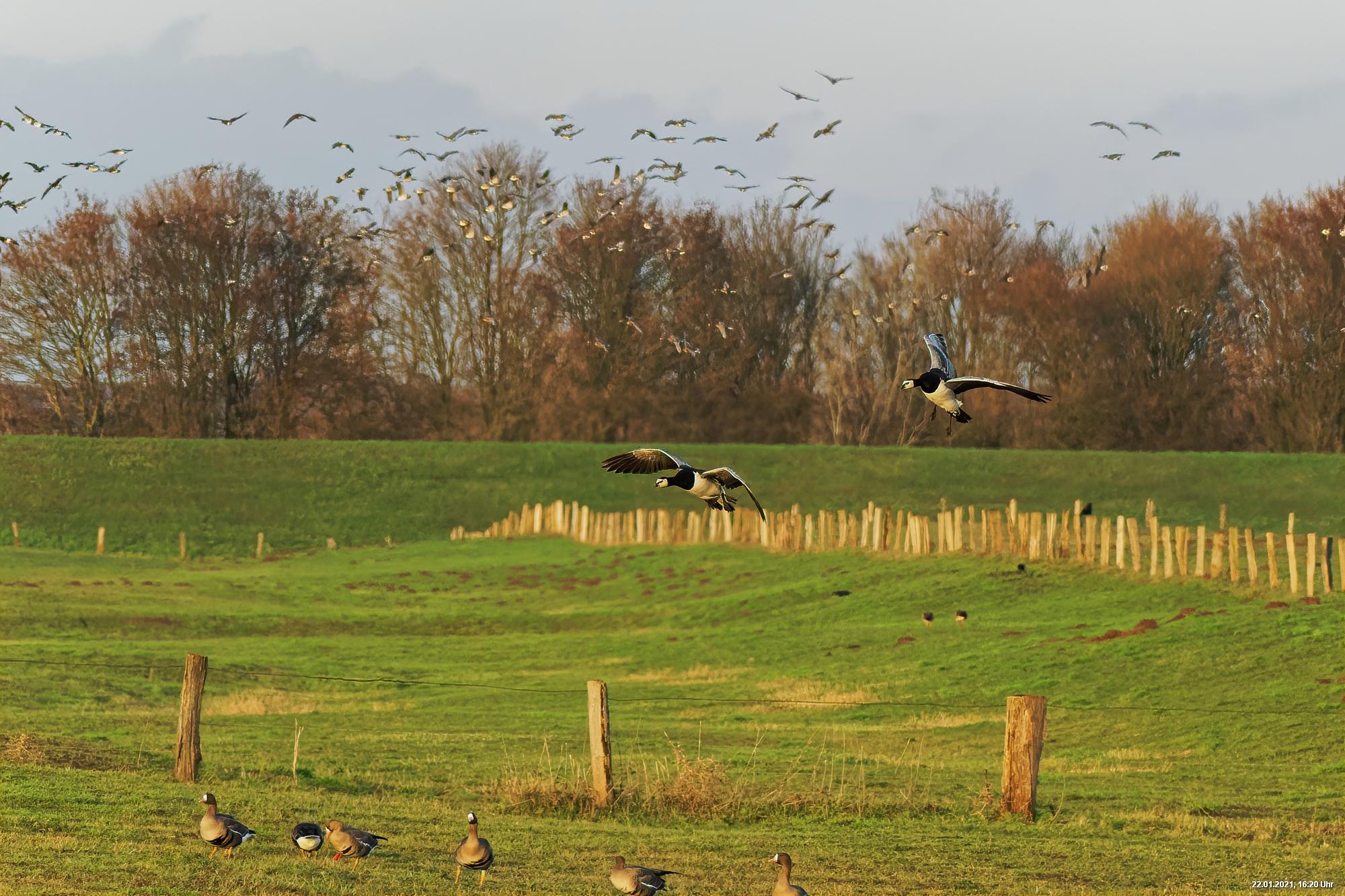 So oft bin ich schon mit mäßigem Erfolg dort gewesen. Jetzt wurde ich total entschädigt. Immer wieder starteten riesige Mengen der Wildgänse mit wilden Flügelschlag und lautem Geschnatter. Ganze Schwärme flogen oft an der tief stehenden Sonne vorbei und um mich herum. Gen Osten war der Himmel blau und gegen Westen spendete die Sonne ihr goldenes Licht. Ich konnte den Blick erst lösen, als die Gänse kurz vor Sonnenuntergang ihre Aktivitäten einstellten. Zuhause habe ich festgestellt, dass ich 998 Fotos gemacht habe. Hier eine kleine Auswahl: