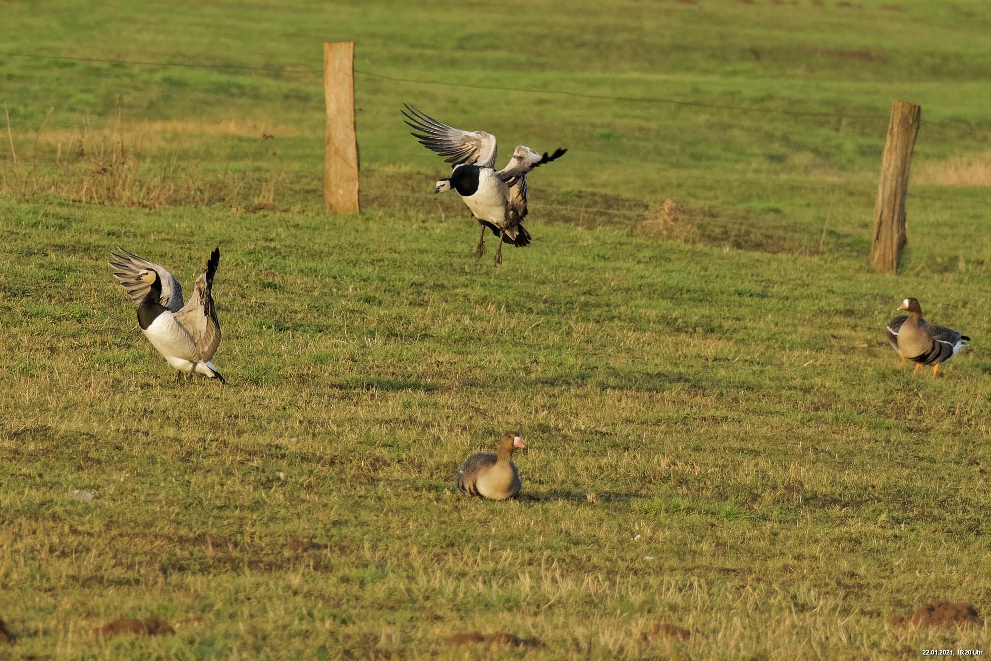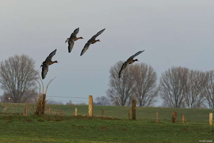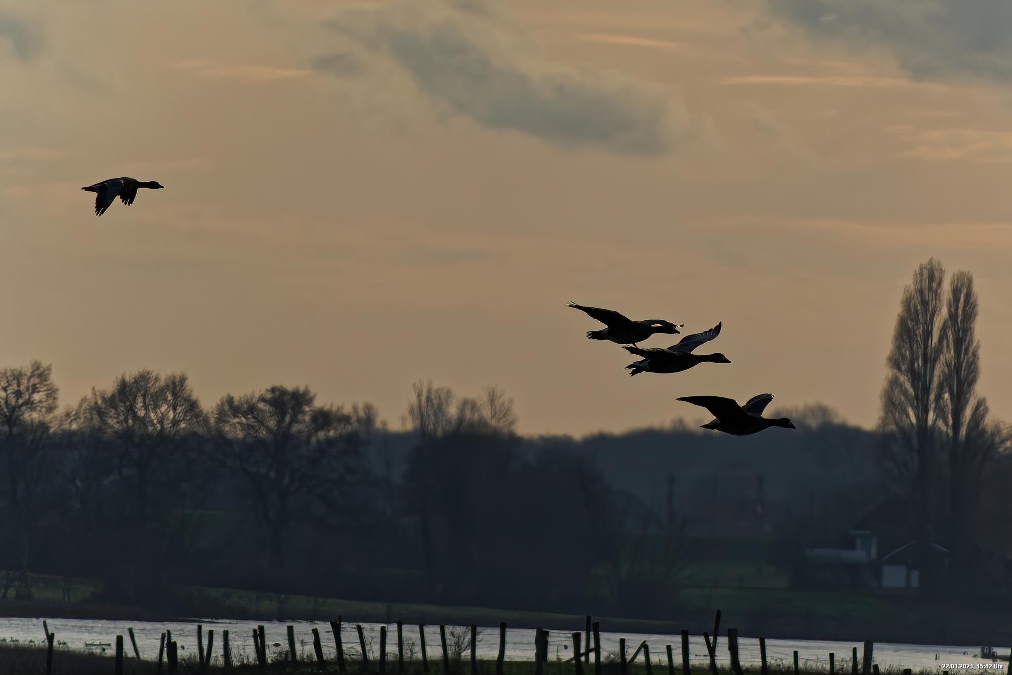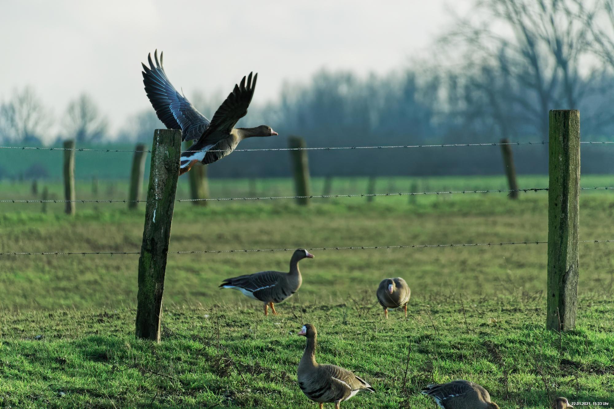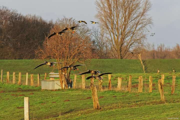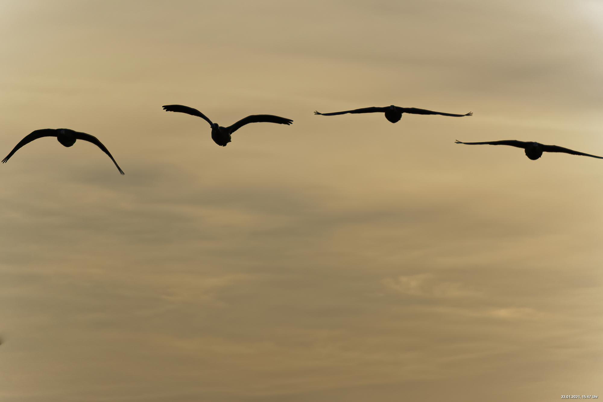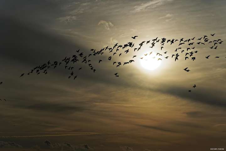 So oft bin ich schon mit mäßigem Erfolg dort gewesen. Jetzt wurde ich total entschädigt. Immer wieder starteten riesige Mengen der Wildgänse mit wilden Flügelschlag und lautem Geschnatter. Ganze Schwärme flogen oft an der tief stehenden Sonne vorbei und um mich herum. Gen Osten war der Himmel blau und gegen Westen spendete die Sonne ihr goldenes Licht. Ich konnte den Blick erst lösen, als die Gänse kurz vor Sonnenuntergang ihre Aktivitäten einstellten. Zuhause habe ich festgestellt, dass ich 998 Fotos gemacht habe. Hier eine kleine Auswahl: